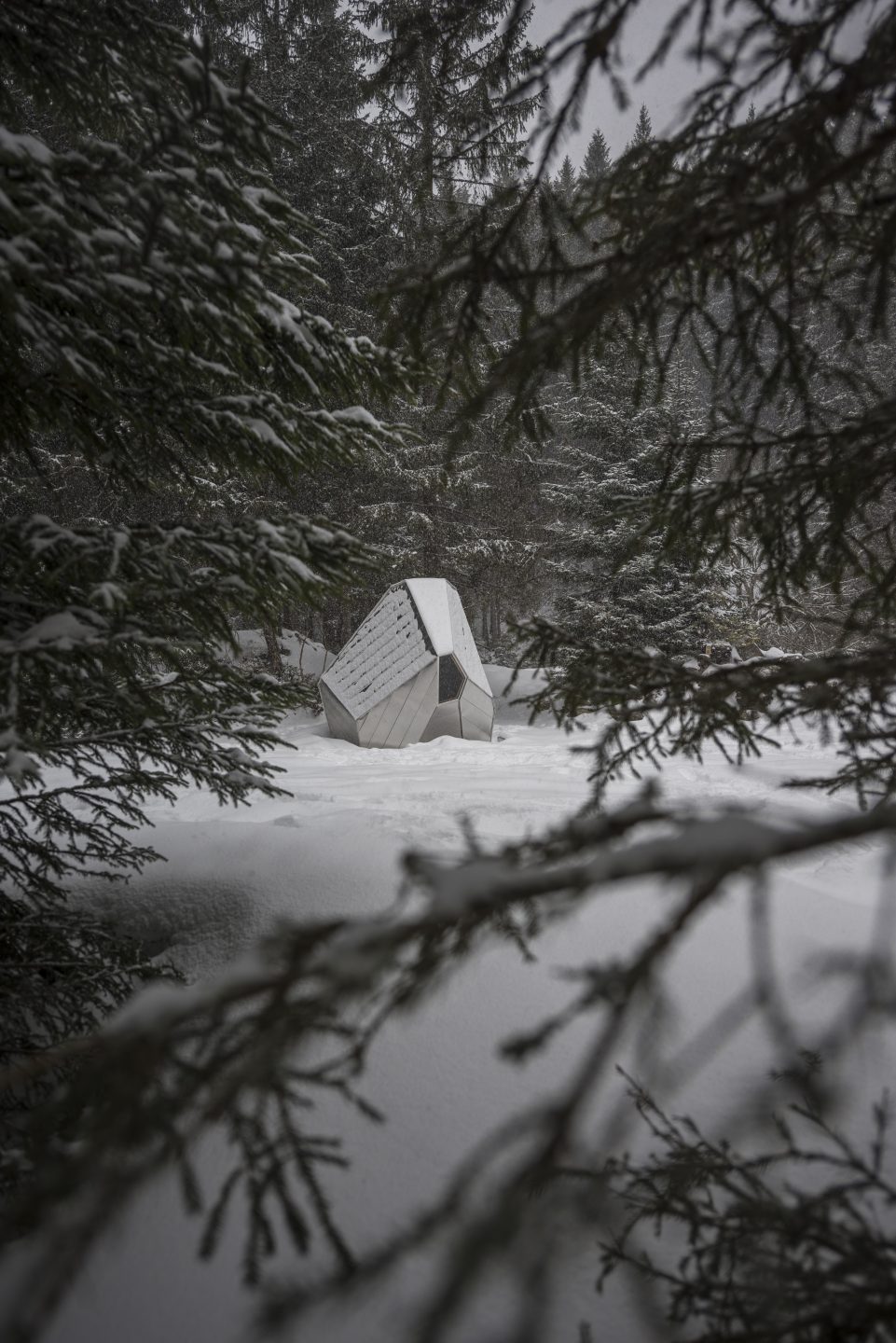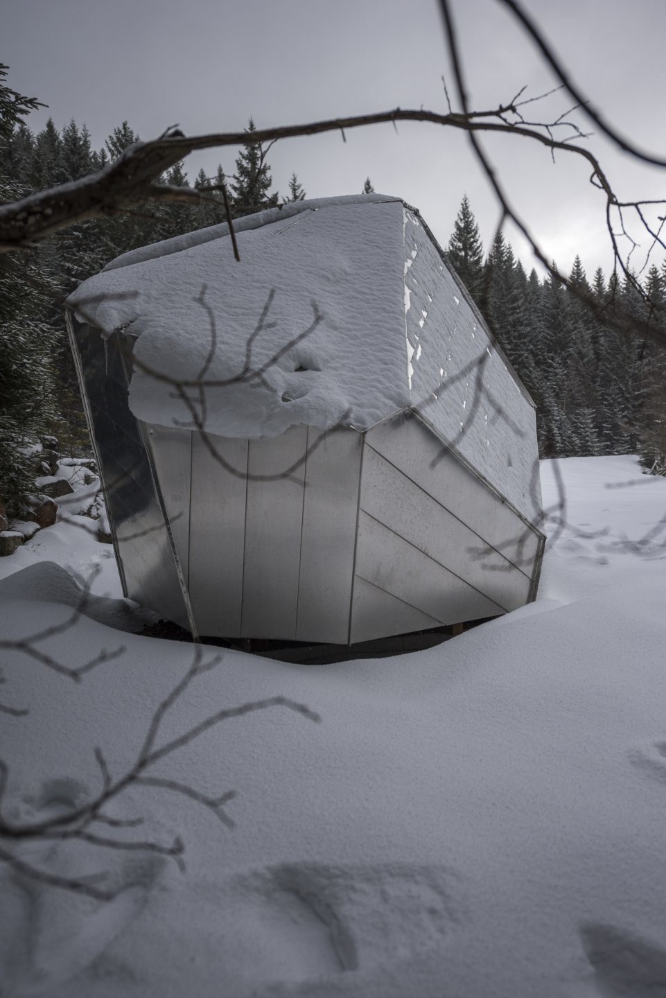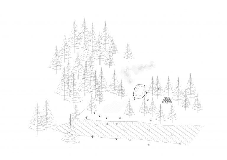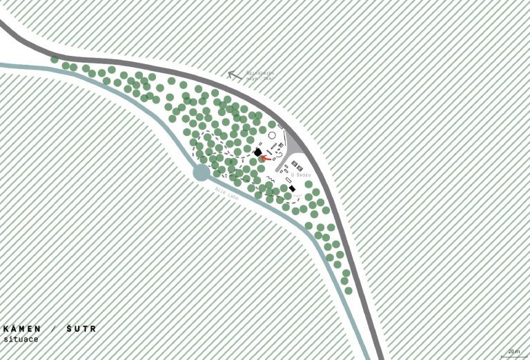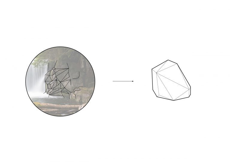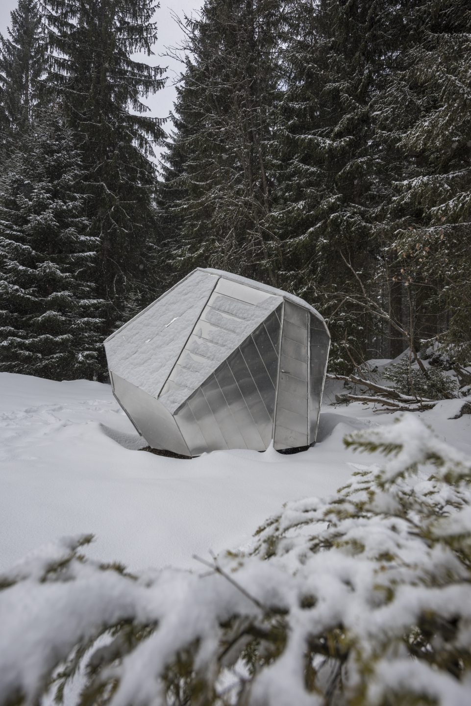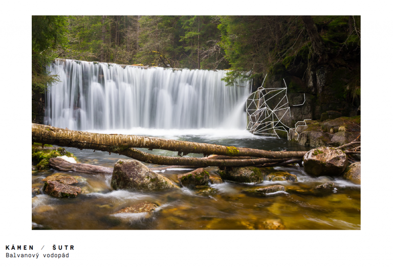 Koutek v závětří na dohled od vodopádu i od cesty nemůžeme pustit z hlavy, naši novou útulnu proto umisťujeme na místo té stávající. Navrhujeme útulnu zakrytou stromy a pevně zasazenou v Krkonošské krajině. Inspirací pro tvar byl samotný Balvanový vodopád, do kterého byl ještě nedávno vklíněn velký balvan, šutrák, kámen… Kámen zároveň vnímáme jako nedílnou součást struktury hor, je to materiál, který tvoří Krkonoše, je to podklad, který zachytává život.