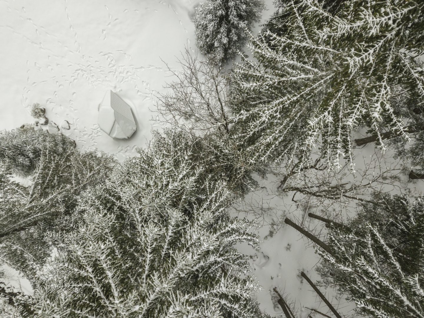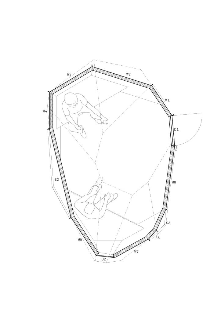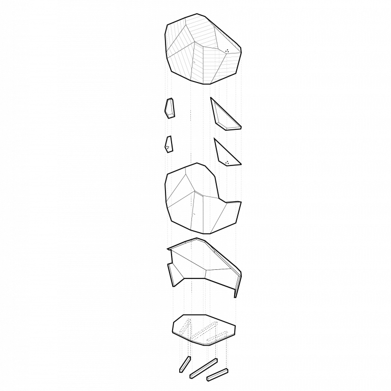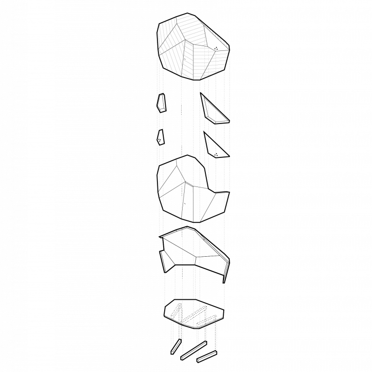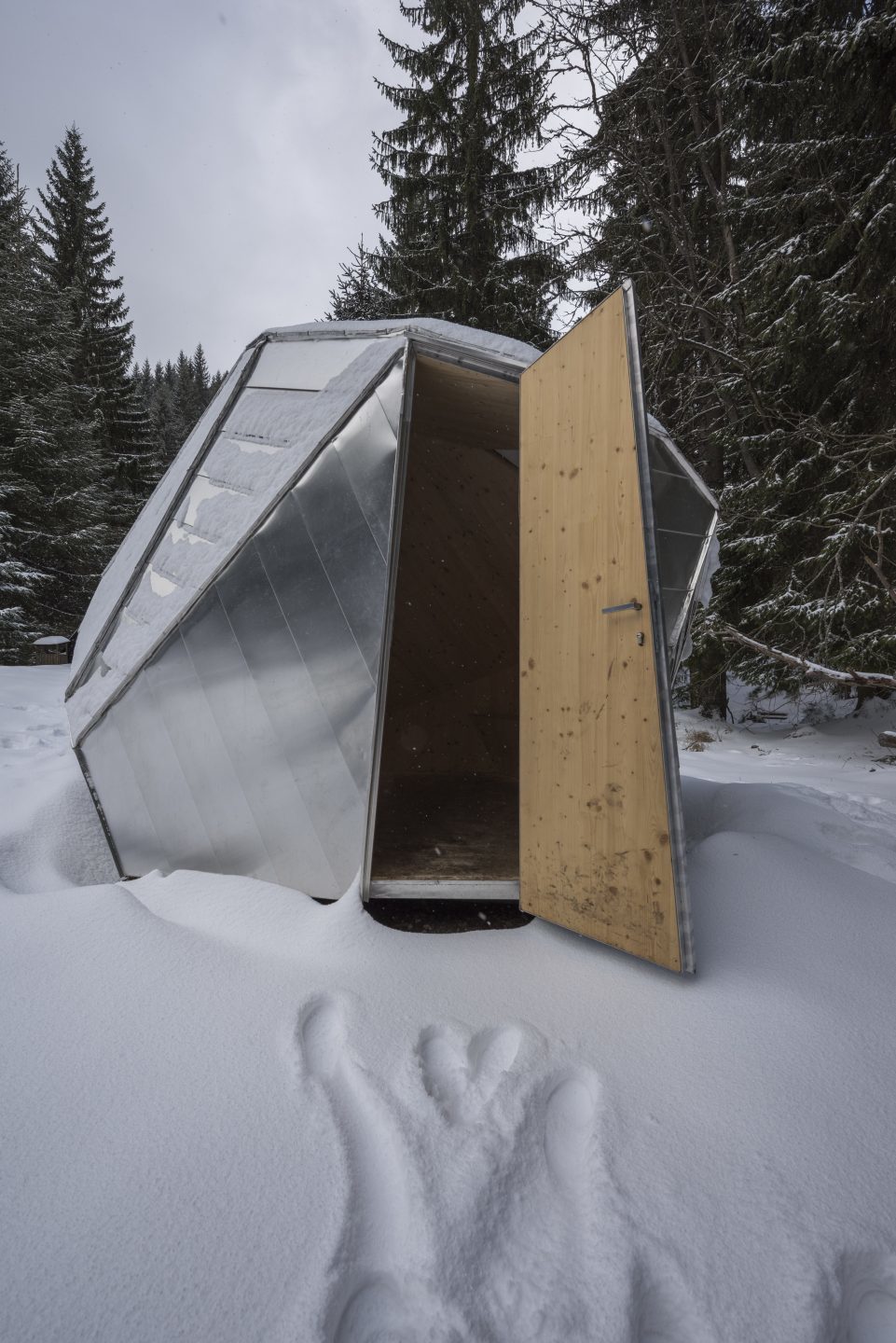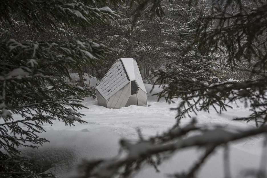 Koutek v závětří na dohled od vodopádu i od cesty nemůžeme pustit z hlavy, naši novou útulnu proto umisťujeme na místo té stávající. Navrhujeme útulnu zakrytou stromy a pevně zasazenou v Krkonošské krajině. Inspirací pro tvar byl samotný Balvanový vodopád, do kterého byl ještě nedávno vklíněn velký balvan, šutrák, kámen… Kámen zároveň vnímáme jako nedílnou součást struktury hor, je to materiál, který tvoří Krkonoše, je to podklad, který zachytává život.