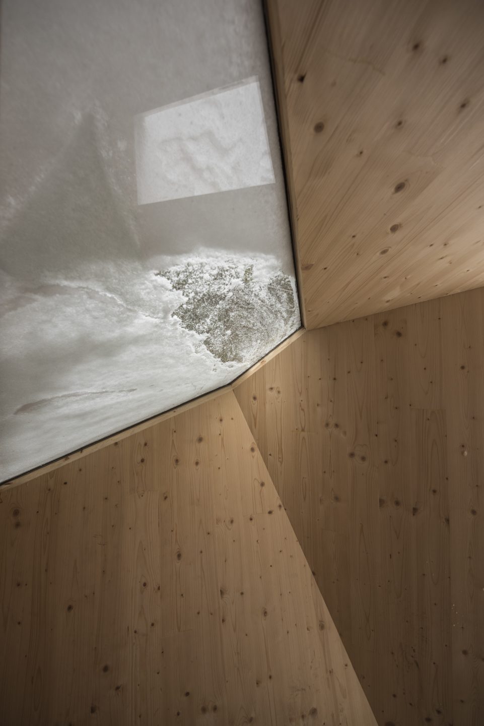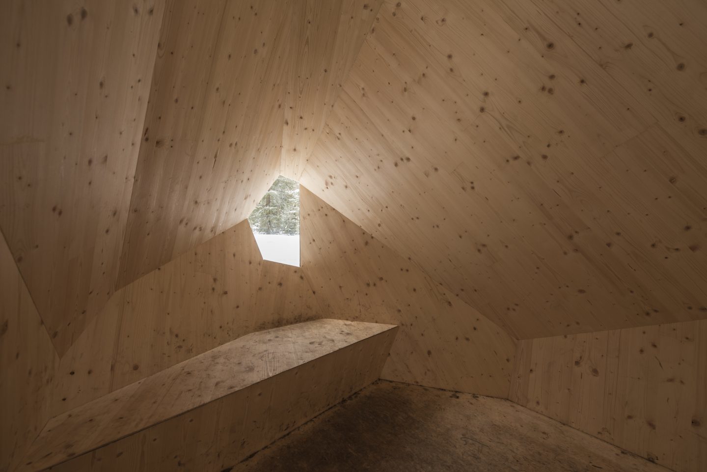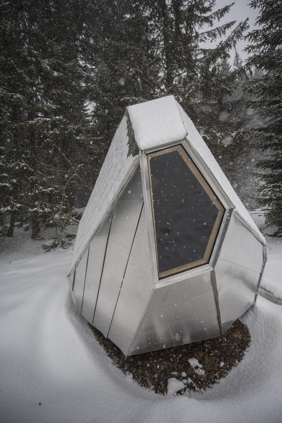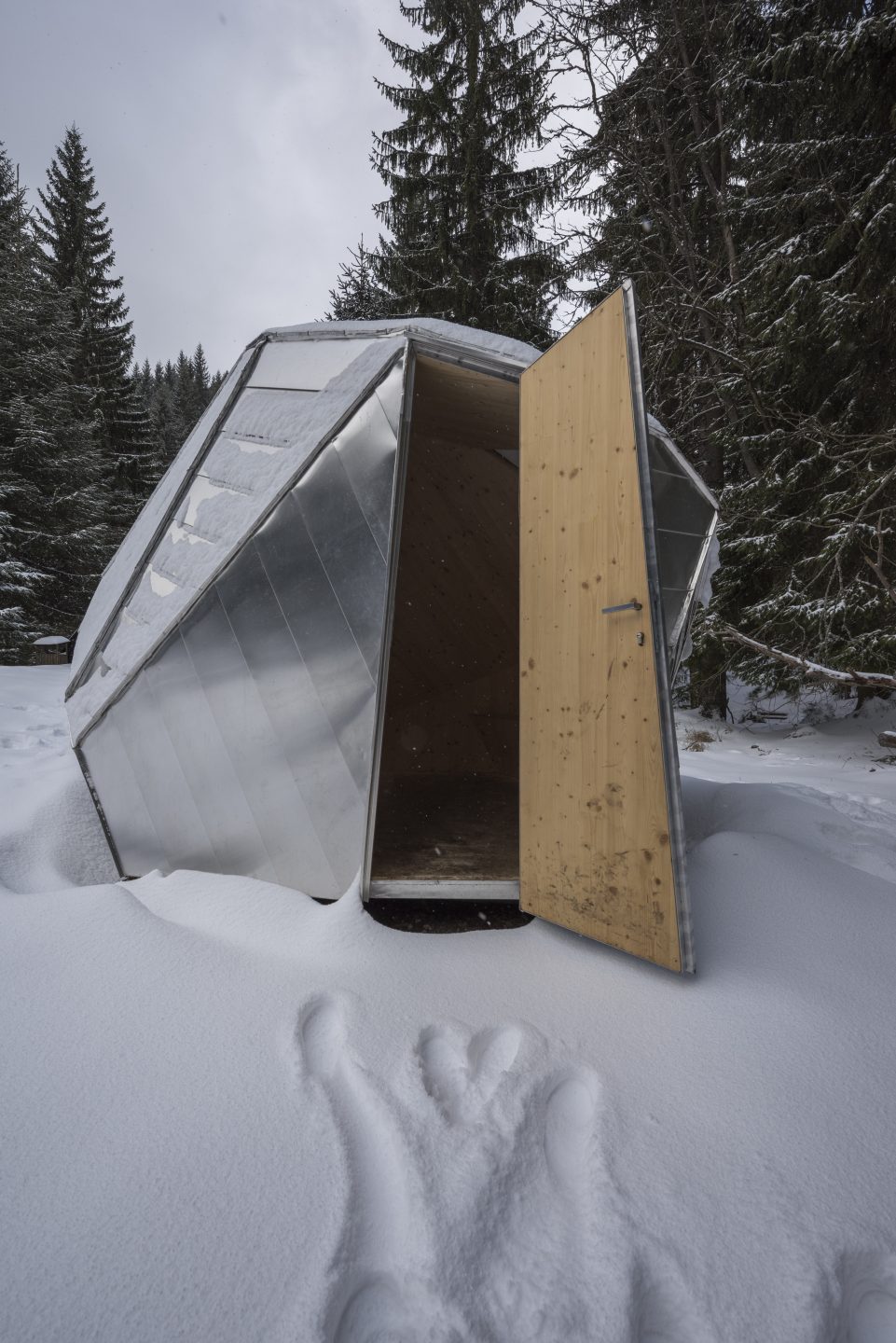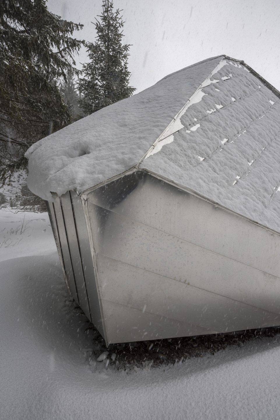 Nepravidelná, ale kompaktní struktura vytváří pocit bezpečí a úkrytu, světlé dřevo kontrastuje s plechovým opláštěním a špatným počasím. Útulnu lze prohlédnout skrz, větším oknem kolemjdoucí nahlížejí dovnitř, návštěvníci jím vyhlížejí na nebe, když čekají, až se zlepší počasí. Menší okno poskytuje pohled mezi stromy k Bílému Labi. Pod okny jsou umístěny dvě lavice s opěrkami, zkosenými stěnami útulny. Fasáda z falcovaného plechu odolá horským podmínkám, díky zvolenému materiálu bude stárnout a měnit svůj vzhled stejně, jako kámen porůstá mechem.