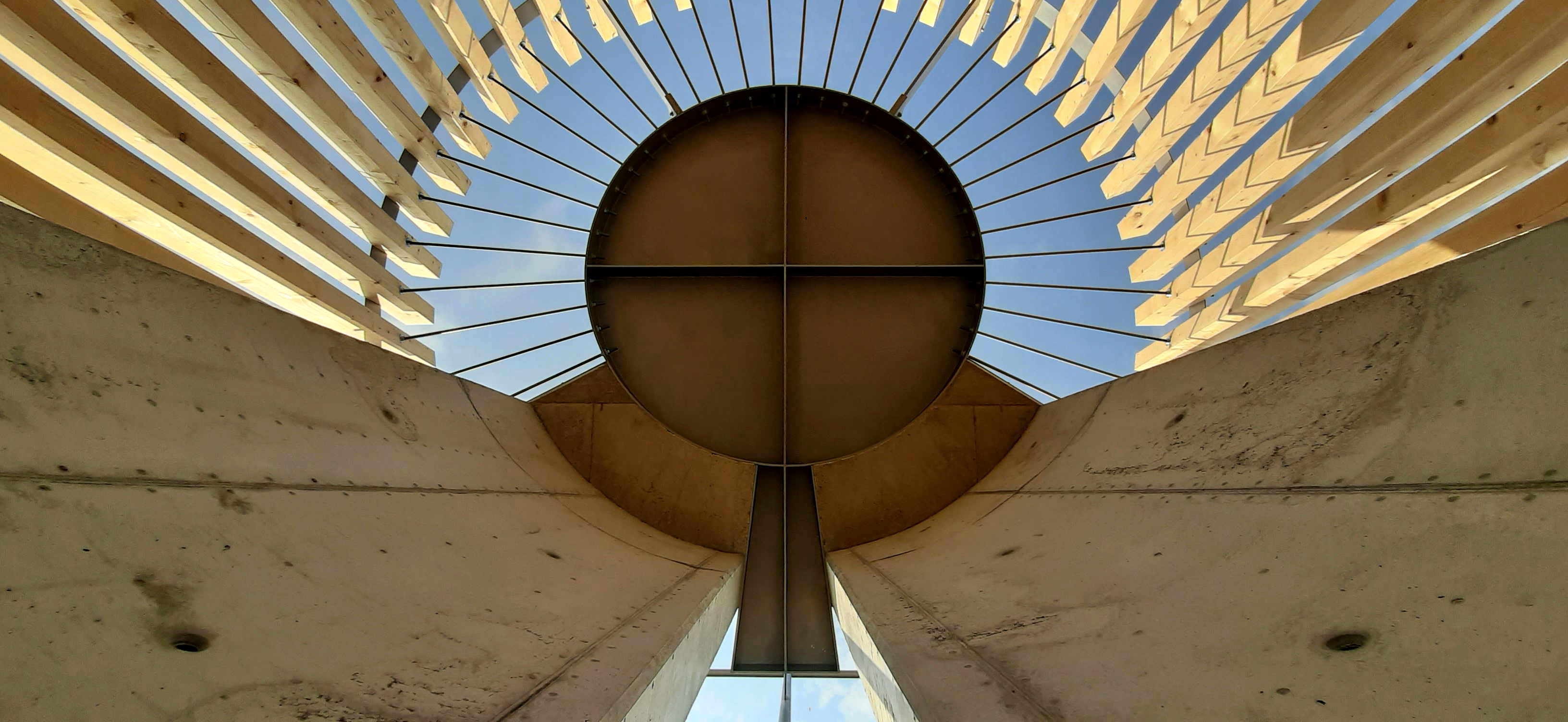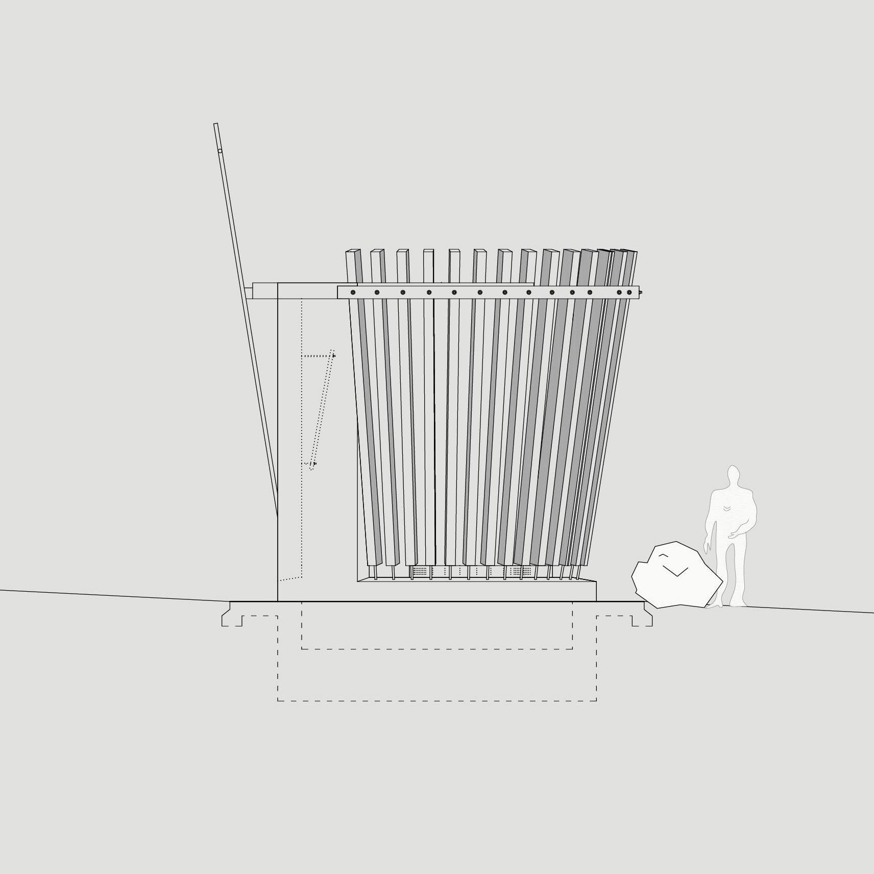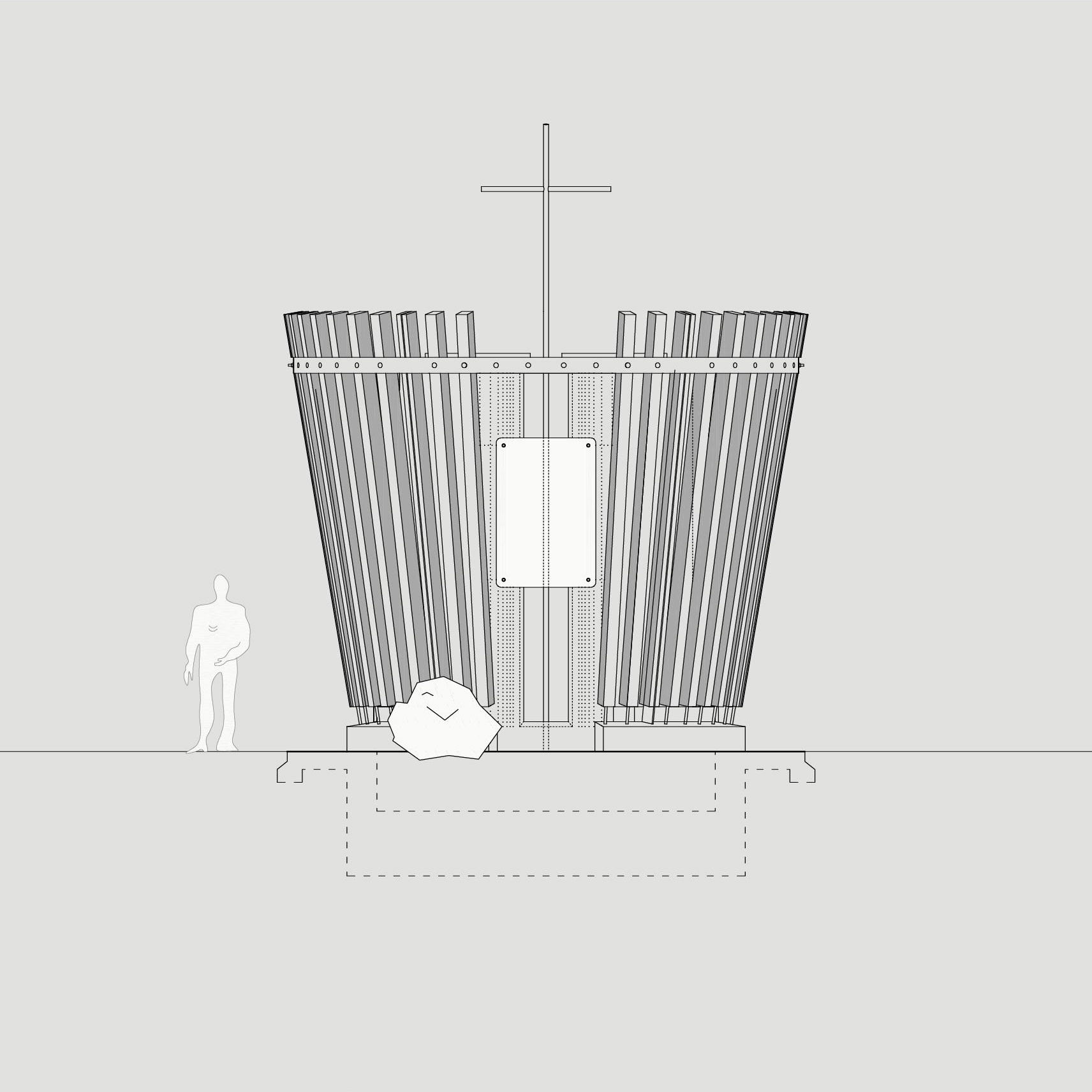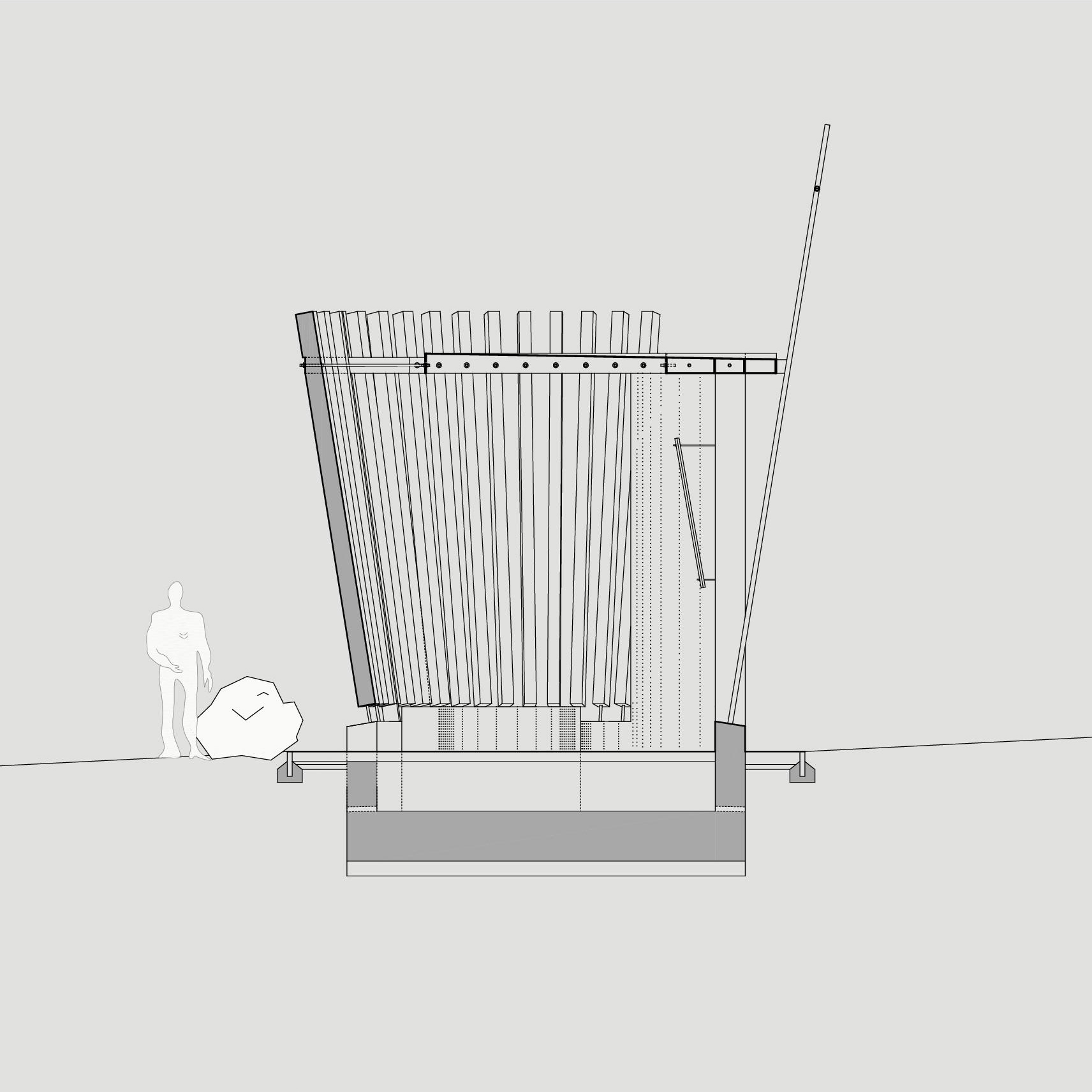 Konštrukčný princíp priestorového obalu postavený na ľahkej skladobnosti - rozoberateľnosti, nahraditeľnosti (možnej výmene) drevených skladobných prvkov - lamiel vymedzujúcich priestor, evokuje efemérnosť objektu. Reprezentuje a upozorňuje na dočasnosť existencie bytia. Skelet pevných častí z pohľadového betónu naproti tomu upriamuje pozornosť na pevné, v spoločenskom vedomí pretrvávajúce momenty žitia.