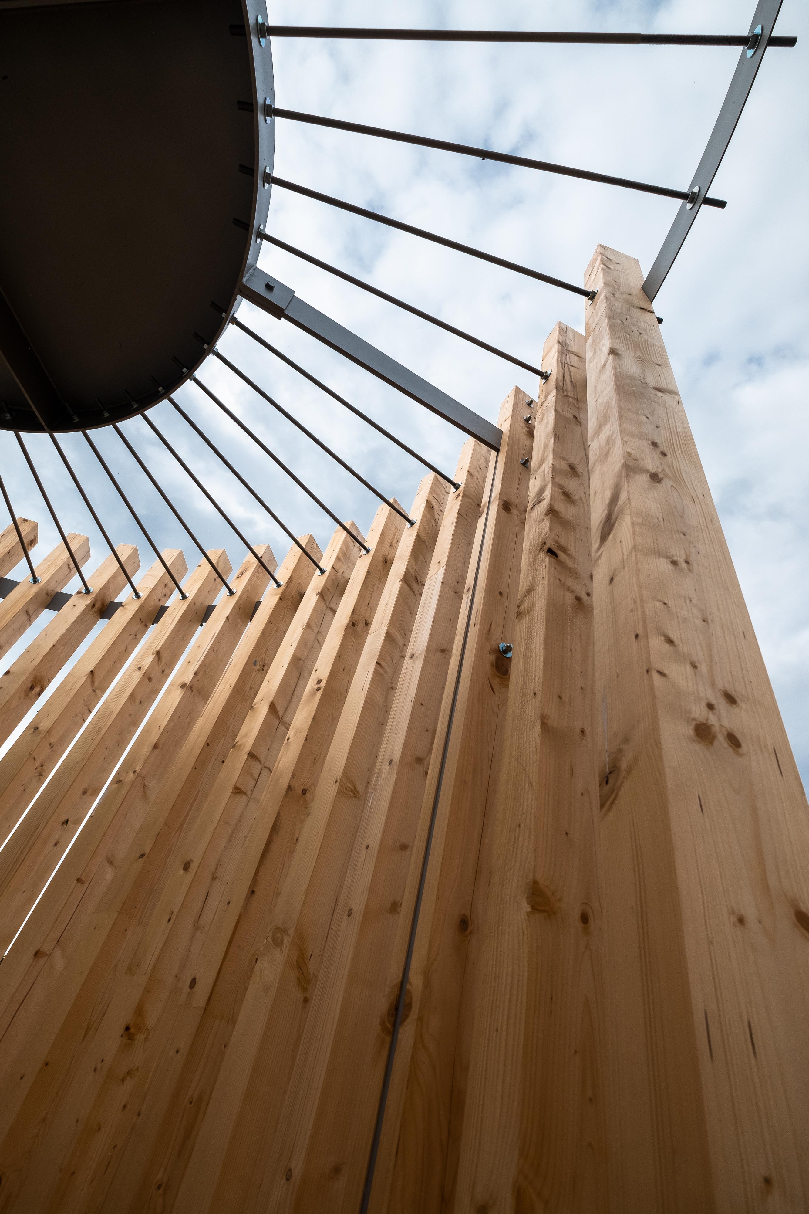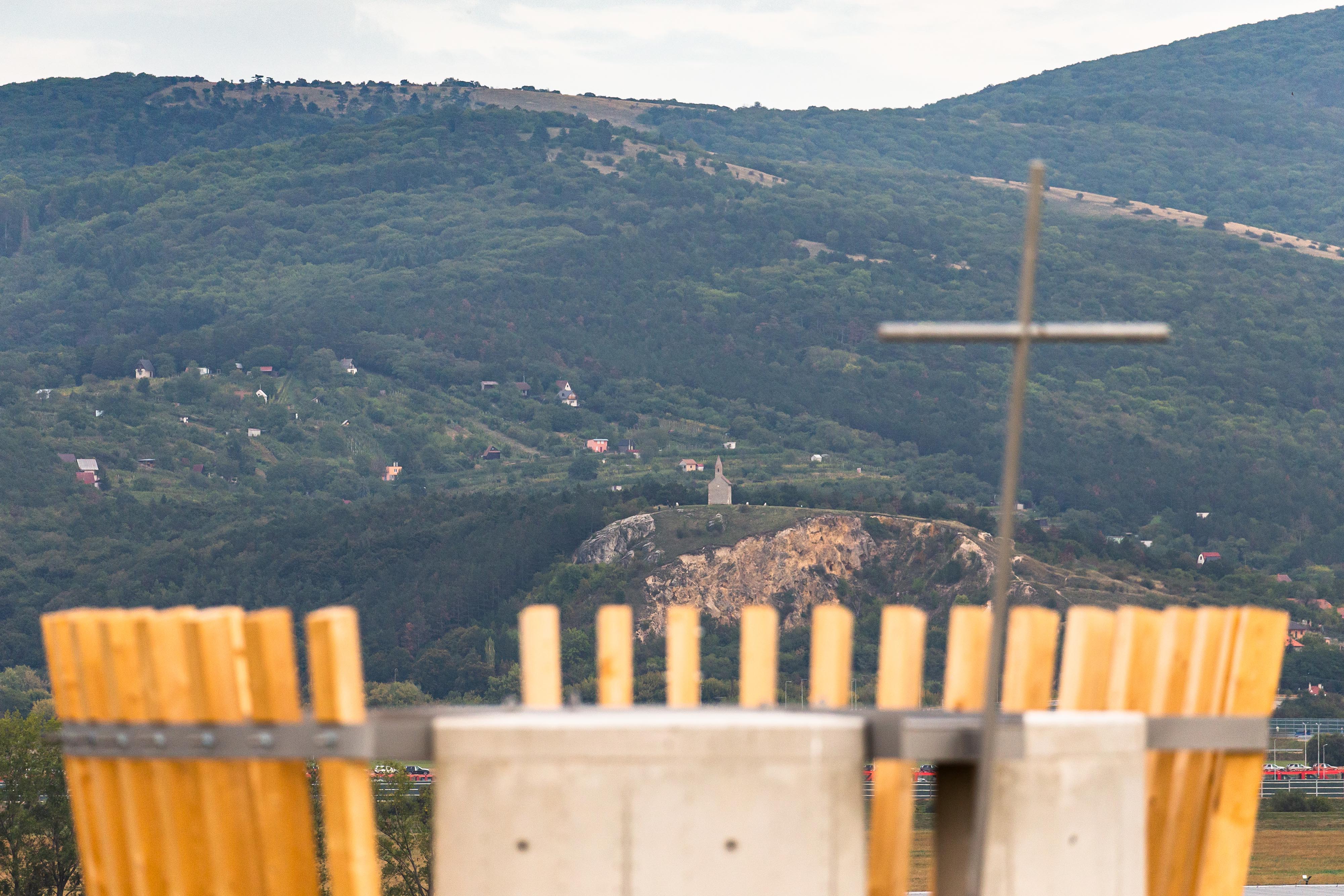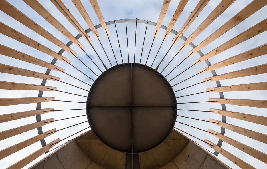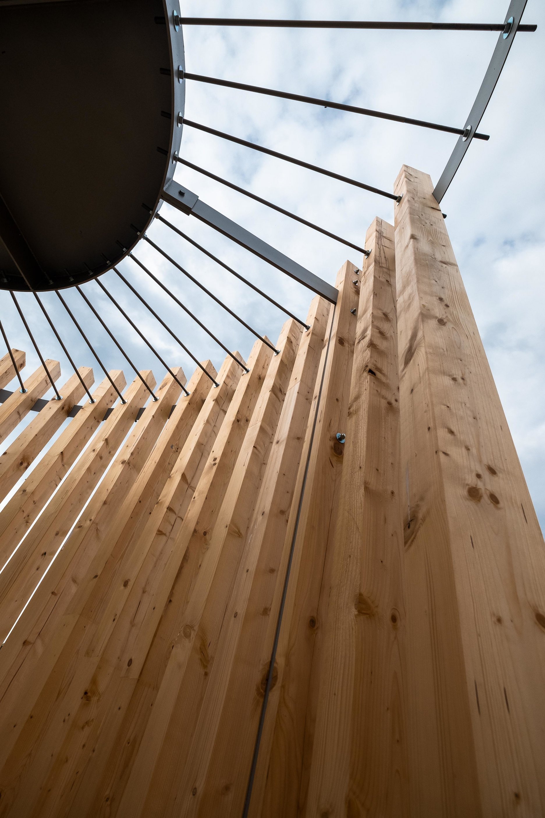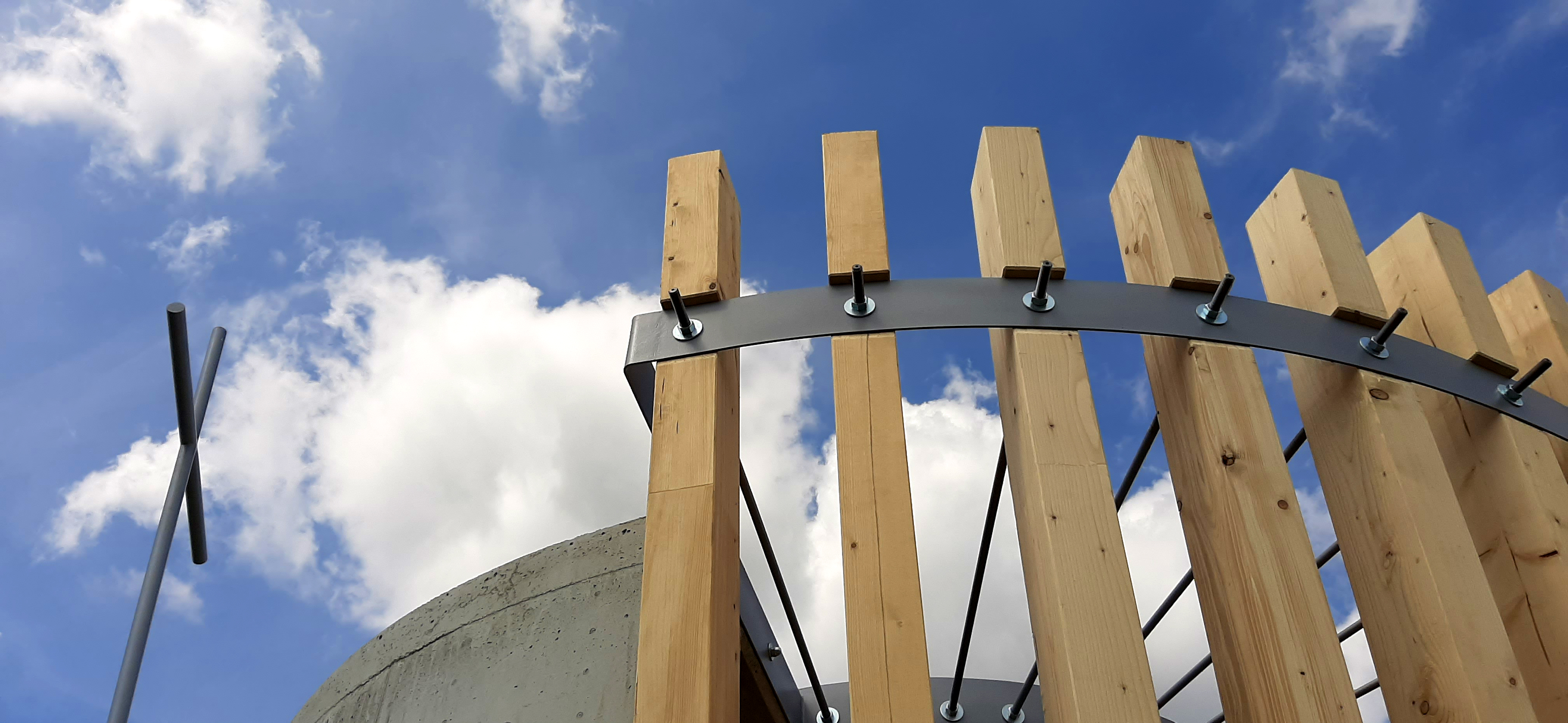 Konštrukčný princíp priestorového obalu postavený na ľahkej skladobnosti - rozoberateľnosti, nahraditeľnosti (možnej výmene) drevených skladobných prvkov - lamiel vymedzujúcich priestor, evokuje efemérnosť objektu. Reprezentuje a upozorňuje na dočasnosť existencie bytia. Skelet pevných častí z pohľadového betónu naproti tomu upriamuje pozornosť na pevné, v spoločenskom vedomí pretrvávajúce momenty žitia.
