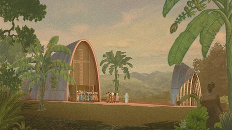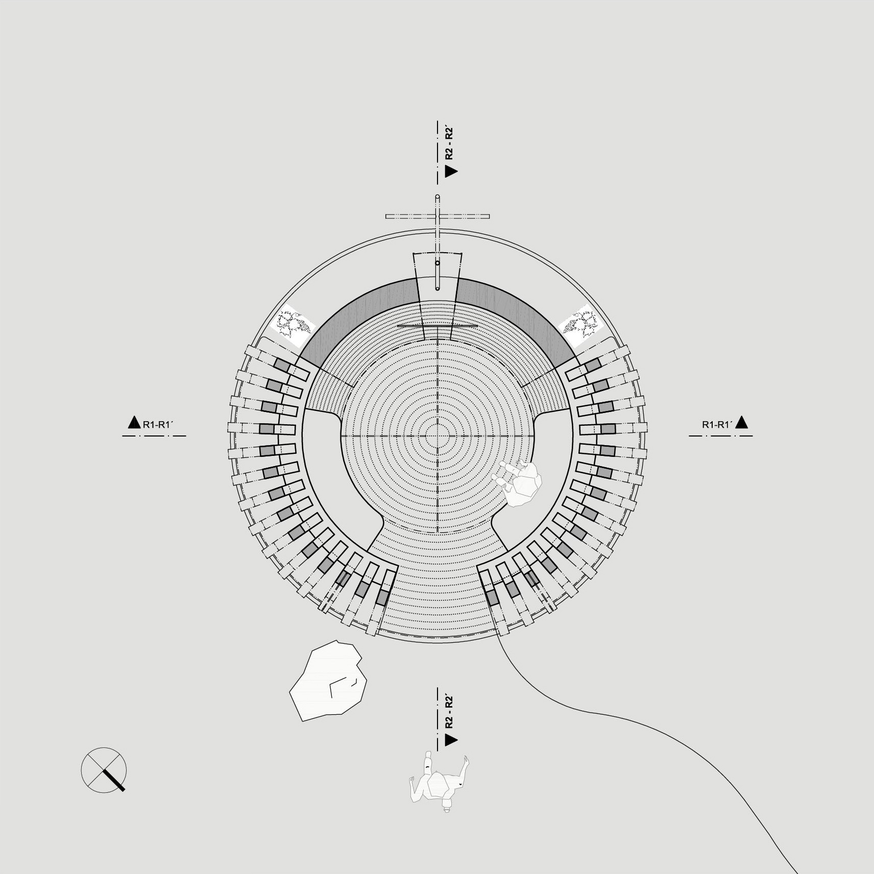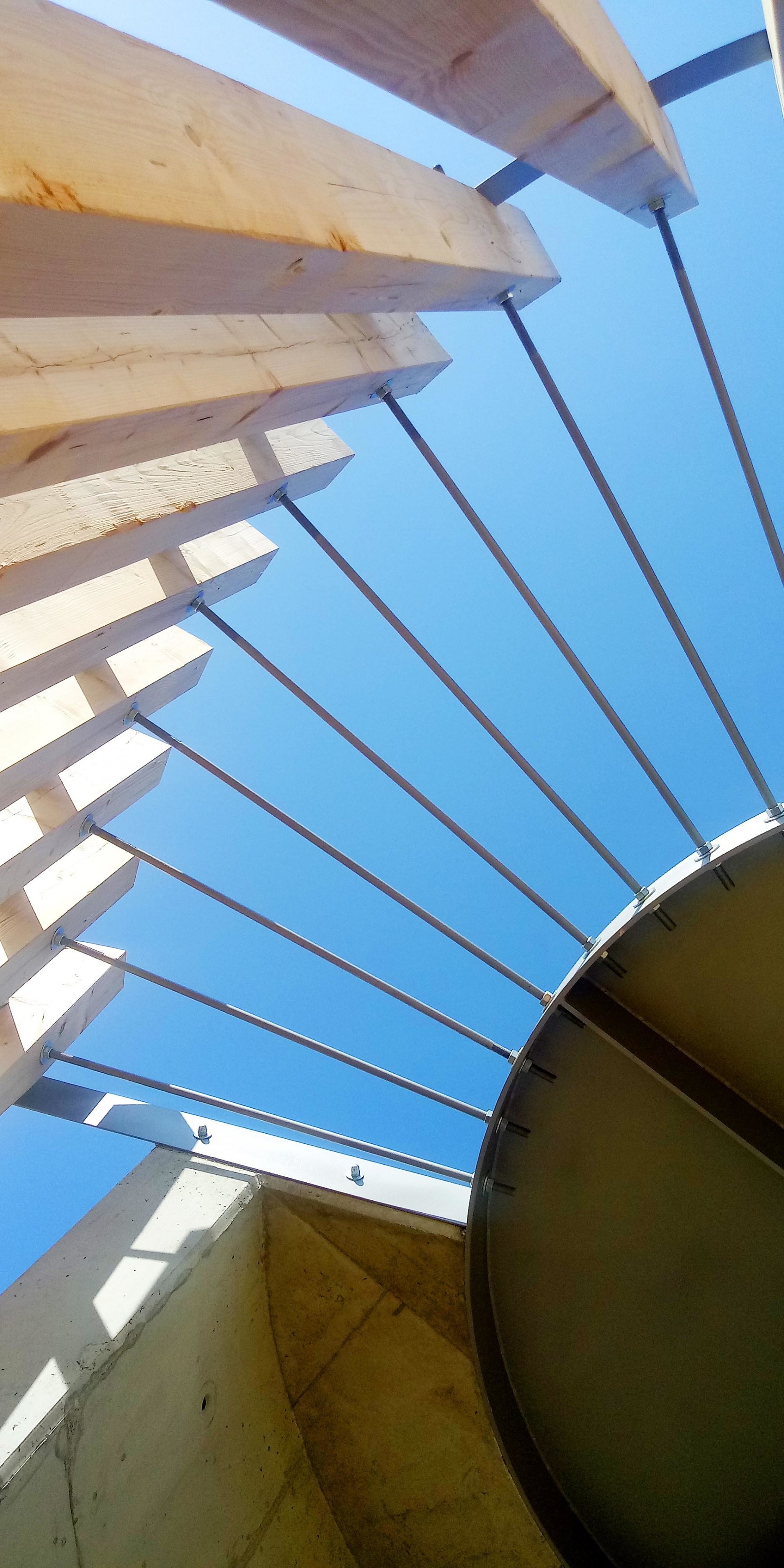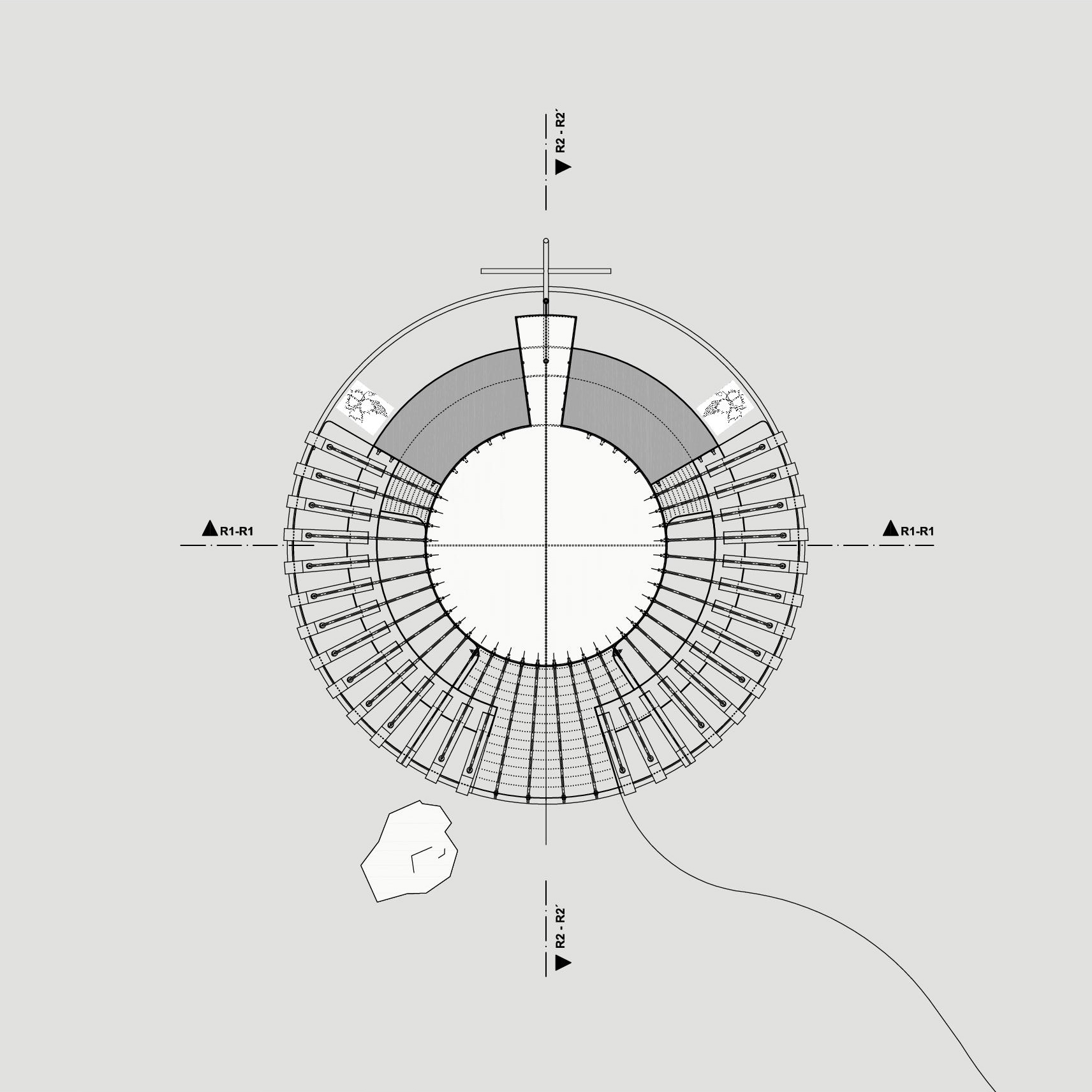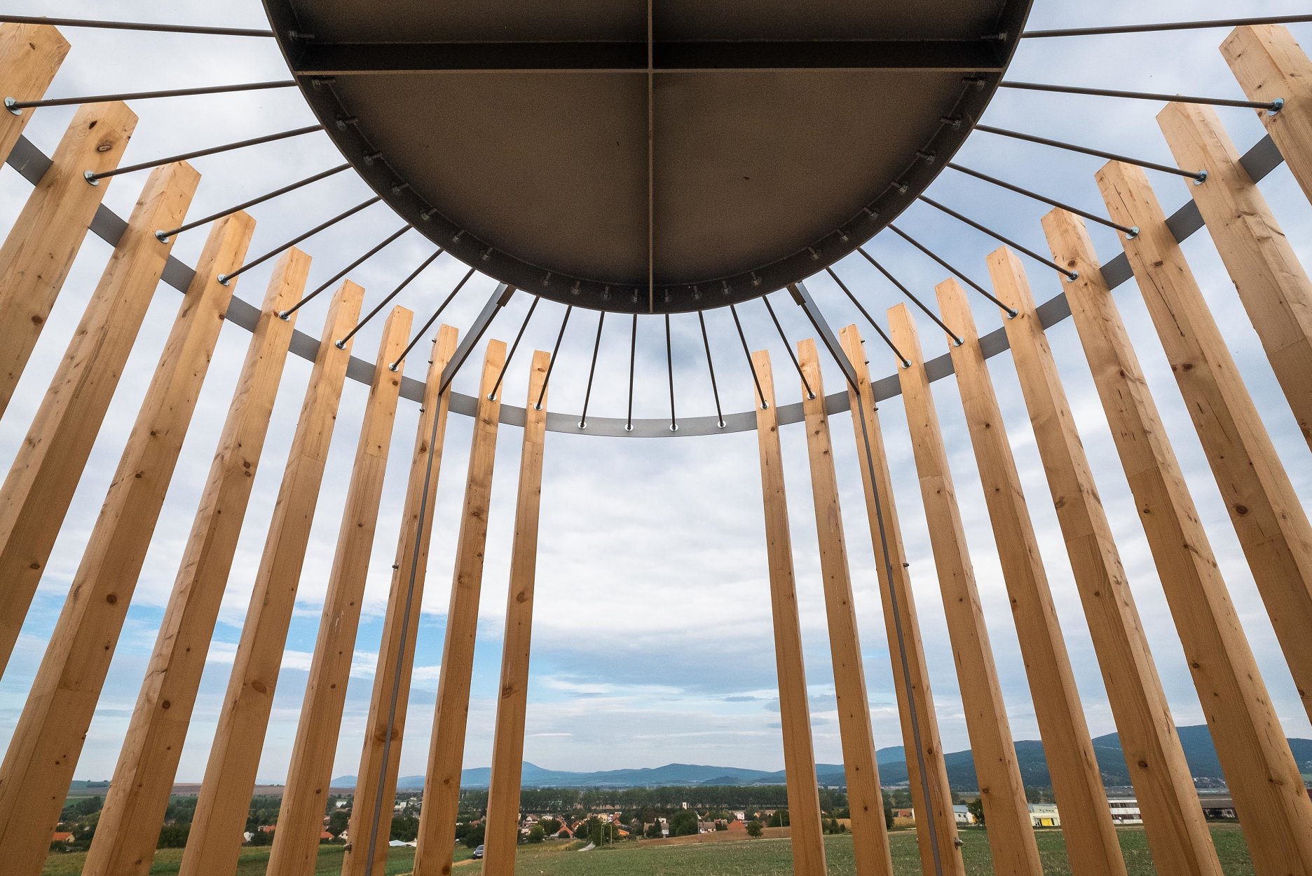 Konštrukčný princíp priestorového obalu postavený na ľahkej skladobnosti - rozoberateľnosti, nahraditeľnosti (možnej výmene) drevených skladobných prvkov - lamiel vymedzujúcich priestor, evokuje efemérnosť objektu. Reprezentuje a upozorňuje na dočasnosť existencie bytia. Skelet pevných častí z pohľadového betónu naproti tomu upriamuje pozornosť na pevné, v spoločenskom vedomí pretrvávajúce momenty žitia.