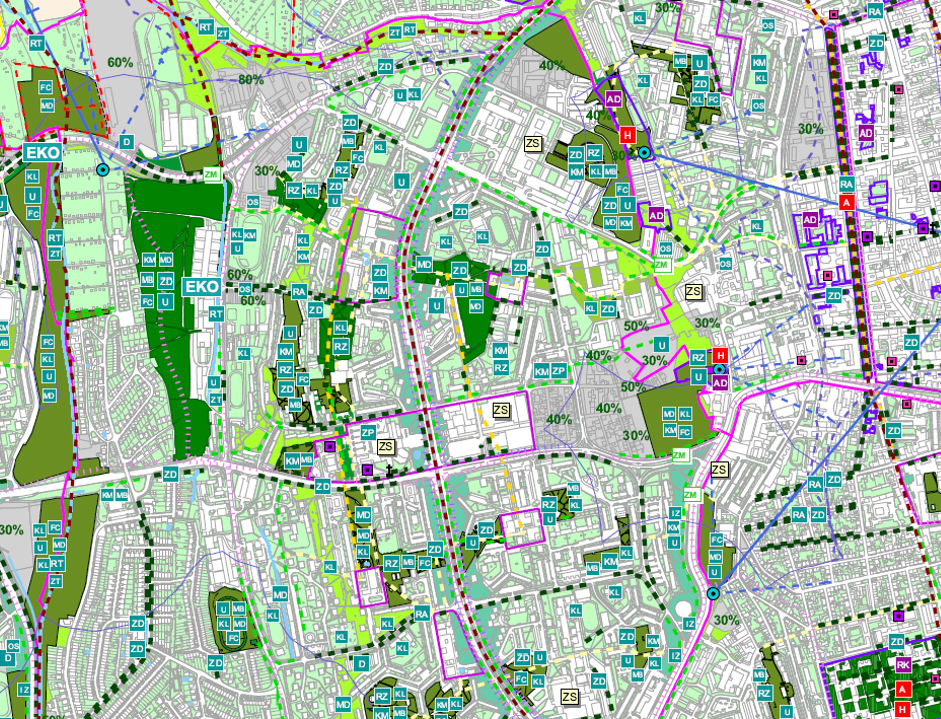 Obrázok 1: Mestská zeleň Košice / autori: Ateliér Dobrucká s.r.o., Ing. Anna Dobrucká PhD., Ing. Eva Vyrosteková, krajinné architektky / Urbanisticko-krajinárska štúdia (Výkres návrh štruktúry vegetačného krytu): 2013-2014 / O diele: Krajinná architektúra rieši zeleň aj na úrovni komplexných urbanistických systémov a štruktúr v podobe urbánnej zelenej infraštruktúry. Urbanisticko-krajinárska štúdia mestskej zelene v Košiciach bola vypracovaná ako územnoplánovací podklad. V súčasnosti prebieha aktualizácia štúdie pre potreby územného plánovania. Cieľom je definovať potenciál pre tvorbu udržateľného mesta a navrhnúť opatrenia smerujúce k riešeniu klimatickej a environmentálnej krízy, čoho nevyhnutným predpokladom je funkčný systém mestskej zelenej infraštruktúry.Obrázok: Anna Dobrucká, 2014