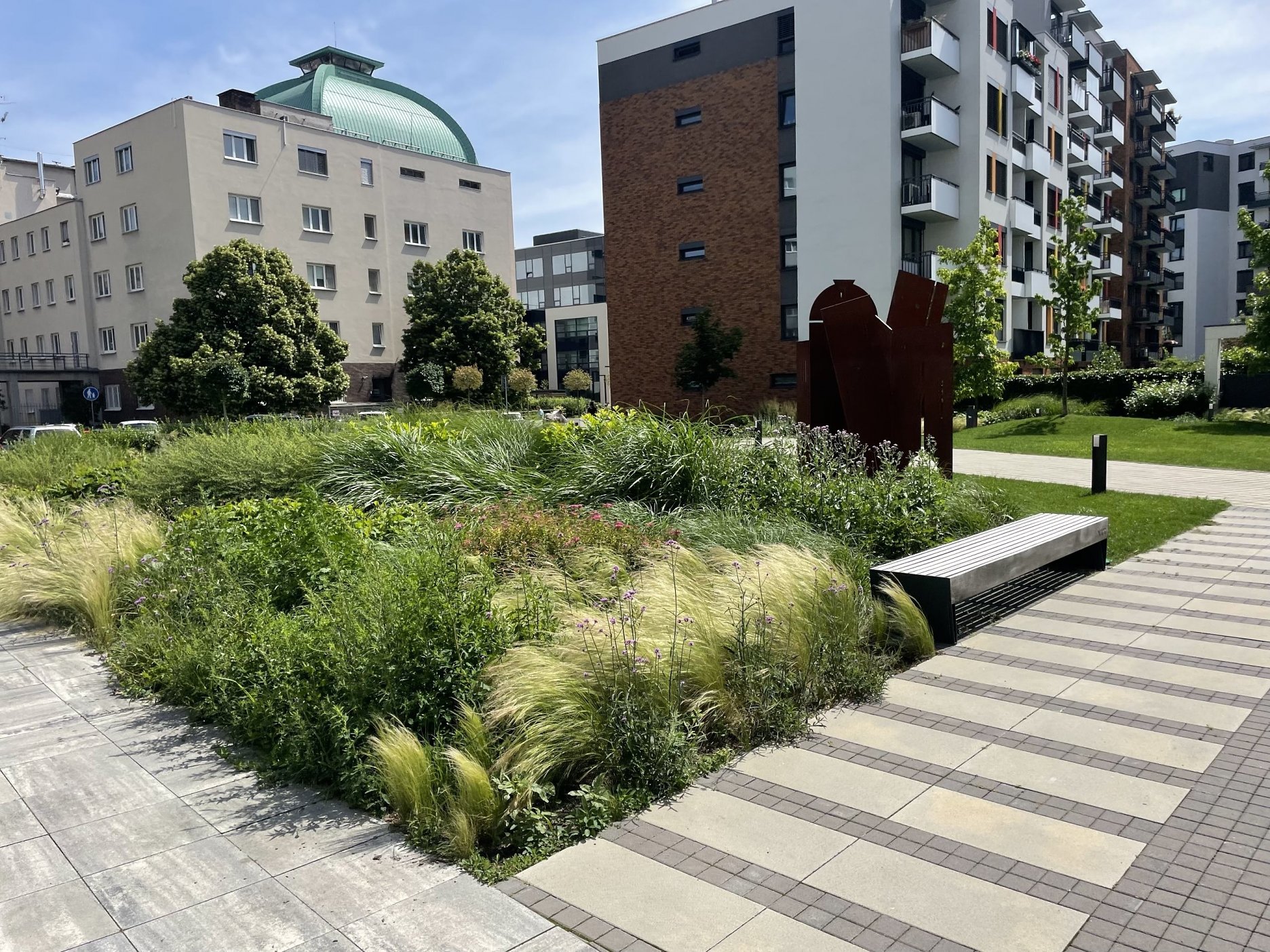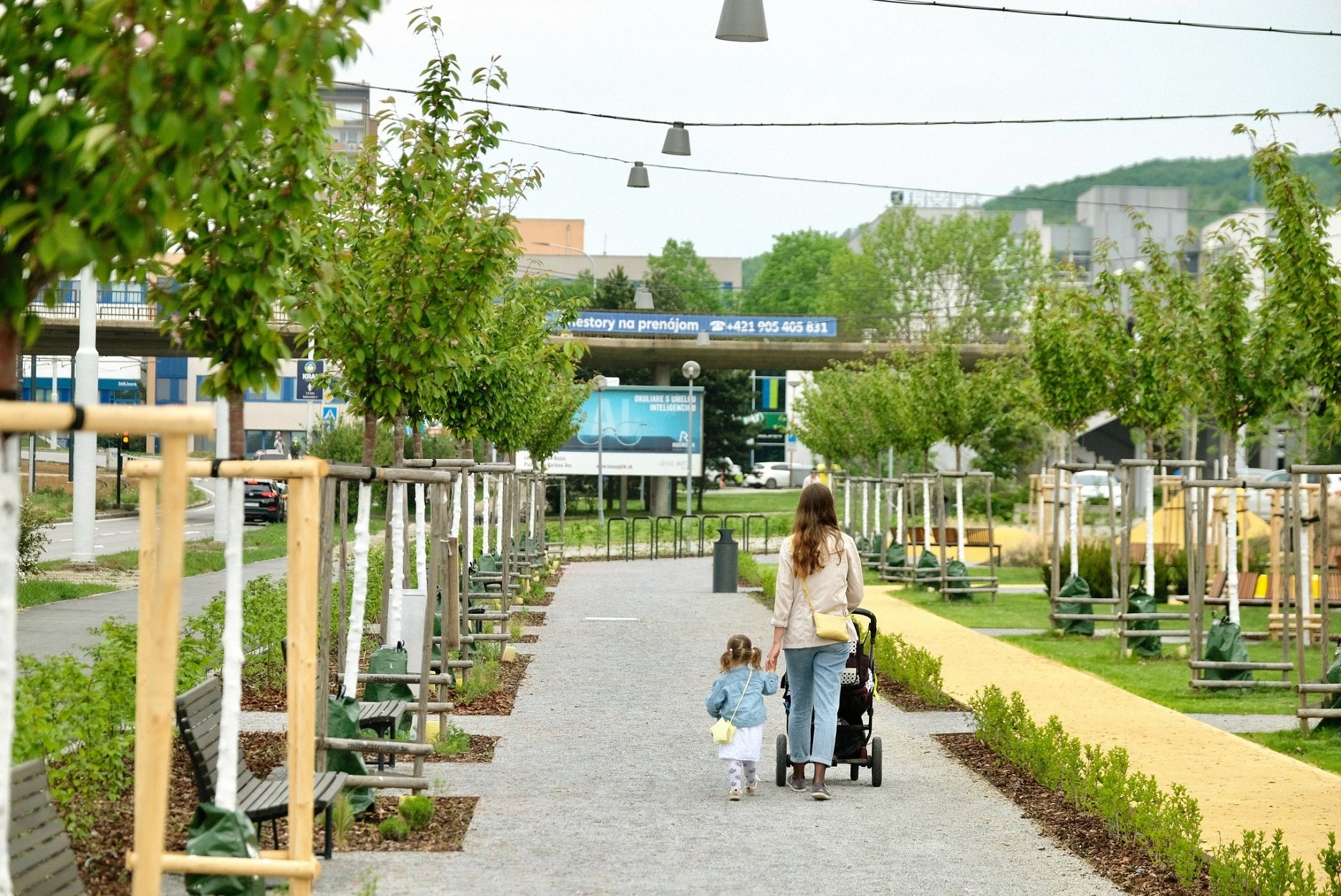 Obrázok 7: Promenáda Stein / autor: Ing. Eugen Guldan, PhD., krajinný architekt / návrh: 2018, 2020, realizácia: 2019-2021 / O diele: Verený priestor pri Steine je kompozičným a funkčným predĺžením Kmeťovho námestia k novému evanjelickému kostolu. Vznikol na mieste niekdajšieho areálu pivovaru. Atraktívny park s kvalitnou zeleňou prepojil tri územia. V Promenáde Stein sa snúbi rezidenčný komplex s verejným priestorom. Atraktivitu prostredia zvyšujú výsadby drevín a trvalkové výsadby. V roku 2022 pribudlo aj nové detské ihrisko v spolupráci s mestom Bratislava.Foto: Ing. Eugen Guldan, PhD., 2022