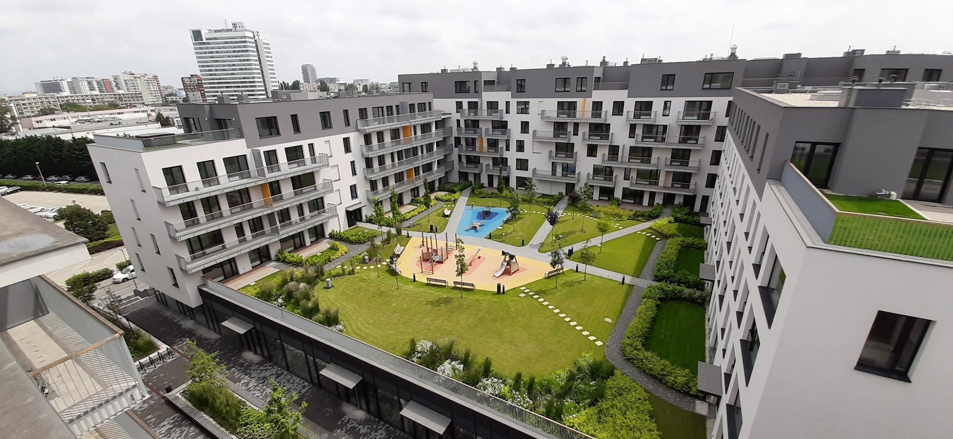 Obrázok 8: Obytný súbor Jarabinky / autori: SPDe architekti, Ing. Andrea Prievalská a Ing. Katarína Serbinová, krajinné architektky (po DÚR) / návrh: 2015-2017, realizácia: 2017-2020 / O diele: Urbanisticky tvoria Jarabinky ucelený mestský blok, vymedzený ulicami Mlynské nivy (z juhu) a Jarabinková (zo severu). V smere východ-západ prechádzajú nové pešie a automobilové komunikácie. Na úrovni verejných priestorov sa obytný súbor zapája do svojho okolia. Objekt s pôdorysom v tvare písmena E ohraničuje na úrovni druhého nadzemného podlažia dva vnútrobloky. Zvýšená poloha zelených dvorov vytvára intímnejšie komunitné prostredie pre obyvateľov. Plynulý prechod na zvýšenú úroveň umožňuje systém rámp a terénnych schodísk v okolí objektu Foto: Andrea Prievalská, 2022