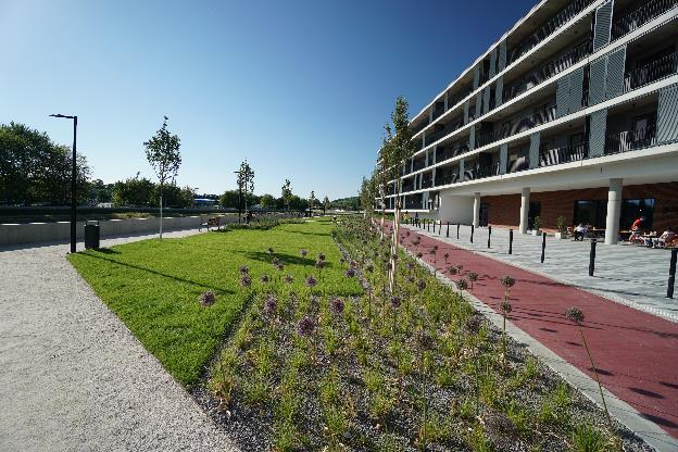 Obrázok 9: Promenada Living Park Nitra / autori: 2ka, s.r.o., Ing. Peter Pasečný, spolupráca: Ing. arch. Ladislav Nagy, Ing. arch. Martin Tribus, Mgr. art. Pavel Suško, Ing. Katarína Slobodníková, Ing. Anna Lišková / návrh: 2016-2020, realizácia: 2020-2022 / O diele: Dlhé roky stál na nábreží rieky Nitra v krajskom meste nedokončený skelet rozsiahlej stavby. Zmena prišla v uplynulých rokoch. Promenada Living Park je dnes multifunkčným objektom pre bývanie a služby. Dielo vizuálne komunikuje s historickým jadrom mesta a definuje novú kvalitu nábrežia, s pestrou ponukou aktivít a zážitkov pre všetky vekové kategórie vhodným pomerom služieb a rezidencie. Krajinná architektúra začleňuje stavbu do okolia novými výsadbami drevín a sviežimi trvalkovými úpravami, ktoré vytvárajú atraktívny verejný priestor nábrežiaFoto: Peter Pasečný, 2022