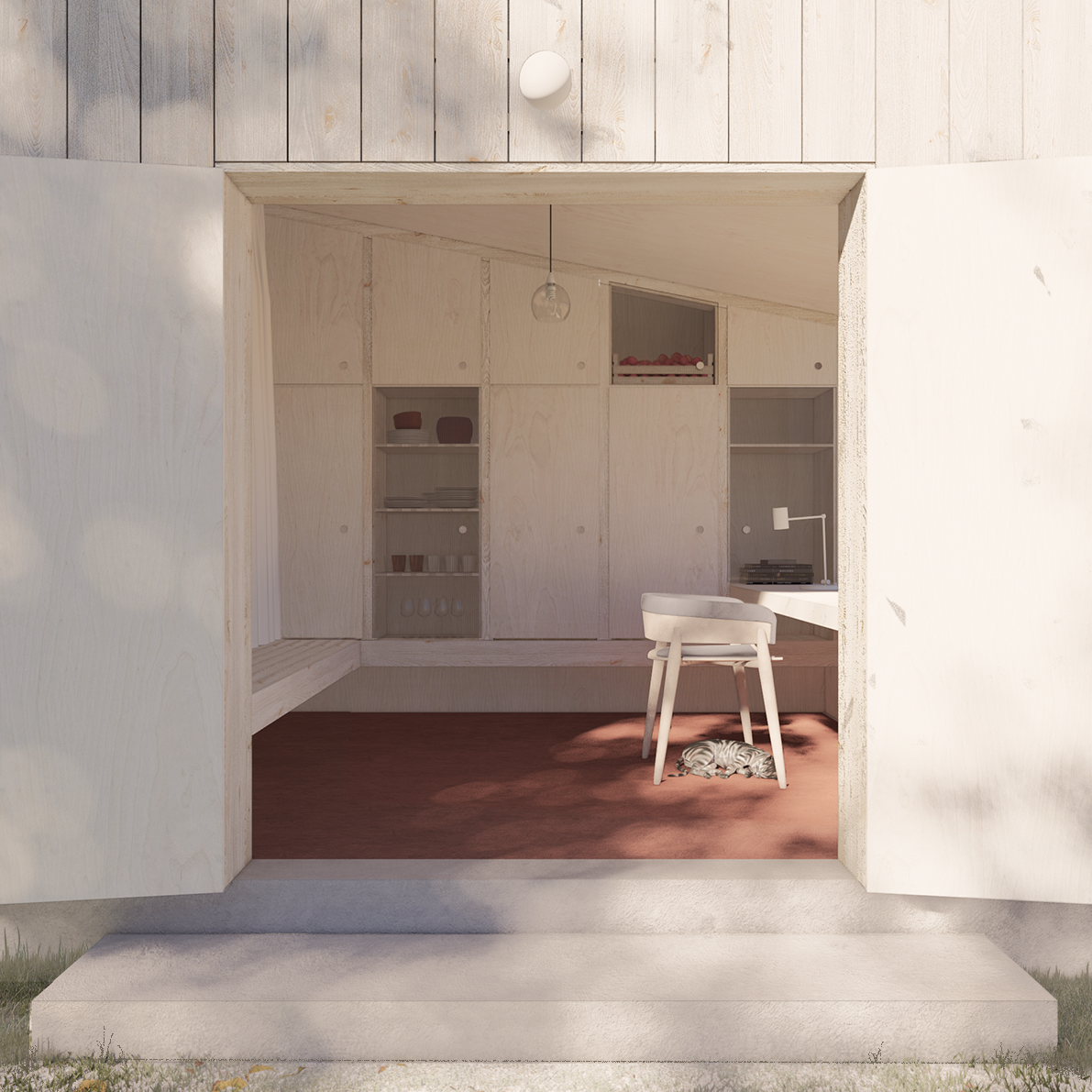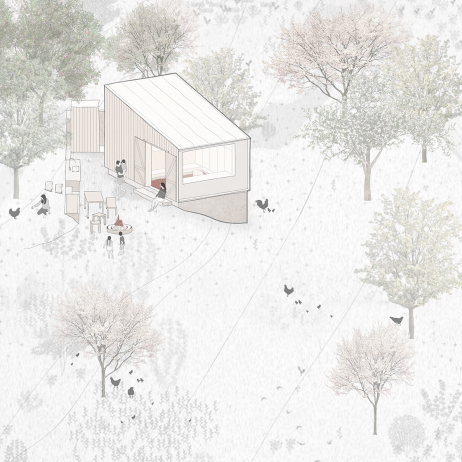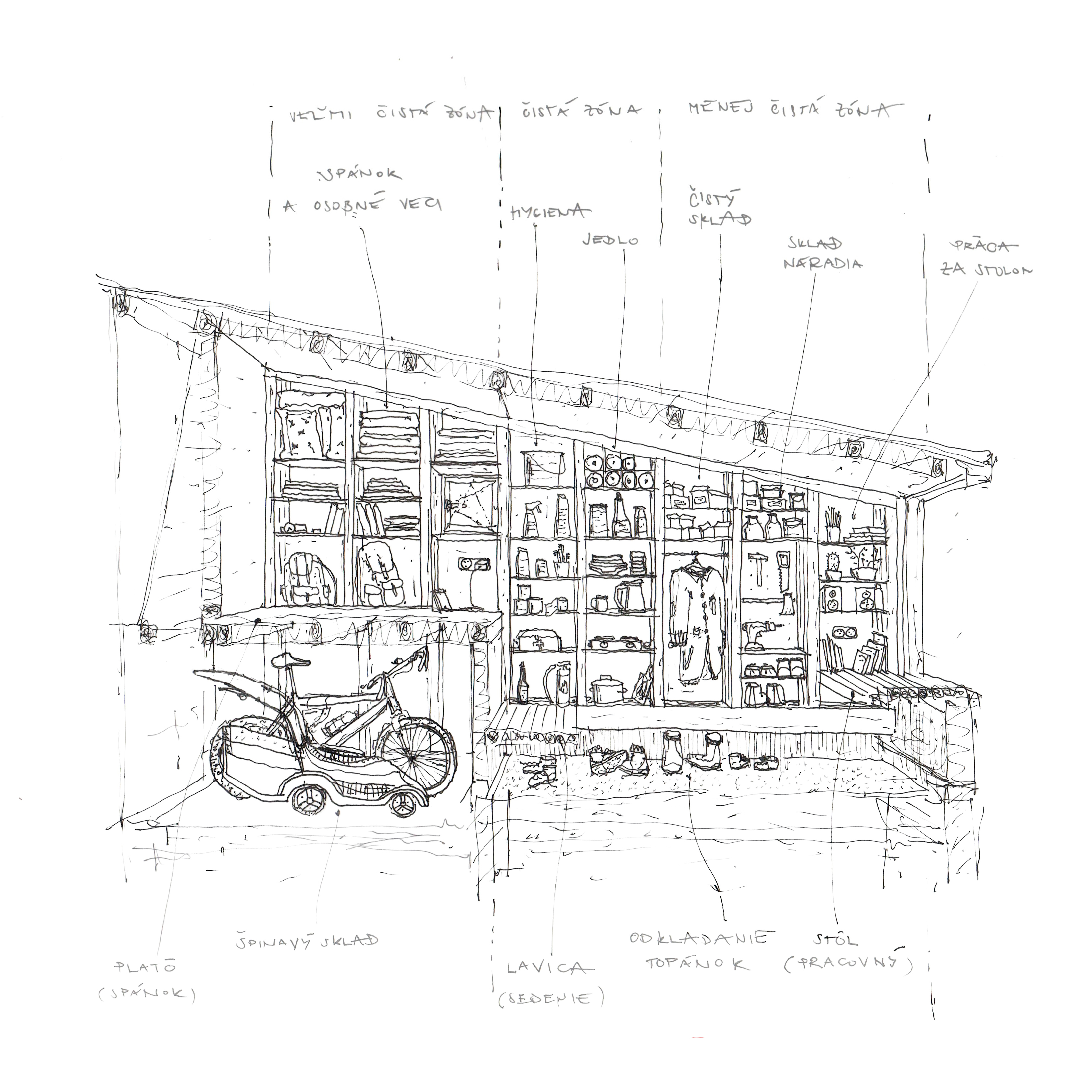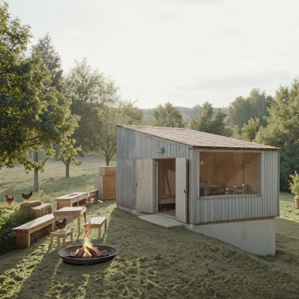 Weekend cabin for a family with kids is located in the lovely countryside of Myjava region, Slovakia. Carefully placing the object at an angle between the trees of the existing apple orchard creates a leeward for a firepit with exterior kitchen and at the same time shapes the direction of a window view to the valley. The space is divided into a few zones and offers multiple storage types. Pursuing the environmentally sustainable interventions, the structure above ground is from local wood and the floor from local clay.