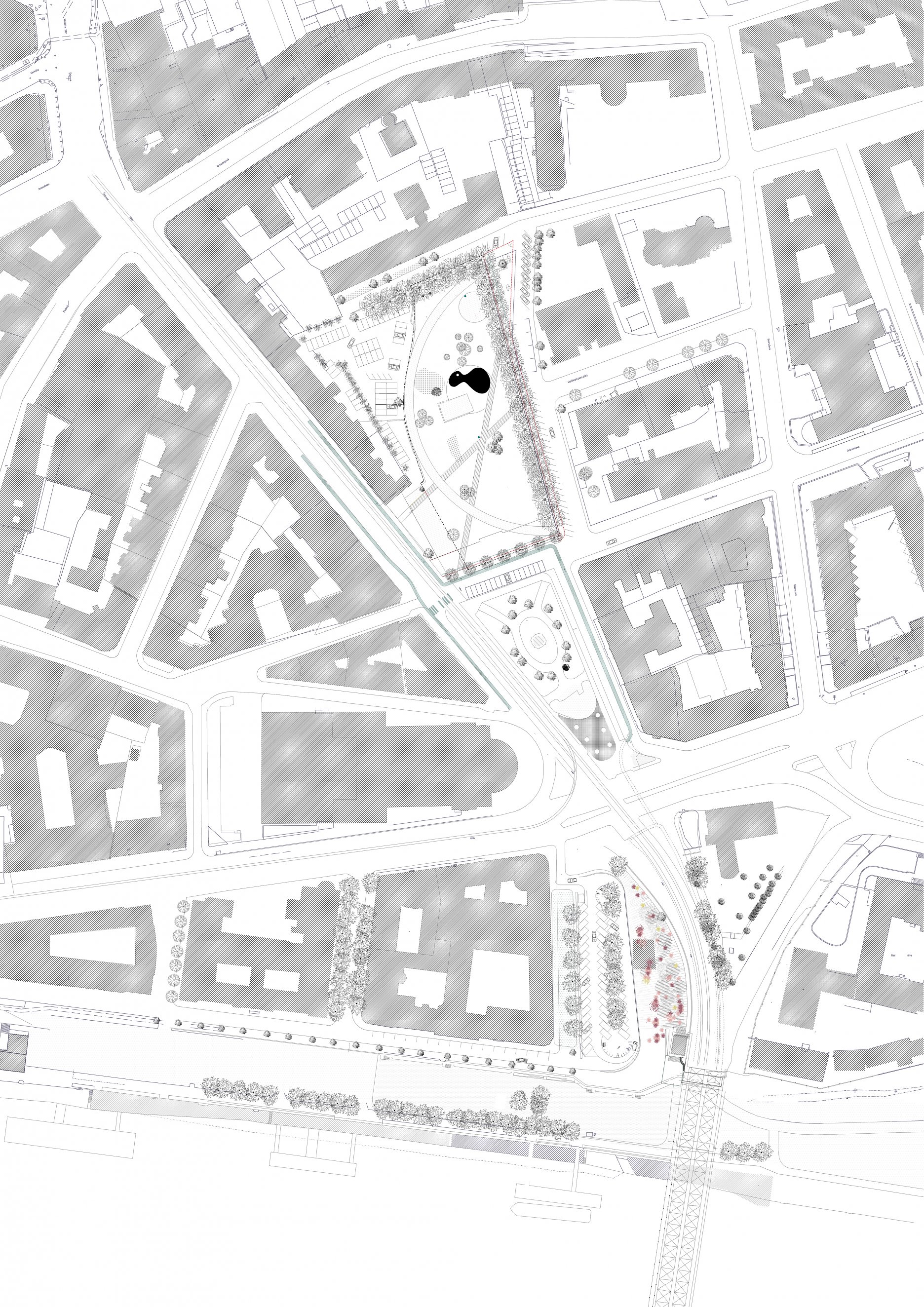 Mestský mobiliár od mmcité2 dopĺňa systém osvetlenia sústredený najmä pozdĺž polkruhovej promenády. Nový verejný park možno definovať hlavne ako mestský priestor vďaka absencii hraníc, oplotenia a stáleho prístupu cez deň aj v noci.