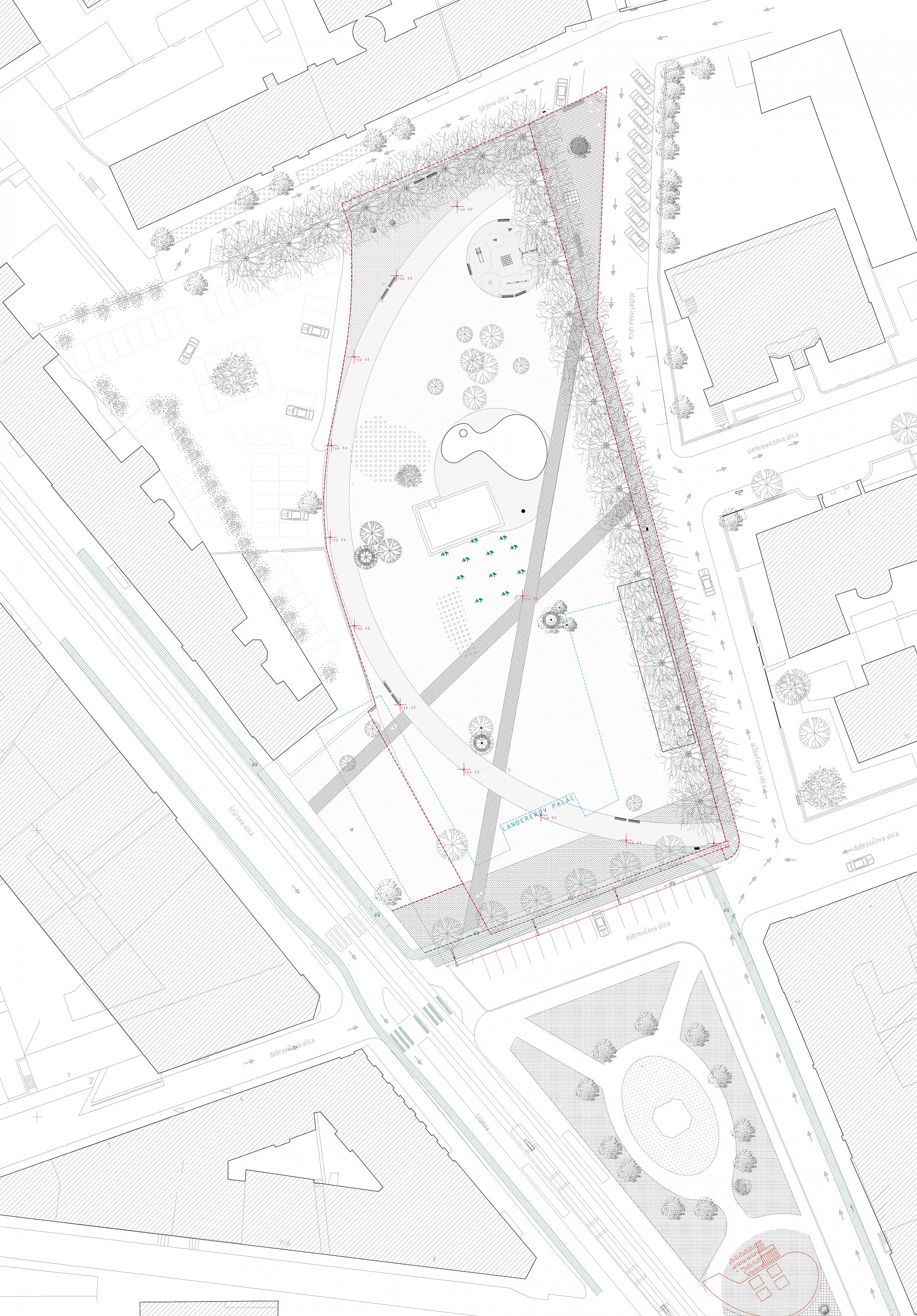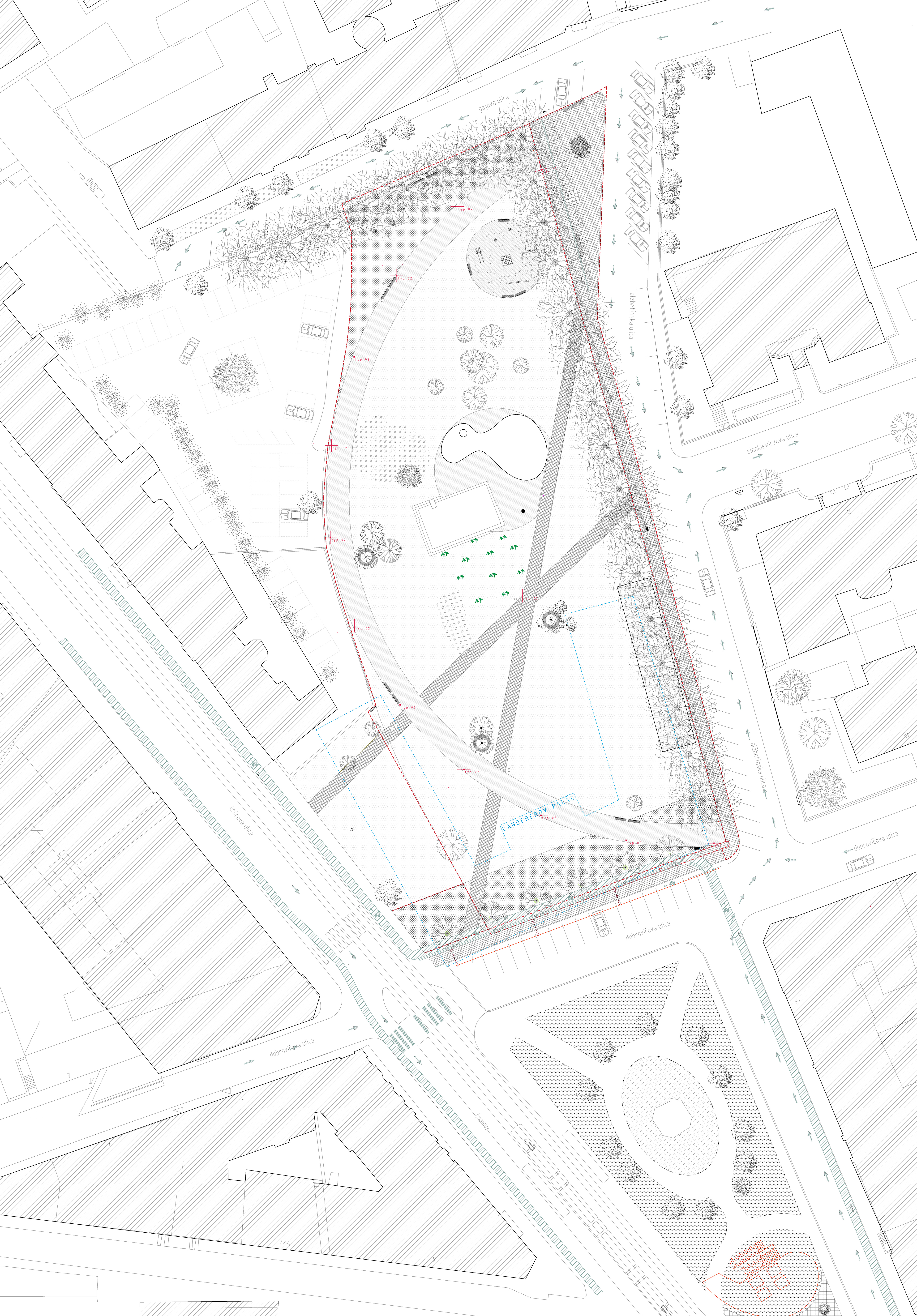Dve priečne pešie trasy s dlažbou z prírodného kameňa pretínajú polkruhovú promenádu so spevneným povrchom. Stopäťdesiat metrov dlhá polkruhová trasa vytvára miesto pre skutočnú prechádzku vo vnútri parku.