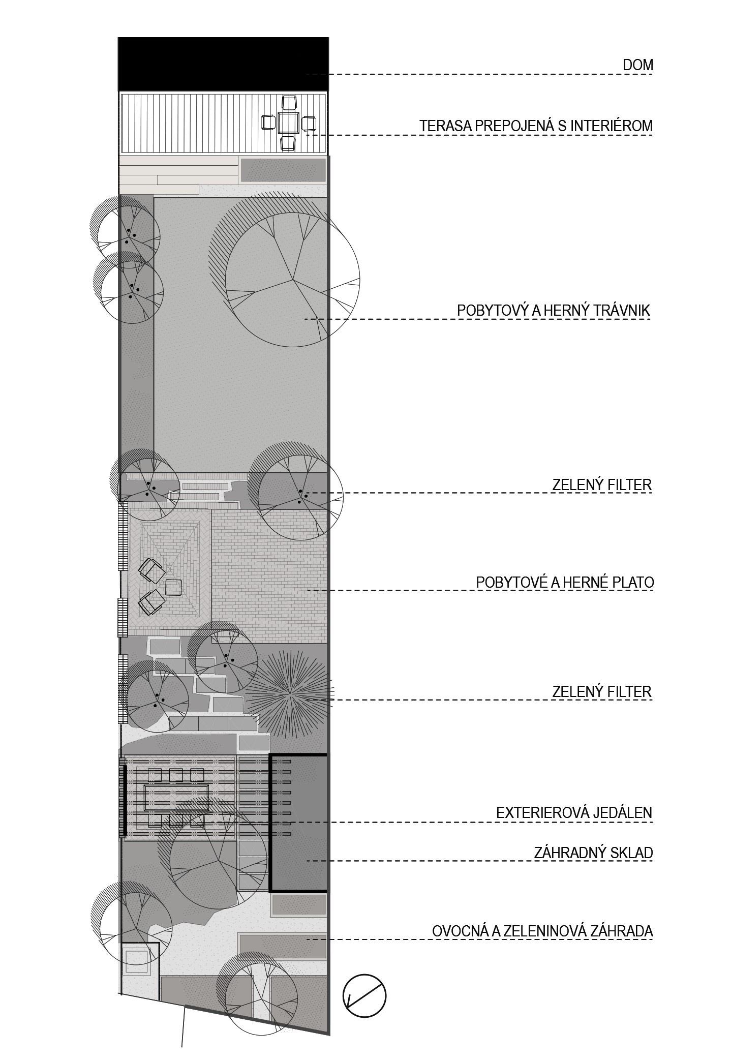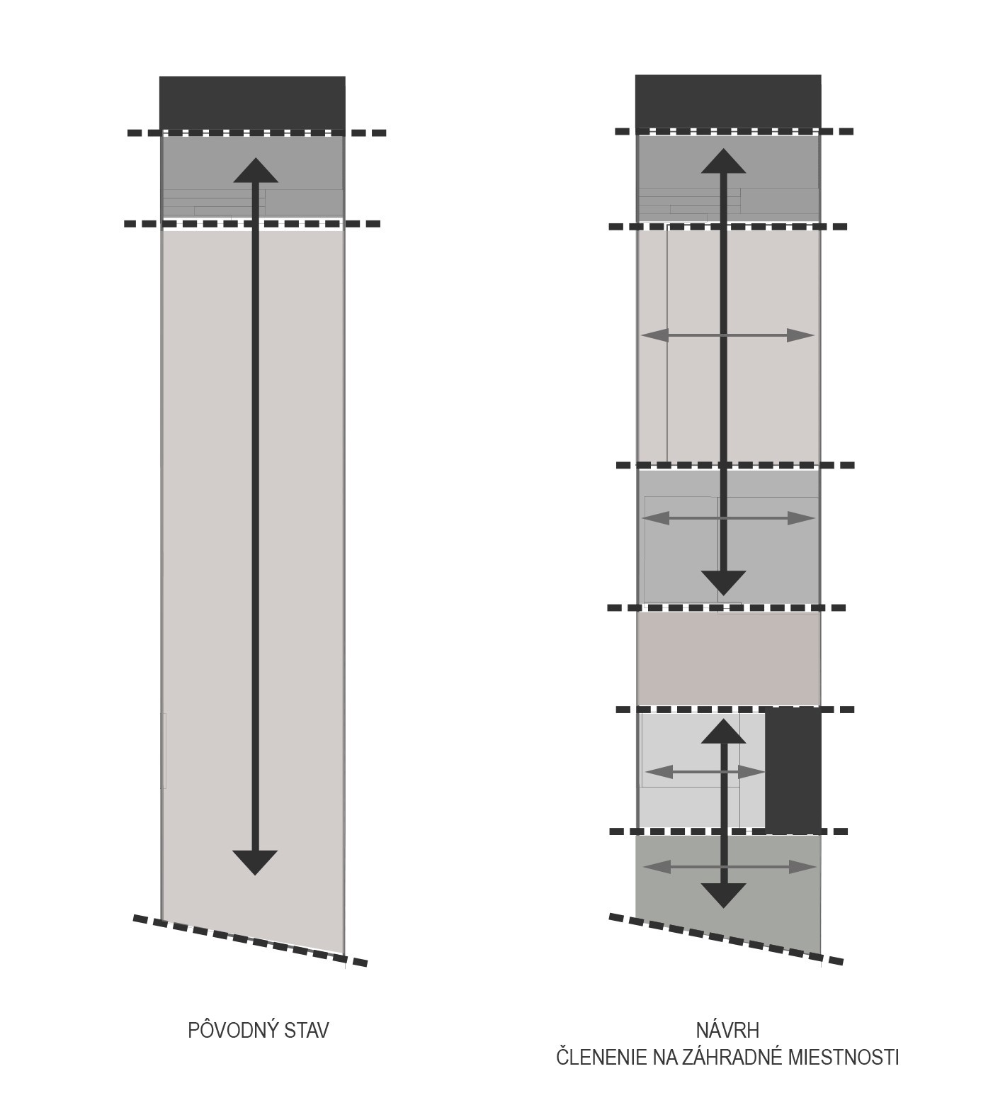 Úzka lineárna záhrada nadväzujúca na radovú zástavbu tvorí jeden z typologických mestských záhradných priestorov. O záhradu bolo starostlivo postarané, no s generačnou výmenou a rekonštrukciou domu prišli nové požiadavky a plány aj na využitie záhrady.