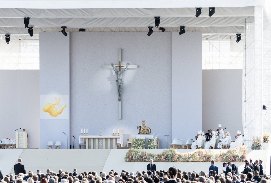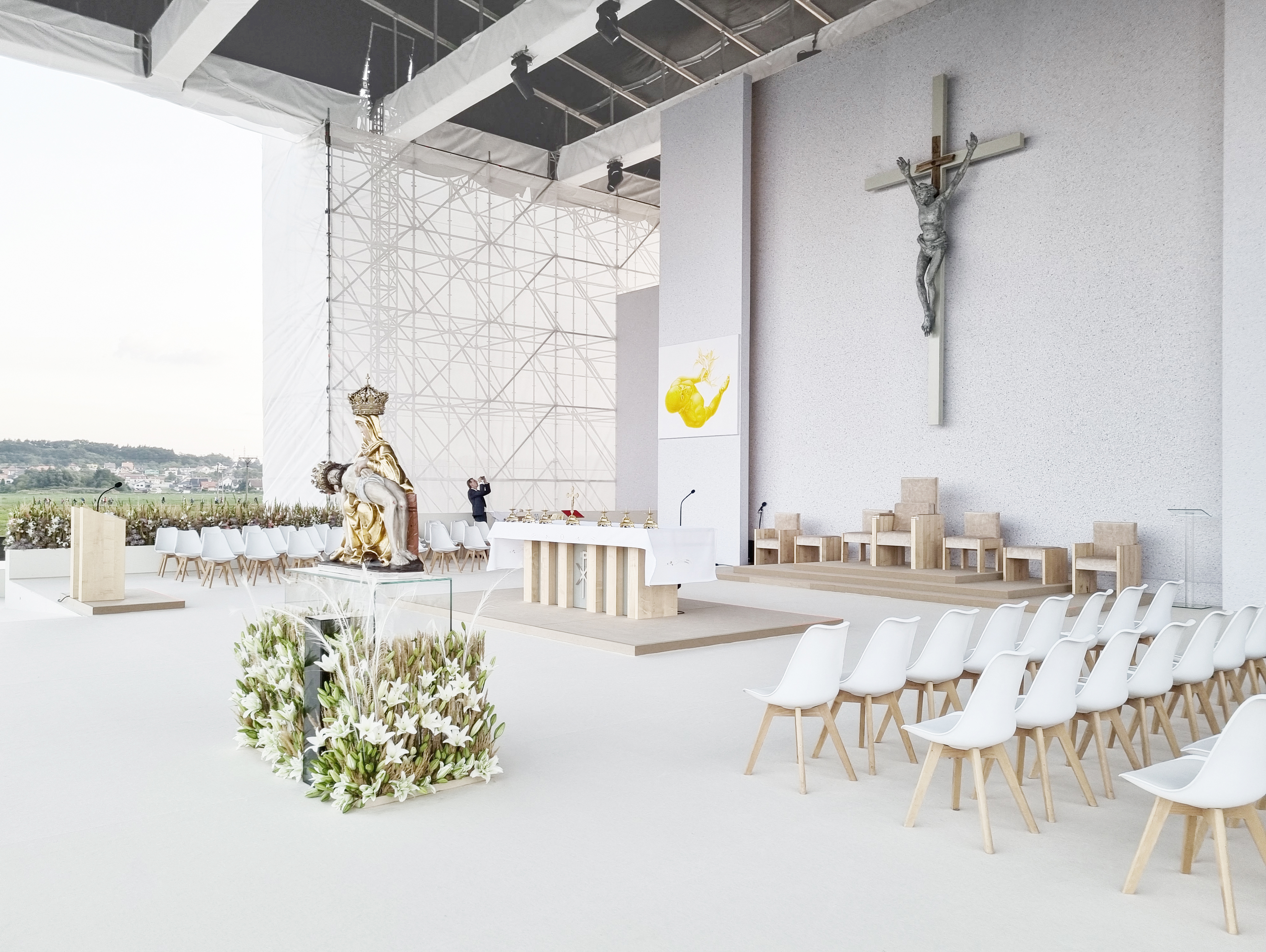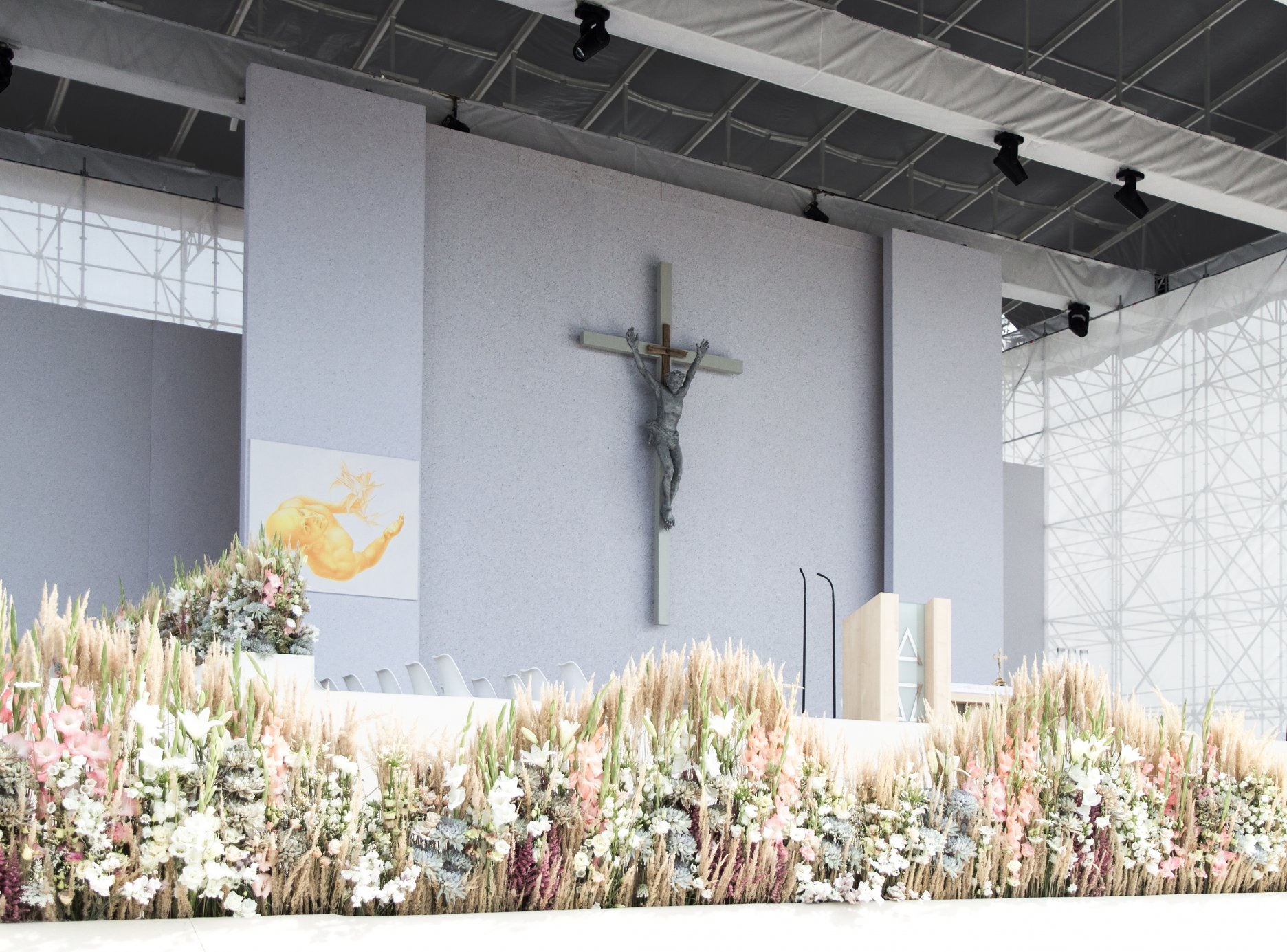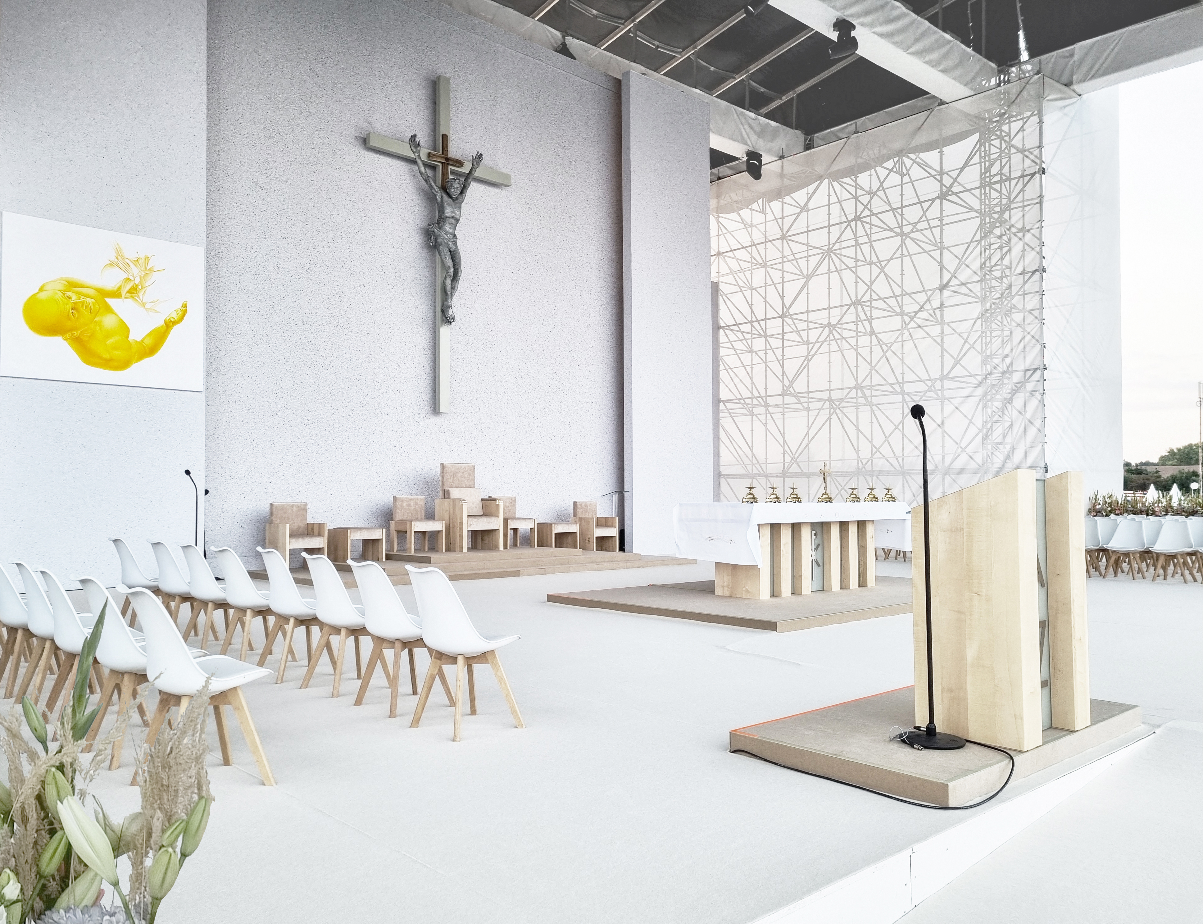 Liturgický priestor situovaný vo voľnej krajine bol v návrhu orientovaný tak, aby účastníci svätej omše mali vizuálny kontakt s historickou siluetou Šaštína a s barokovými vežami baziliky. V celkovej situácii areálu pontifikálnej omše bolo ústredným objektom presbytérium, ďalej tu bolo zázemia so sakristiami pre svätého otca, pápežský sprievod, kardinálov a biskupov, potom objekty pódia pre hudobníkov a spevácky zbor, tlačové stredisko pre akreditovaných novinárov, objekty pre hygienu a zdravotnú pomoc, a samozrejme rozsiahlou súčasťou areálu boli sektory pre účastníkov omše.