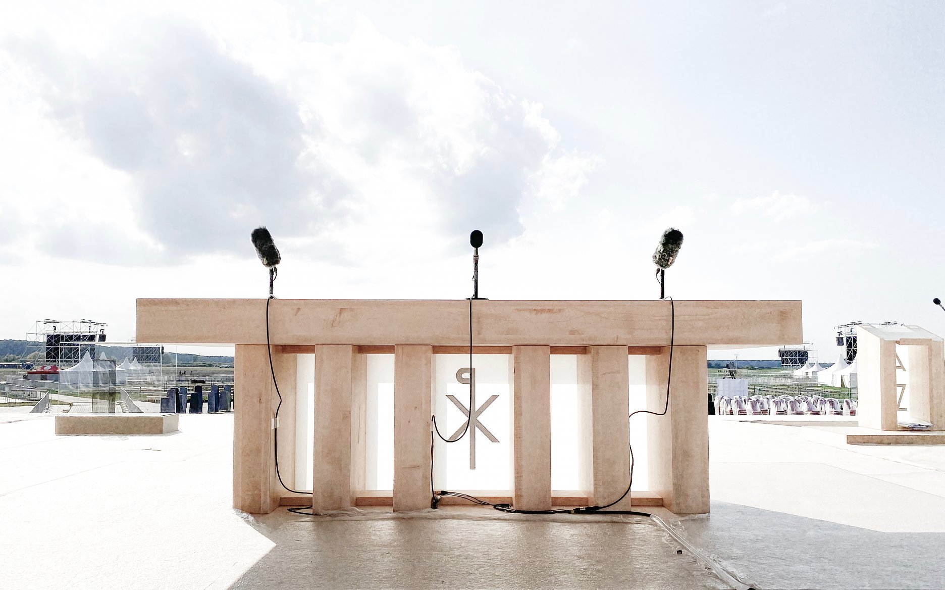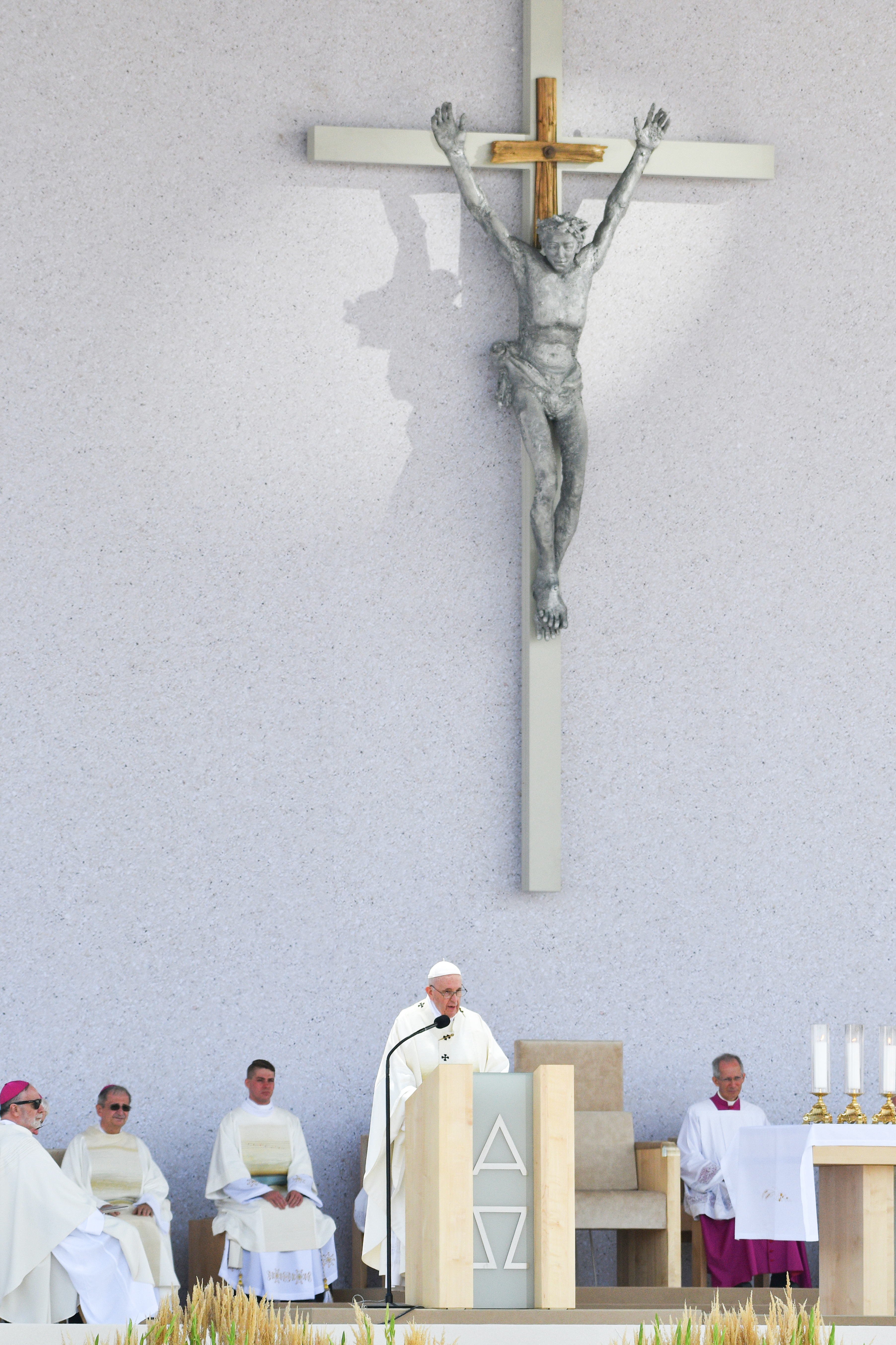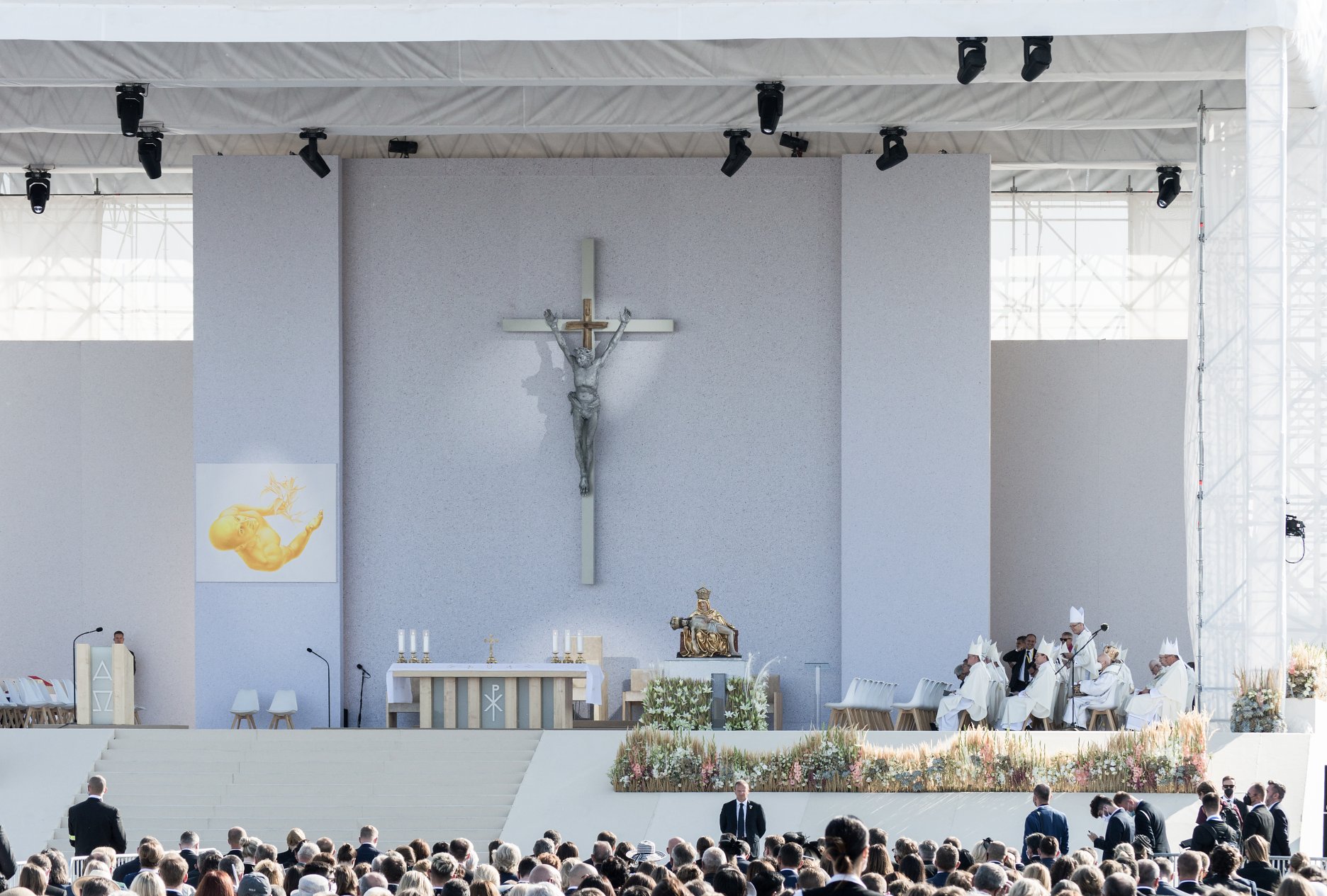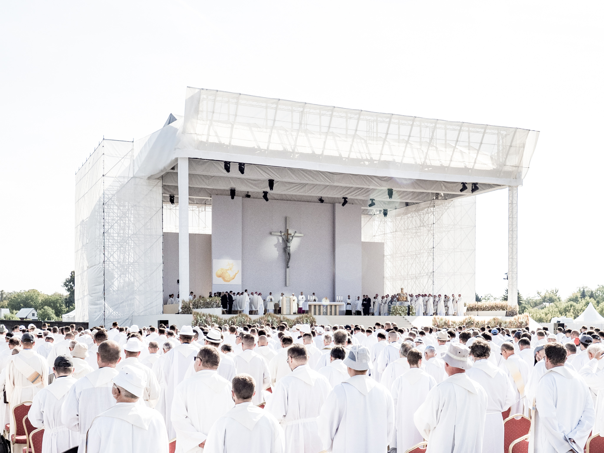 Liturgický priestor situovaný vo voľnej krajine bol v návrhu orientovaný tak, aby účastníci svätej omše mali vizuálny kontakt s historickou siluetou Šaštína a s barokovými vežami baziliky. V celkovej situácii areálu pontifikálnej omše bolo ústredným objektom presbytérium, ďalej tu bolo zázemia so sakristiami pre svätého otca, pápežský sprievod, kardinálov a biskupov, potom objekty pódia pre hudobníkov a spevácky zbor, tlačové stredisko pre akreditovaných novinárov, objekty pre hygienu a zdravotnú pomoc, a samozrejme rozsiahlou súčasťou areálu boli sektory pre účastníkov omše.