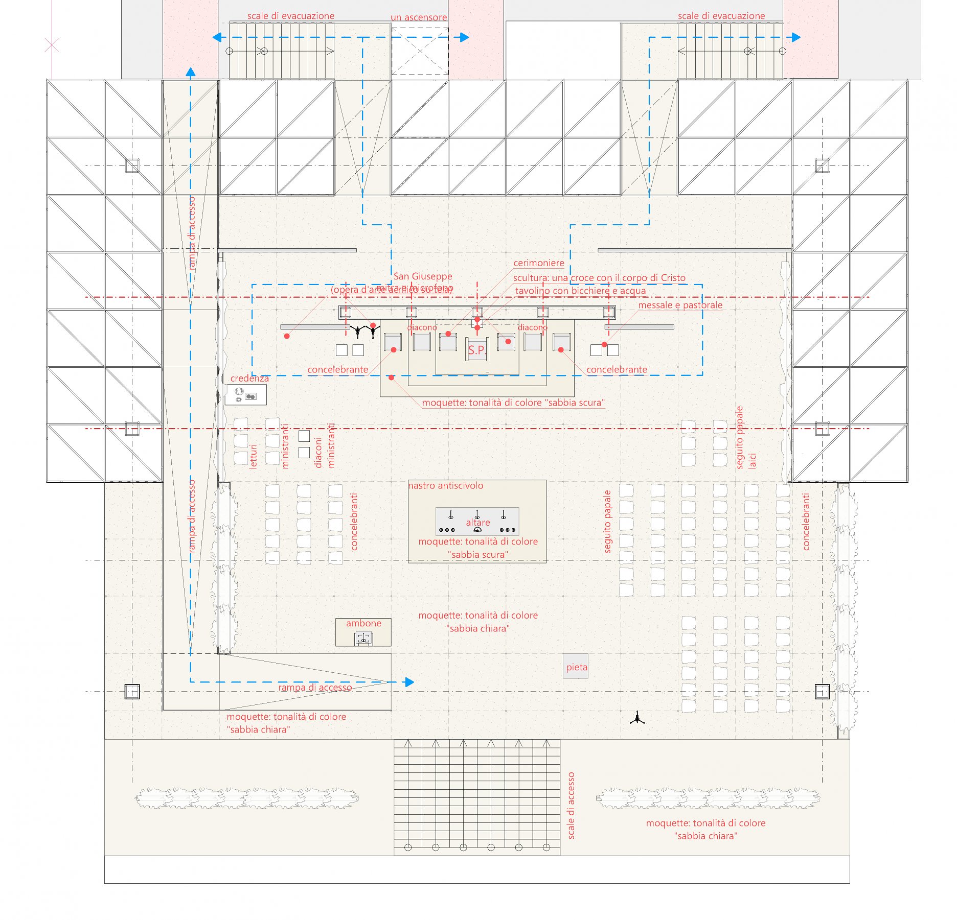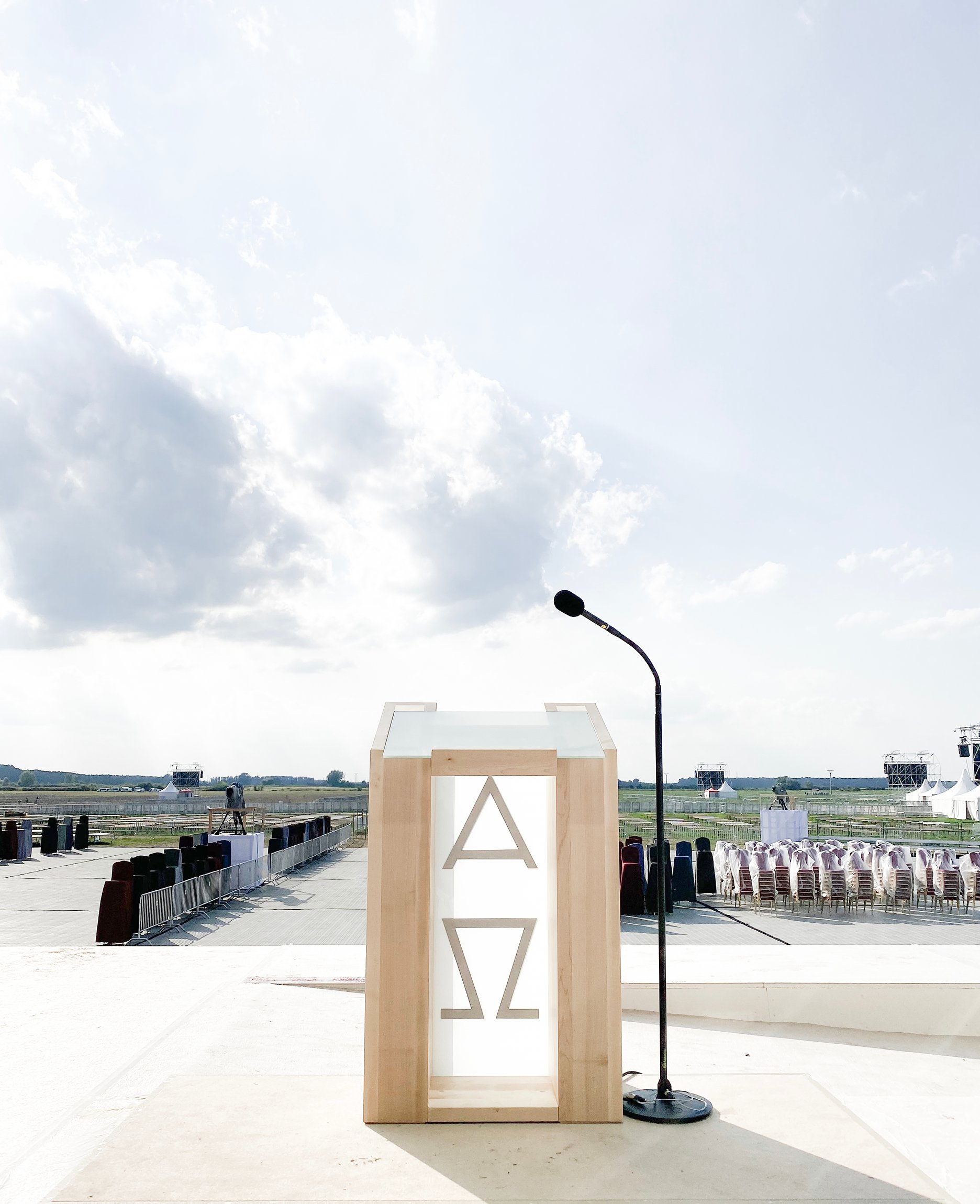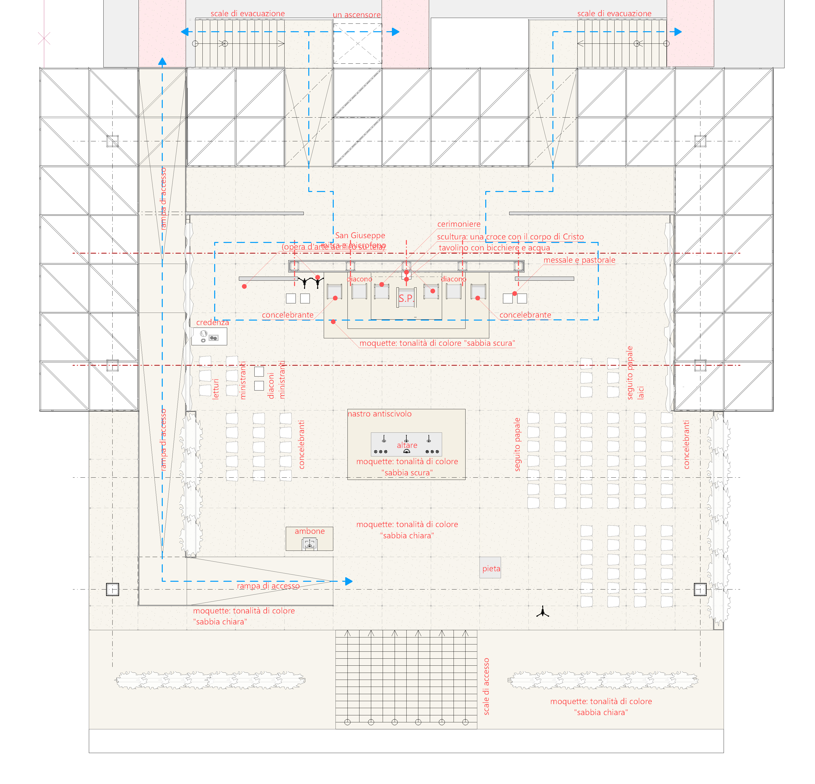 Liturgický priestor situovaný vo voľnej krajine bol v návrhu orientovaný tak, aby účastníci svätej omše mali vizuálny kontakt s historickou siluetou Šaštína a s barokovými vežami baziliky. V celkovej situácii areálu pontifikálnej omše bolo ústredným objektom presbytérium, ďalej tu bolo zázemia so sakristiami pre svätého otca, pápežský sprievod, kardinálov a biskupov, potom objekty pódia pre hudobníkov a spevácky zbor, tlačové stredisko pre akreditovaných novinárov, objekty pre hygienu a zdravotnú pomoc, a samozrejme rozsiahlou súčasťou areálu boli sektory pre účastníkov omše.