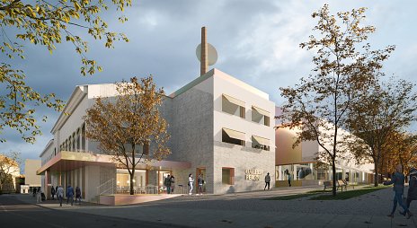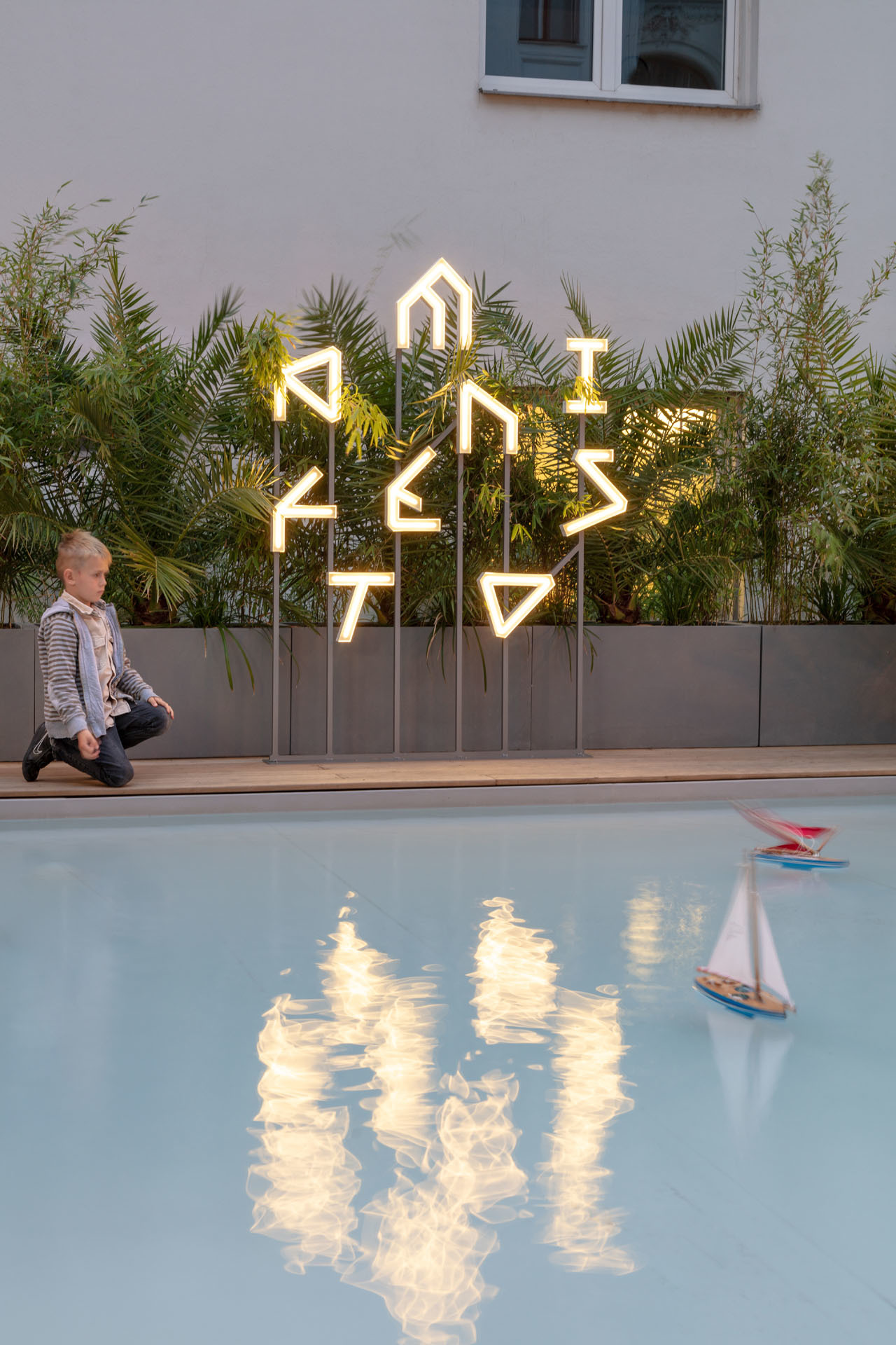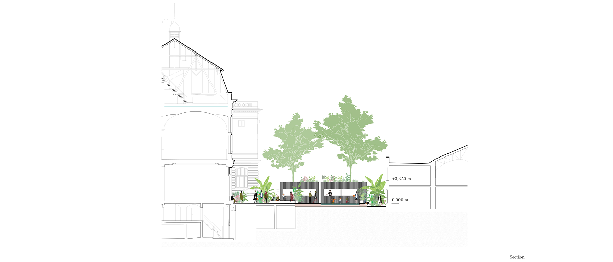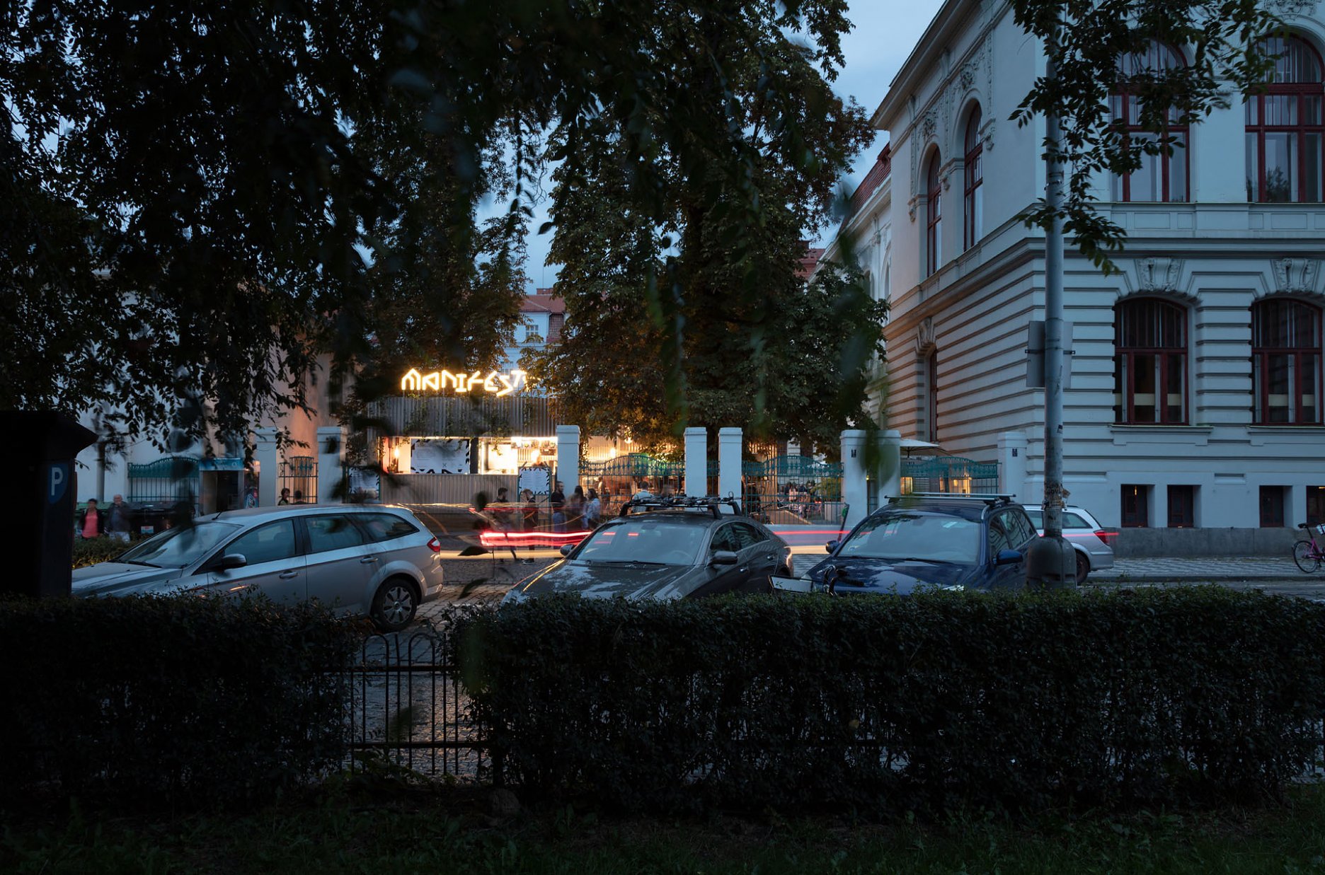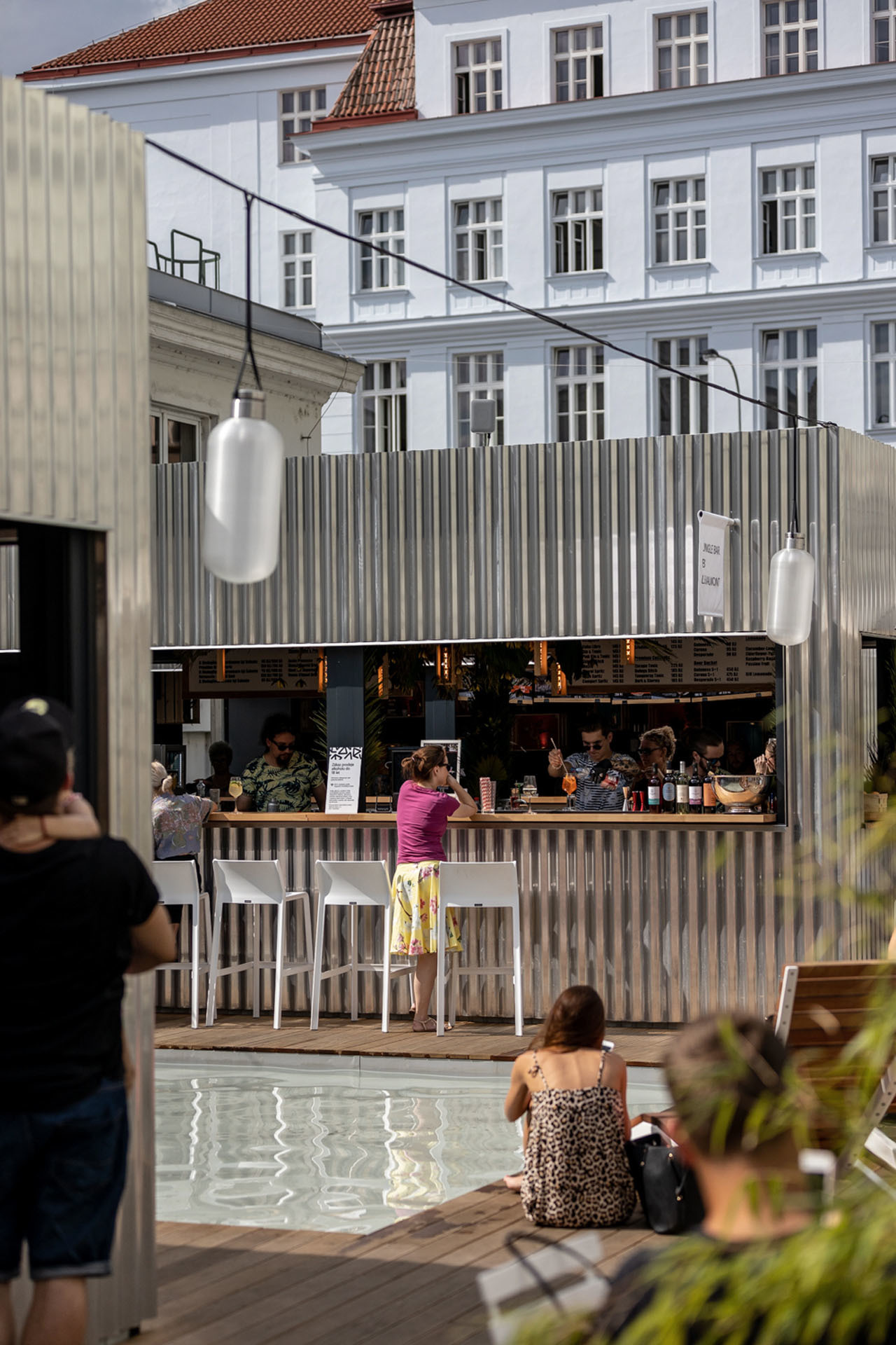 Odtiaľ pramení idea oživiť bohatú, verejne prístupnú zeleň, ktorá je plynulo napojená na frekventovanú Malú Stranu a spadá do dochádzkovej vzdialenosti Miluničovho Tancujúceho domu. Architekti zároveň ctia intímne proporcie a mierku verejných pasáží, typických pre pražské ulice. Ústredným prvkom návrhu sa pre letné obdobie prevádzky stal plytký bazén, nad ktorým sa skláňa historická fasáda odrážajúca sa vo vodnej ploche. Prácu s vodným elementom si Chybík+Krištof vyskúšali už pri svojom návrhu ocenenom na Expe v Miláne pred štyrmi rokmi, alebo aj v areáli vizovickej firmy KOMA MODULAR. Prvok je integrovaný do vyvýšenej drevenej terasy, ktorá umožňuje bezbariérový prístup pre kočíky a invalidné vozíky.