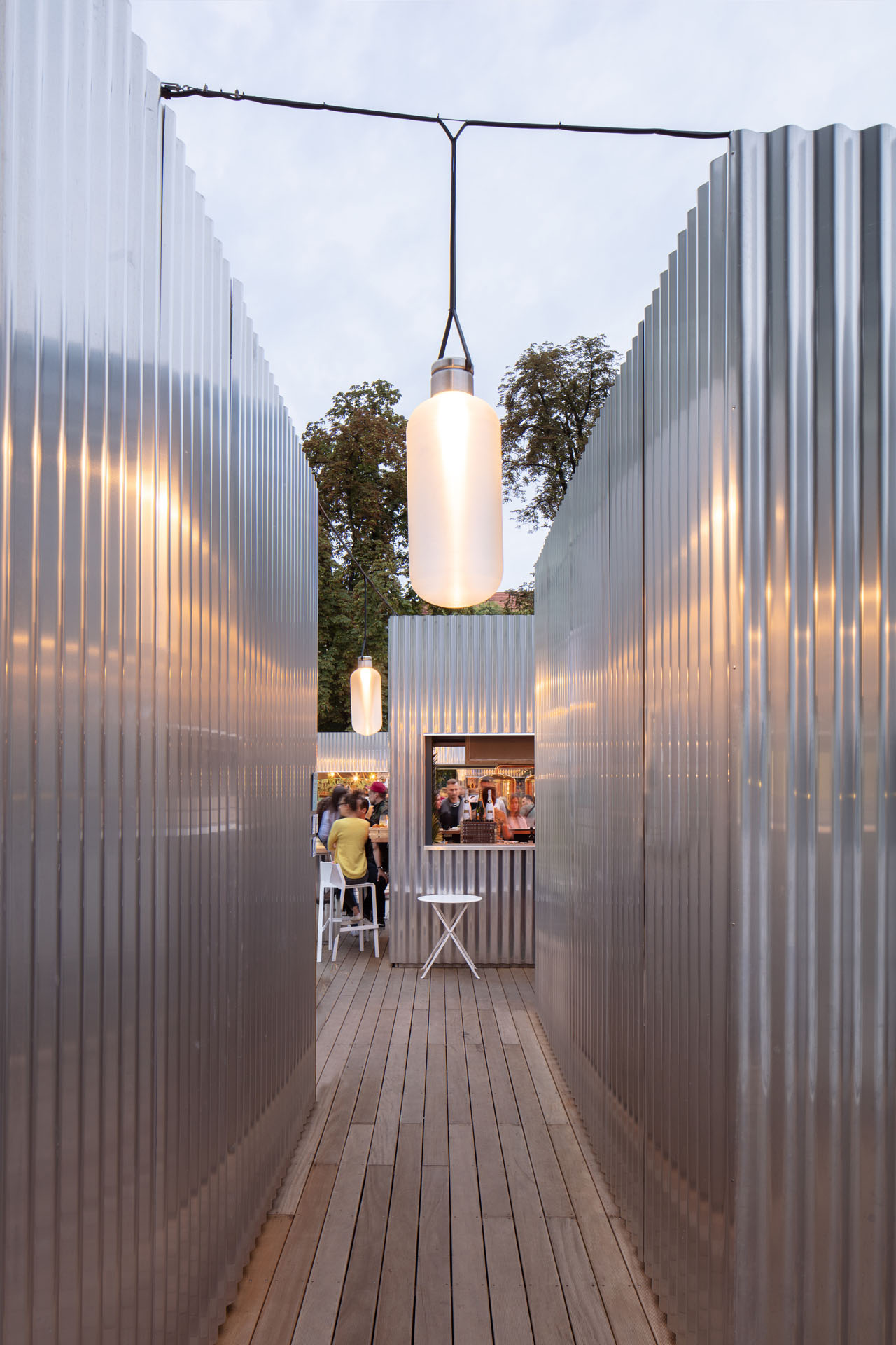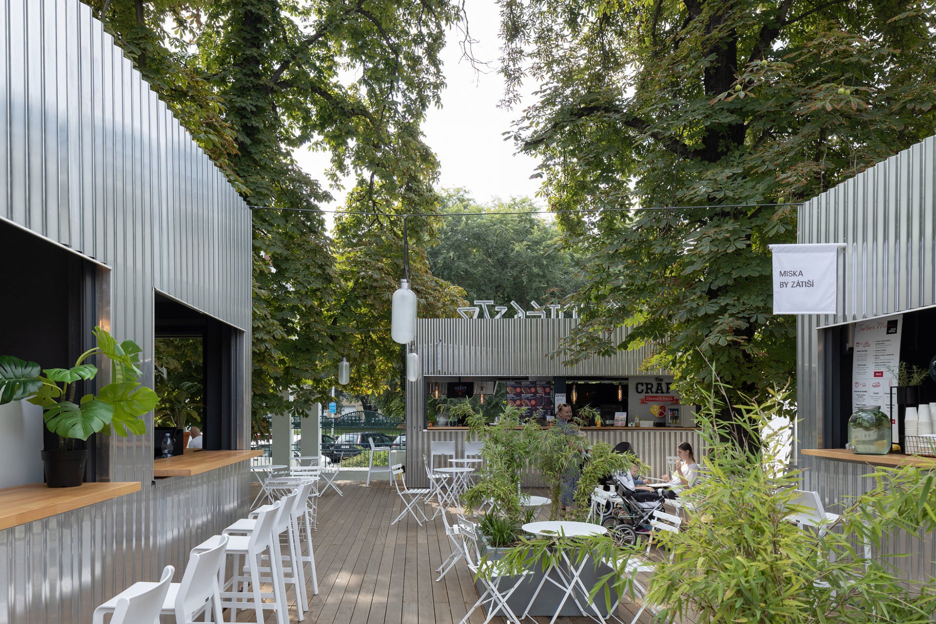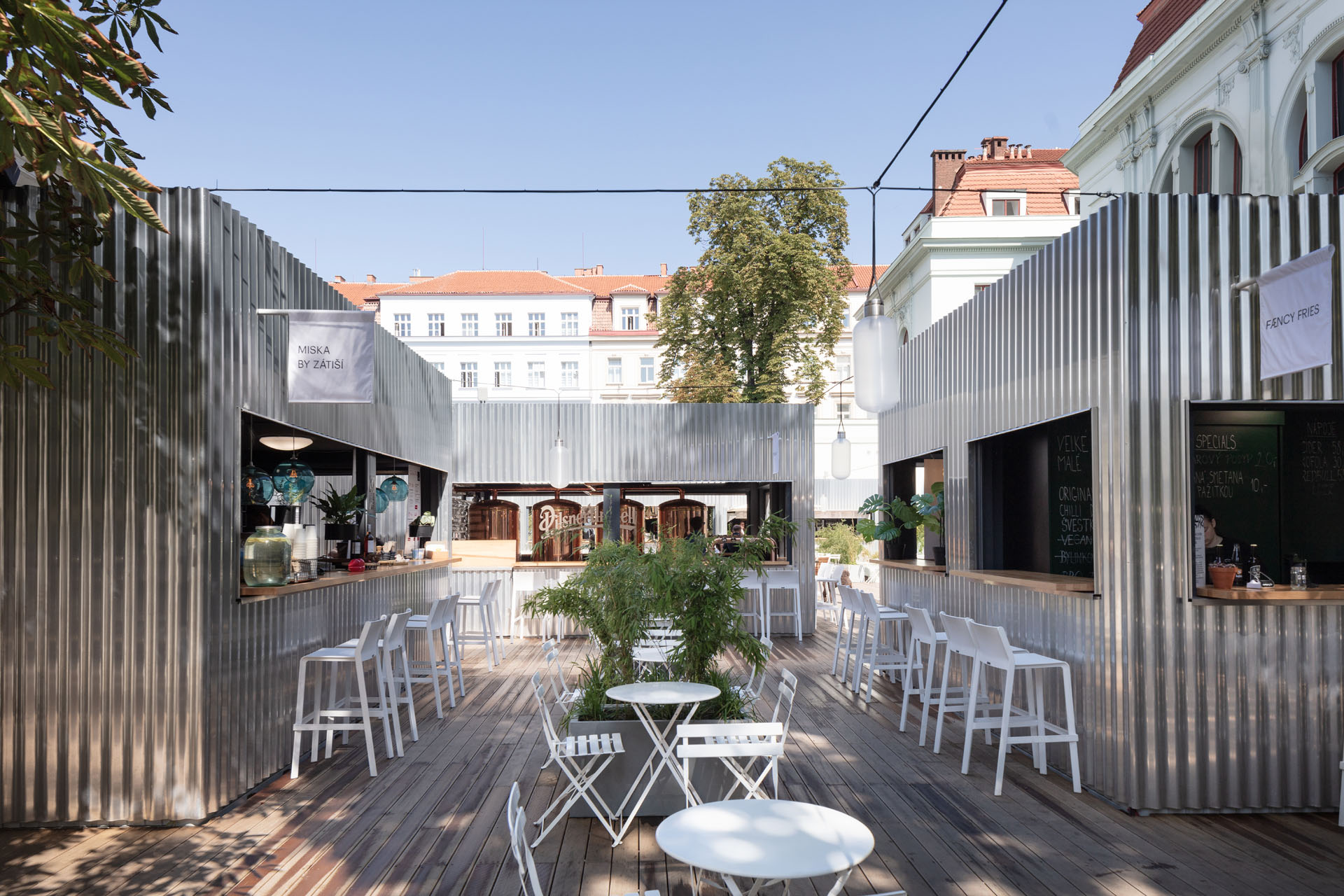 Moduly opláštené vlnitým hliníkovým plechom zapadajú do pestrej kulisy pozadia a navyše hravo reflektujú fasádu Národného domu (podobne ako hladina vodnej plochy). Do dvora sa vrátila zeleň, ktorá je určujúcim prvkom celého návrhu. Predajcovia a reštaurácie využívajú celkom 11 modulov. V ich ponuke nájdeme gastronomické špeciality, tankové pivo alebo klasické občerstvenie, zatiaľ čo drevená platforma poskytuje rozmanité možnosti sedenia.