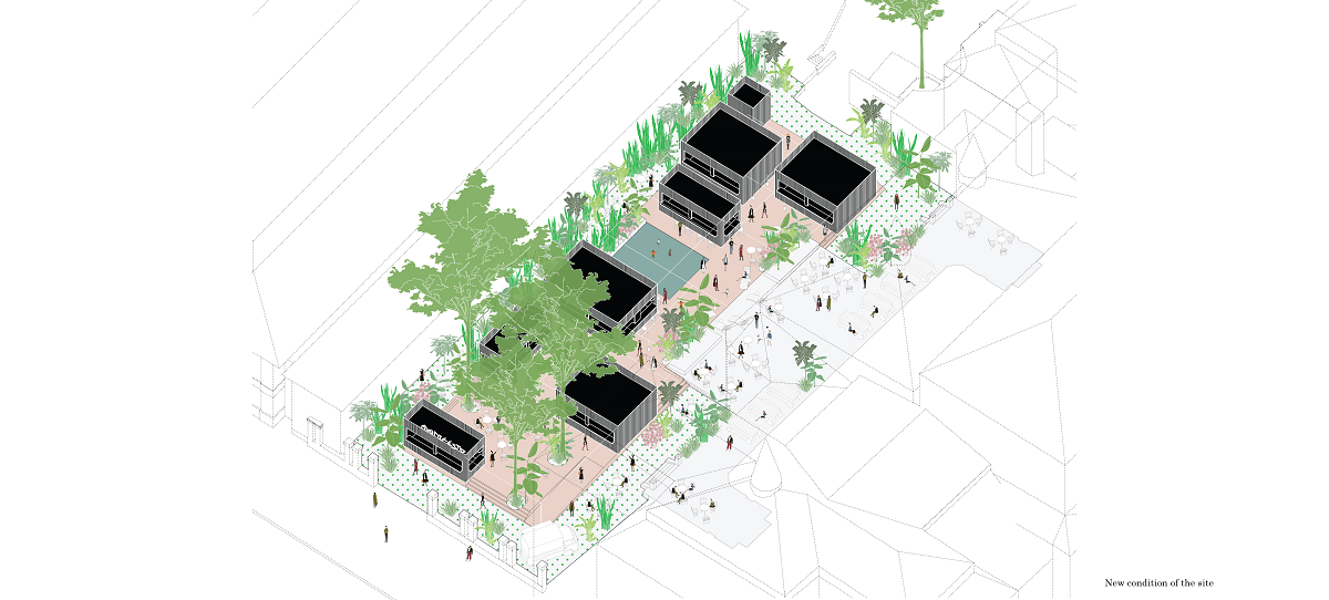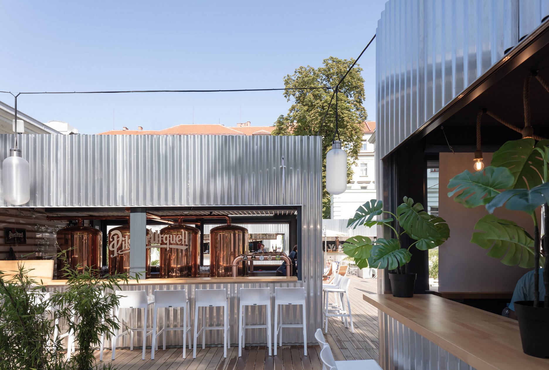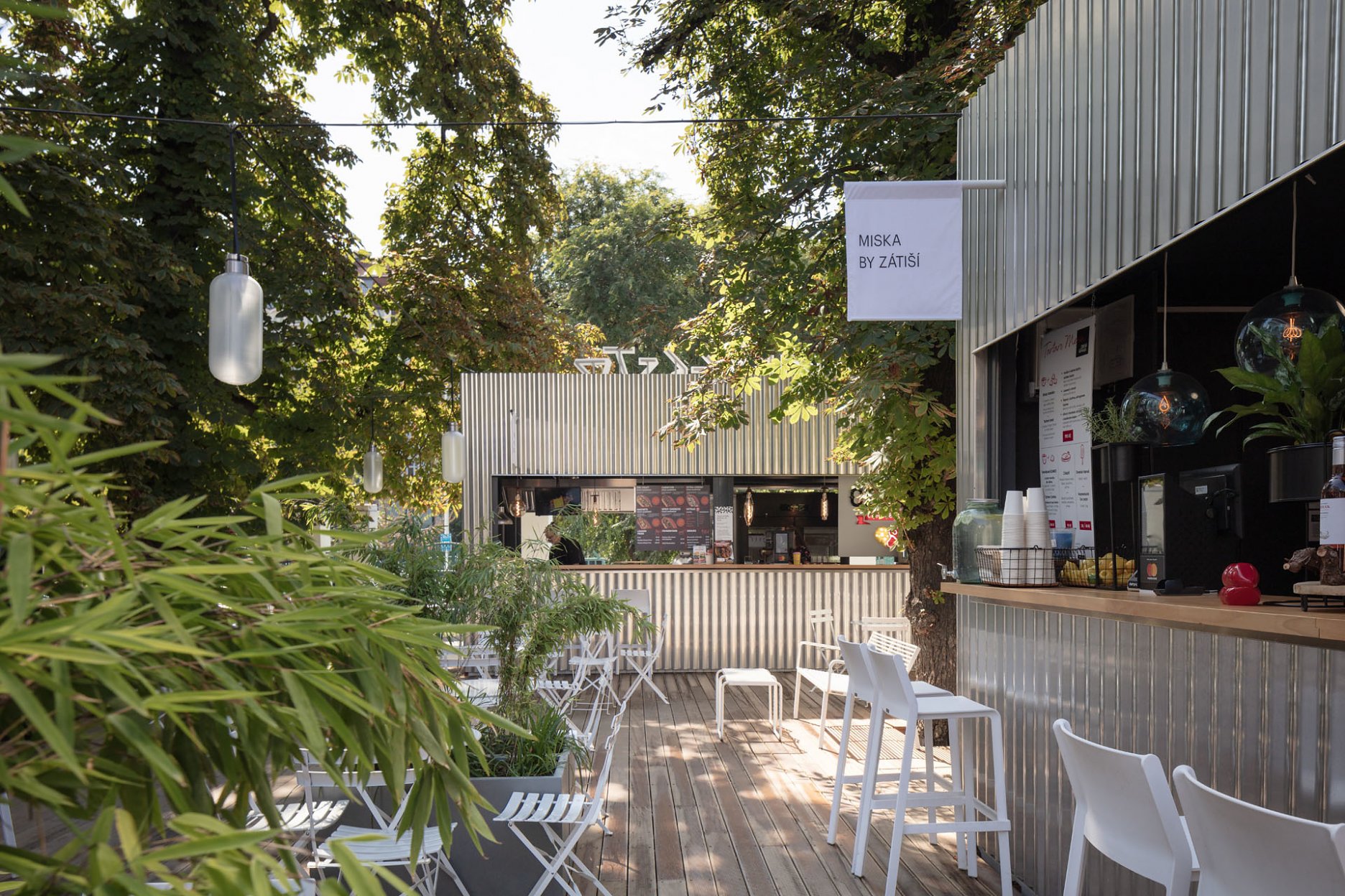Moduly opláštené vlnitým hliníkovým plechom zapadajú do pestrej kulisy pozadia a navyše hravo reflektujú fasádu Národného domu (podobne ako hladina vodnej plochy). Do dvora sa vrátila zeleň, ktorá je určujúcim prvkom celého návrhu. Predajcovia a reštaurácie využívajú celkom 11 modulov. V ich ponuke nájdeme gastronomické špeciality, tankové pivo alebo klasické občerstvenie, zatiaľ čo drevená platforma poskytuje rozmanité možnosti sedenia.