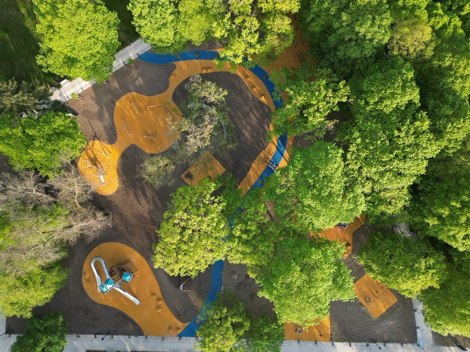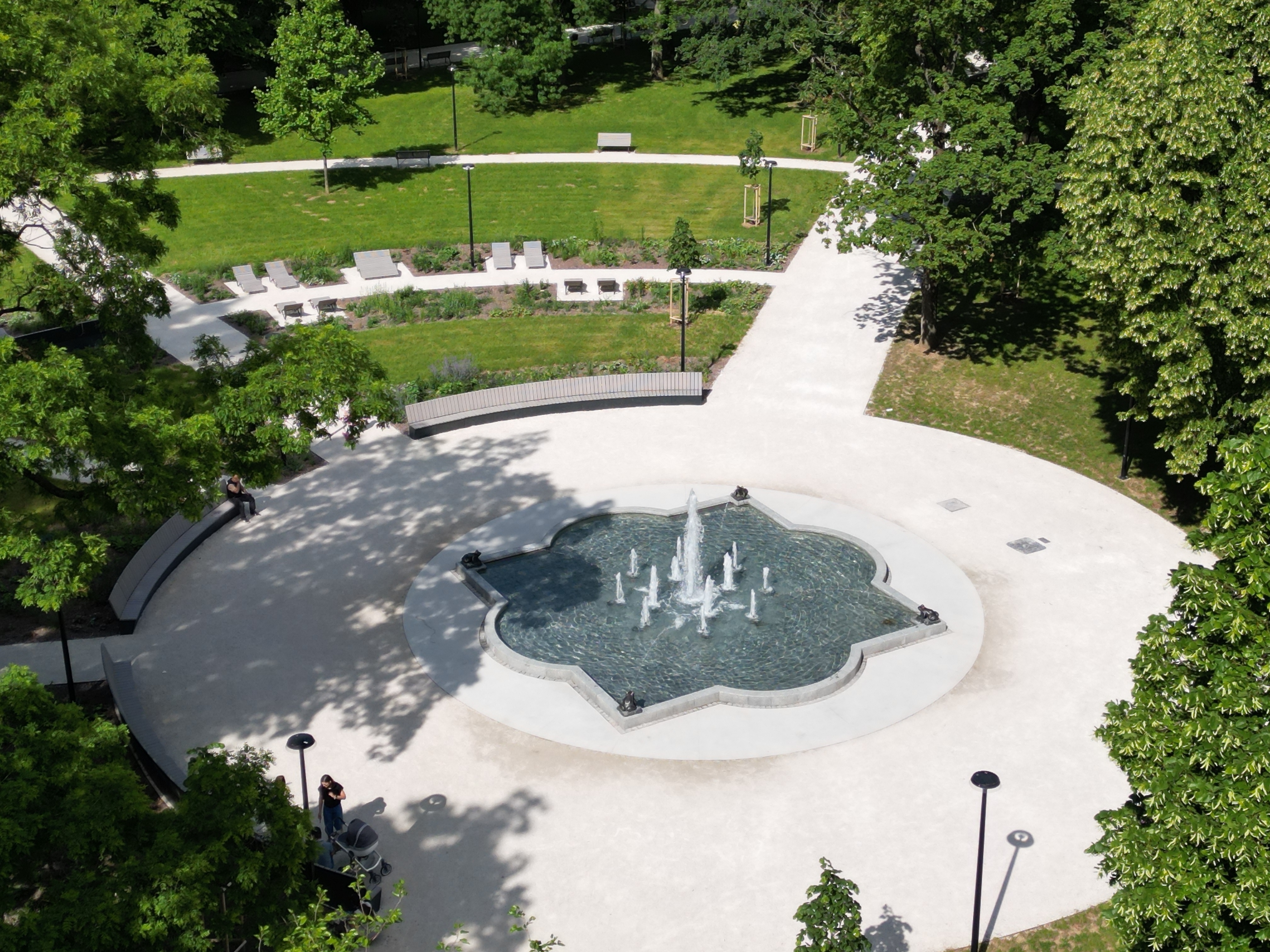 Park bol navrhnutý podľa princípov modro-zelenej infraštruktúry. Pôvodné asfaltové chodníky boli premenené na priepustné nezpevnené cesty. Voda vsakuje do trávnikov a kvetinových záhonov. Povrchy chodníkov sú biele, čo výrazne znížilo ich otepľovanie.