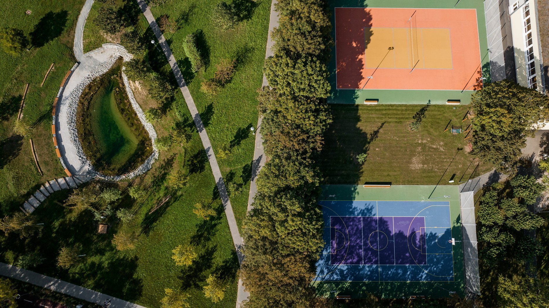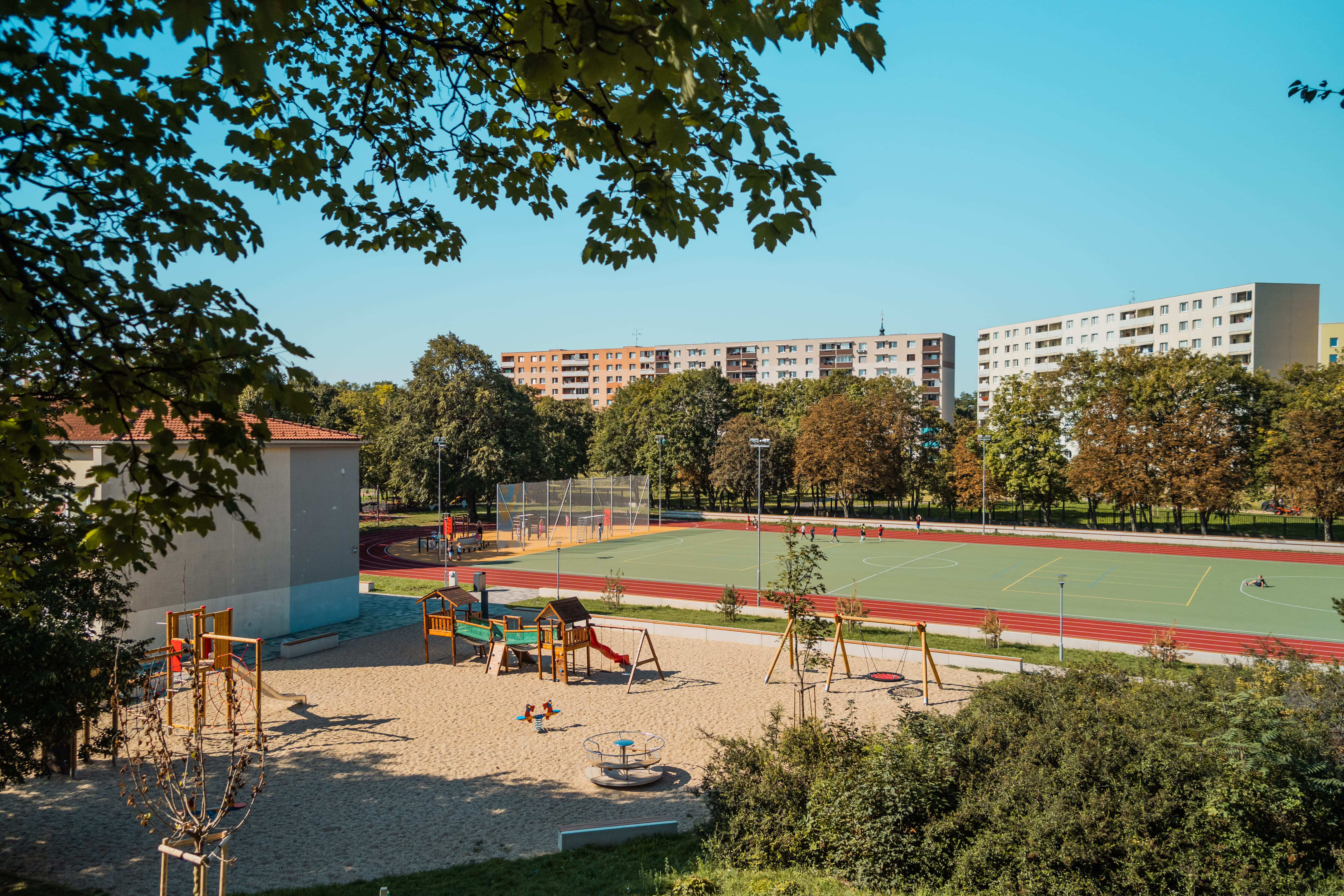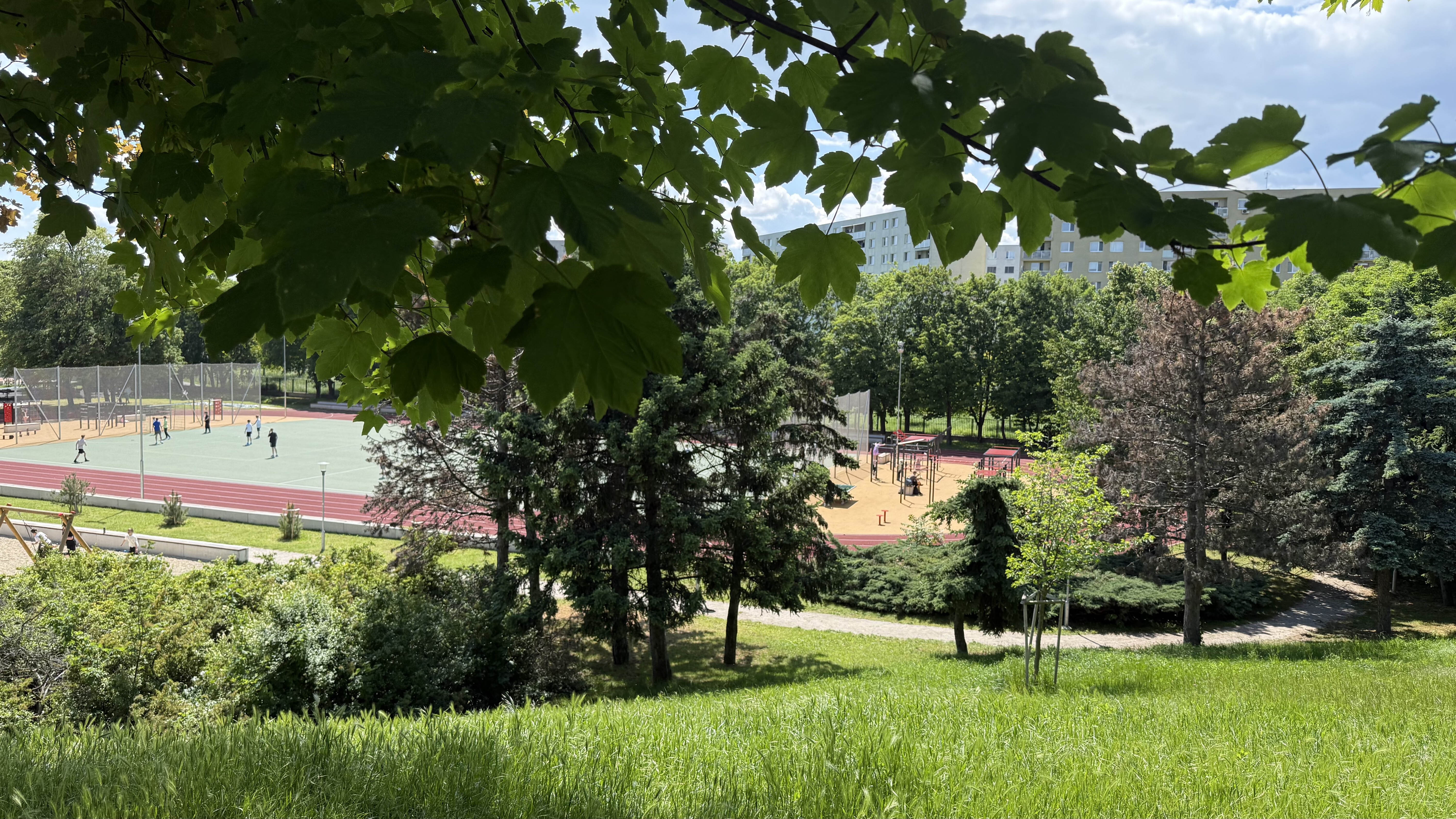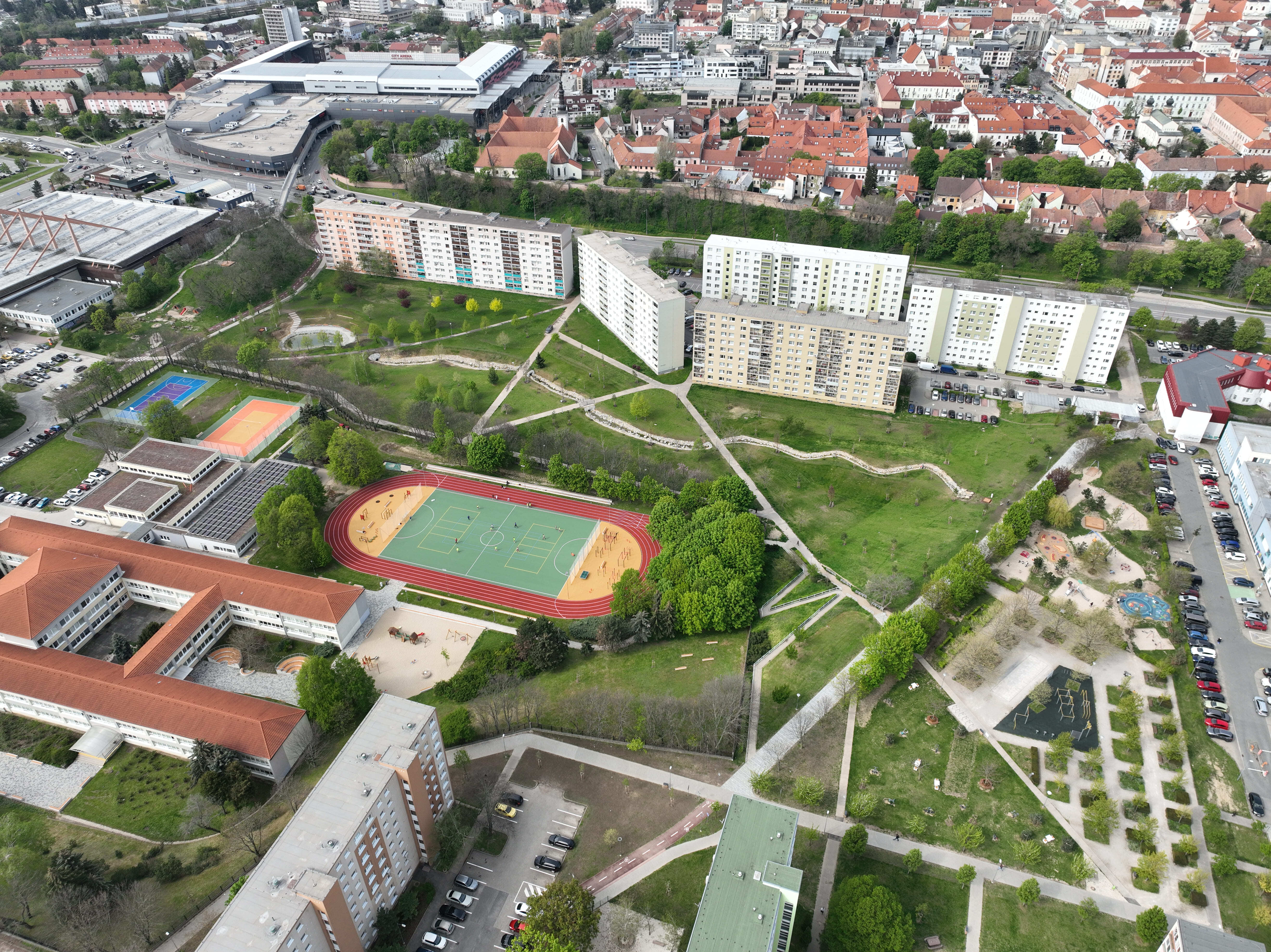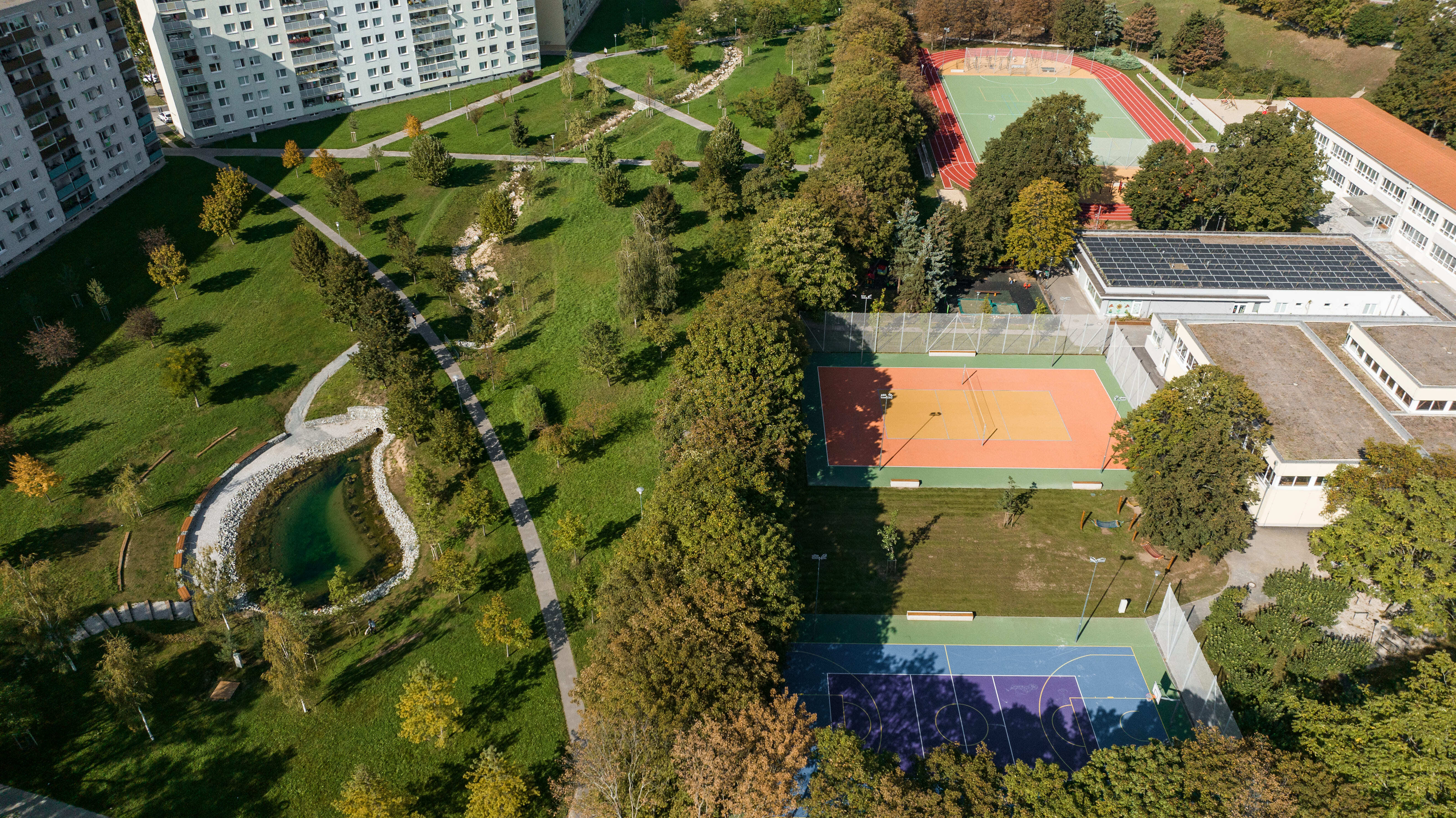 Zóna B zahŕňa komplexnú prestavbu školského športového areálu, kde boli vybudované samostatné multifunkčné ihriská a 200-metrová atletická dráha. Pôvodné detské ihrisko rozšírili nové herné prvky a doplnilo veľké workoutové ihrisko, čím sa zlepšila ponuka programu pre rôzne vekové skupiny. Zároveň pribudli exteriérové triedy, ktoré rozšírili možnosti výučby smerom k environmentálnej výchove a neformálnemu vzdelávaniu v prírodnom prostredí. Zrekonštruovaný bol tiež hlavný vstup do areálu, kde pribudlo oplotenie v tvare farebných pasteliek. Vznikli aj dva nové vstupy – zo severu vedie citlivo umiestnený mlatový chodník medzi existujúcimi vzrastlými stromami, z juhu je zrealizovaný nový prístup priamo k športovým ihriskám. Všetky školské areály v Trnave sú po vyučovaní voľne prístupné verejnosti, čo prispieva k zvýšeniu kvality života v lokalite. Areál sa pravidelne využíva na športové súťaže a verejné podujatia.