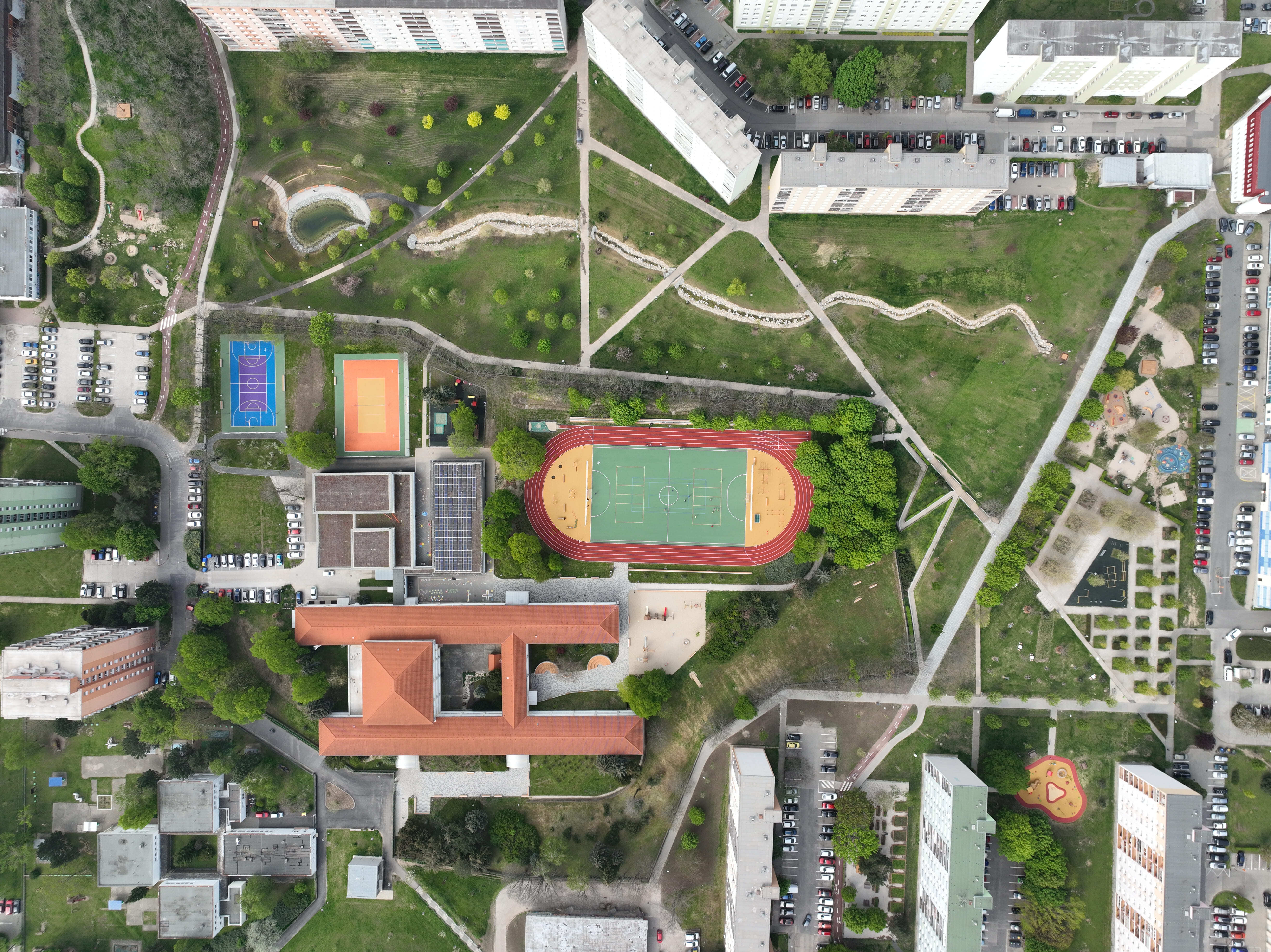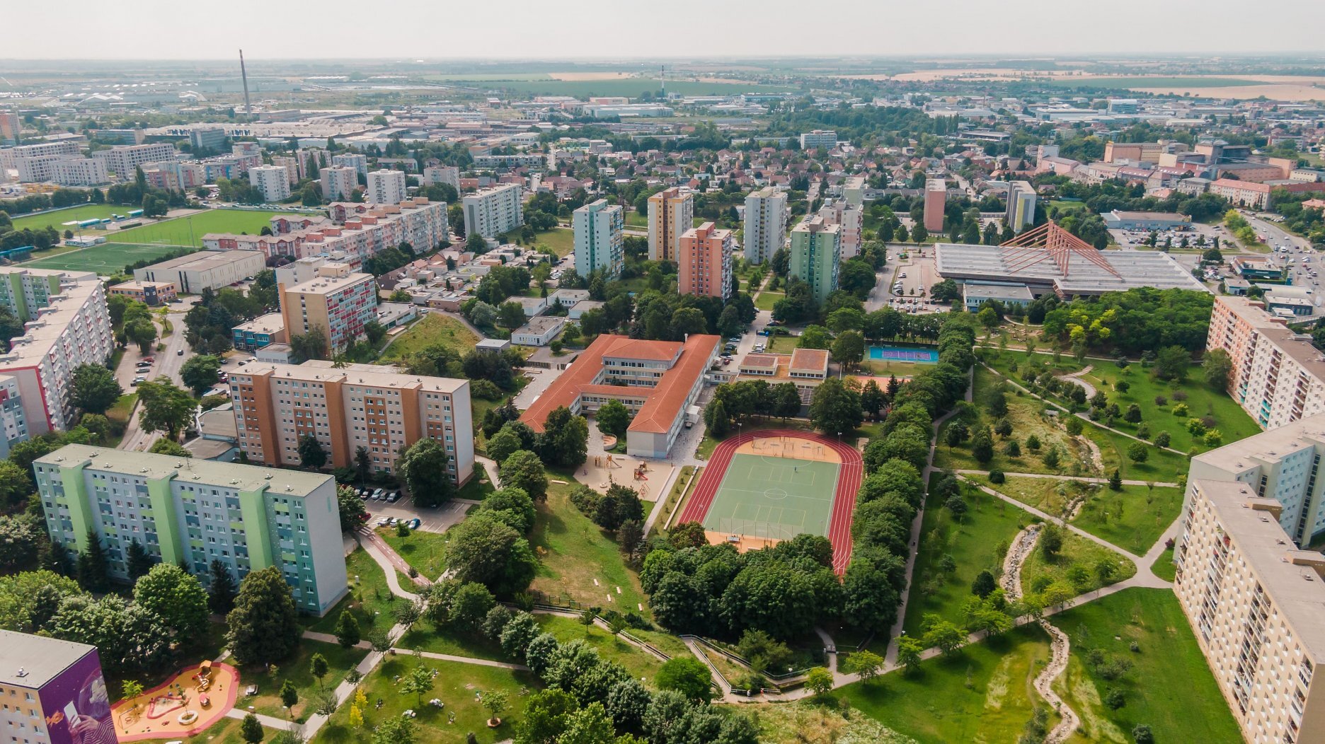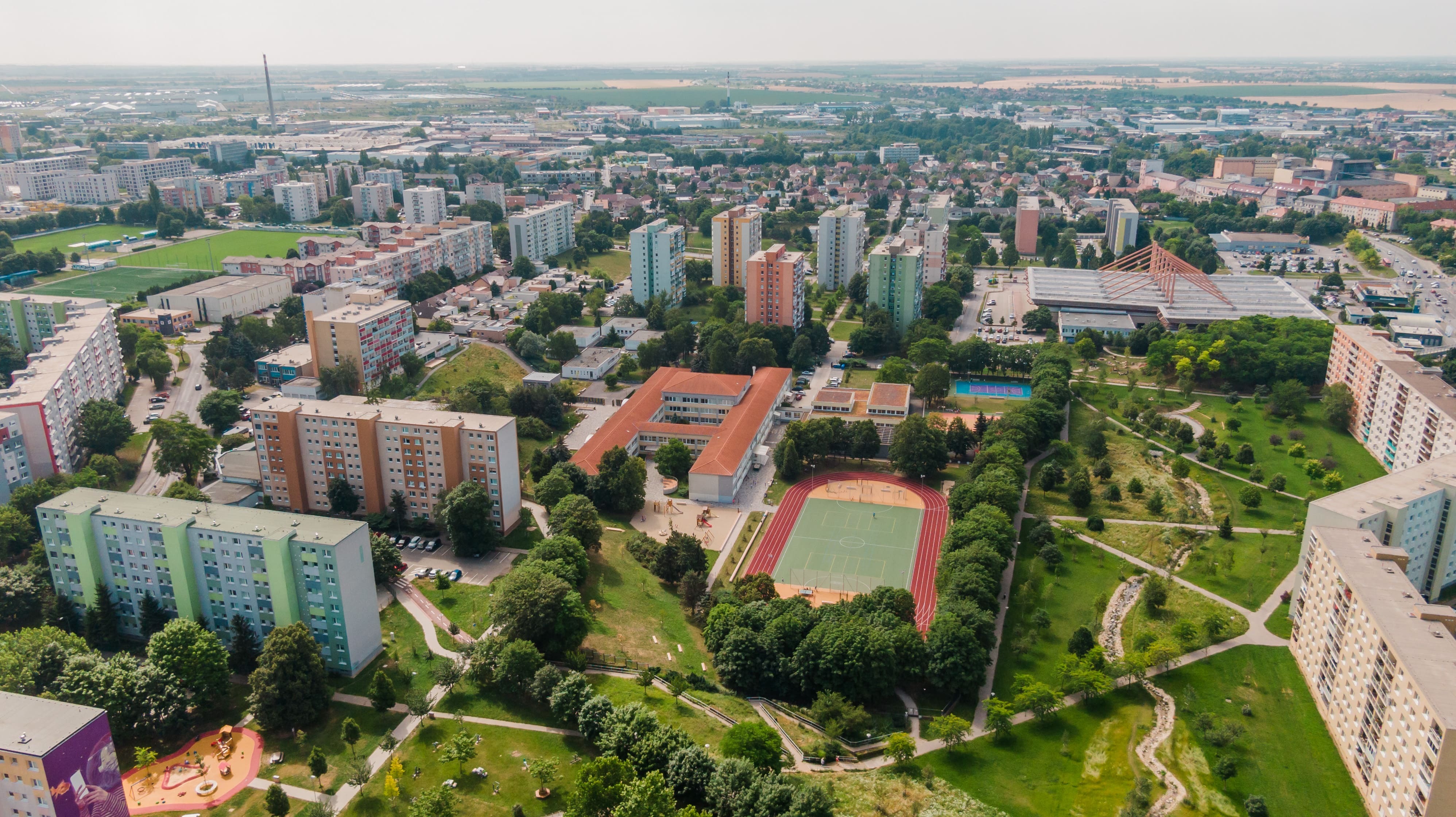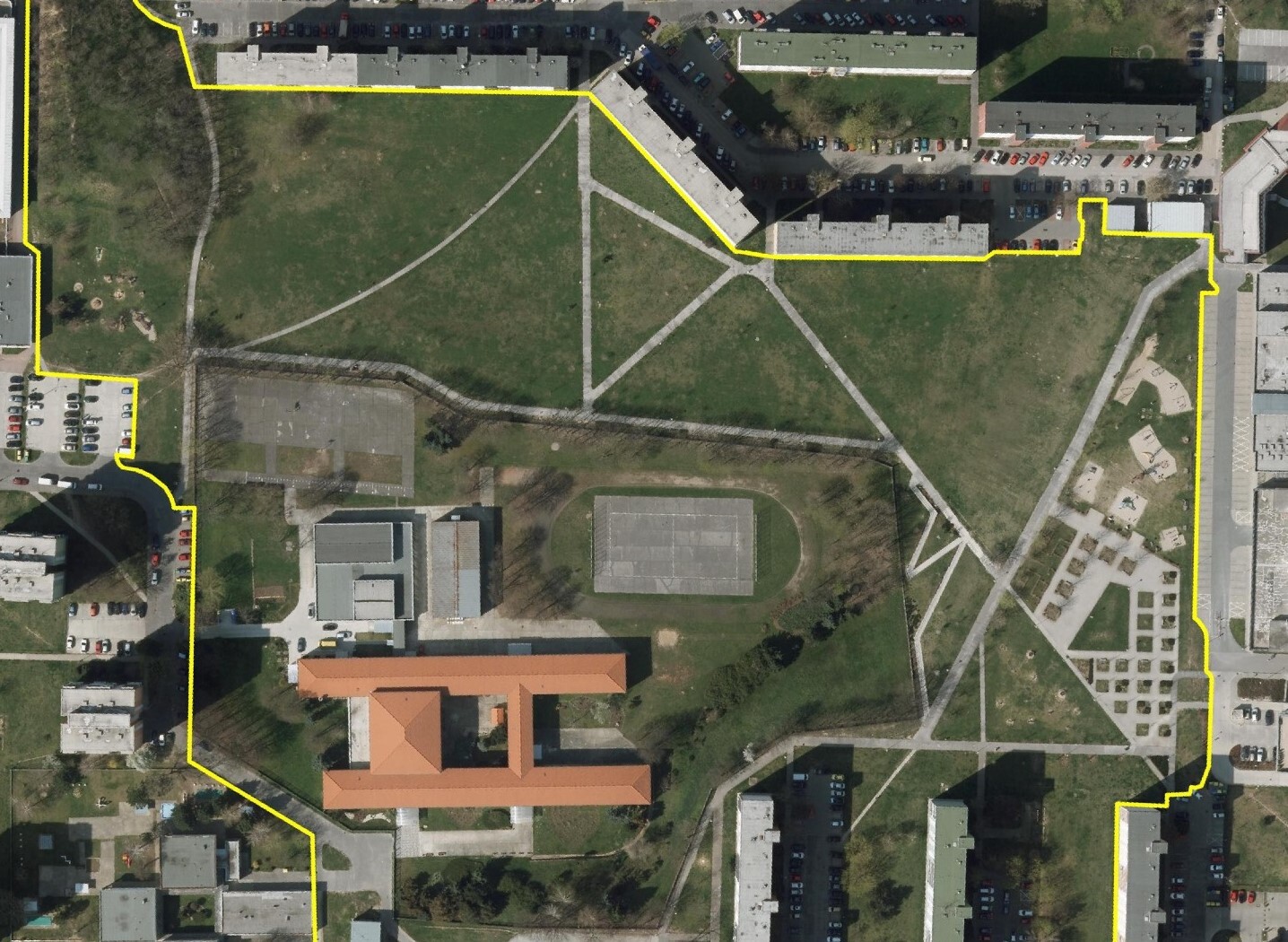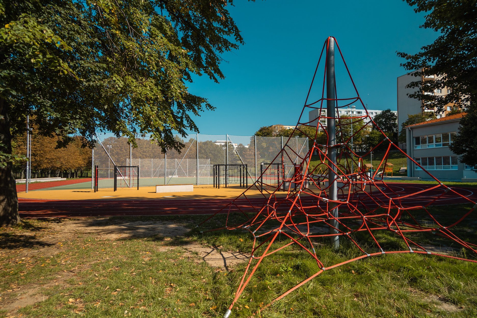 Zóna B zahŕňa komplexnú prestavbu školského športového areálu, kde boli vybudované samostatné multifunkčné ihriská a 200-metrová atletická dráha. Pôvodné detské ihrisko rozšírili nové herné prvky a doplnilo veľké workoutové ihrisko, čím sa zlepšila ponuka programu pre rôzne vekové skupiny. Zároveň pribudli exteriérové triedy, ktoré rozšírili možnosti výučby smerom k environmentálnej výchove a neformálnemu vzdelávaniu v prírodnom prostredí. Zrekonštruovaný bol tiež hlavný vstup do areálu, kde pribudlo oplotenie v tvare farebných pasteliek. Vznikli aj dva nové vstupy – zo severu vedie citlivo umiestnený mlatový chodník medzi existujúcimi vzrastlými stromami, z juhu je zrealizovaný nový prístup priamo k športovým ihriskám. Všetky školské areály v Trnave sú po vyučovaní voľne prístupné verejnosti, čo prispieva k zvýšeniu kvality života v lokalite. Areál sa pravidelne využíva na športové súťaže a verejné podujatia.