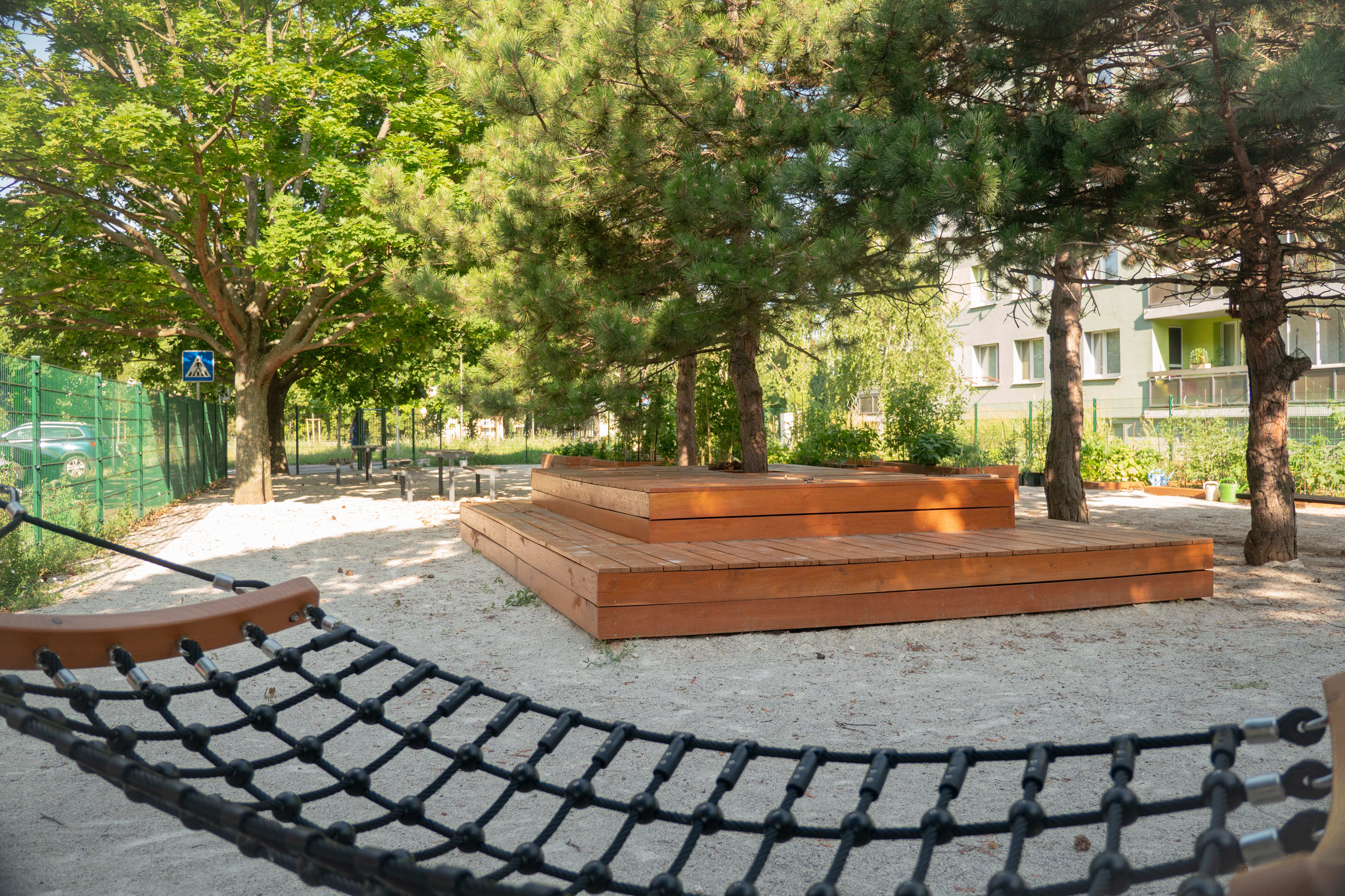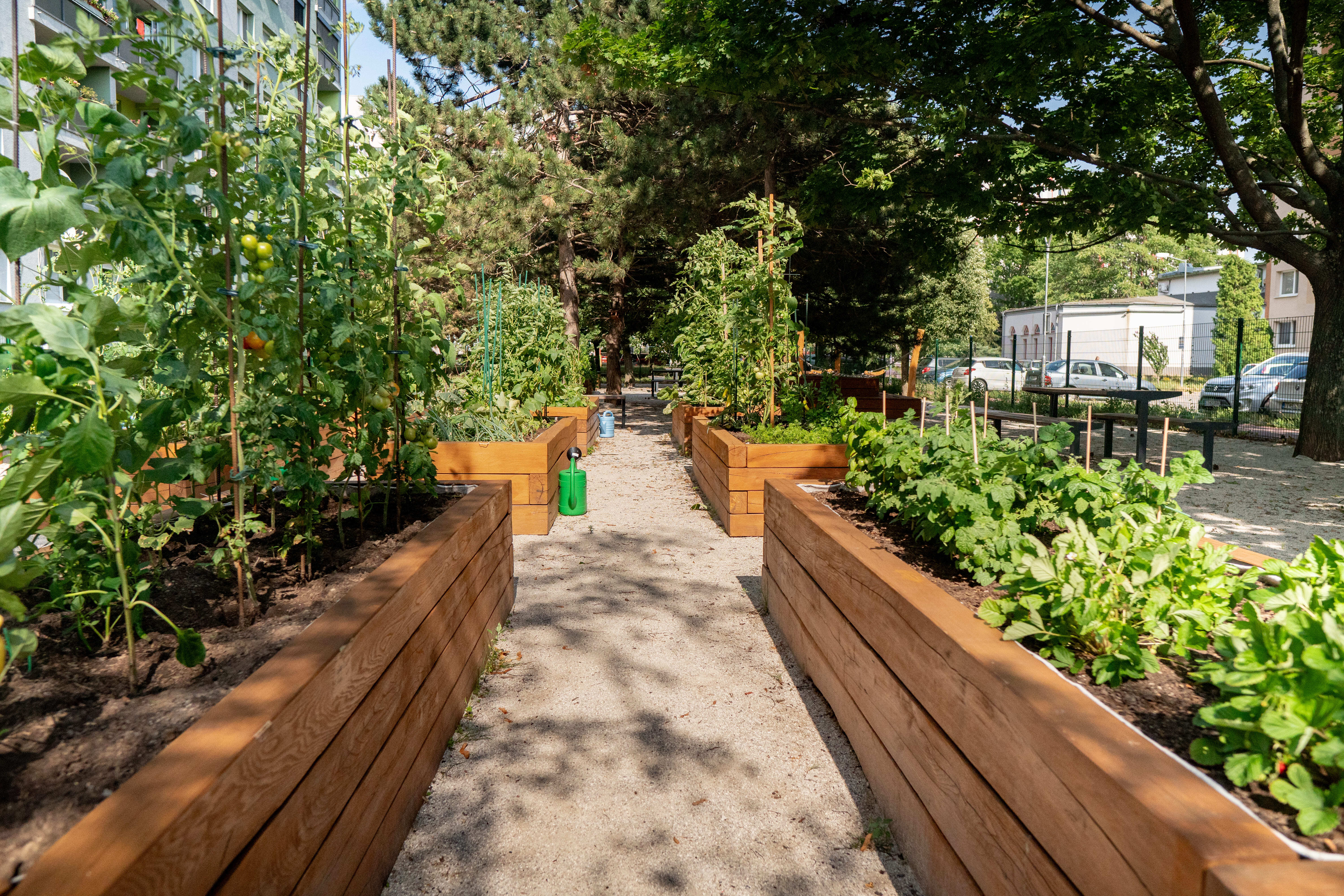 Zóna E sa sústreďuje na rekonštrukciu detského ihriska pre najmenších a vytvorenie rozsiahlej komunitnej záhrady so zapustenými a vyvýšenými záhonmi. Táto záhrada zahŕňa aj spoločné kompostovisko, hojdacie siete, prípojky s úžitkovou vodou a mobiliár. Schodisko medzi ulicami V. Clementisa a Spartakovská, ktoré predtým malo nevhodné proporcie, bolo zachované a kompletne zrekonštruované.