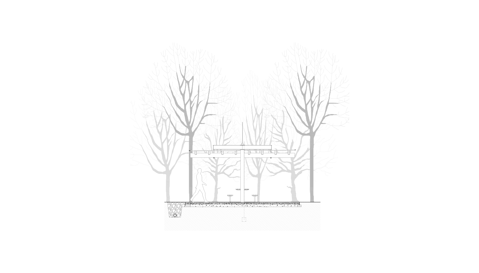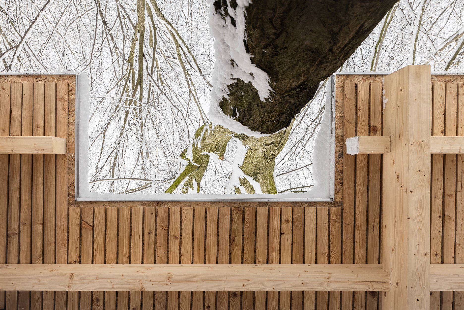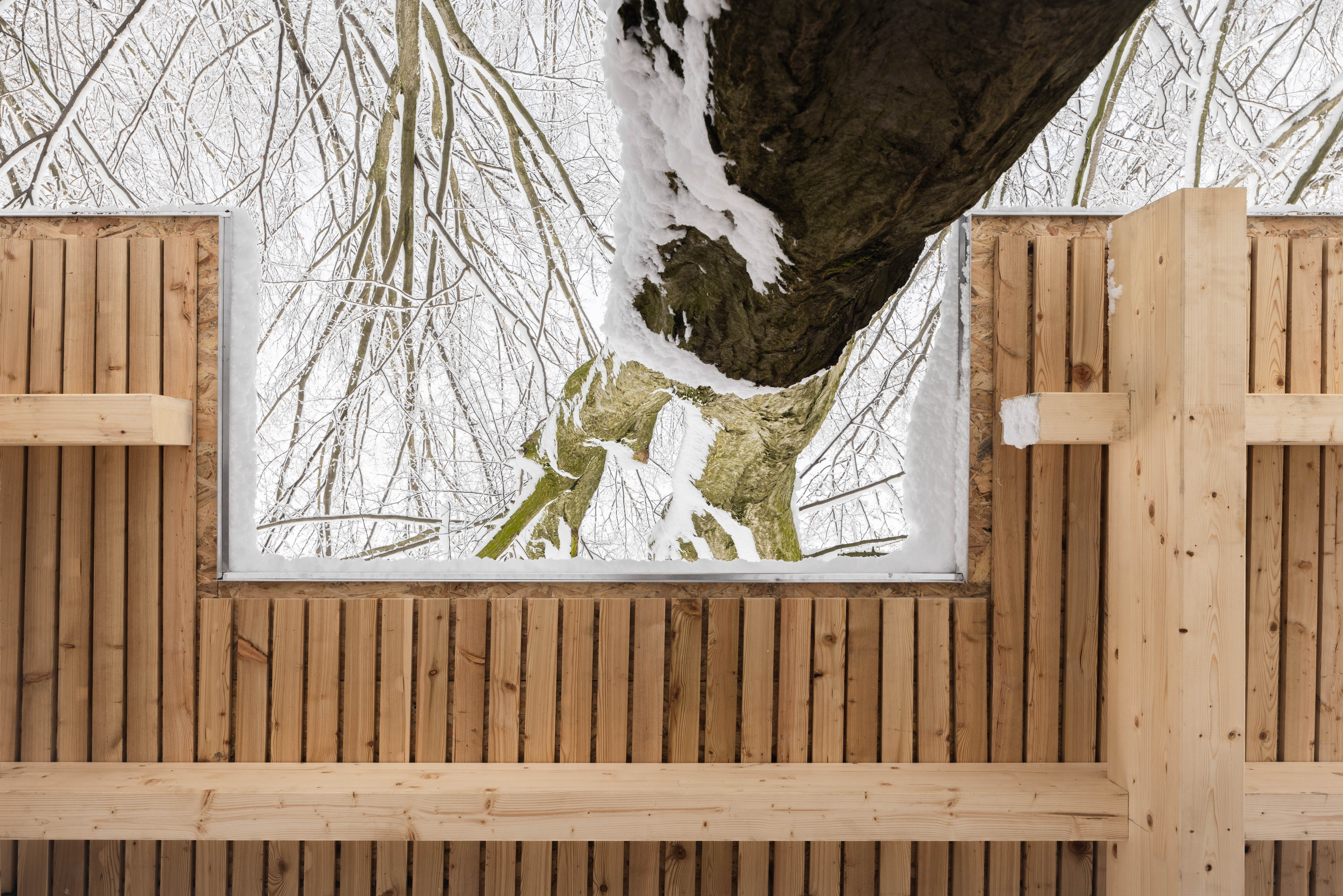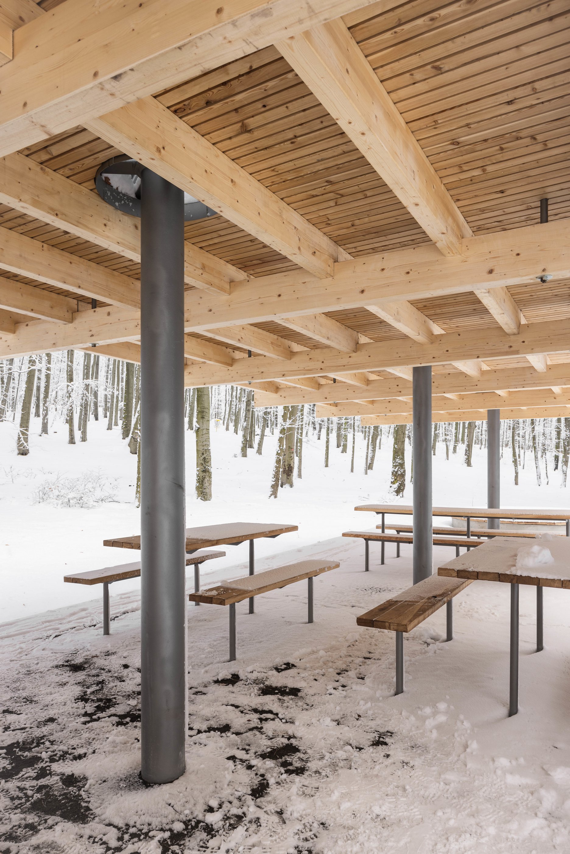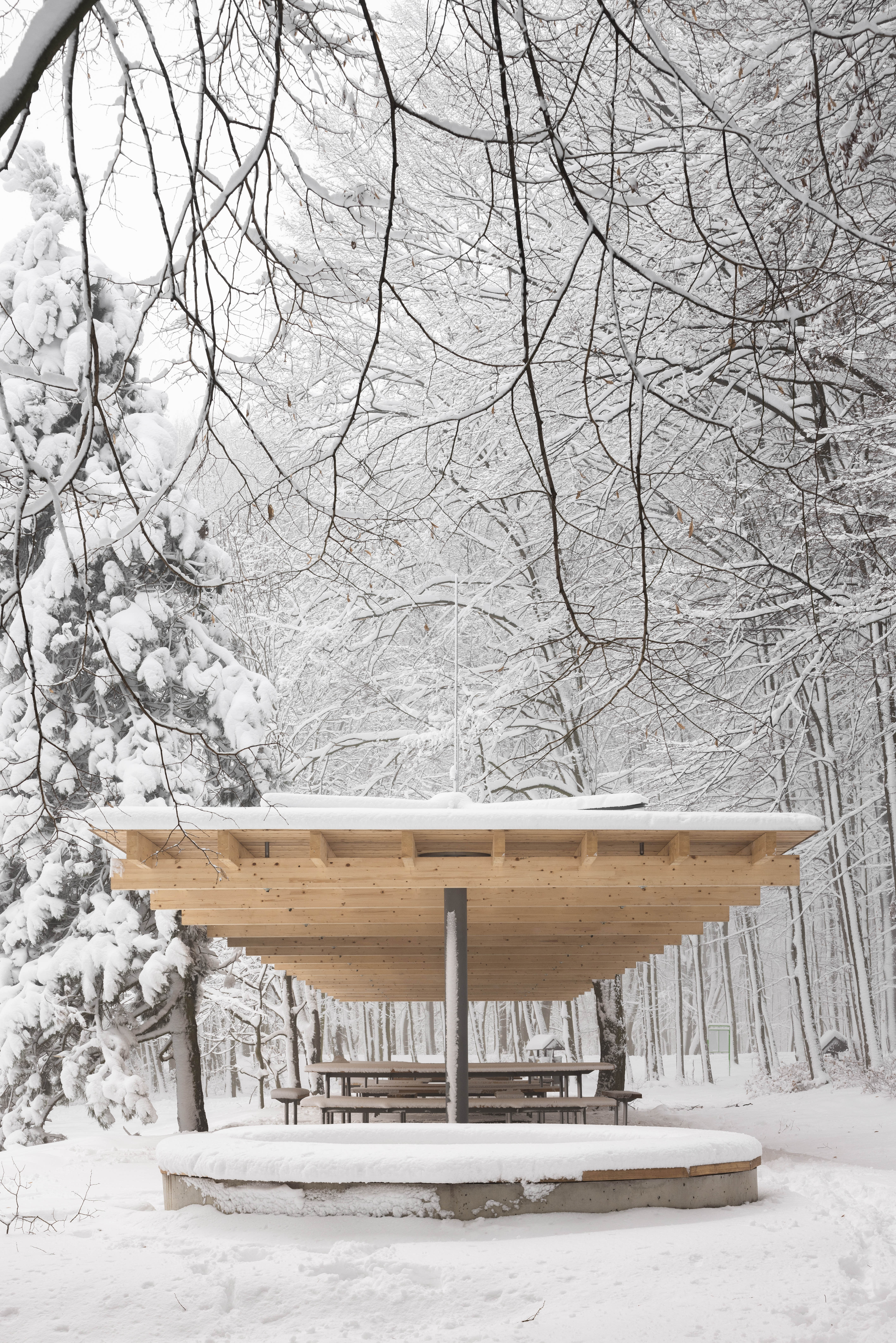 Východiskovou ideou je vyvesenie drevenej mriežky ponad morfológiu lesa, tak aby bola podopretá čo možno najmenším počtom oporných konštrukcií. Priestor lesa tak pozvoľne plynie naprieč zastrešeným výsekom krajiny až na priľahlú lúku a späť.