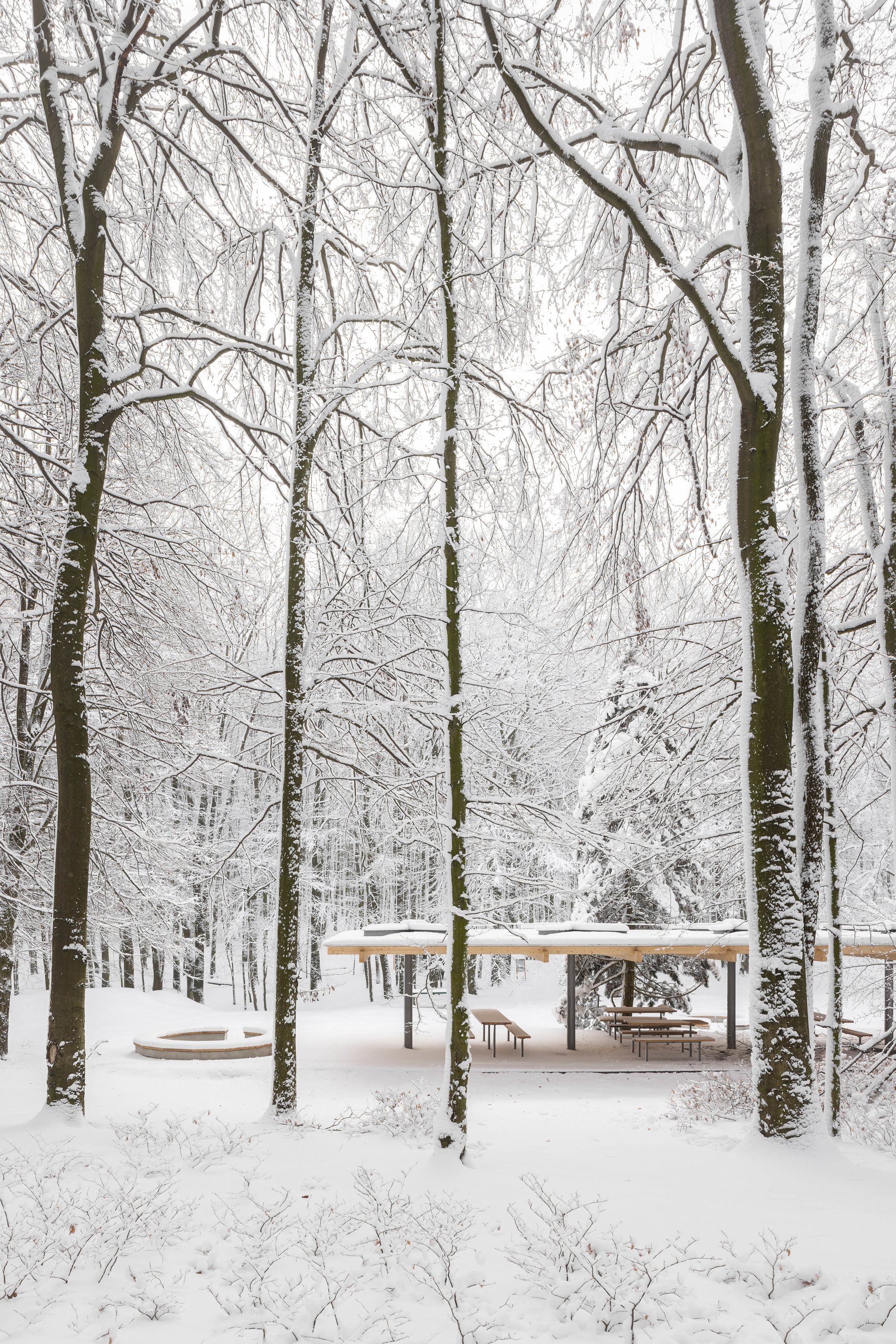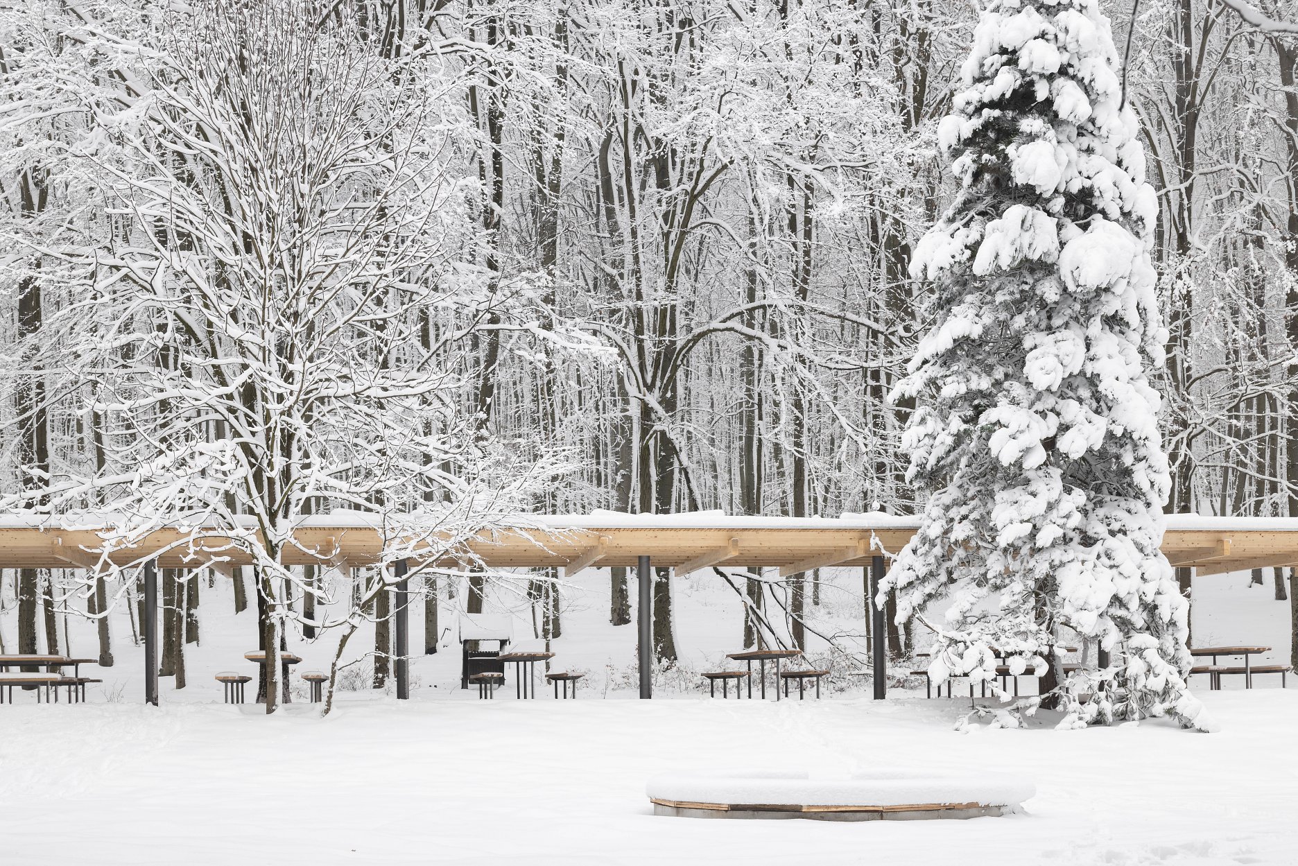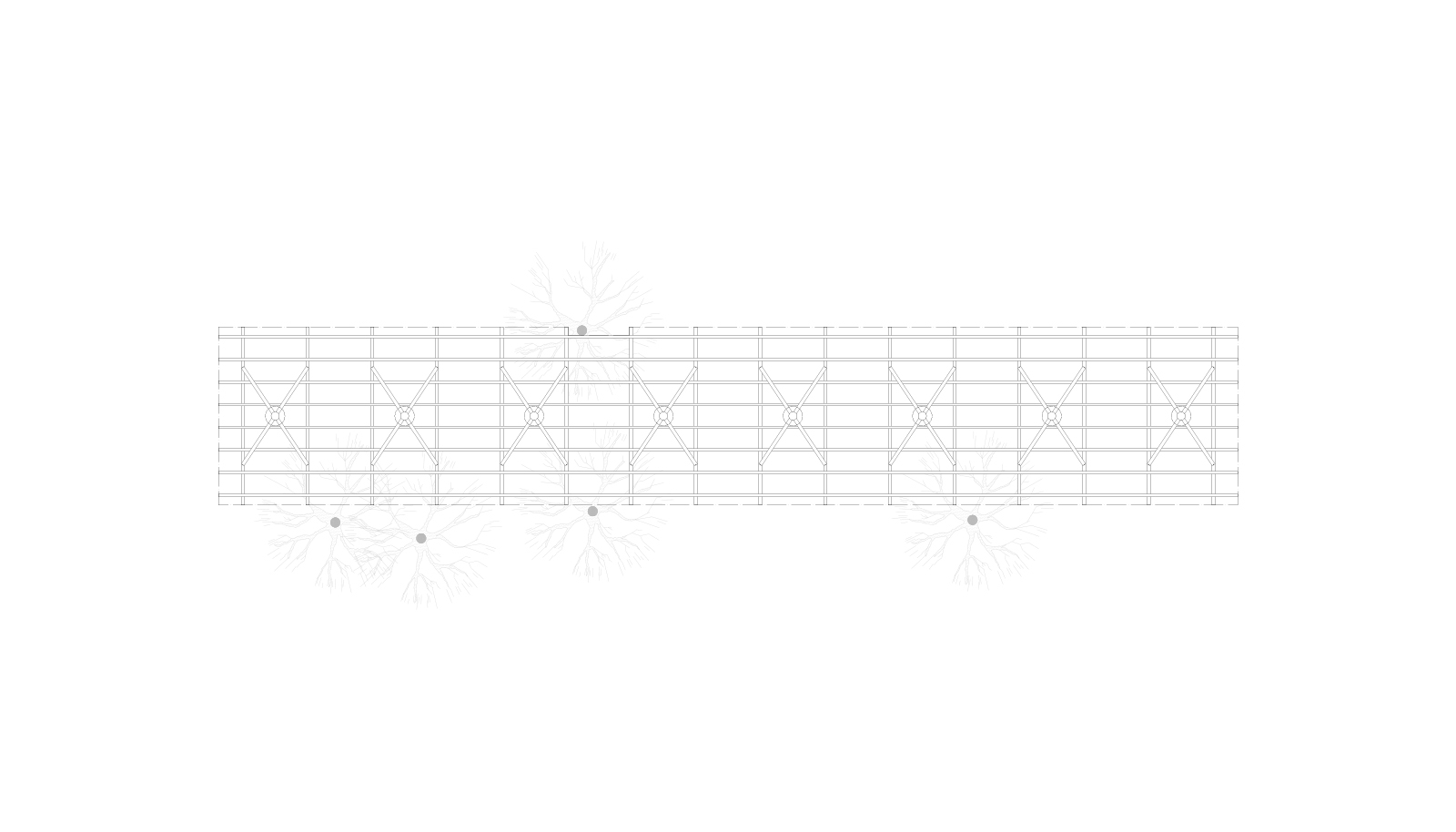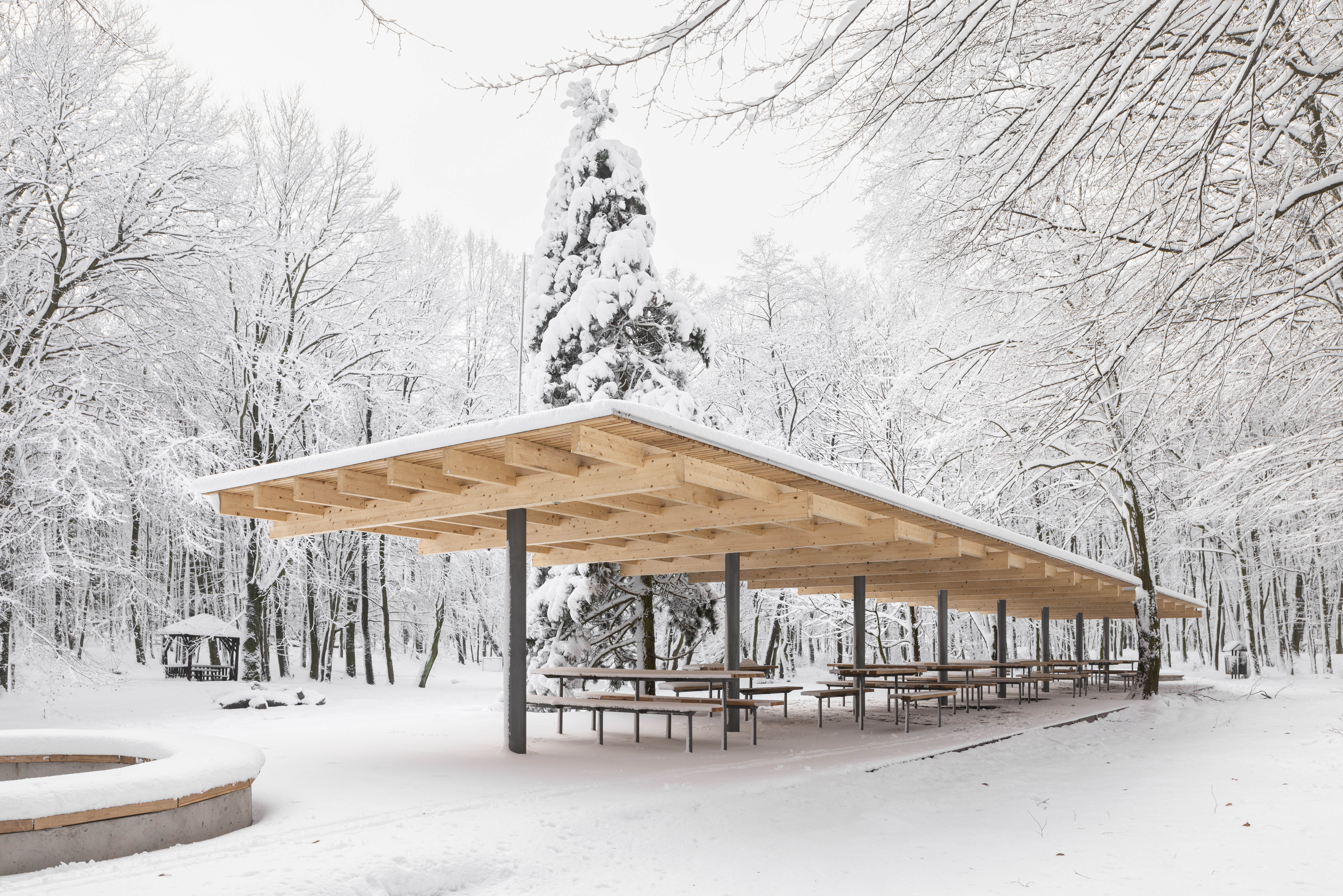 Východiskovou ideou je vyvesenie drevenej mriežky ponad morfológiu lesa, tak aby bola podopretá čo možno najmenším počtom oporných konštrukcií. Priestor lesa tak pozvoľne plynie naprieč zastrešeným výsekom krajiny až na priľahlú lúku a späť.