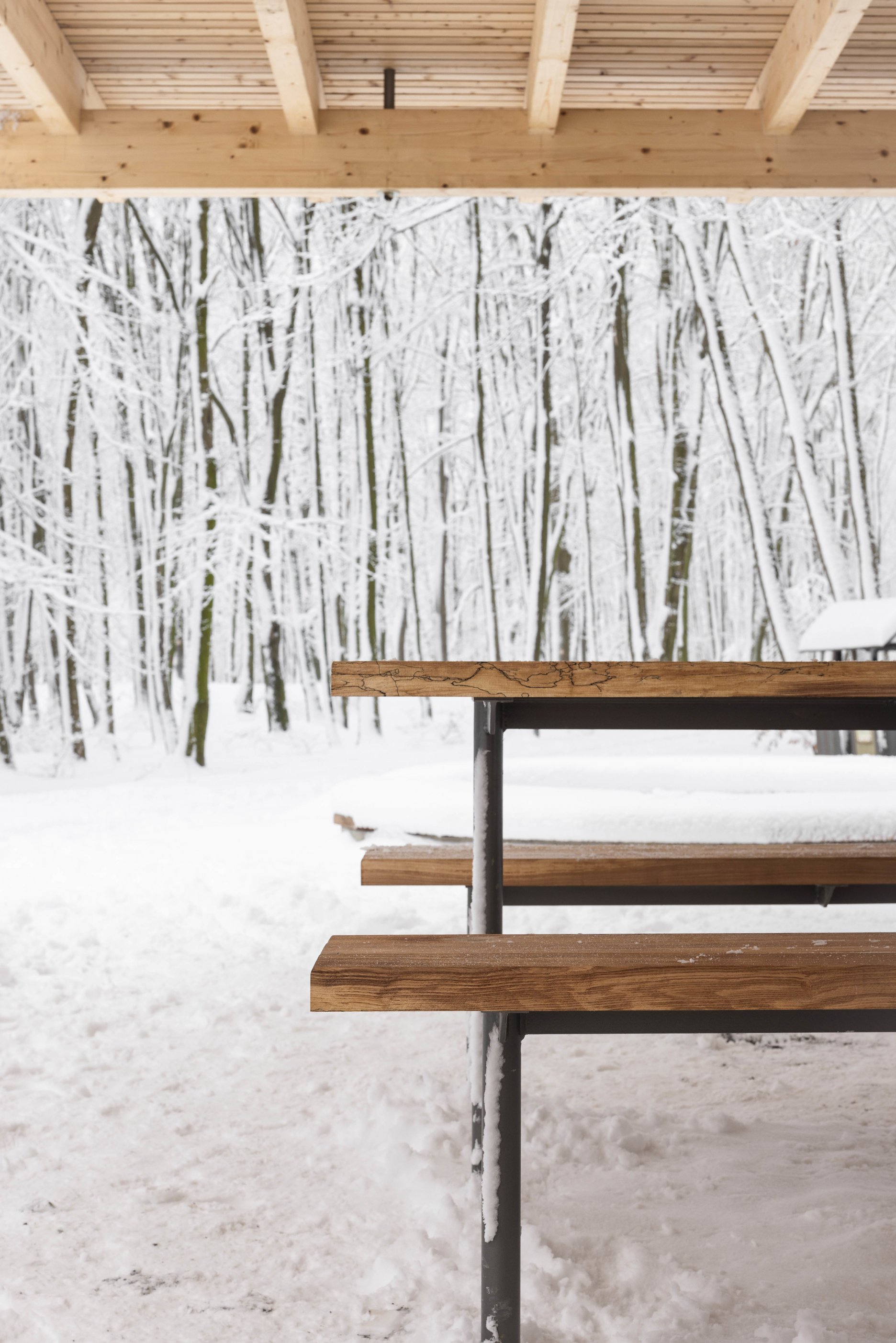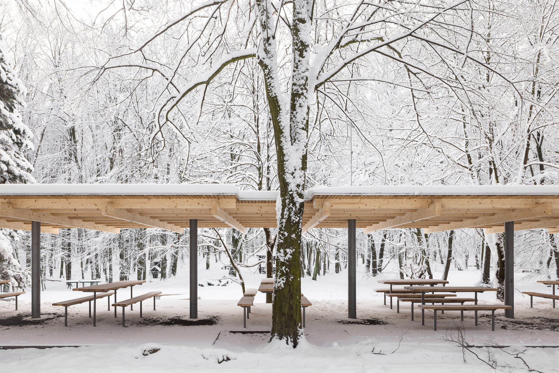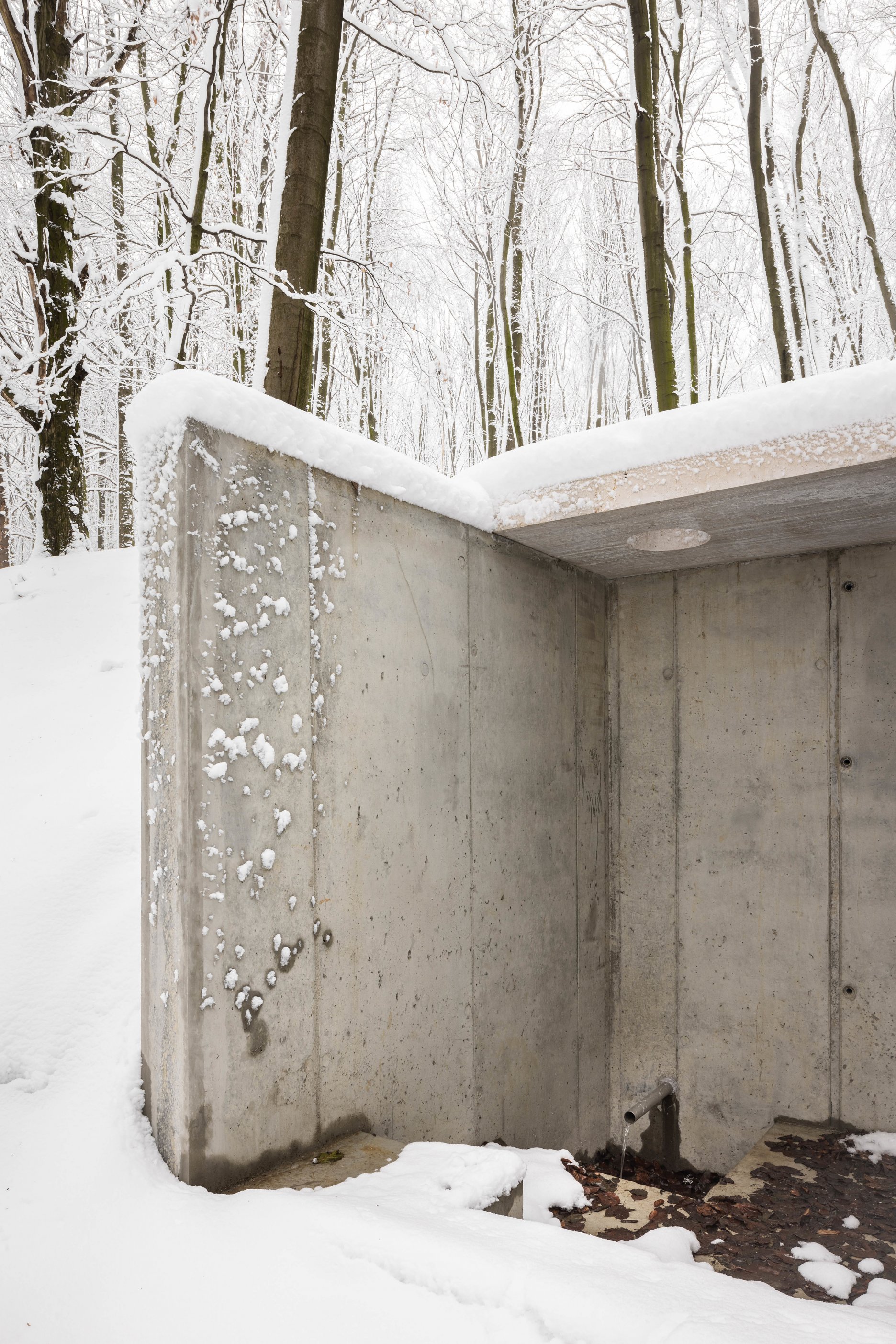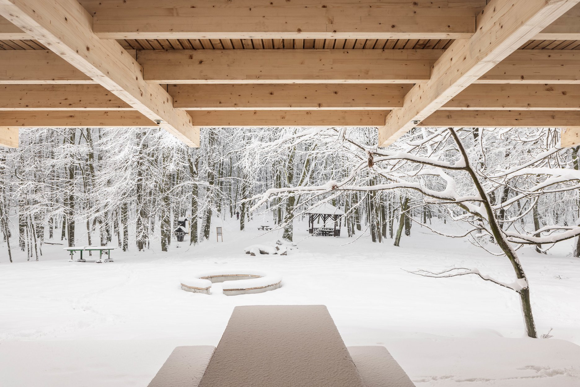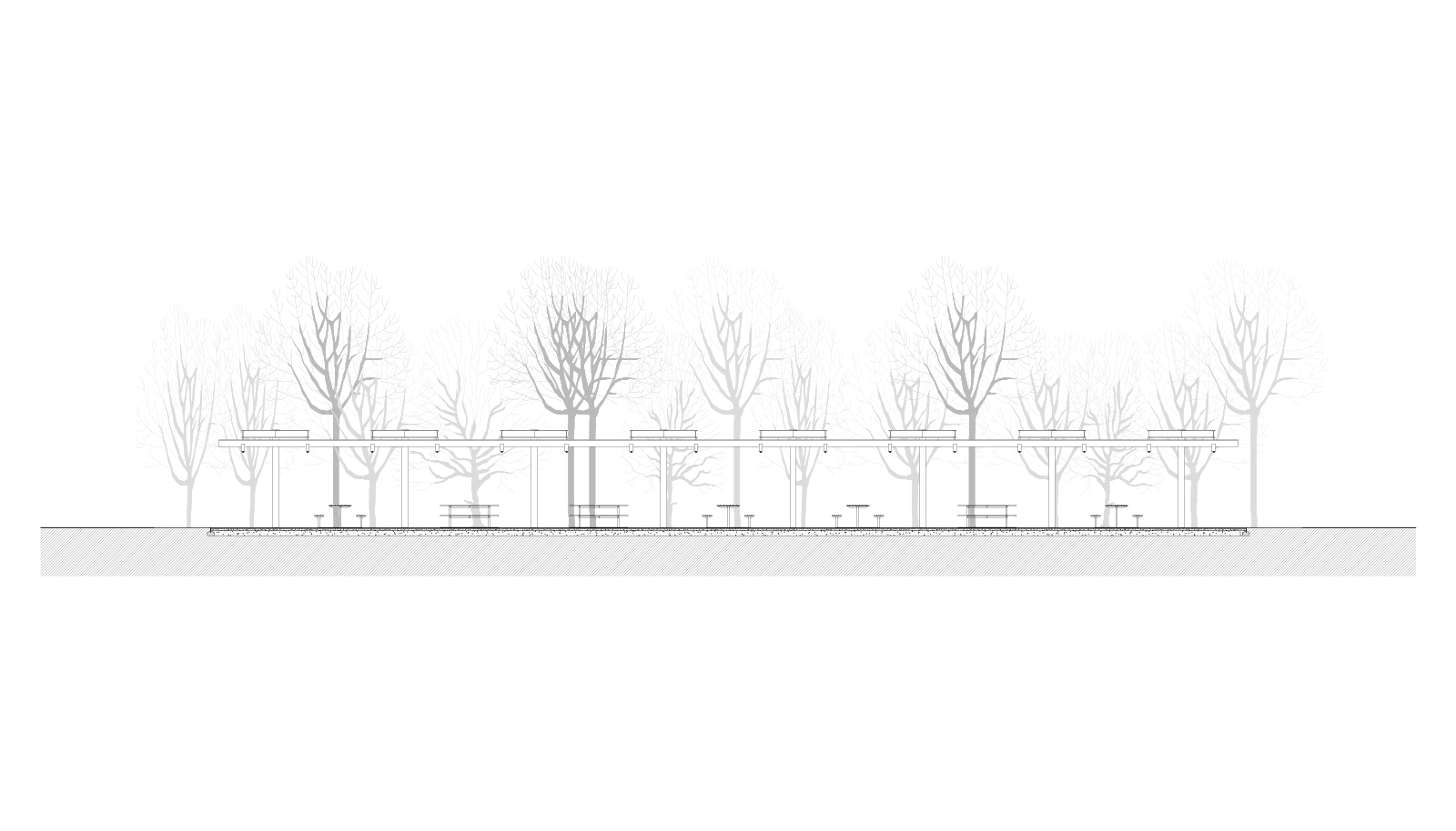 Východiskovou ideou je vyvesenie drevenej mriežky ponad morfológiu lesa, tak aby bola podopretá čo možno najmenším počtom oporných konštrukcií. Priestor lesa tak pozvoľne plynie naprieč zastrešeným výsekom krajiny až na priľahlú lúku a späť.