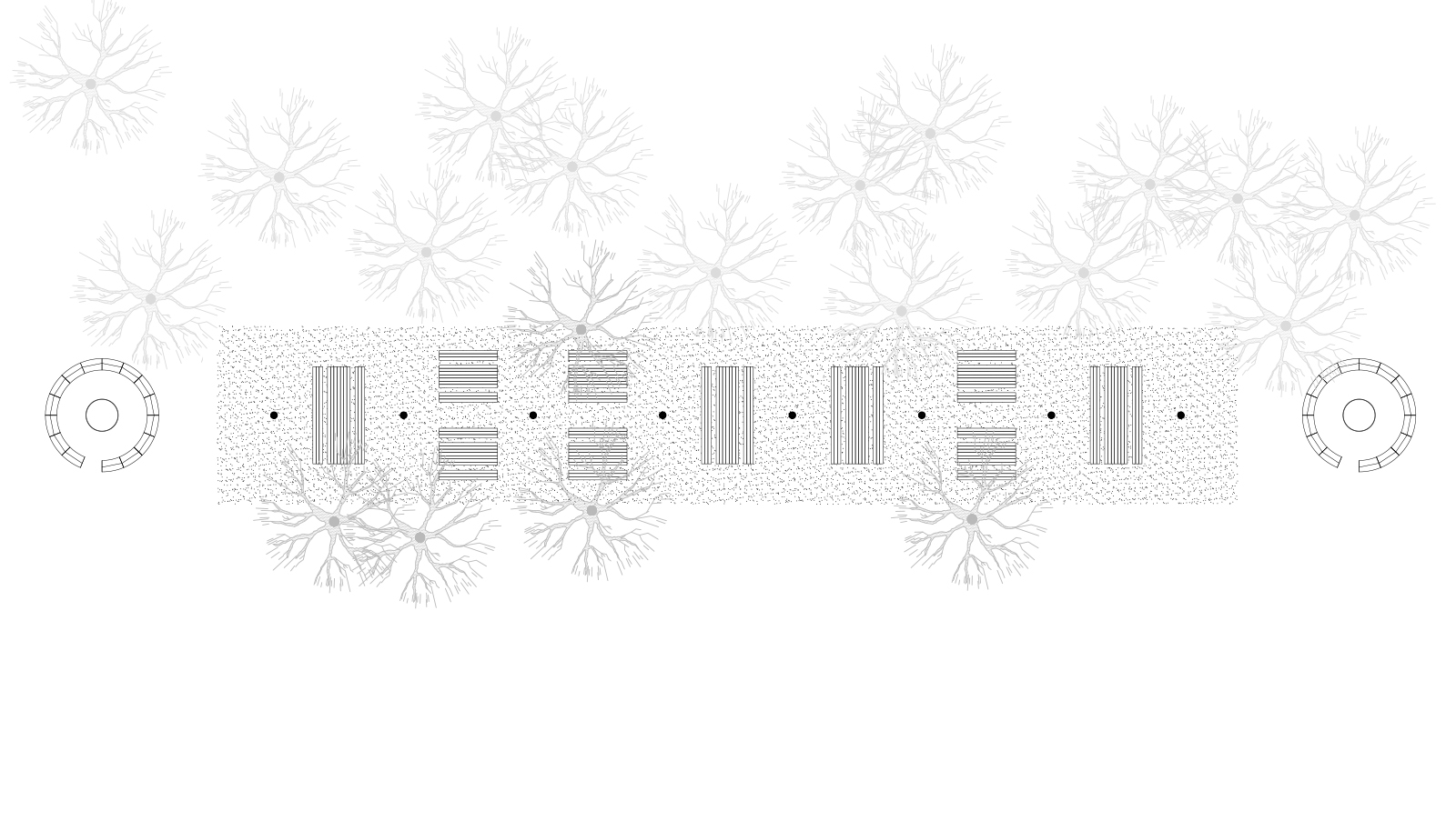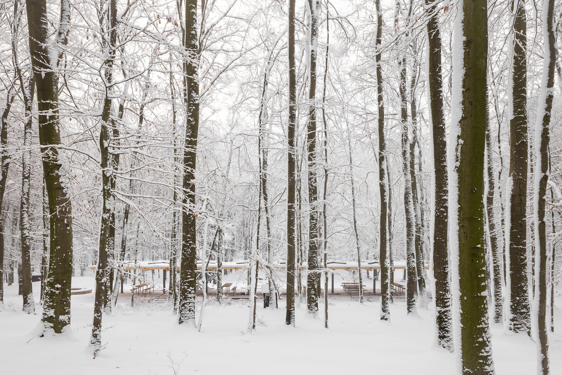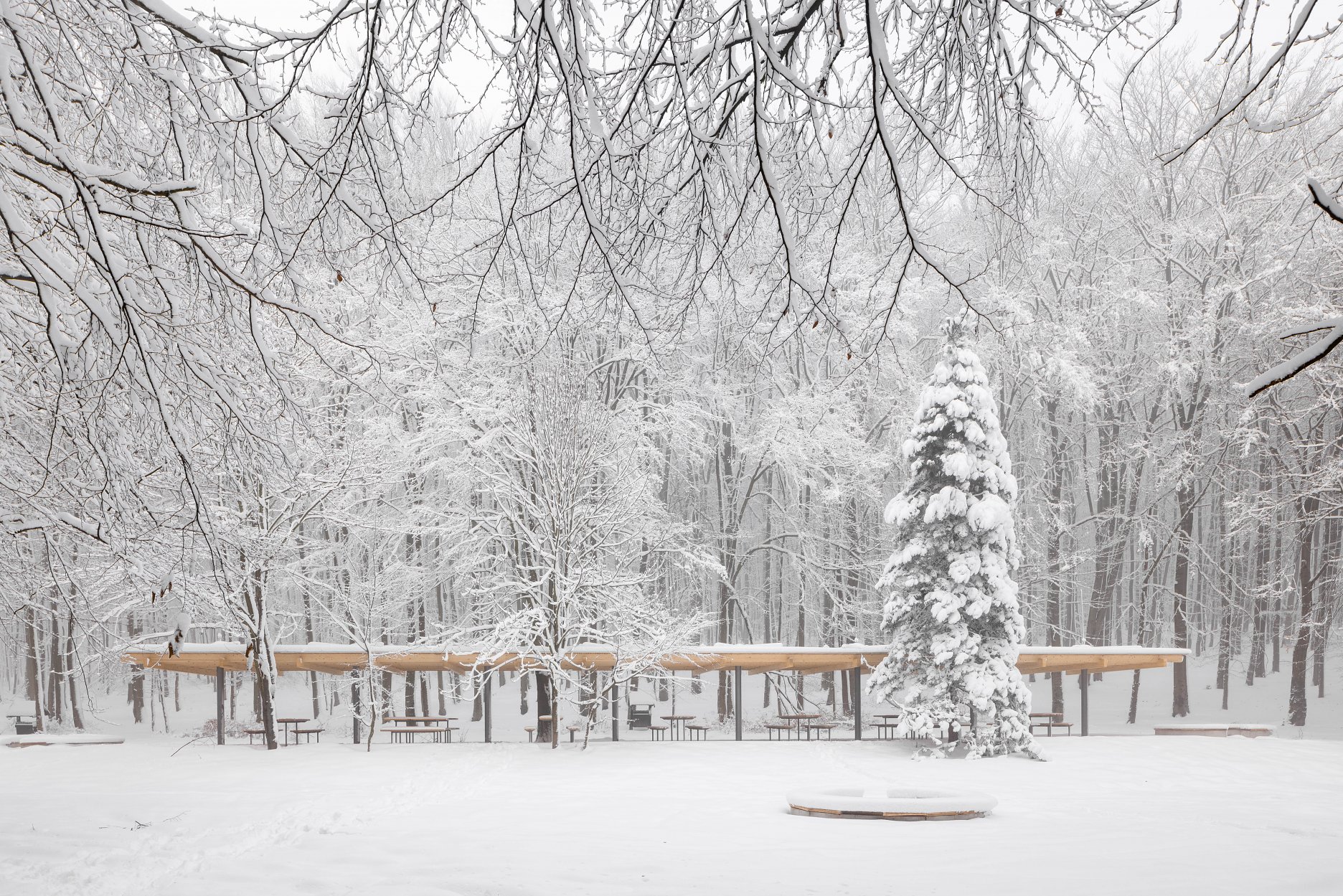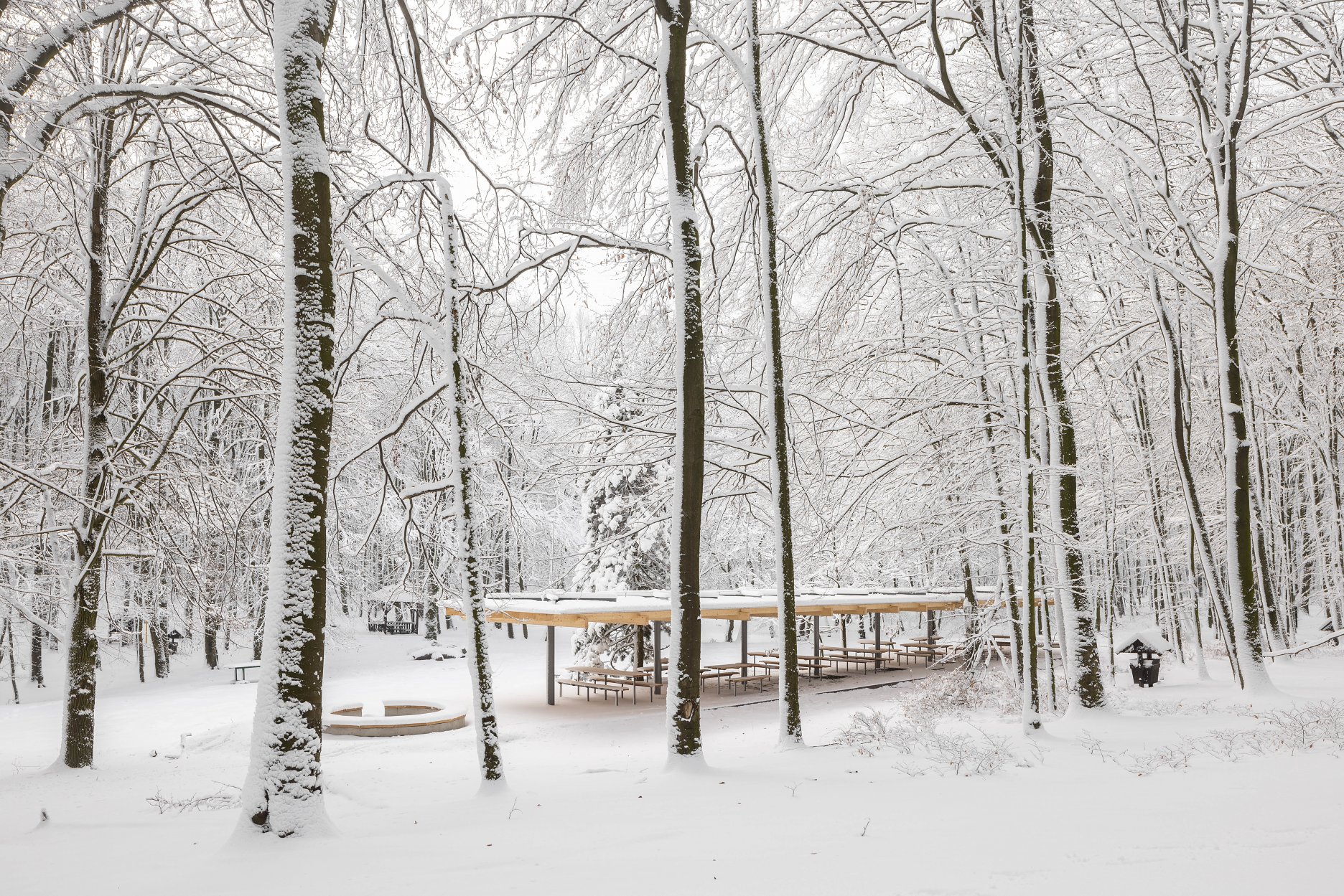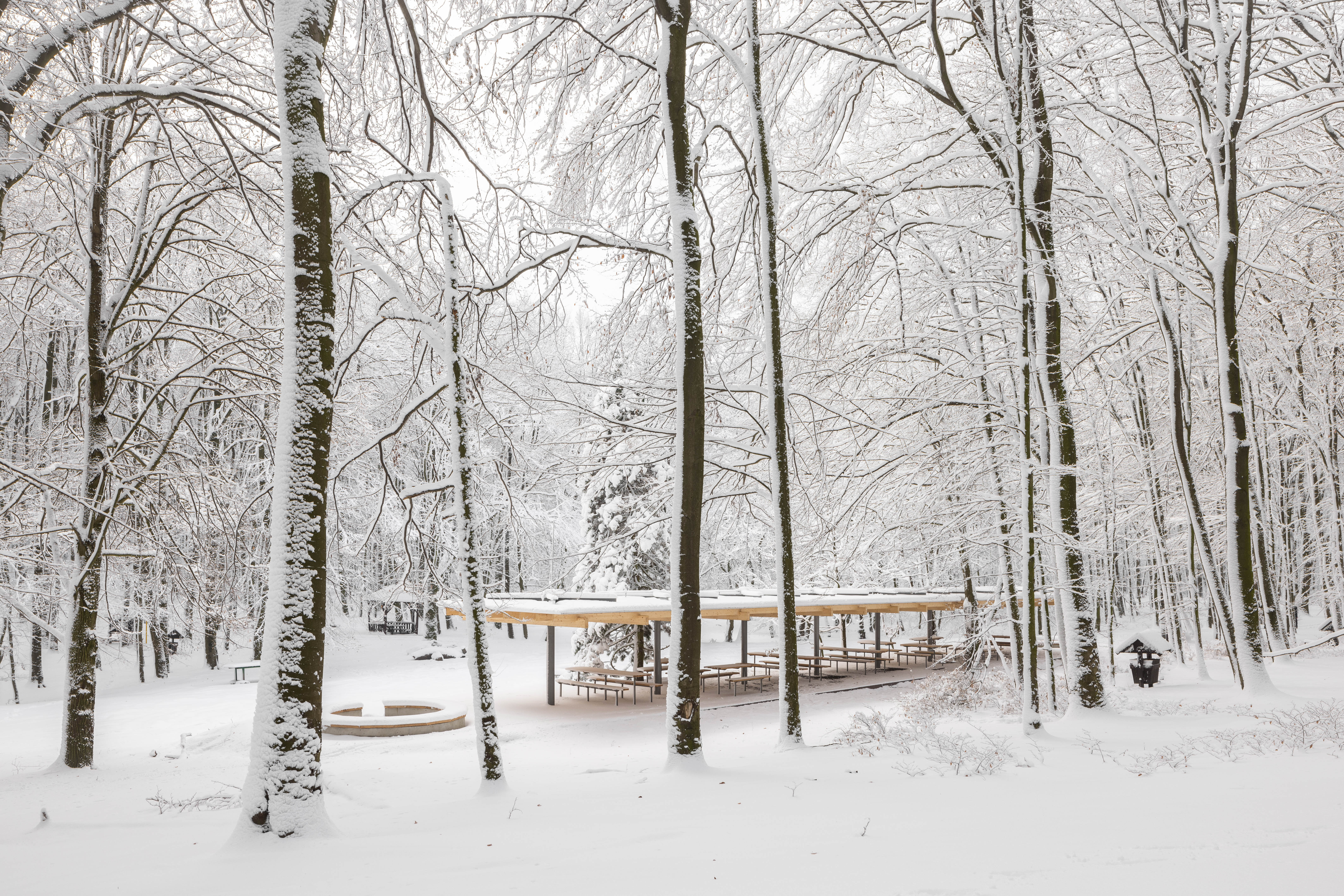 Východiskovou ideou je vyvesenie drevenej mriežky ponad morfológiu lesa, tak aby bola podopretá čo možno najmenším počtom oporných konštrukcií. Priestor lesa tak pozvoľne plynie naprieč zastrešeným výsekom krajiny až na priľahlú lúku a späť.