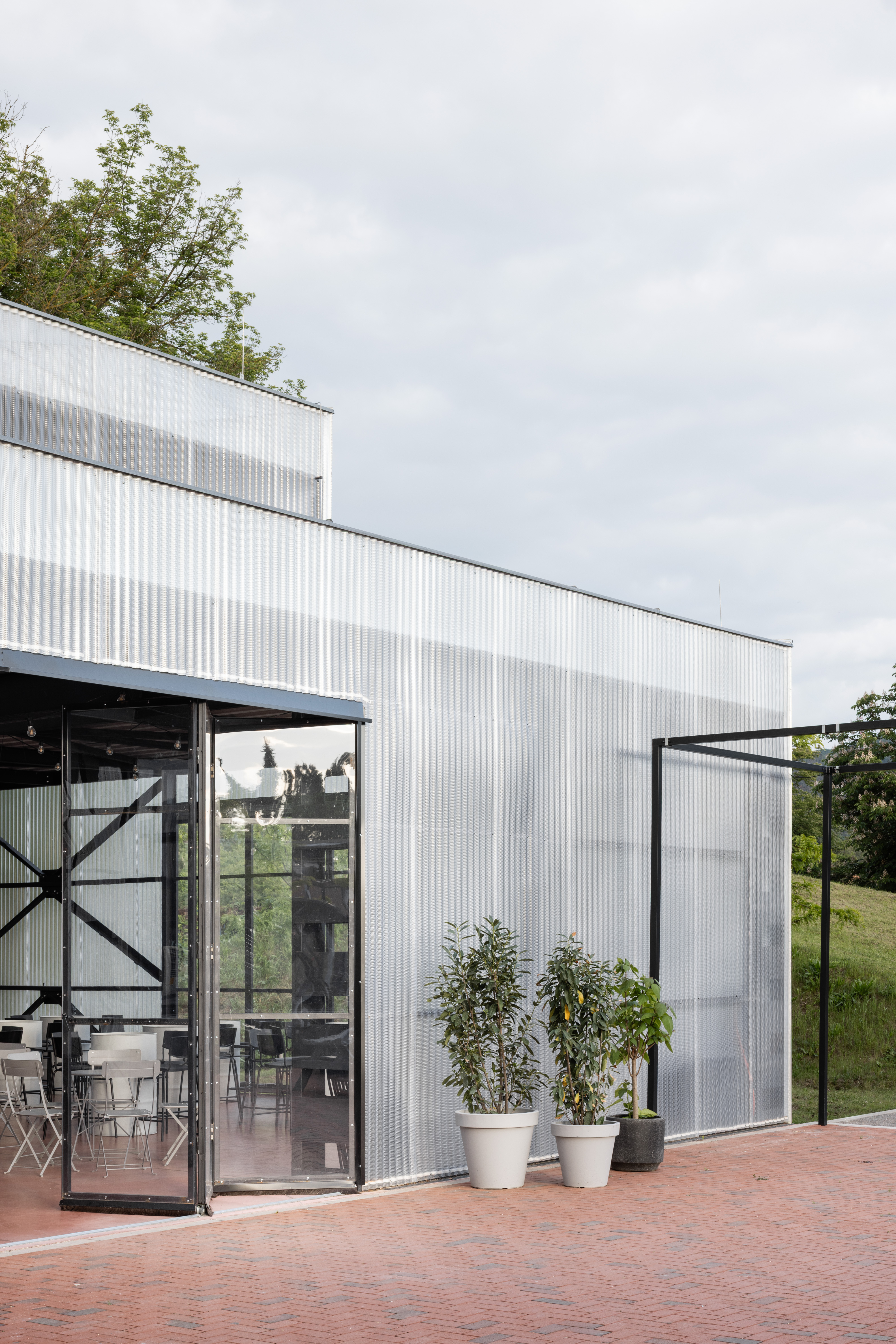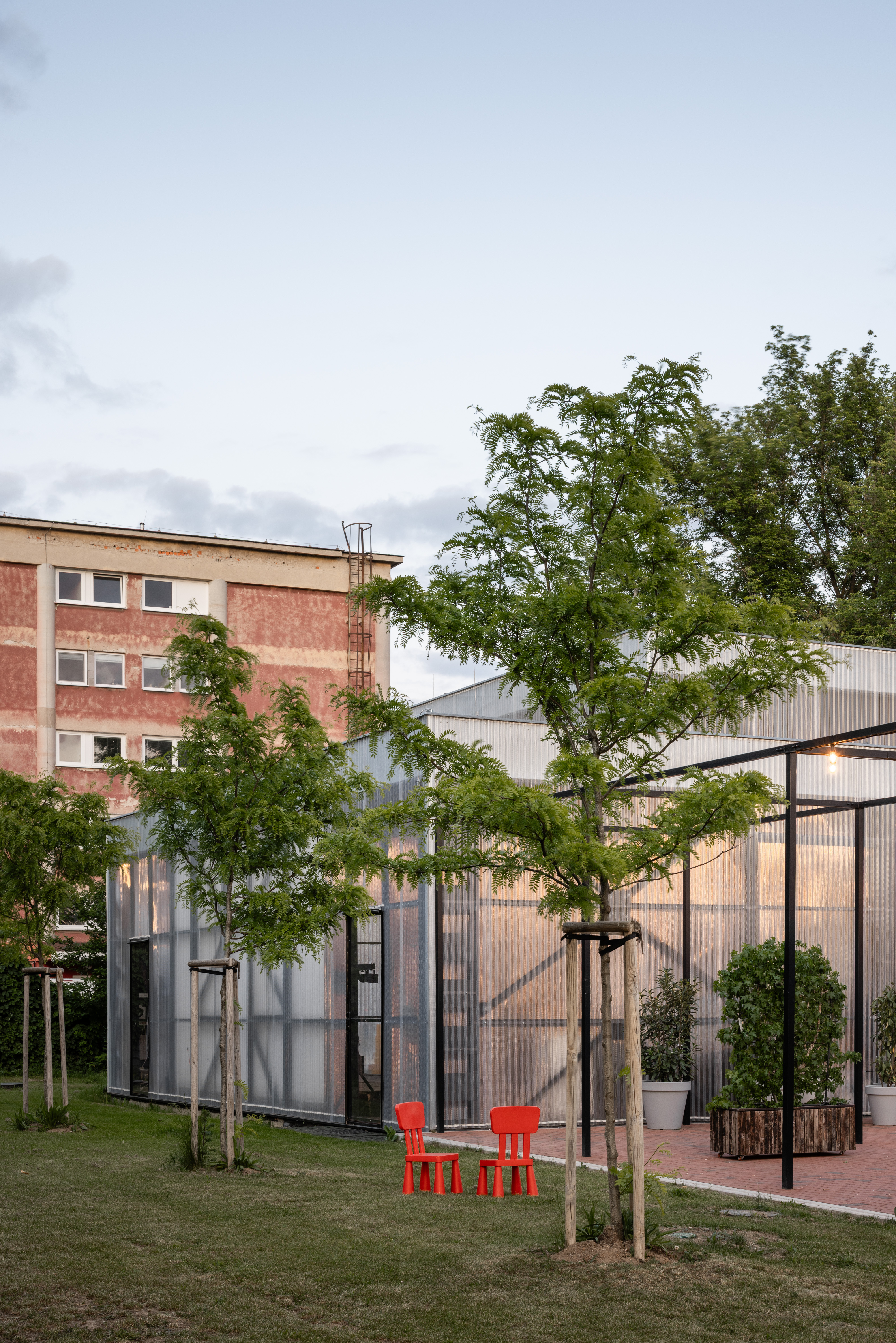 Tektoniku konštrukcie môžeme čítať skrz polotransparentný plášť z vlnitého polykarbonátu, ktorý prepúšťa svetlo a večer celý žiari. Horizontálnu povahu projektu akcentuje vztýčená vyhliadková veža v rohu námestia z terakotových dlaždíc odkazujúcich na pôvodnú materialitu. Obvodový zelený prstenec obsahuje plochy pre relax, elevovaný terén slúži na sledovanie divadla, prednášok alebo len tak na poležanie. Aktívnu časť od námestia oddeľujú aleje gledíčií.