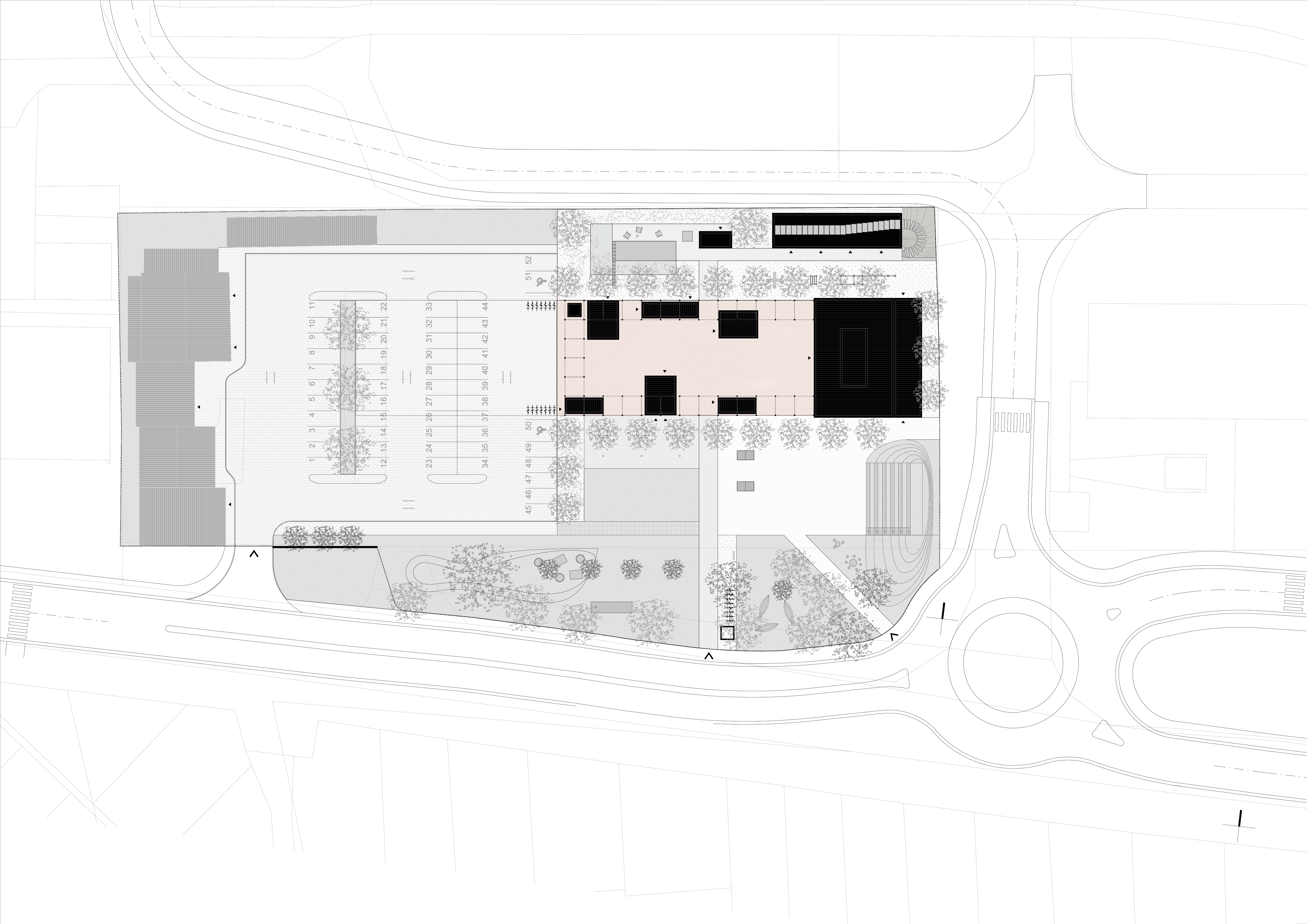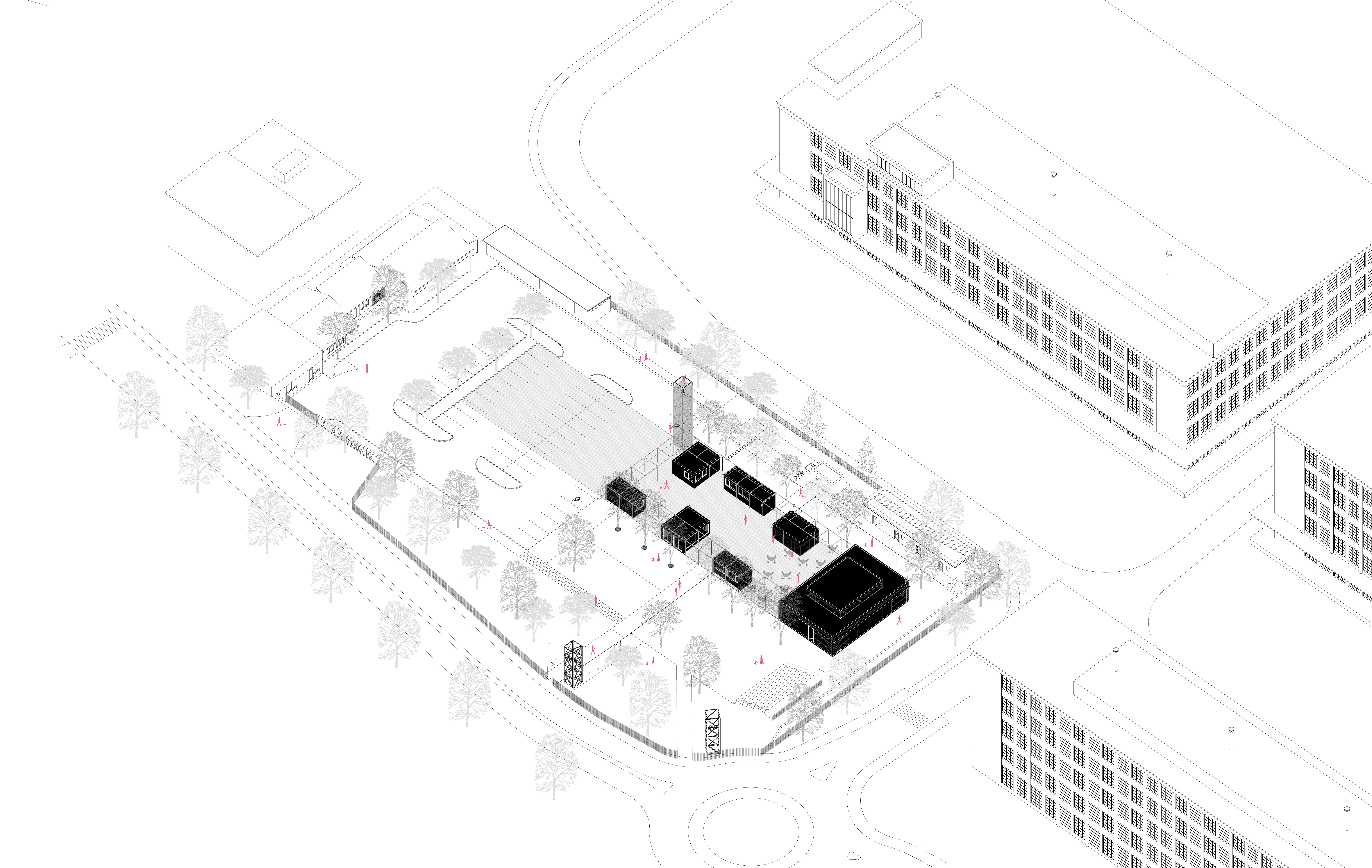 Na princípoch satelitného mesta sme vytvorili zelenú radiálu po obvode pozemku, ktorá filtruje jednak ruch a prach od hlavnej cesty, ale aj vizuálny smog nesúrodého okolia zanedbanej továrne. Tiež sa tu rozlieva život zo stredovej piazzetty v pôdorysných rozmeroch v minulosti zamýšľanej, ale nikdy nepostavenej etážovej budovy s číslom 80. Toto číslo - plechovú tabuľku, ktorá sa mala osadiť na postavenú továreň šťastnou náhodou dokonca dostali majitelia do daru od mestského Múzea.