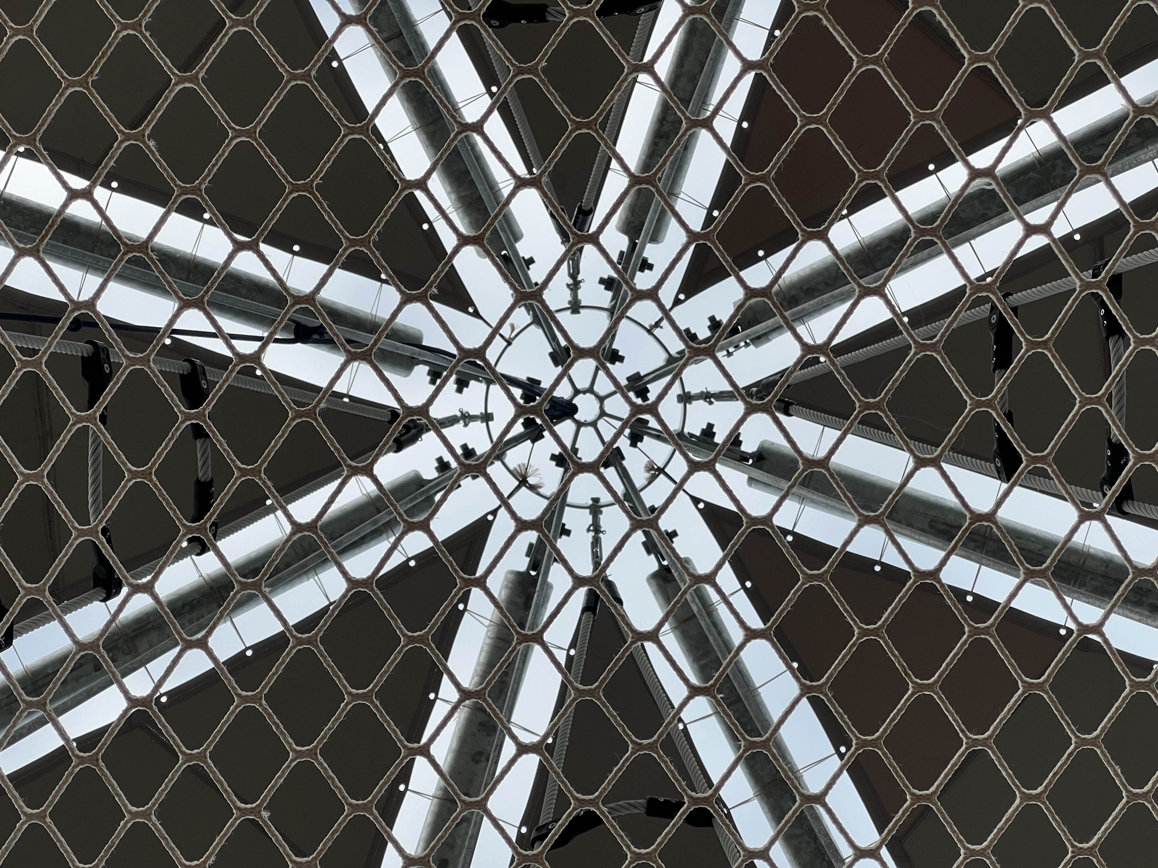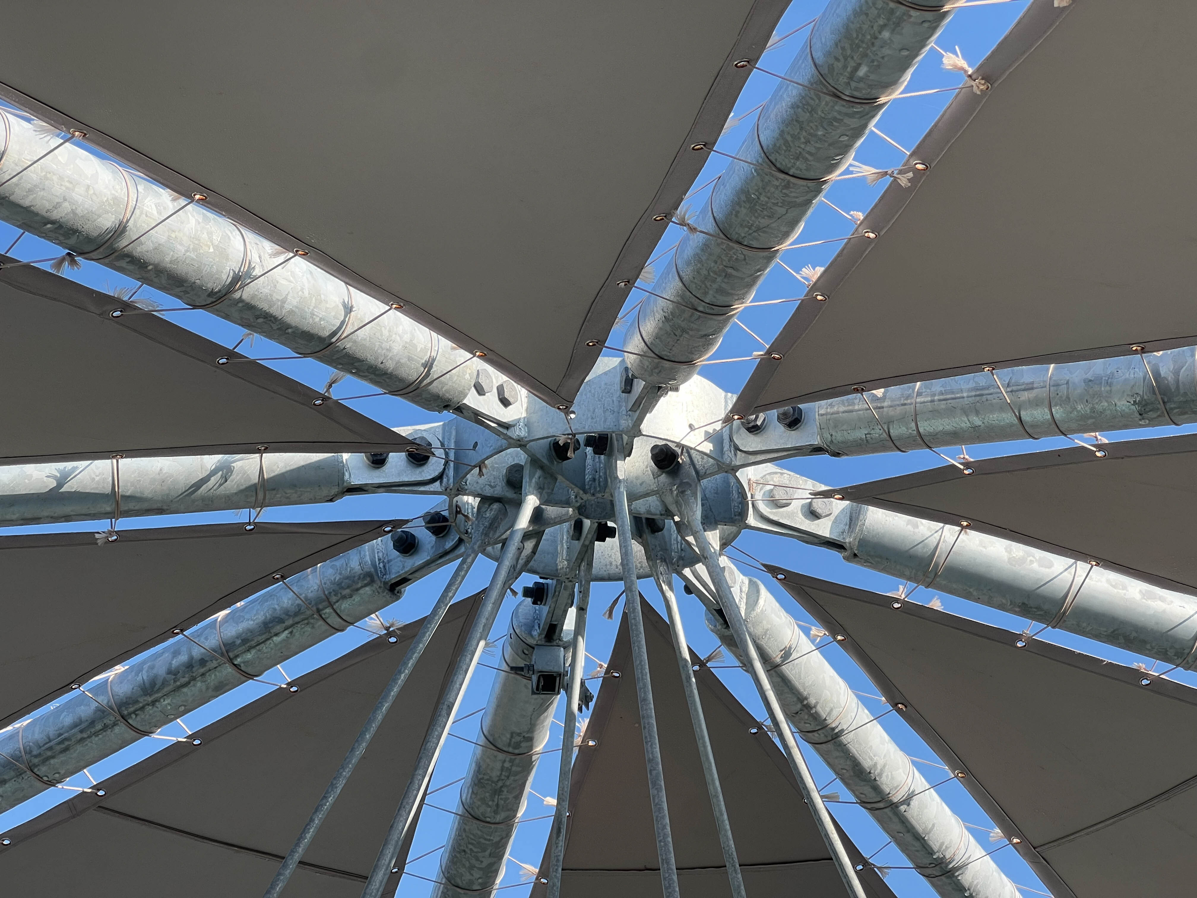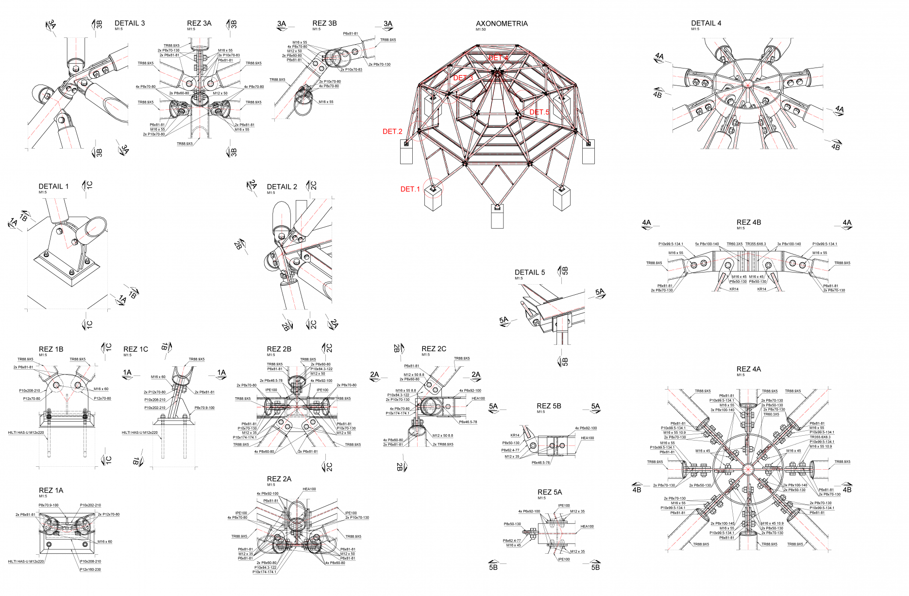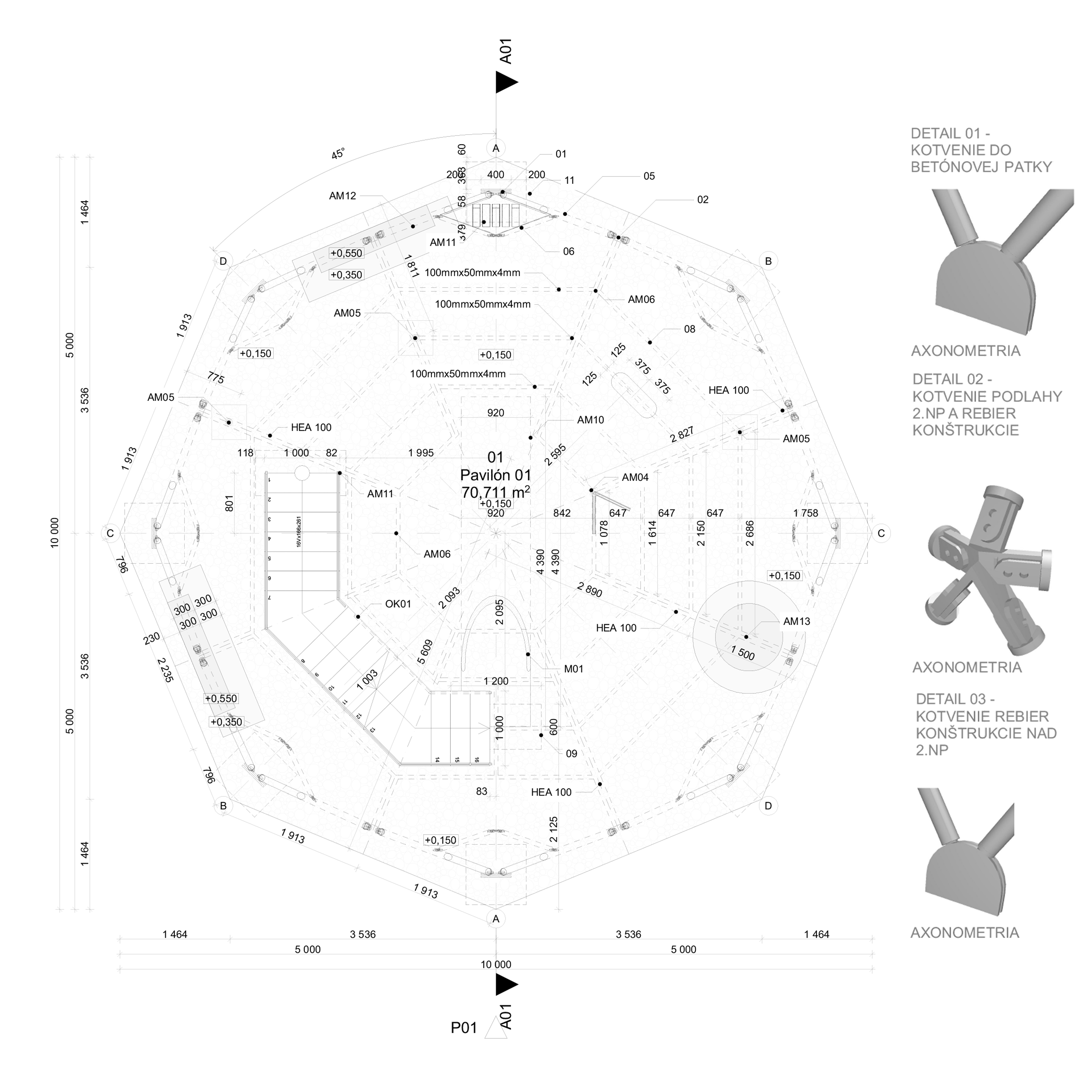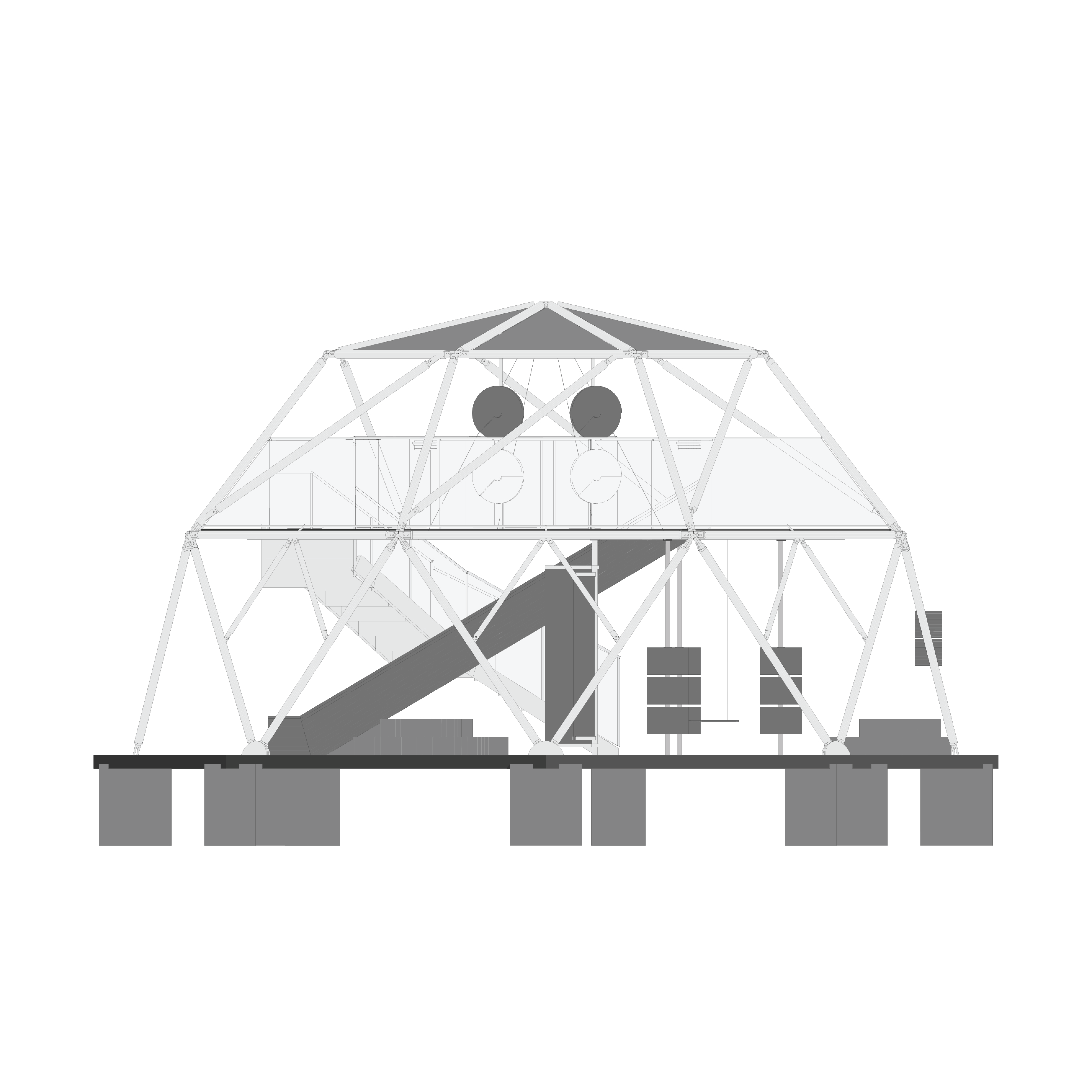 Geometria pologule vytvára prestrešenie oboch podlaží a prináša kvalitu pavilónového priestoru. Pre dosiahnutie subtílnosti statickej schémy sme zvolili kové konštrukcie. Tie segmentujú základnú formu a atypickým riešením spojov ramien demonštrujú možnosti práce s materiálom. Tematicky súdržná je aj recyklovateľnosť – oba pavilóny s doplnkami sú 100% recyklovateľné. Uprednostnenie kovu namiesto dreva vyplýva z analýzy, ktorá ukazuje, že drevo v tejto štruktúre má vyššiu ekologickú záťaž na prostredie..