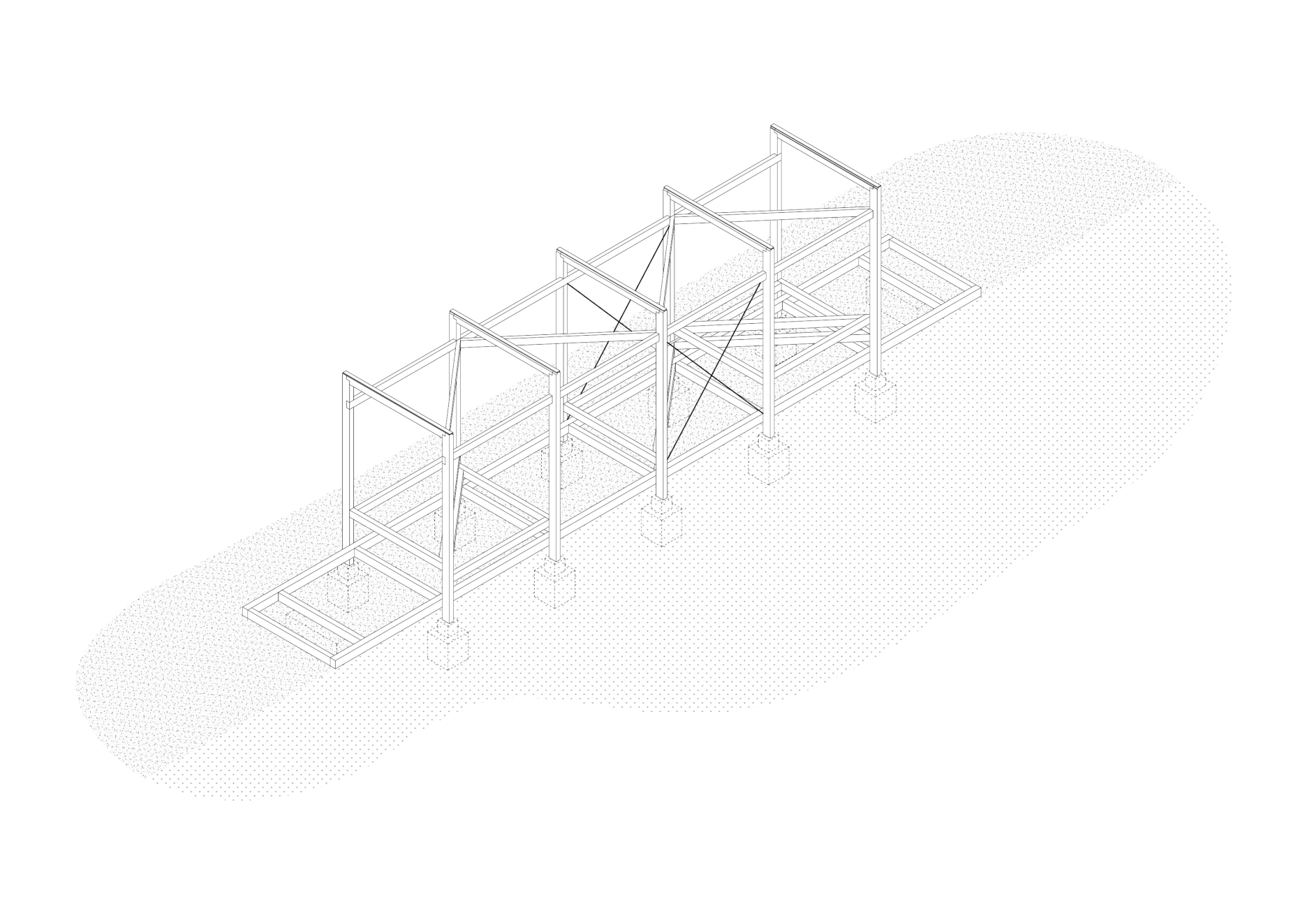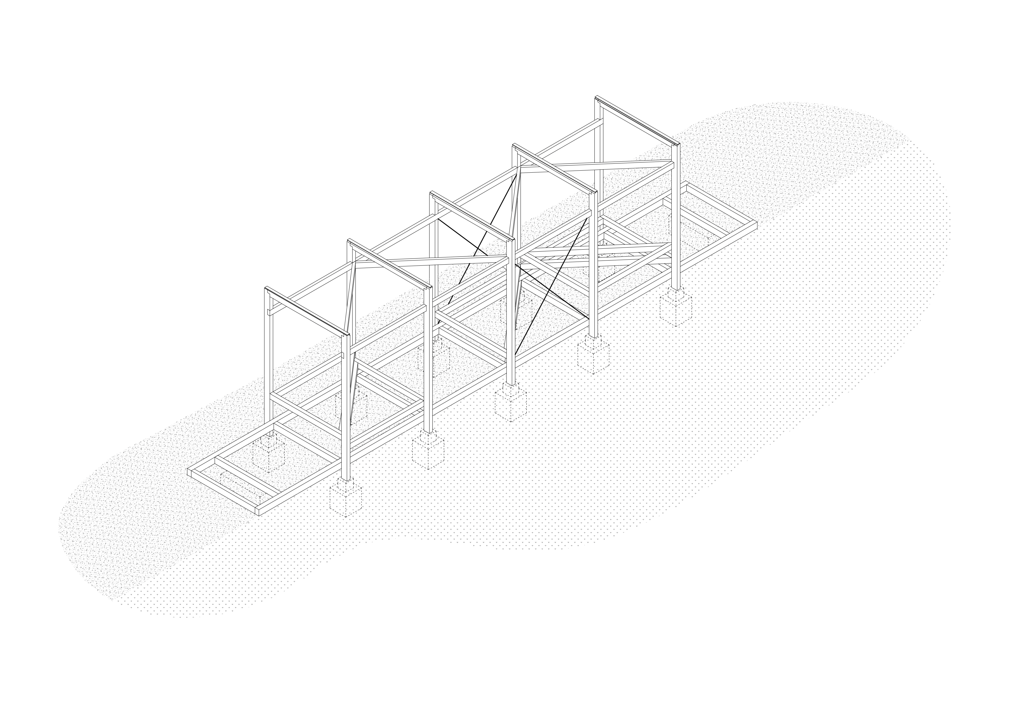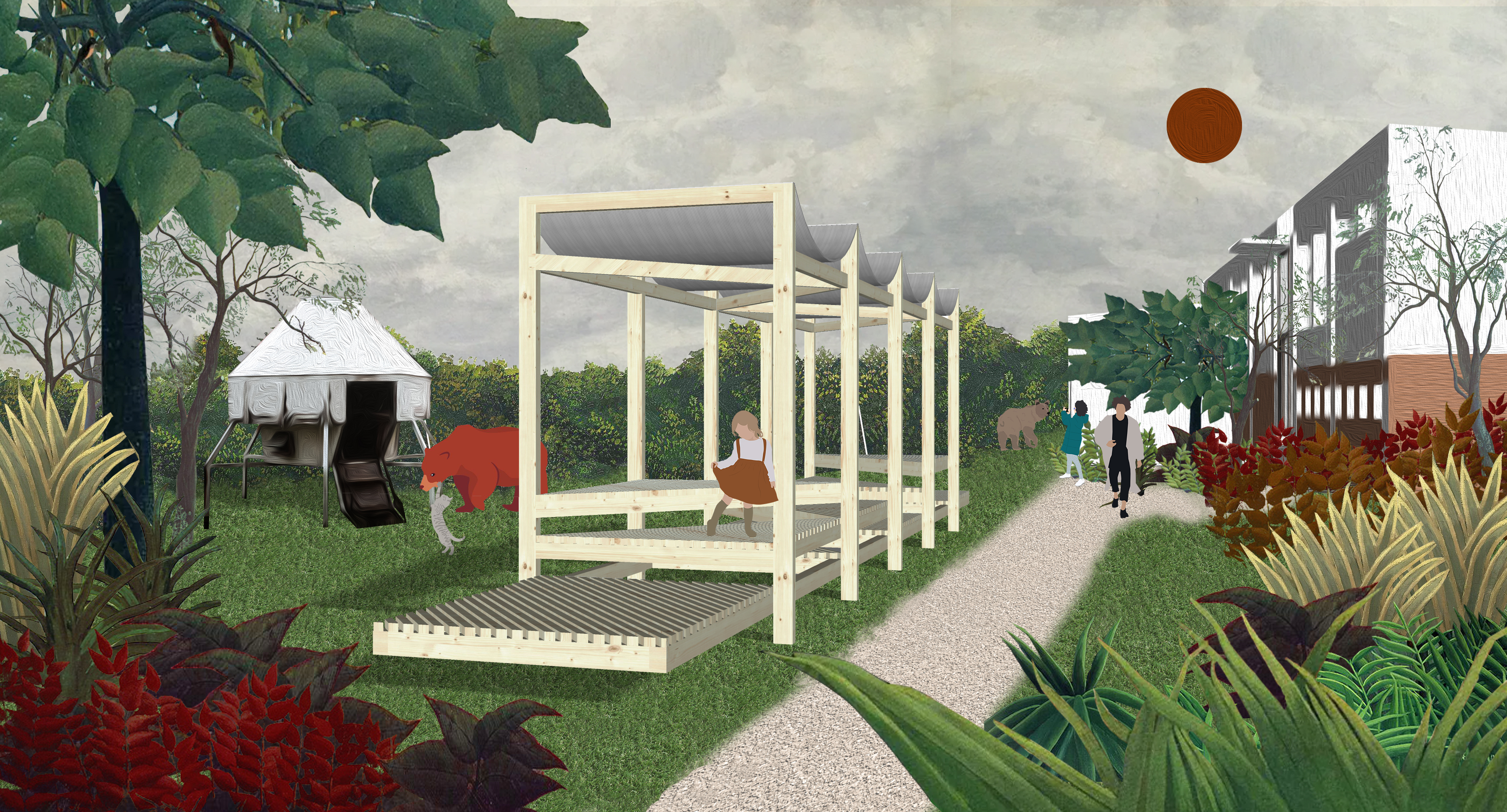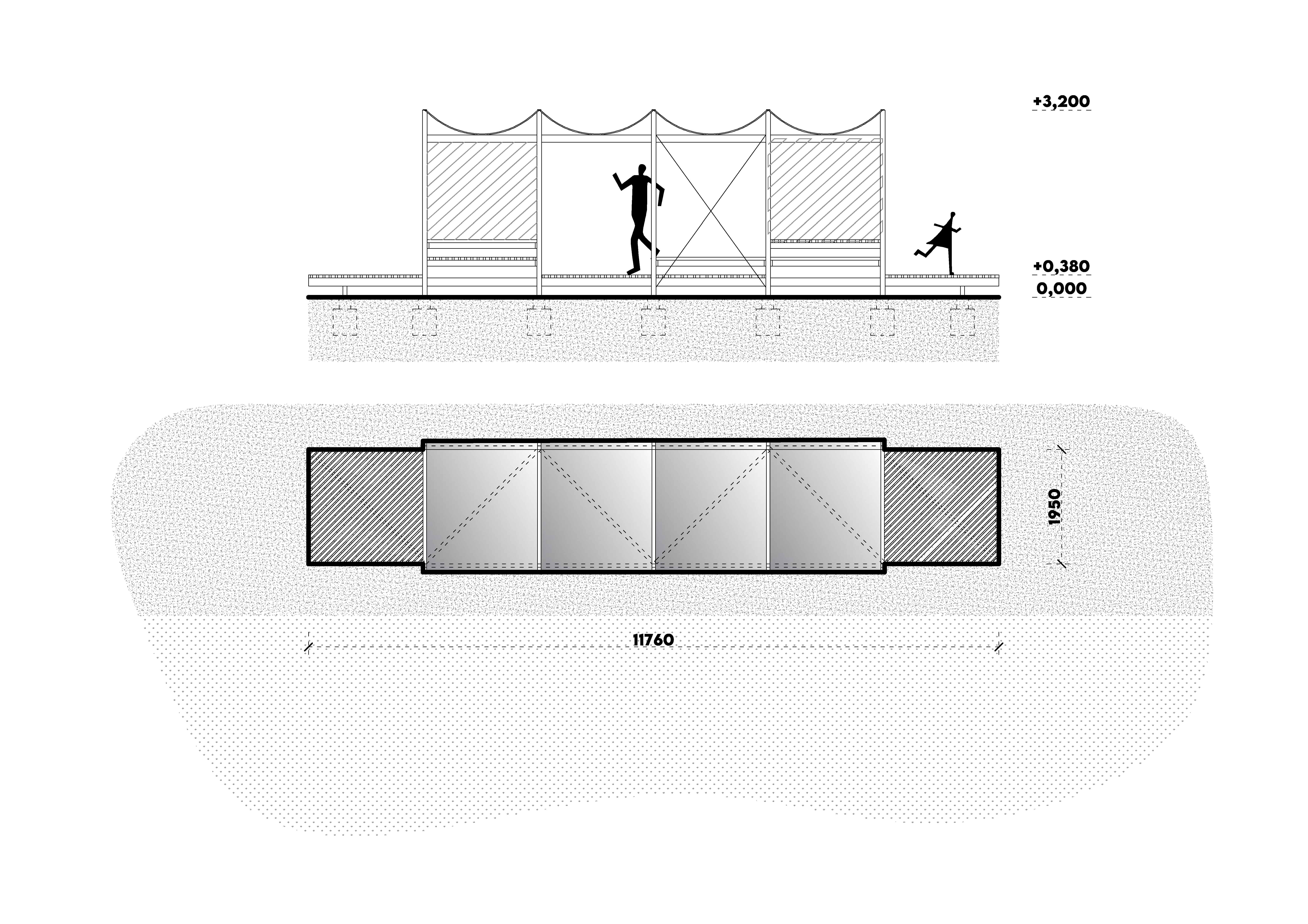 Pôdorysná stopa líniového objektu navádza ku vstupu do kultúrneho centra, má byť súčasťou osi, ktorá bude v čase navádzať návštevníkov až ďalej k amfiteátru kultúrneho centra, taktiež ale reflektuje pozdĺžnu os ihriska, a vizuálne oddeľuje priľahlý priestor venovaný prevažne aktivitám pre deti.