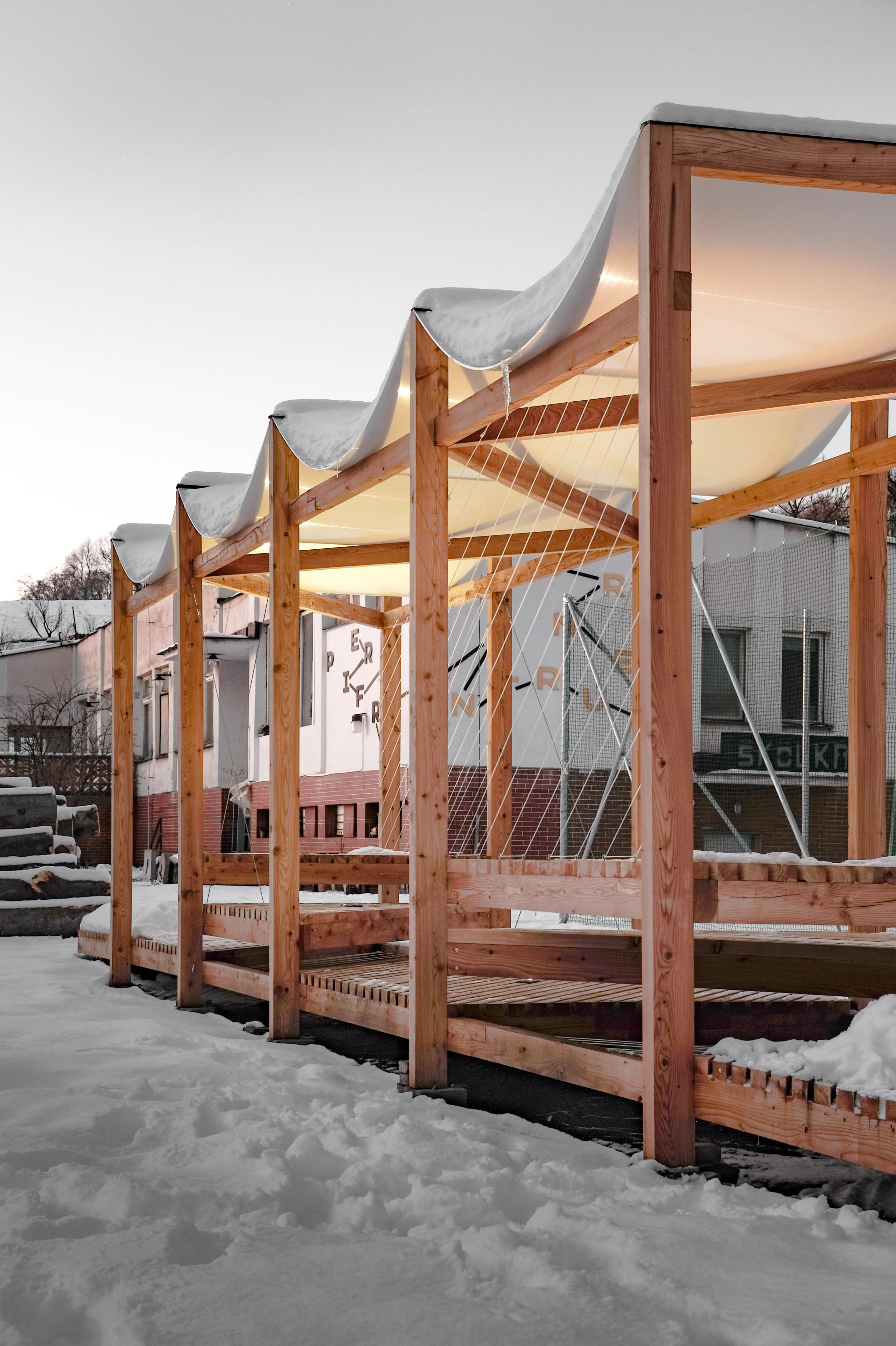 Objekt bol realizovaný autorským tímom. Materialita bola vyberaná s ohľadom na rôzne diela tvoriace identitu Periférnych centier, ale aj s ohľadom na nutnú relatívne rýchlu realizáciu. Pavilón je postavený zo smrekovca, strešná konštrukcia je tvorená ohýbaným bielym polykarbonátom. Zavetrený je oceľovými lankami a diagonálne stužený smrekovcovými hranolmi.