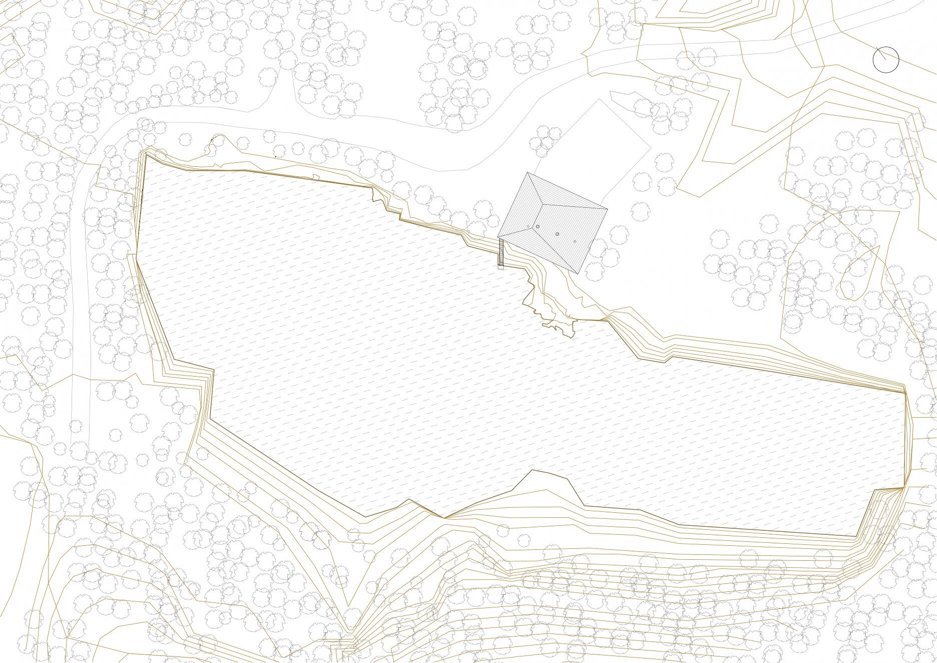 Projekt pavilónu nad zatopeným lomom je v podstate dvojbunka. Jedna slúži ako kancelária a druhá na krátkodobý pobyt správcu a majiteľa areálu. Jednopodlažná stavba so stanovou strechou prešla nespočetnými zmenami a hľadaním čo najvhodnejšieho ekonomického a estetického modelu.