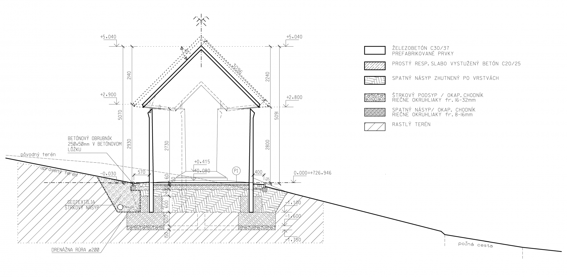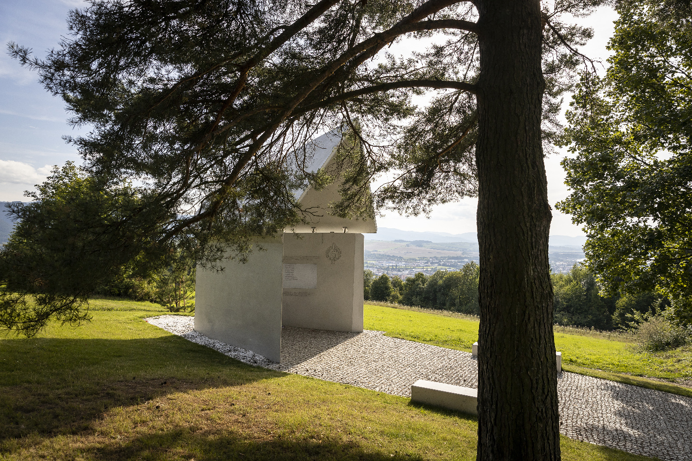 Archetypálne riešenie kaplnky je pretavené do priestoru, ktorý sa otvára pre prichádzajúceho. Jednotlivé steny z lešteného travertínového betónu (prefabrikované železobetónové prvky obohatené v procese výroby o travertínové kamenivo) s plasticky stvárnenými znakmi a menami sa zbiehajú do priehľadu na krásny horizont, ktorý je z pohľadu autorov večný.