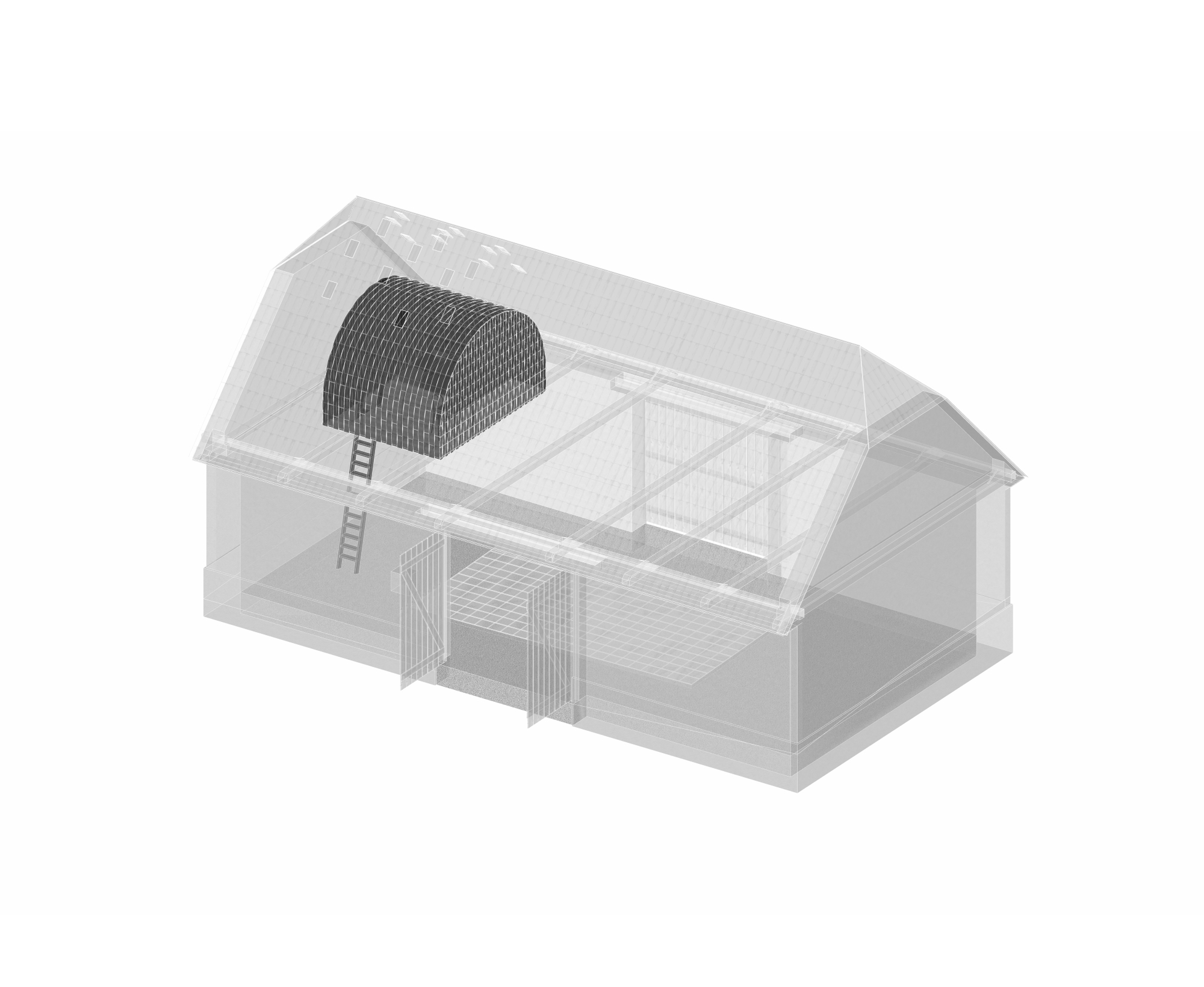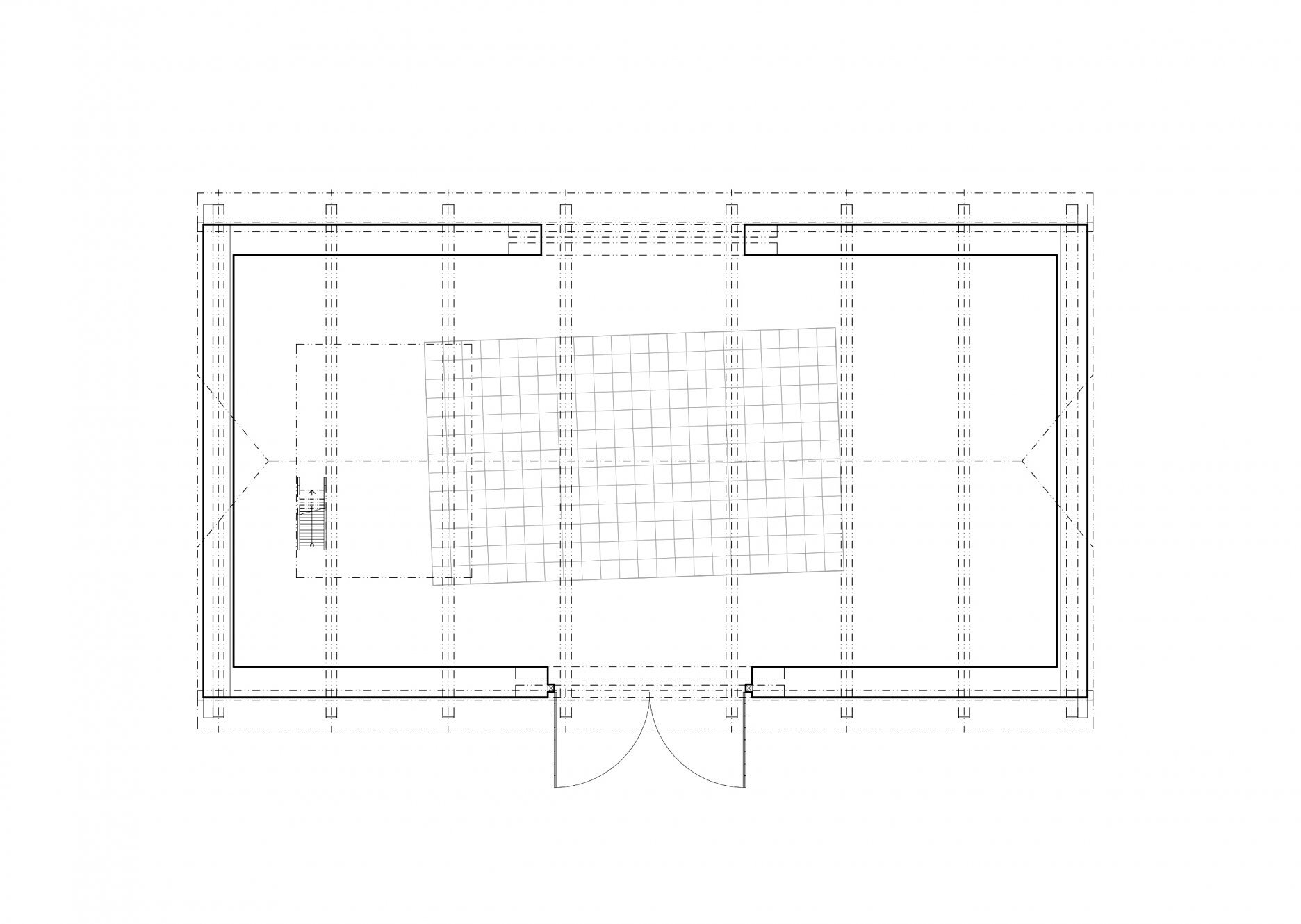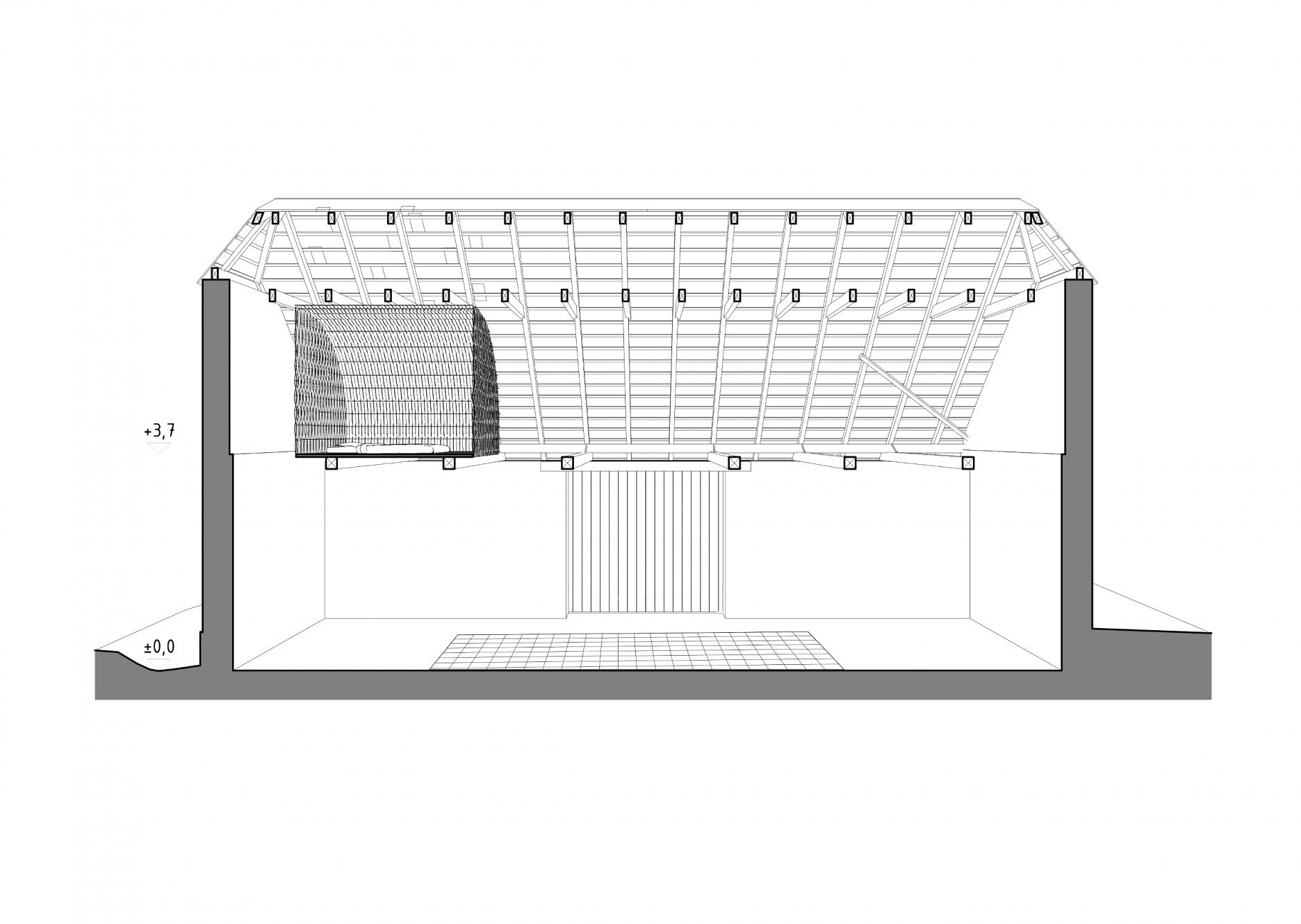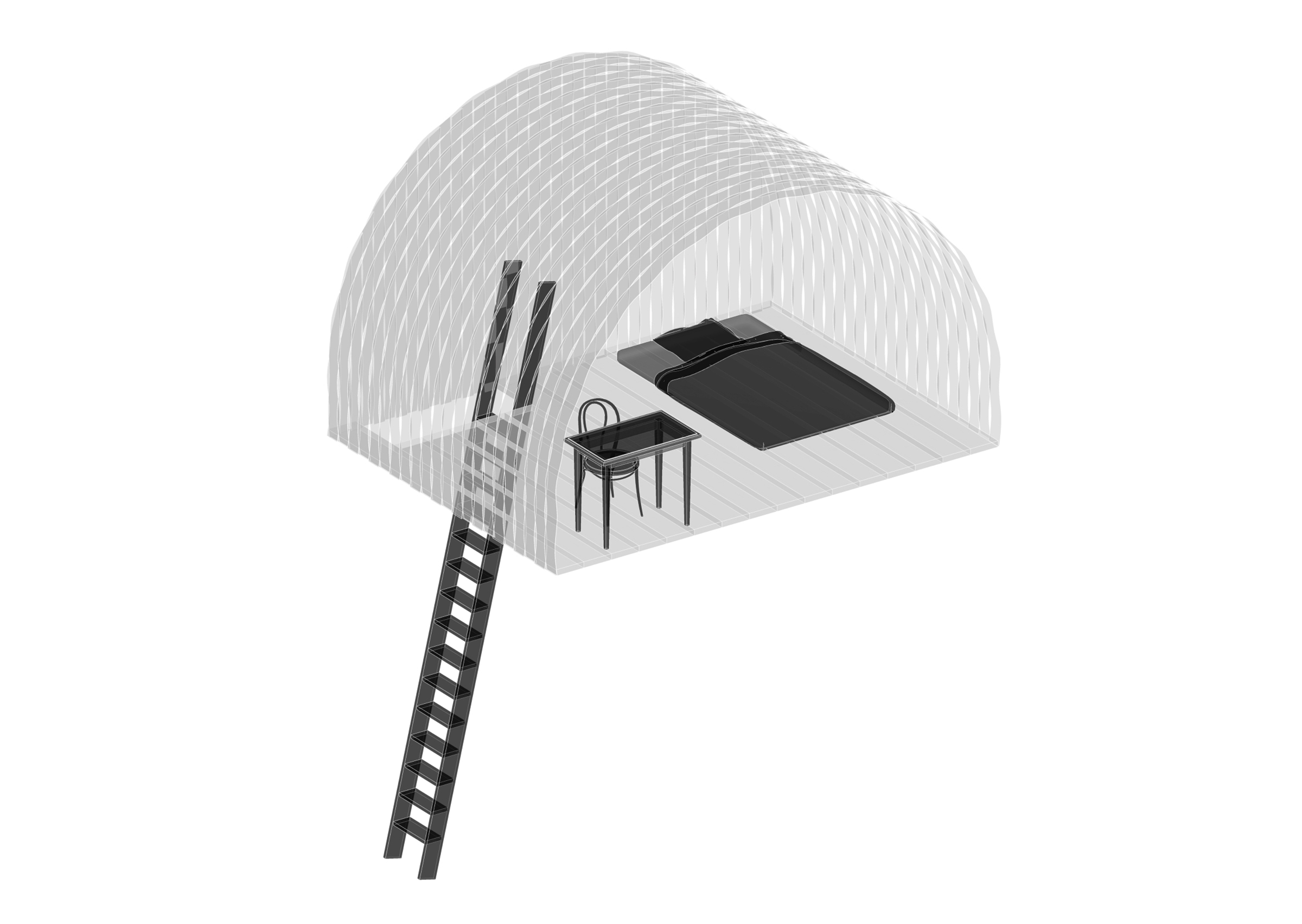 Zadanie vytvoriť v stodole ubytovaciu jednotku prirodzene smerovalo do podkrovnej časti objektu. Vzhľadom na veľkorysosť a ucelenosť priestoru eliminujeme spojenie s pôvodnými konštrukciami na minimum, aby sme zachovali vzdušnosť priestoru. Predkladáme striedmy návrh ubytovacej jednotky s pôdorysom 3 x 4 m. 12 m² box pre ubytovanie umelca pustovníka uložený na dvoch trámoch, prístupný rebríkom položeným mimo centrálnej časti. Pre potreby maximálnej vzdušnosti a oddelenia od strechy a zároveň dosiahnutie dostatočnej svetlej výšky tvoríme miestnosť preklenutú valbovou klenbou kopírujúcou sklon strechy a blížiacou sa ku vodorovným klieštinám. Klenba stavby bola tiež inšpirovaná jaskynnými klenbami, v ktorých často pustovníci nachádzali svoje útočisko. Zariadenie je čisto utilitárne – matrac/posteľ, stôl a stolička.