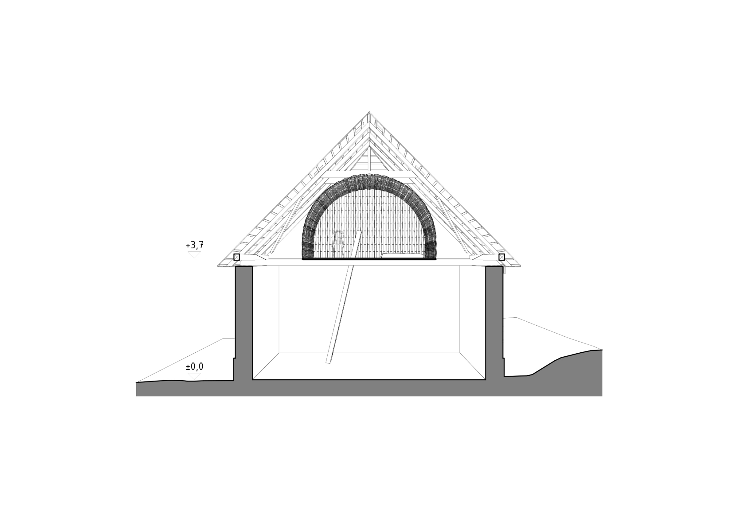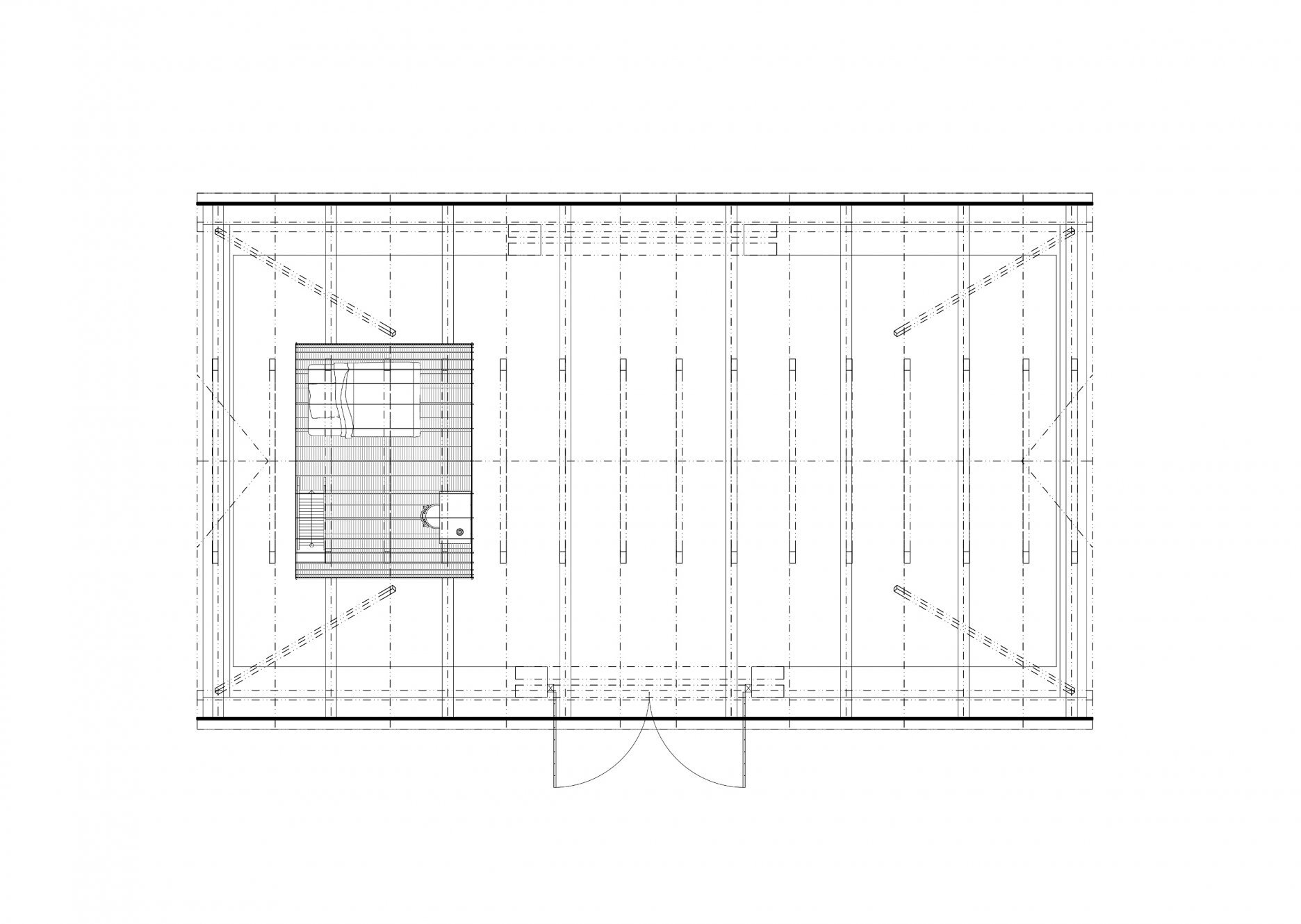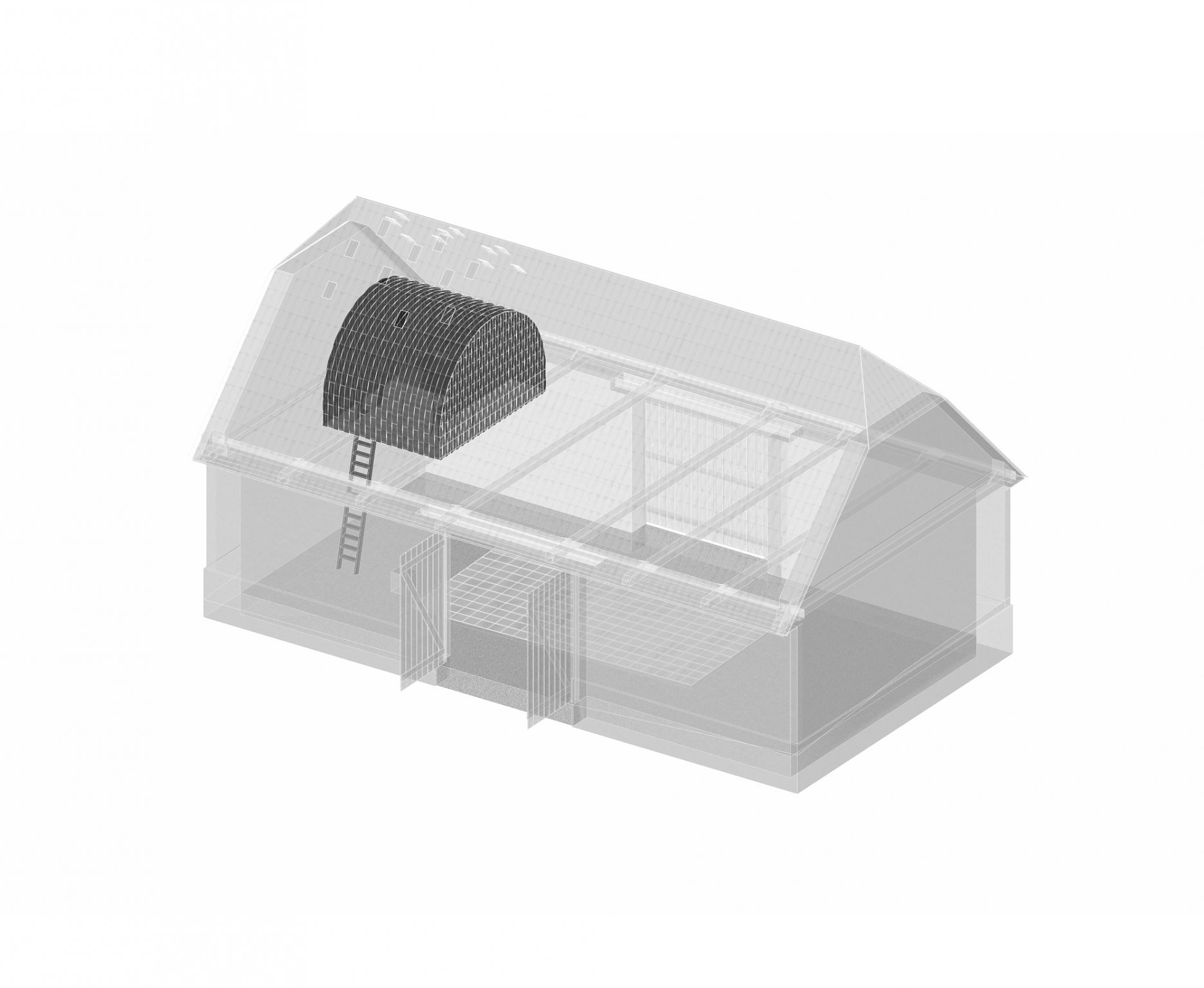 Zadanie vytvoriť v stodole ubytovaciu jednotku prirodzene smerovalo do podkrovnej časti objektu. Vzhľadom na veľkorysosť a ucelenosť priestoru eliminujeme spojenie s pôvodnými konštrukciami na minimum, aby sme zachovali vzdušnosť priestoru. Predkladáme striedmy návrh ubytovacej jednotky s pôdorysom 3 x 4 m. 12 m² box pre ubytovanie umelca pustovníka uložený na dvoch trámoch, prístupný rebríkom položeným mimo centrálnej časti. Pre potreby maximálnej vzdušnosti a oddelenia od strechy a zároveň dosiahnutie dostatočnej svetlej výšky tvoríme miestnosť preklenutú valbovou klenbou kopírujúcou sklon strechy a blížiacou sa ku vodorovným klieštinám. Klenba stavby bola tiež inšpirovaná jaskynnými klenbami, v ktorých často pustovníci nachádzali svoje útočisko. Zariadenie je čisto utilitárne – matrac/posteľ, stôl a stolička.