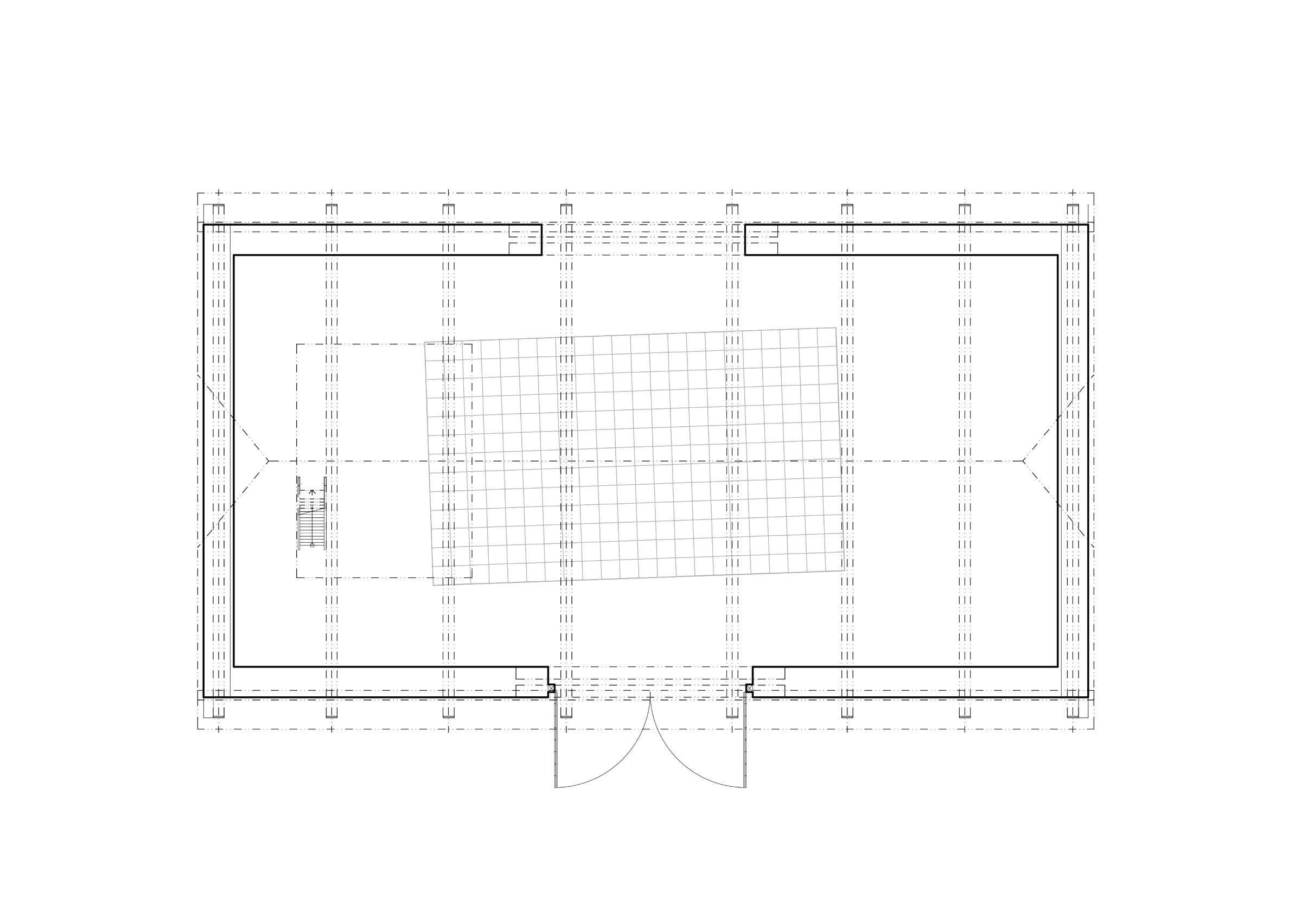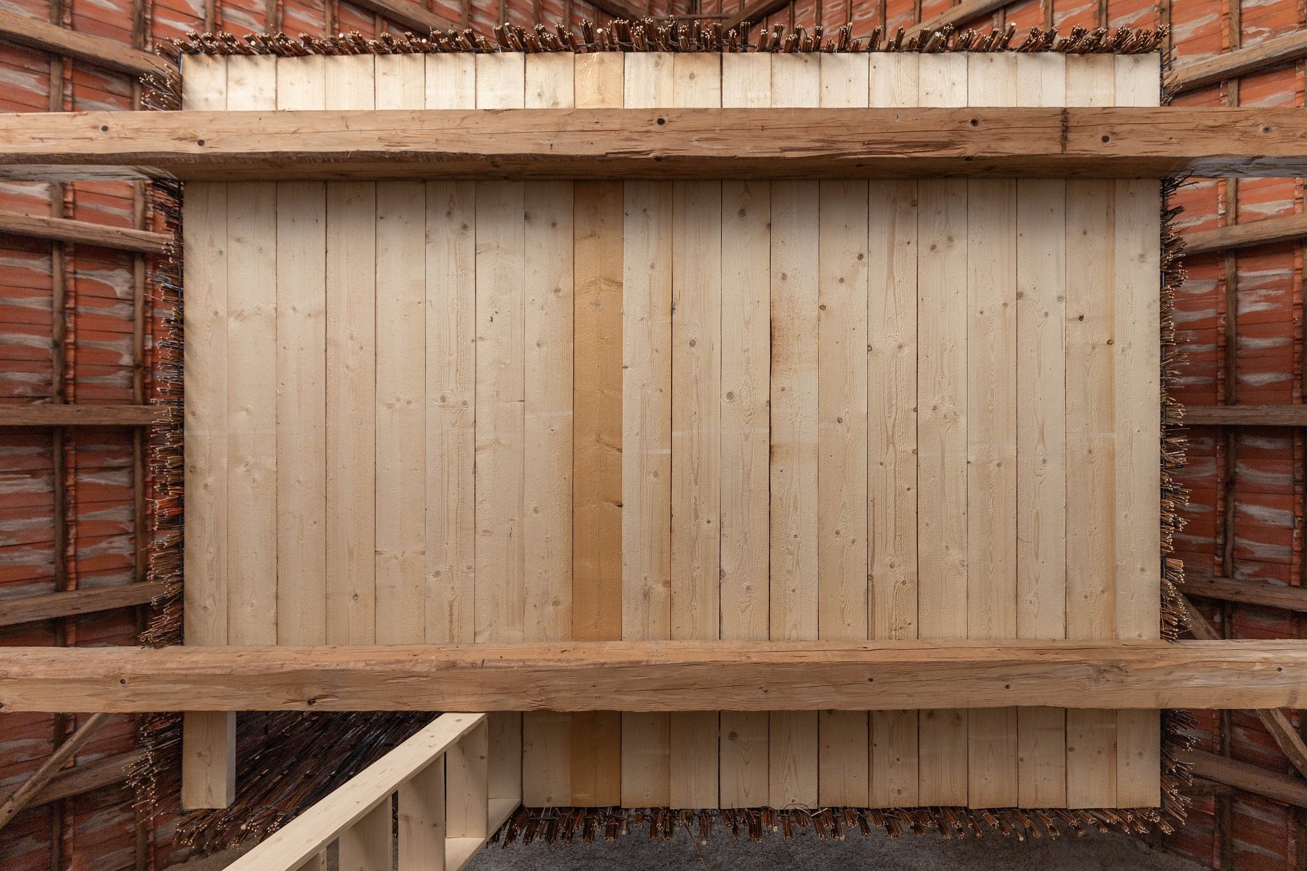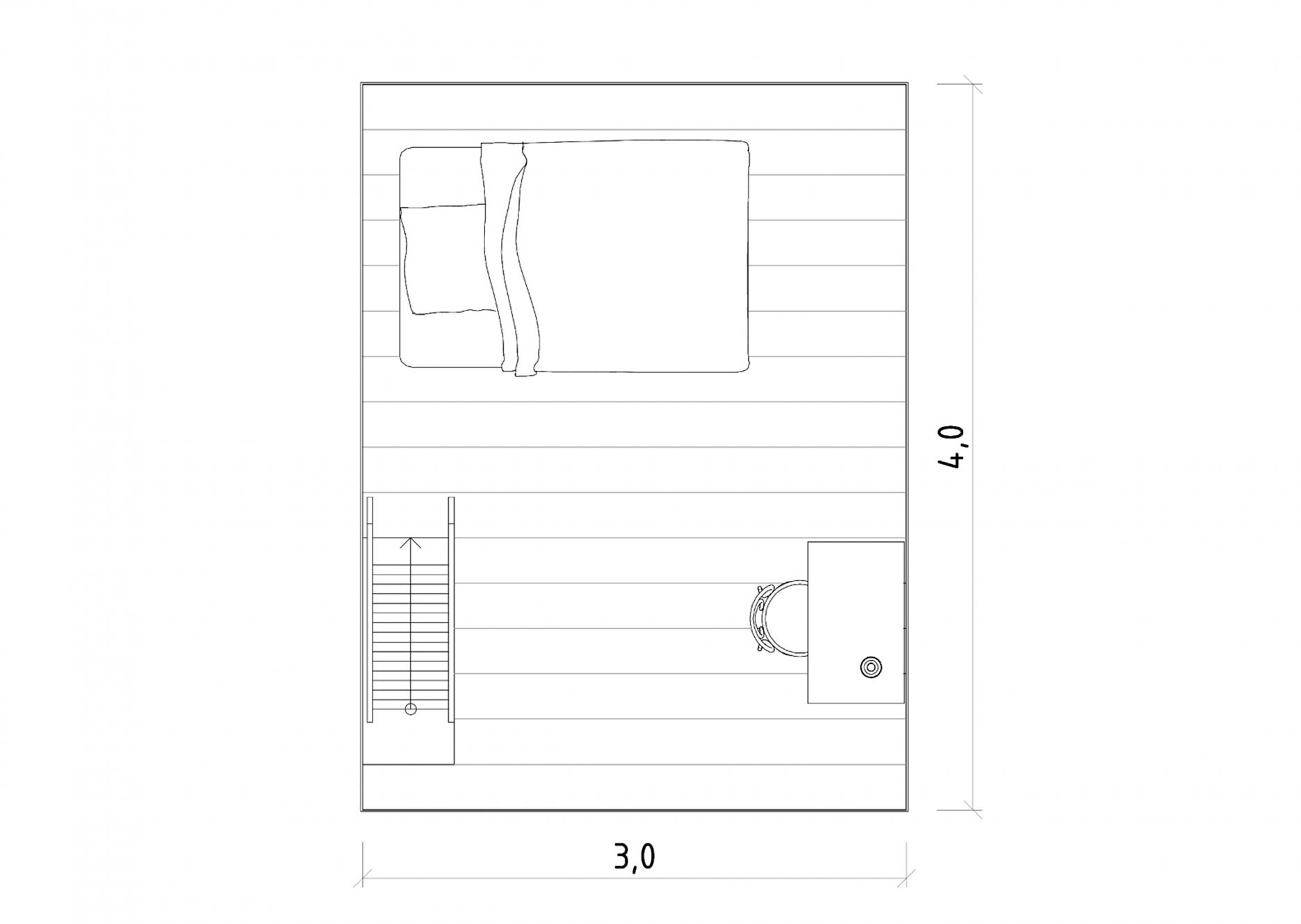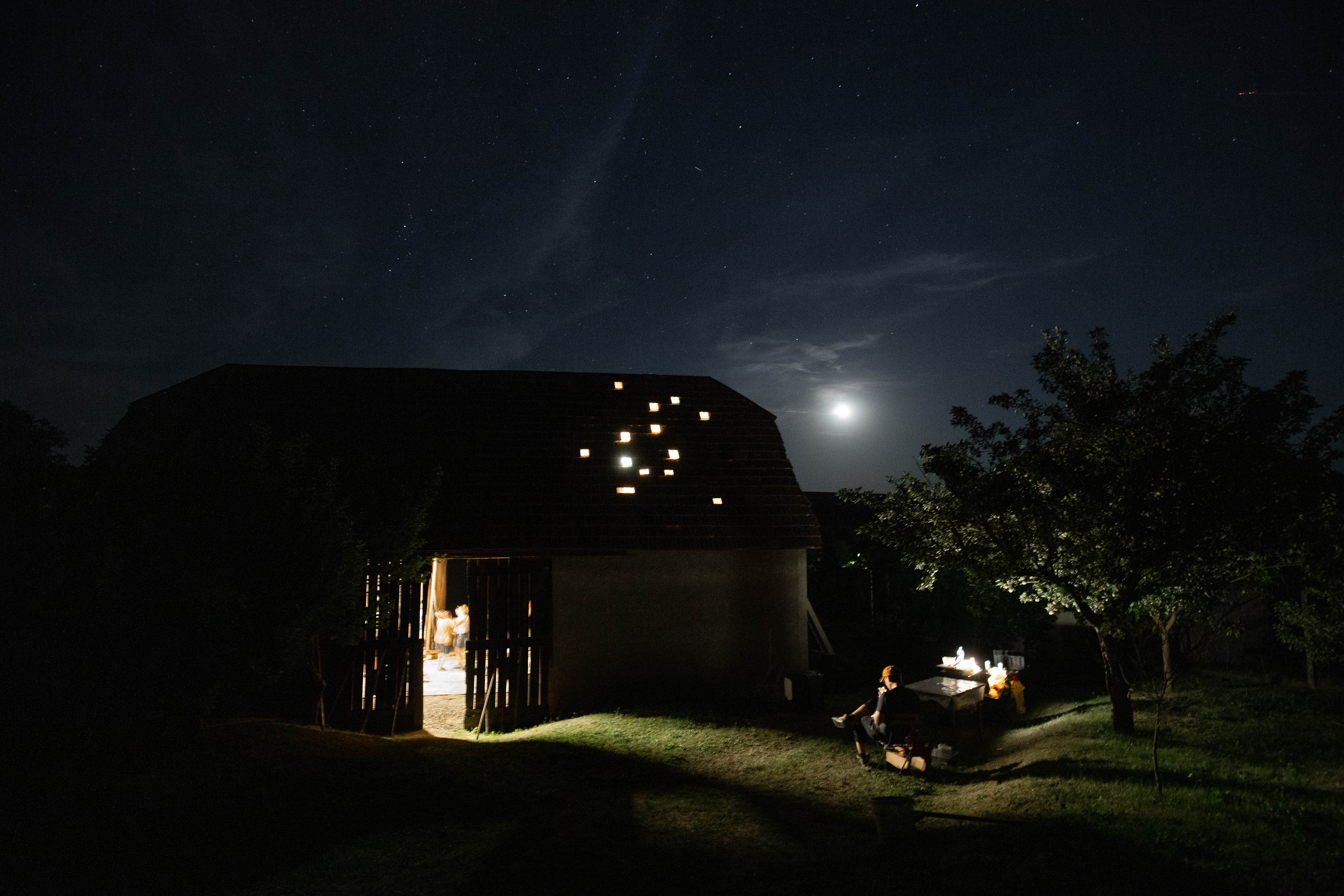 Zadanie vytvoriť v stodole ubytovaciu jednotku prirodzene smerovalo do podkrovnej časti objektu. Vzhľadom na veľkorysosť a ucelenosť priestoru eliminujeme spojenie s pôvodnými konštrukciami na minimum, aby sme zachovali vzdušnosť priestoru. Predkladáme striedmy návrh ubytovacej jednotky s pôdorysom 3 x 4 m. 12 m² box pre ubytovanie umelca pustovníka uložený na dvoch trámoch, prístupný rebríkom položeným mimo centrálnej časti. Pre potreby maximálnej vzdušnosti a oddelenia od strechy a zároveň dosiahnutie dostatočnej svetlej výšky tvoríme miestnosť preklenutú valbovou klenbou kopírujúcou sklon strechy a blížiacou sa ku vodorovným klieštinám. Klenba stavby bola tiež inšpirovaná jaskynnými klenbami, v ktorých často pustovníci nachádzali svoje útočisko. Zariadenie je čisto utilitárne – matrac/posteľ, stôl a stolička.