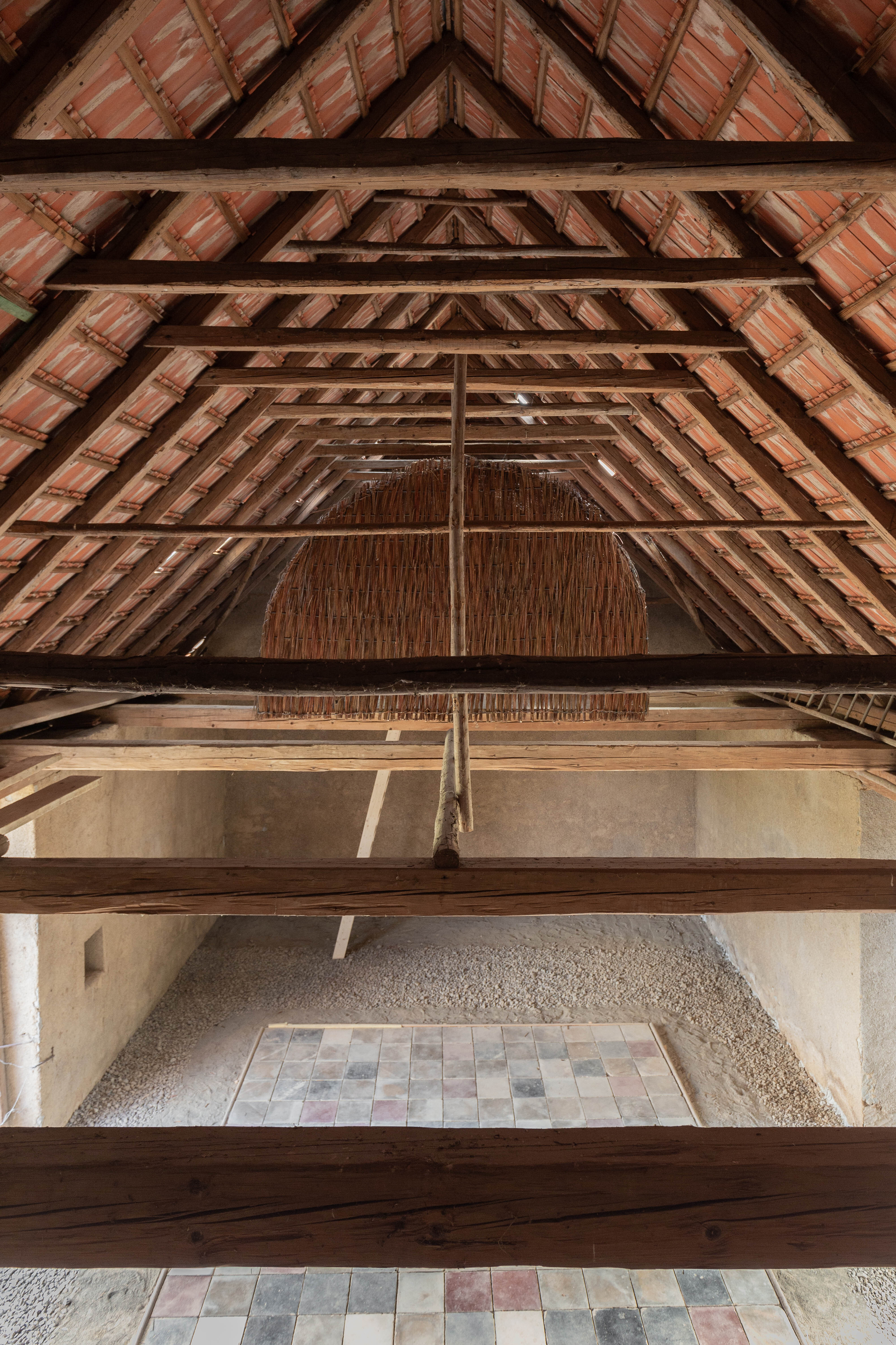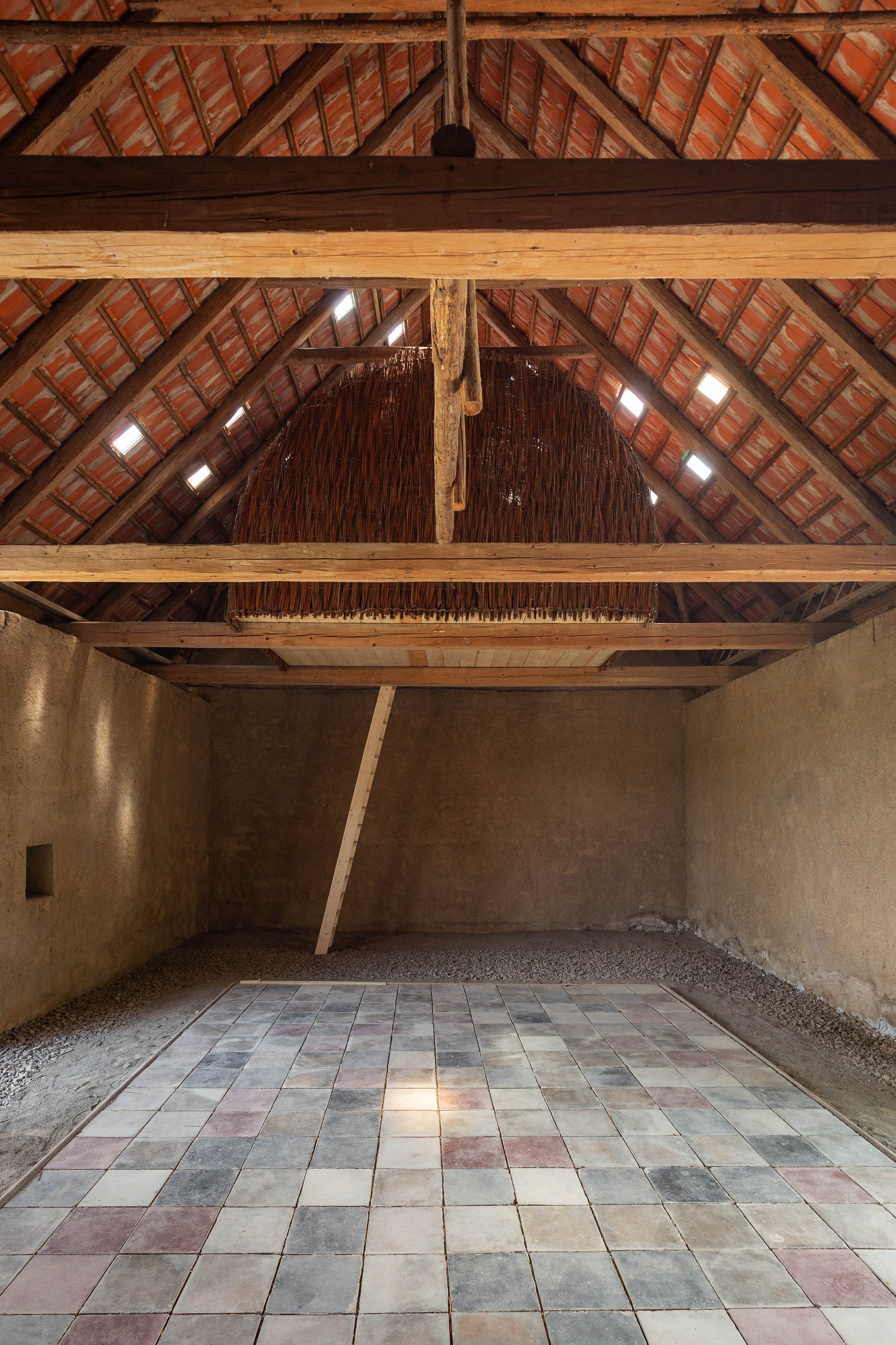 Veľkorysý vnútorný priestor stodoly, ktorá v minulosti slúžila aj na sušenie tabaku, poskytuje dostatočnú plochu pre bývanie, tvorbu rezidenta a prezentáciu umenia miestnej komunite. Aj napriek tomu, že stodola tvorí vizuálne jeden ucelený priestor, môžeme ju funkčne členiť na dva samostatné celky – kvadratický priestor prízemia jasne definovaný stenami a priestor podkrovia pod sedlovou strechou, odčlenený od prízemia riedko uloženými masívnymi väznými trámami. Toto rozčlenenie priestoru podporuje dočasná priestorová inštalácia Podlaha – vytvorená zo starej dlažby spred rekonštrukcie miestneho kostola.