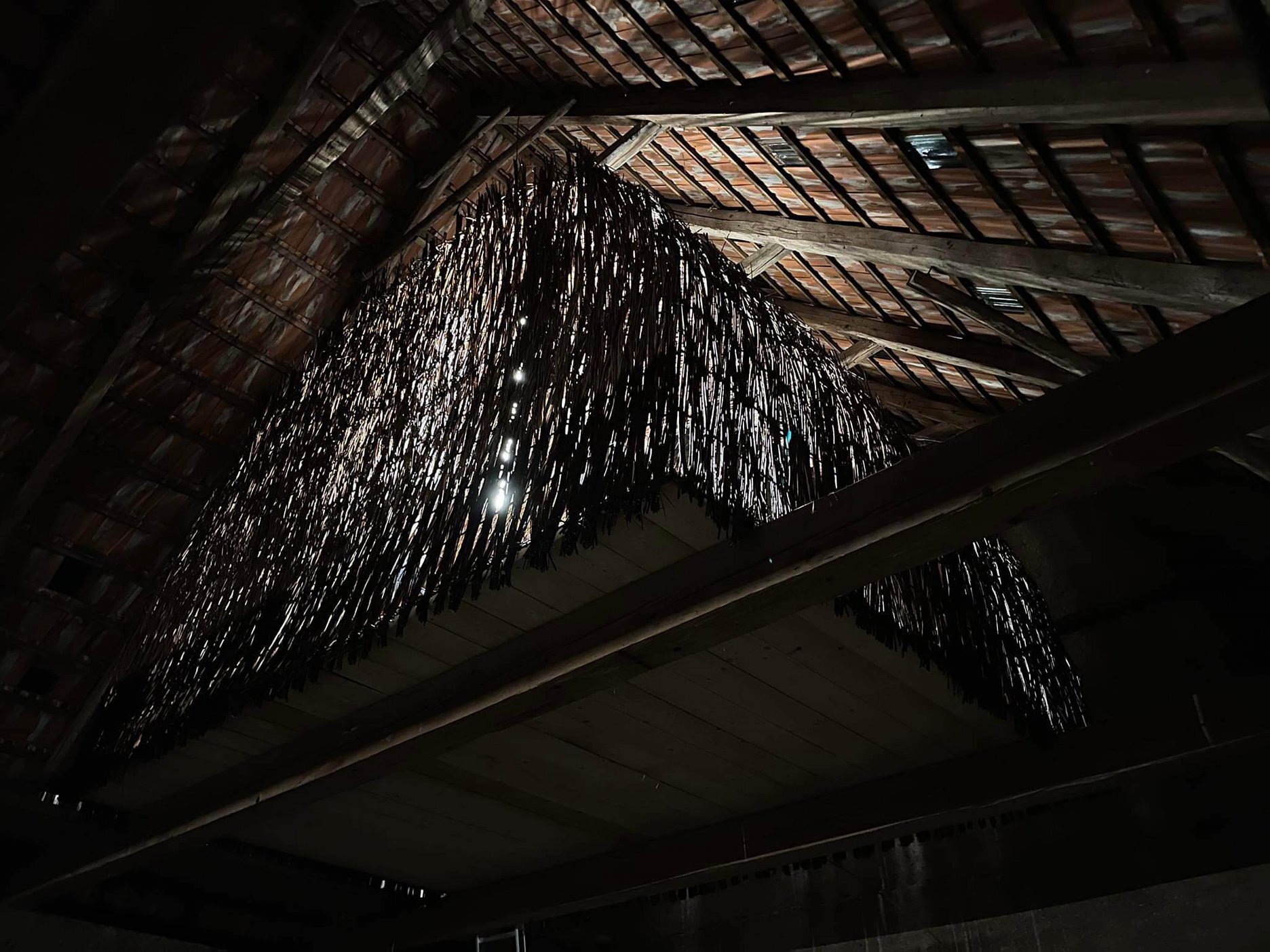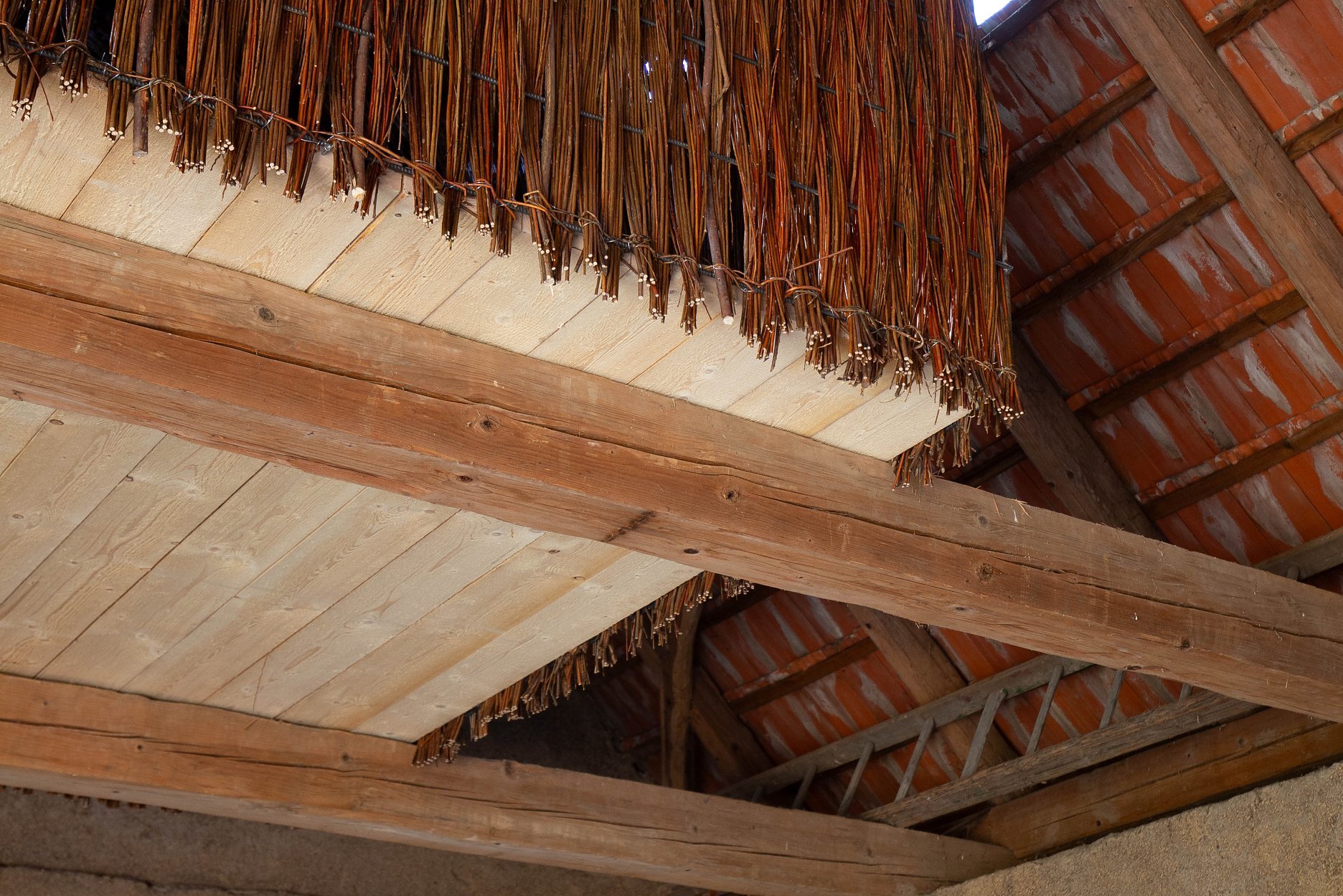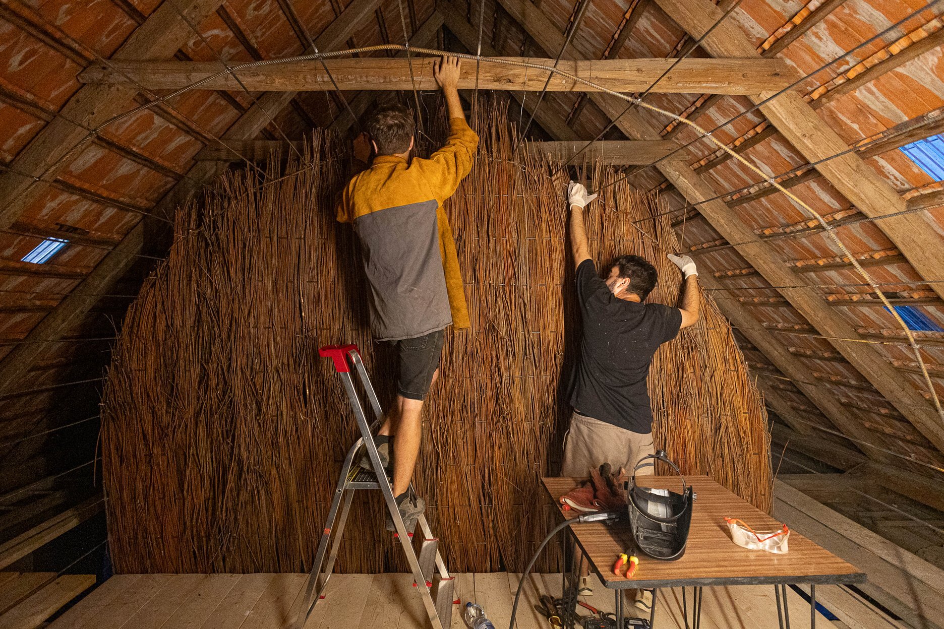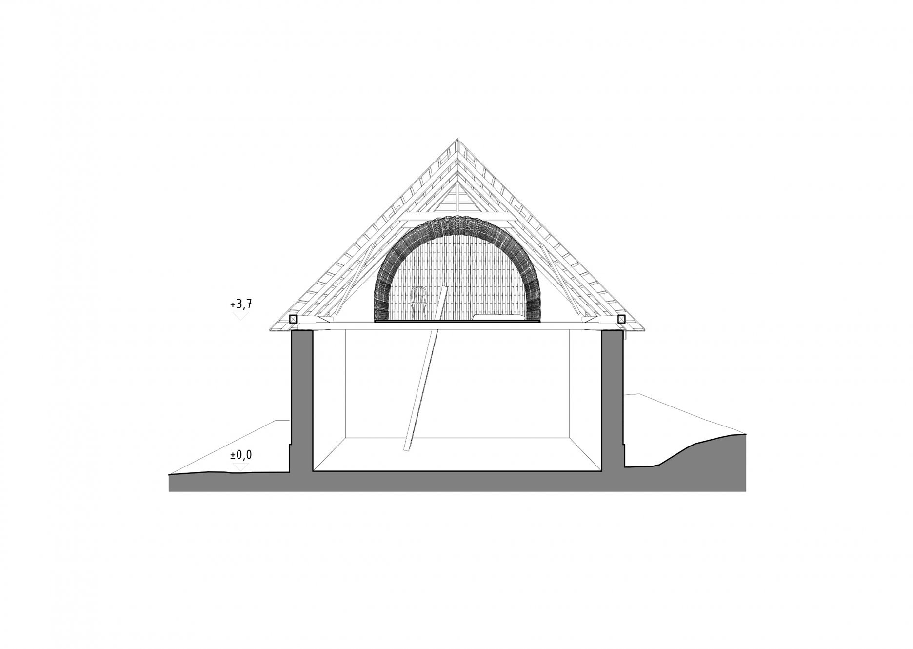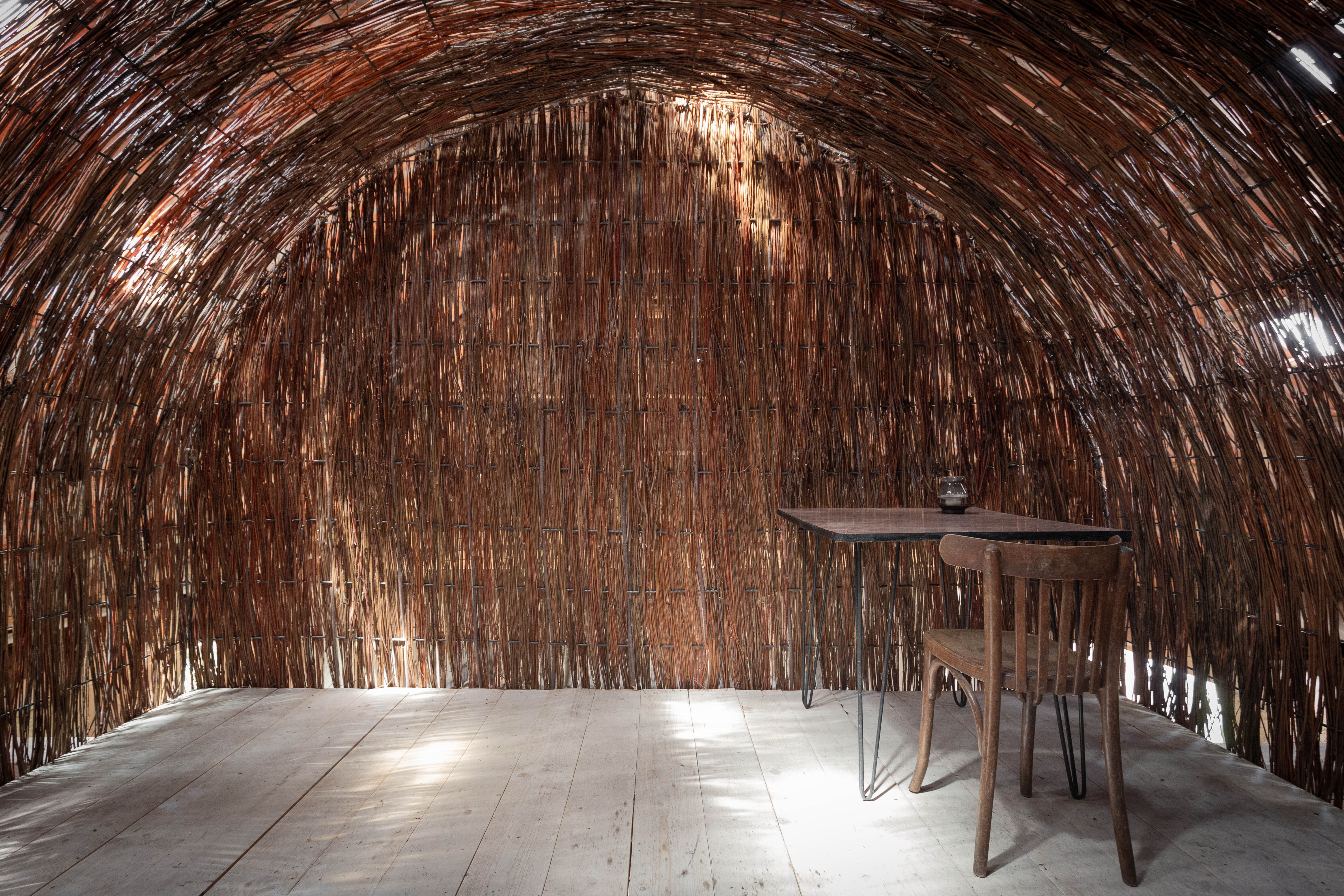 Ako hlavný formujúci materiál objektu sme zvolili vŕbové prútie. Materiál typický pre košikárov, často však využívaný aj v ľudovom staviteľstve na menšie objekty a špecifické situácie. Obec Hontianske Trsťany bola kedysi oblasť s močiarmi, tŕstím. Patrón košikárov je svätý Anton Pustovník. Materiál prútia nám poskytuje dostatočnú flexibilitu, aby sme docielili transparentnosť a kontakt so stodolou a zároveň zabezpečili pocit súkromia a intimity. Na zabezpečenie dostatočného presvetlenia si pomáhame zozbieranými sklenenými škridlami, ktoré umiestňujeme náhodne nad objekt, aby sme docielili maximálne difúzne presvetlenie.