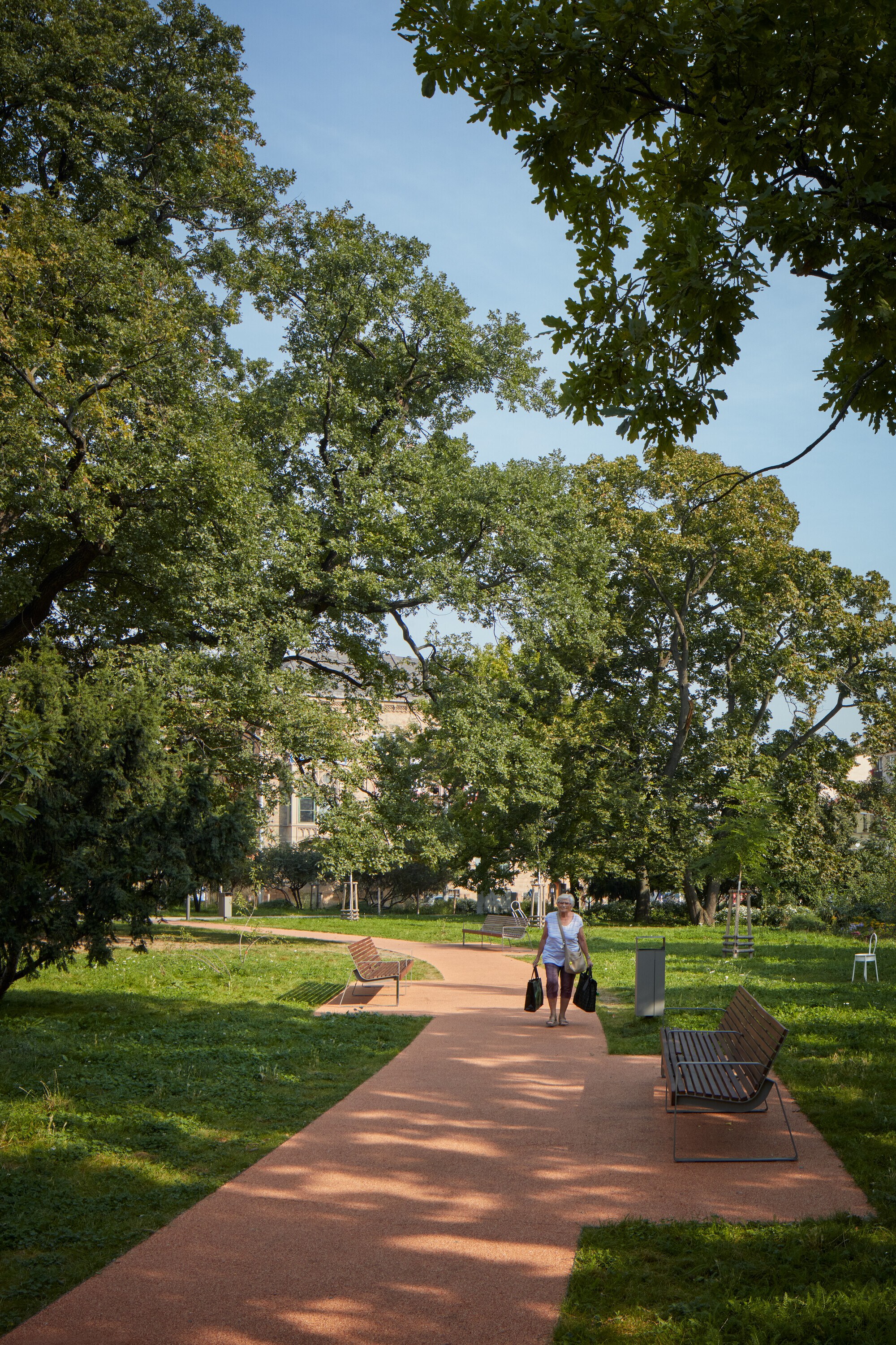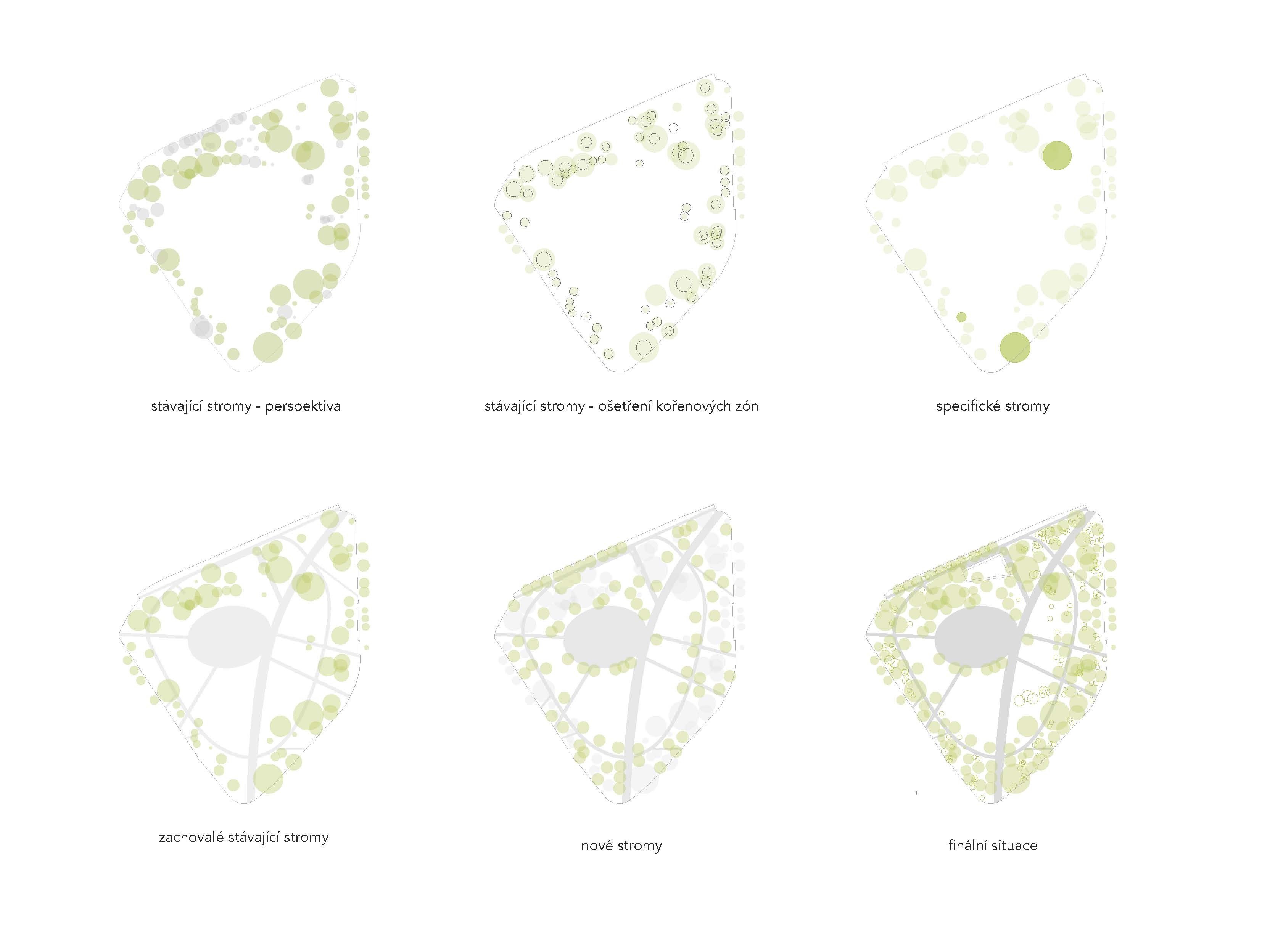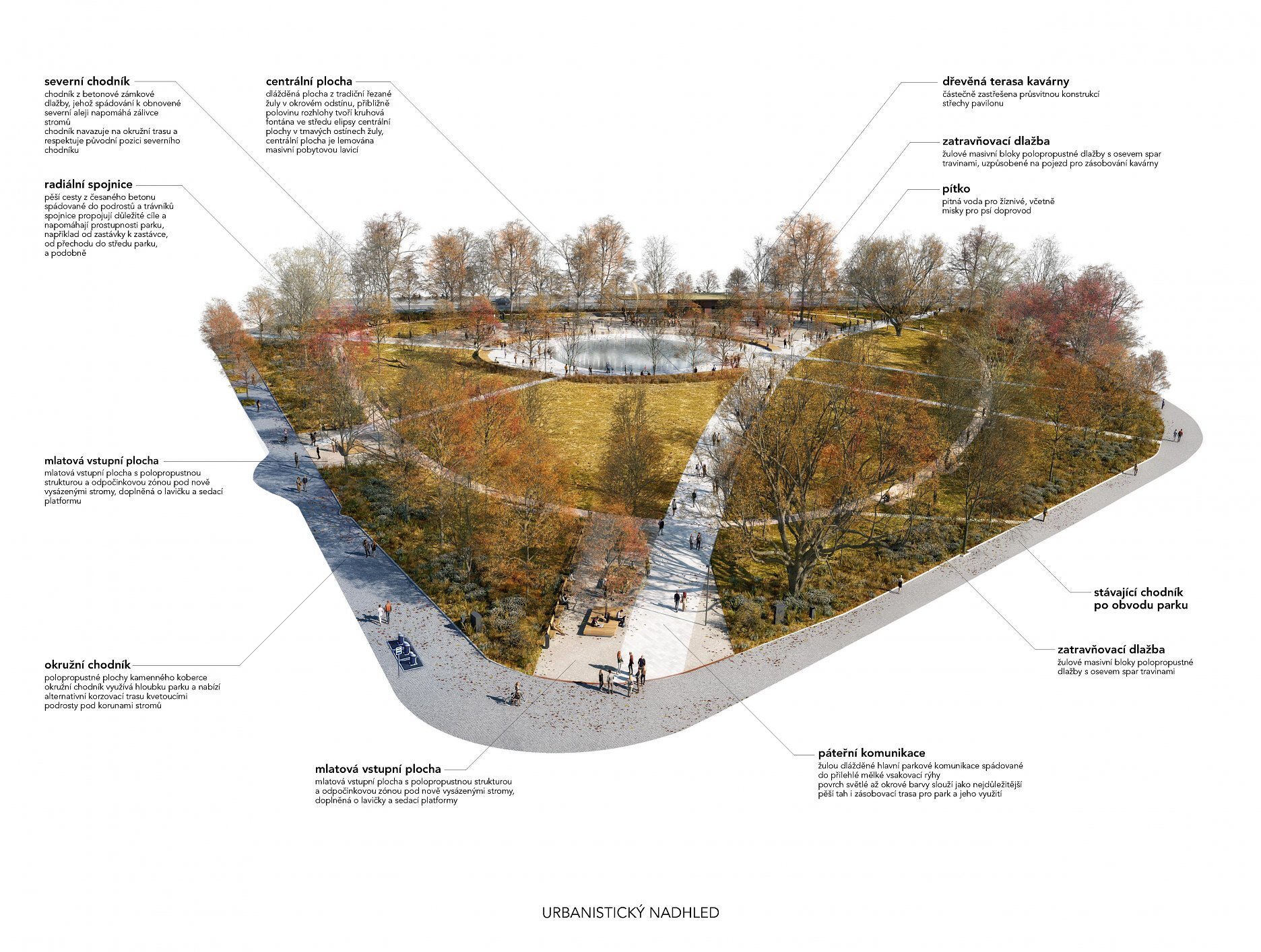 Koncept pracuje s rôznou intenzitou využitia jednotlivých zón. Zodpovedá tomu aj podiel spevnených plôch a prírodných segmentov. Úpravy zelene, realizované na základe dendrologického prieskumu výrazne sprehľadnili priestor v perspektívnej rovine chodcov. Okružná trasa pod korunami mohutných stromov sprístupňuje park v celej jeho hĺbke a necháva vyznieť rôzny charakter prostredia v rámci celej zóny. Architekti doplnili a zintenzívnili zelený prstenec po obvode parku, ktorý tvorí protiváhu k jeho "prázdnemu" ťažisku. Rámec ciest dotvárajú radiálne prepojenia. Ako ťažisko parku slúži centrálna "urban aréna".