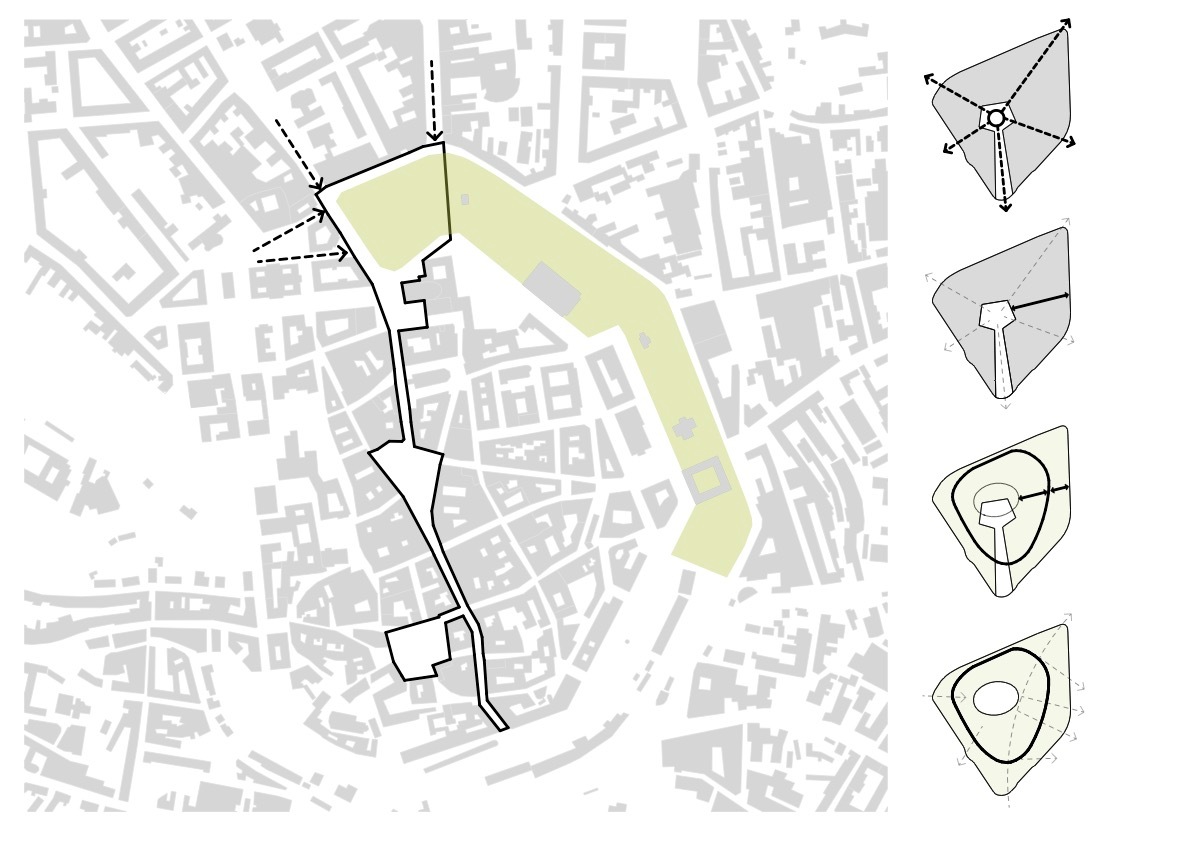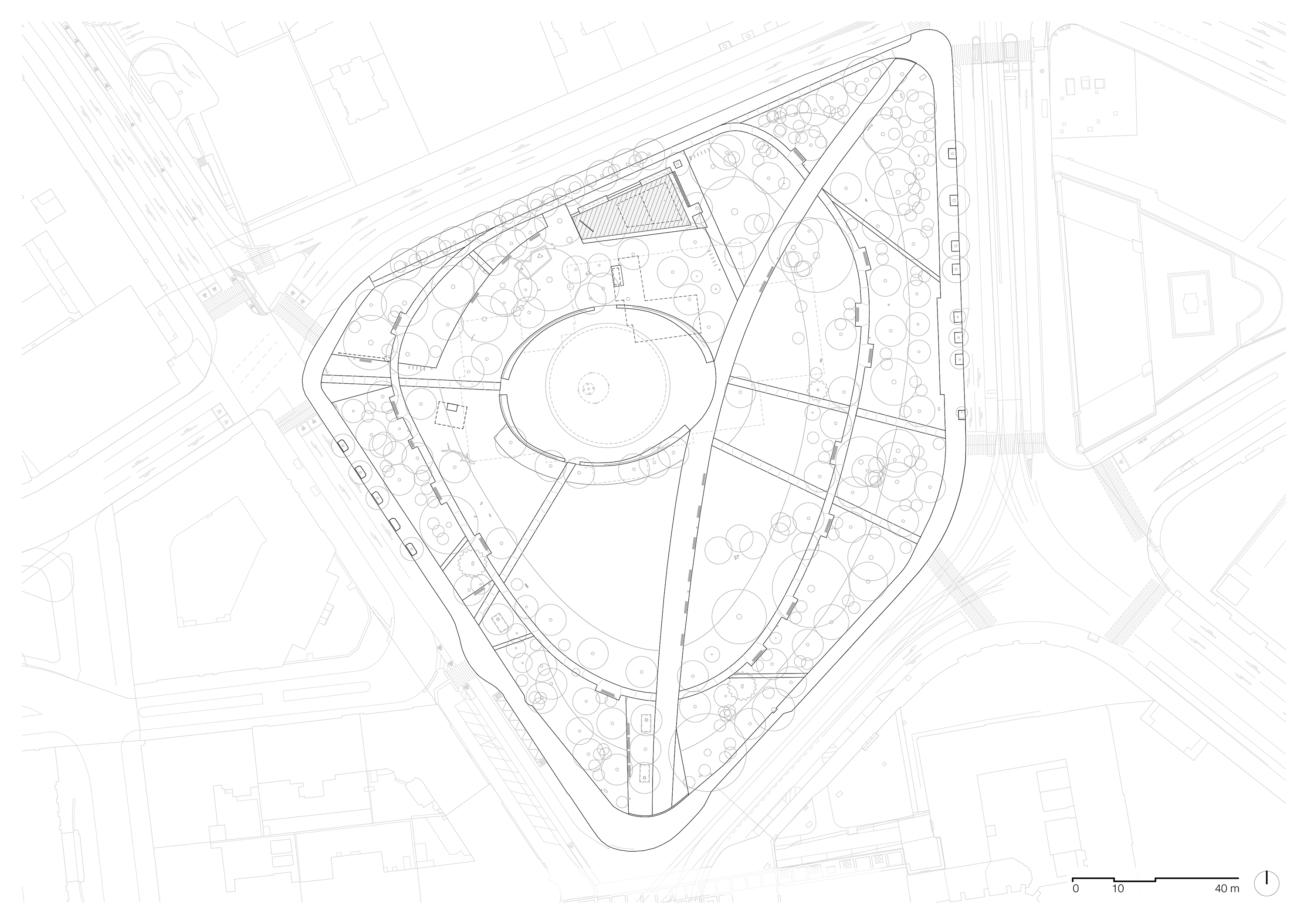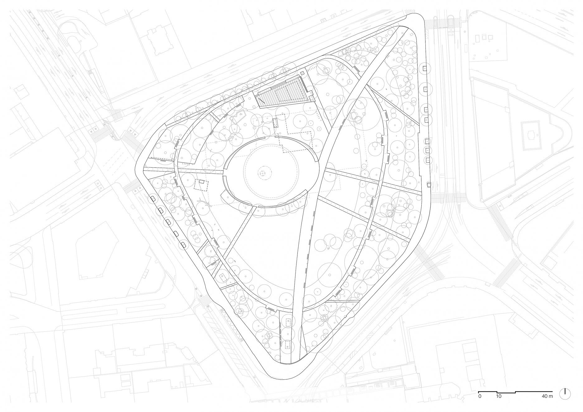 Koncept pracuje s rôznou intenzitou využitia jednotlivých zón. Zodpovedá tomu aj podiel spevnených plôch a prírodných segmentov. Úpravy zelene, realizované na základe dendrologického prieskumu výrazne sprehľadnili priestor v perspektívnej rovine chodcov. Okružná trasa pod korunami mohutných stromov sprístupňuje park v celej jeho hĺbke a necháva vyznieť rôzny charakter prostredia v rámci celej zóny. Architekti doplnili a zintenzívnili zelený prstenec po obvode parku, ktorý tvorí protiváhu k jeho "prázdnemu" ťažisku. Rámec ciest dotvárajú radiálne prepojenia. Ako ťažisko parku slúži centrálna "urban aréna".