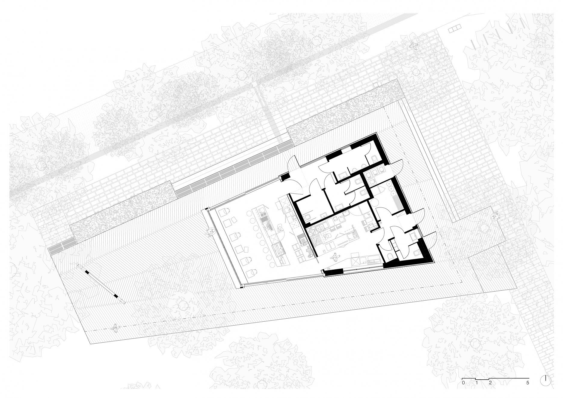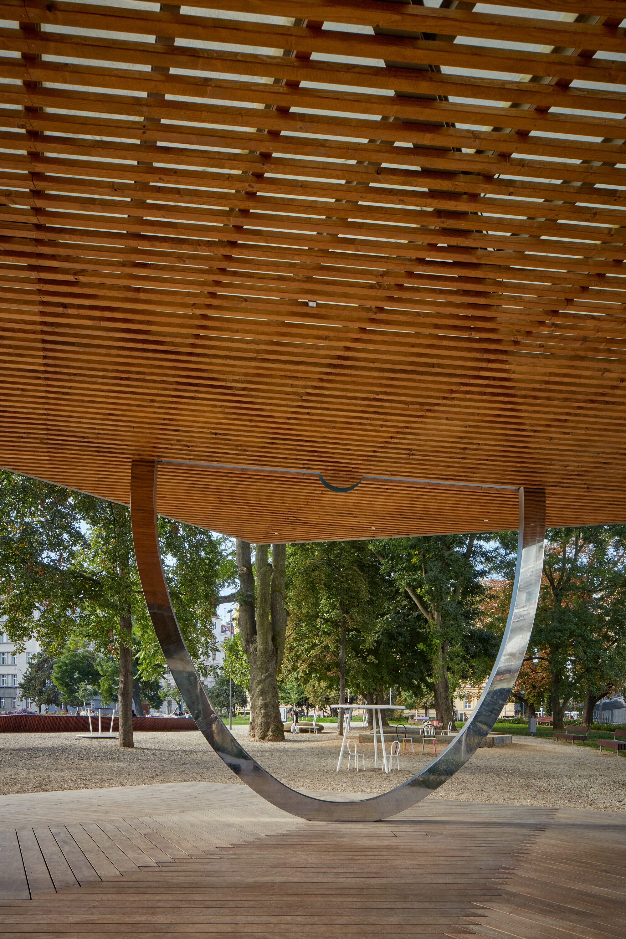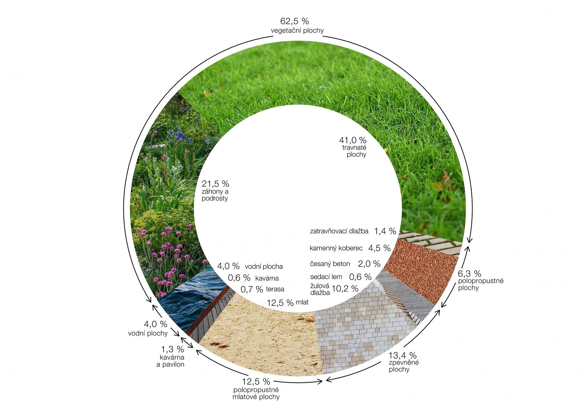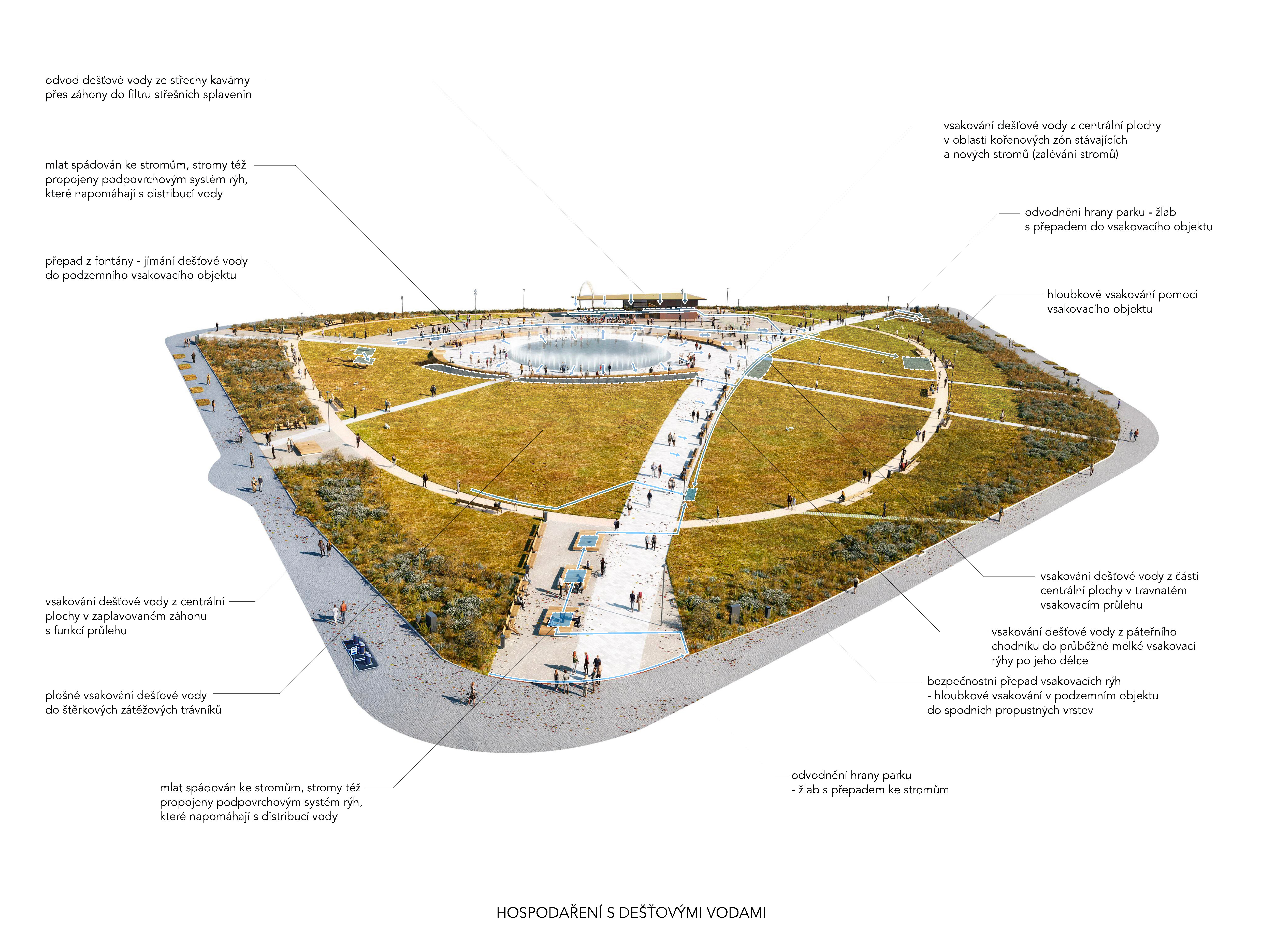 "Zvláštní pozornost věnujeme jednotlivým hranám. Kavárna je hranicí a zároveň spojovacím prvkem. Lem tvoří bylinné patro, keře a stromy. Vzniká tak chráněný jasně definovaný environmentální rámec s dobrými podmínkami pro rozvoj plnohodnotného přírodního společenstva. Záhon s modelací prohlubní a vyvýšenin (bultů a šlenků) je inspirovaný přirozenými procesy periodicky zaplavovaných biotopů - hrůd v terénu lužních krajin Moravy. Tři typy stanovišť respektující hydrické podmínky - sníženiny, vyvýšeniny a přechodová zóna. Obdobně je vodou dotovaný záhon z trav a kapradin u kavárny" dopĺňajú na záver autori.