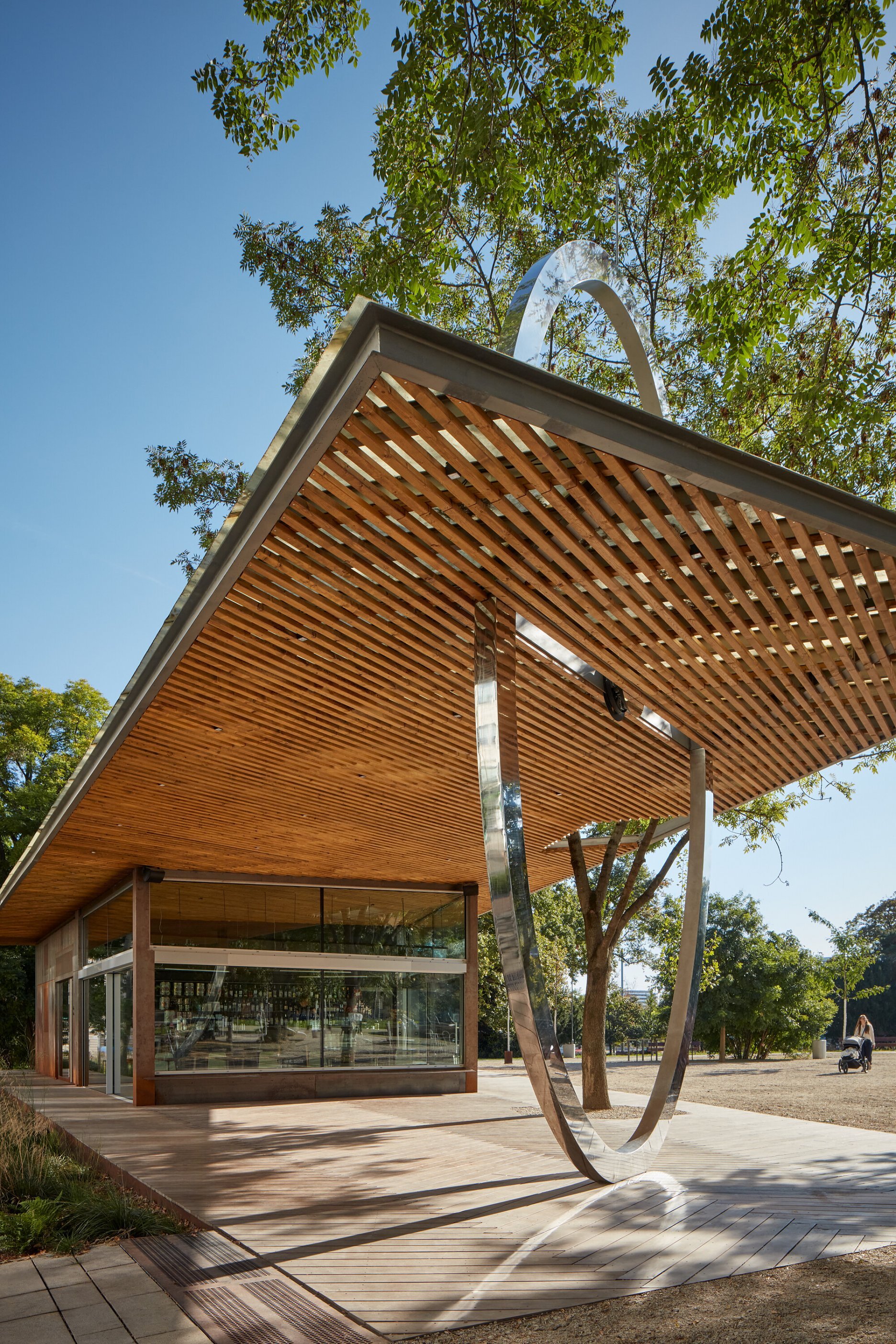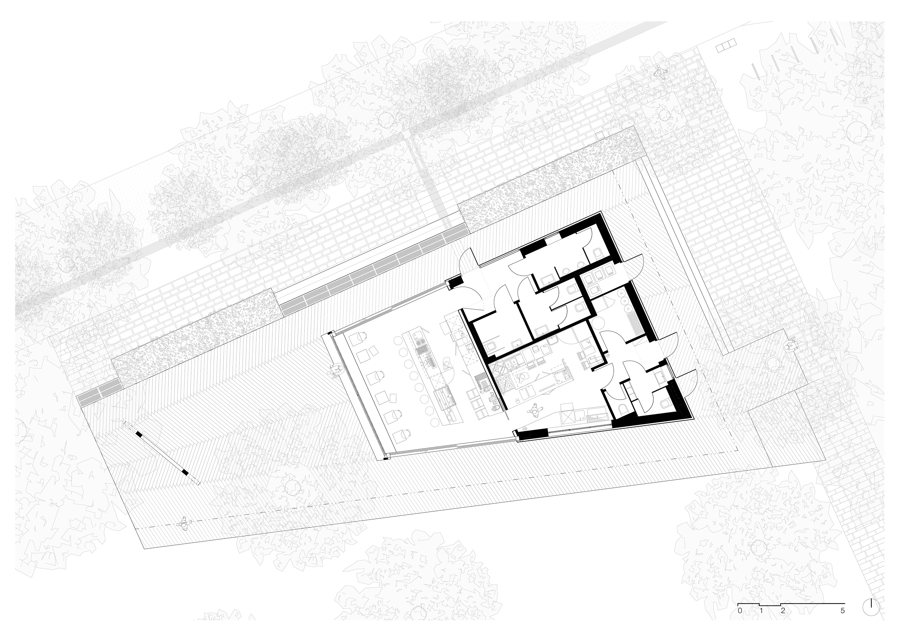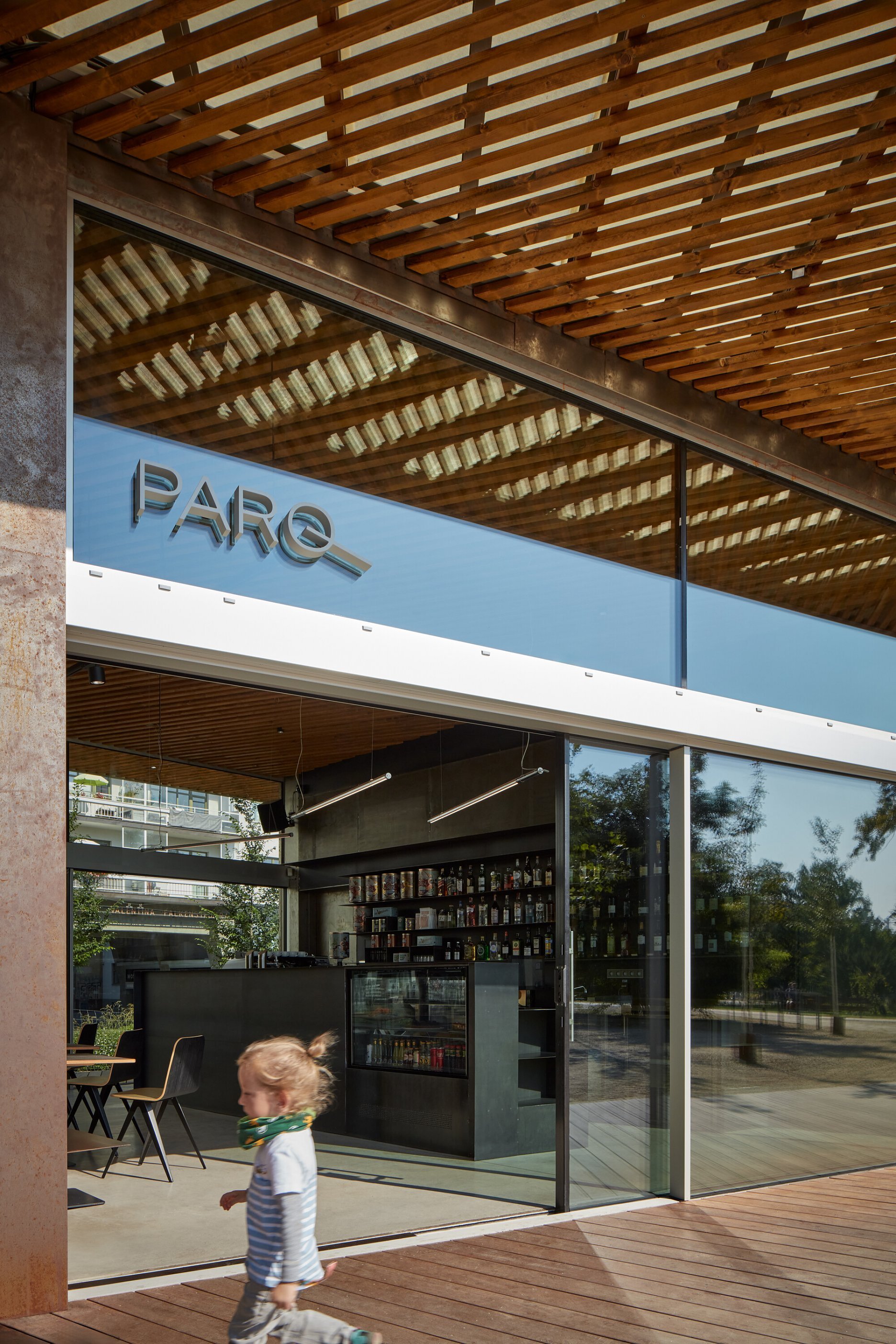 Na pohľadovej osi z Rašínovej ulice je situovaná kaviareň s detským ihriskom. Svojou južnou orientáciou využíva výhľad na celý park a panorámu mesta s Kostolom sv. Tomáša.