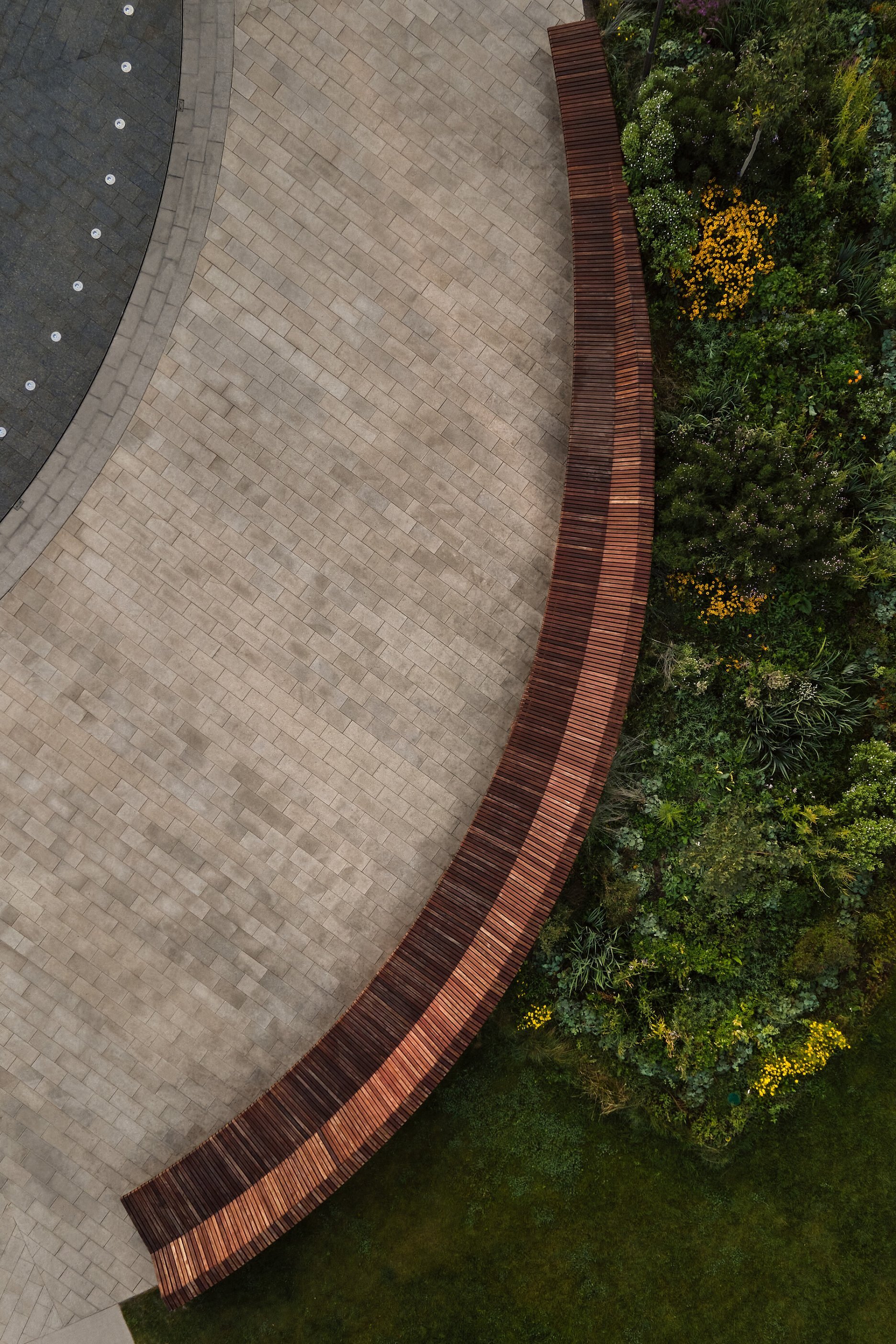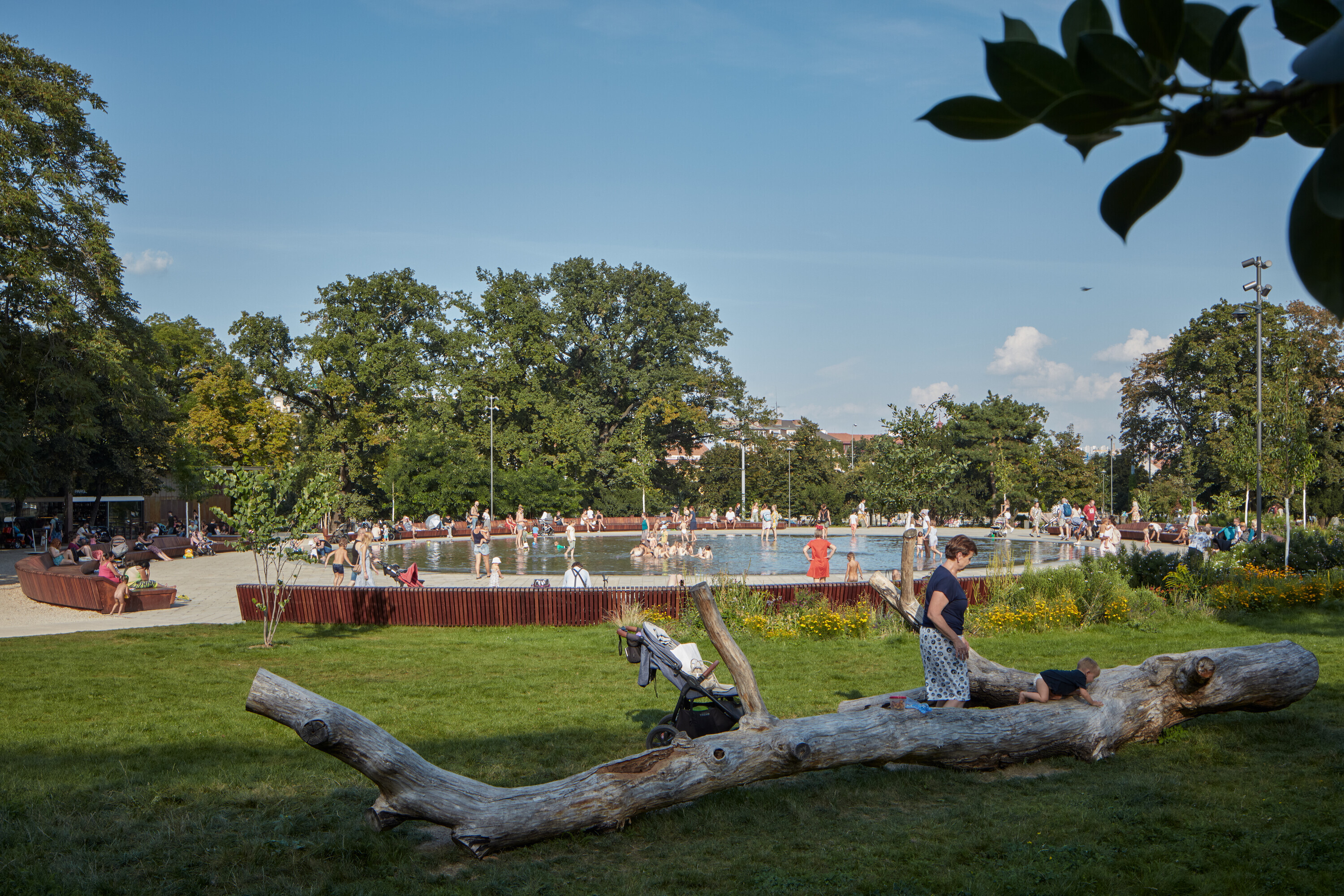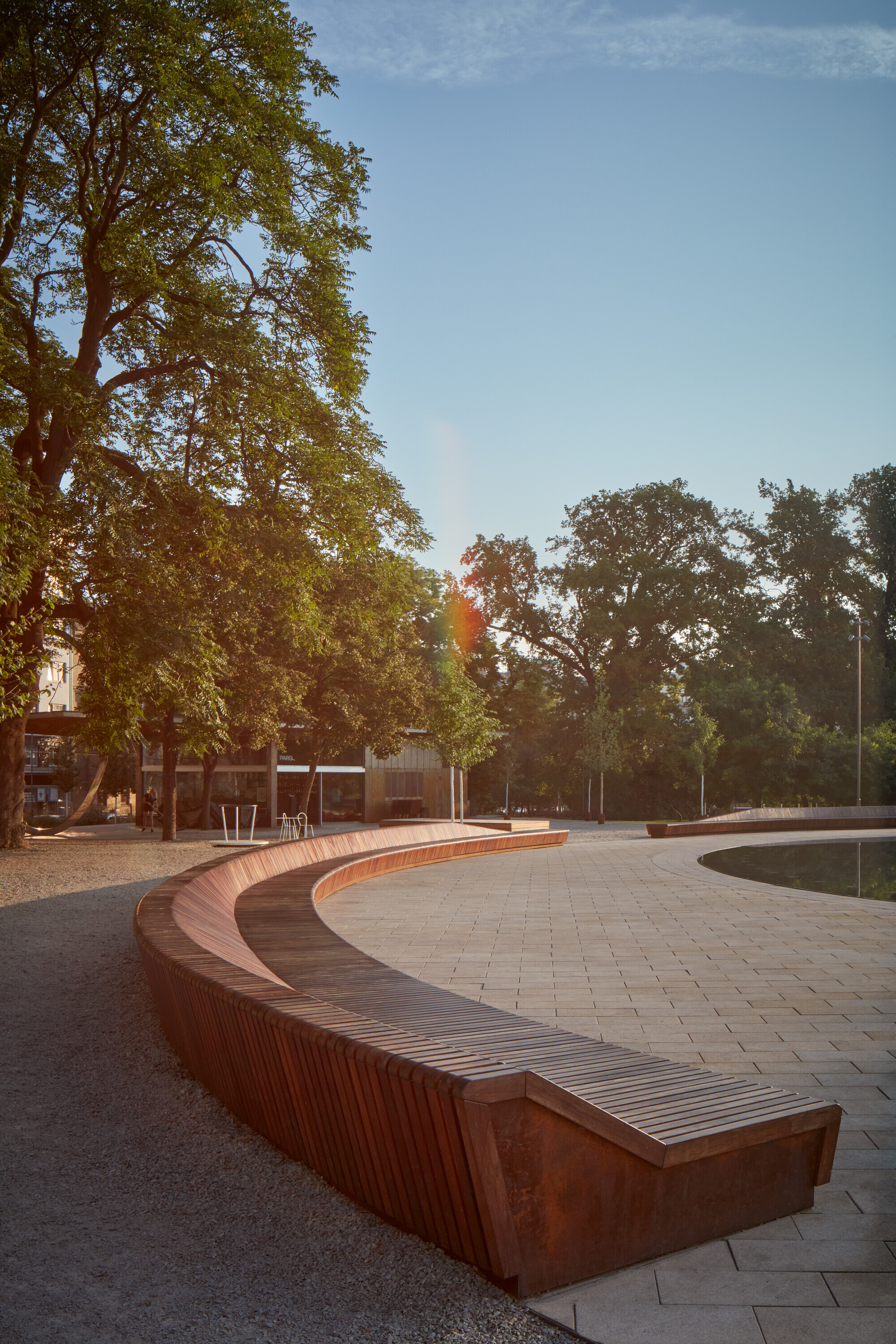 Spoločnosť mmcité realizovala v spolupráci s architektmi atypické organicky tvarované sedenie po obvode vodnej plochy. Lavičky s celkovou dĺžkou 120 m, vážiace celkom 18,5 tony dopĺňajú v parku viaceré prvky typového mobiliáru mmcité.