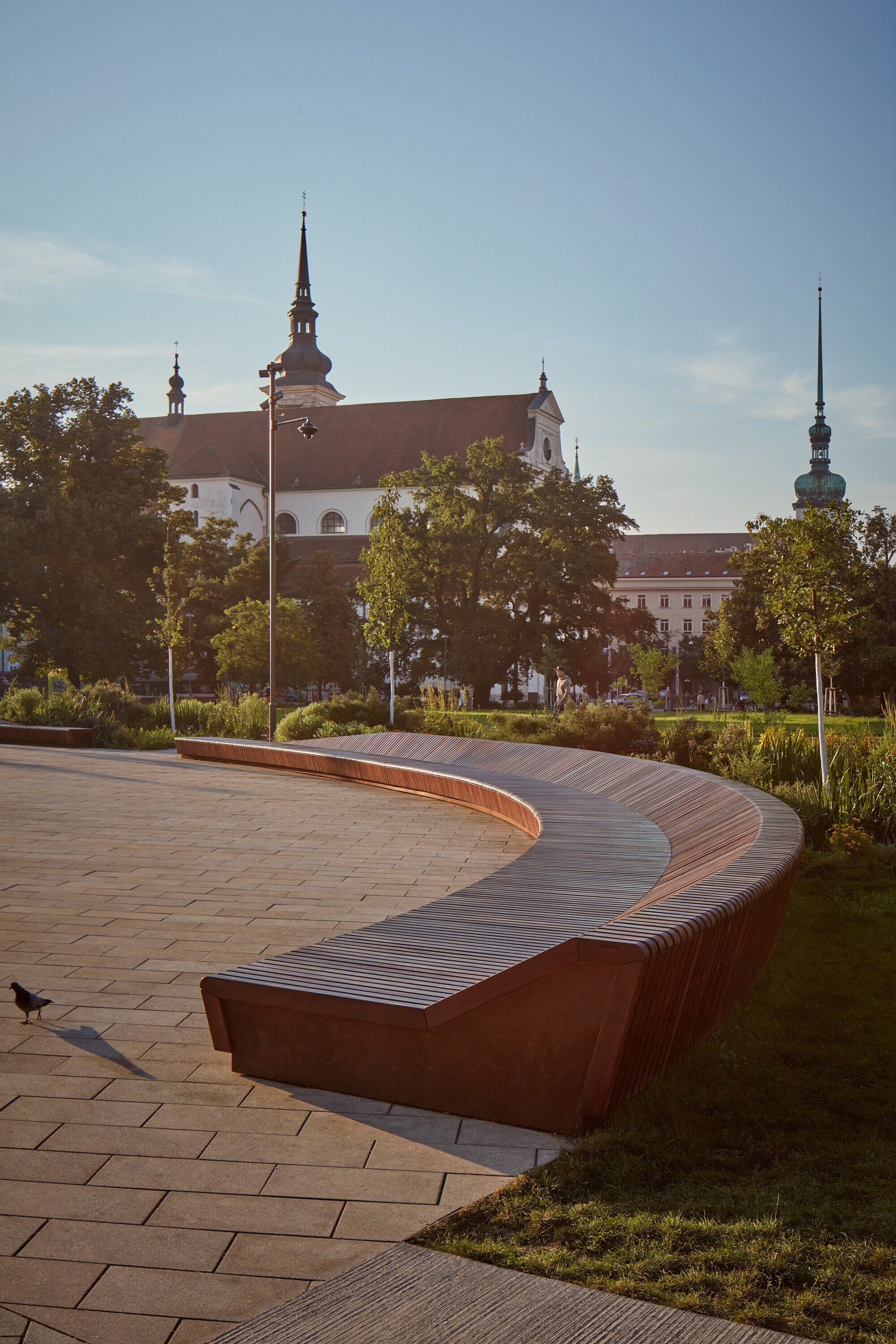 Moravské námestie sa nachádza na rozhraní hutného mestského centra a parkovej "ringstrasse". Urbanisticko-architektonický koncept s centrálnym multifunkčným priestorom, ktorý autori nazývajú "urban arena", potvrdzujeme status Moravského námestia ako parku. Hlavné javisko v podobe vodnej plochy obkolesujú organické línie lavíc z dielne mmcité. V lete plytké brodisko s hmlovými tryskami využívajú obyvatelia moravskej metropoly podobne ako bratislavčania bazéniky pod "lipovým kvetom" na námestí SNP. V zime sa plocha mení na klzisko.