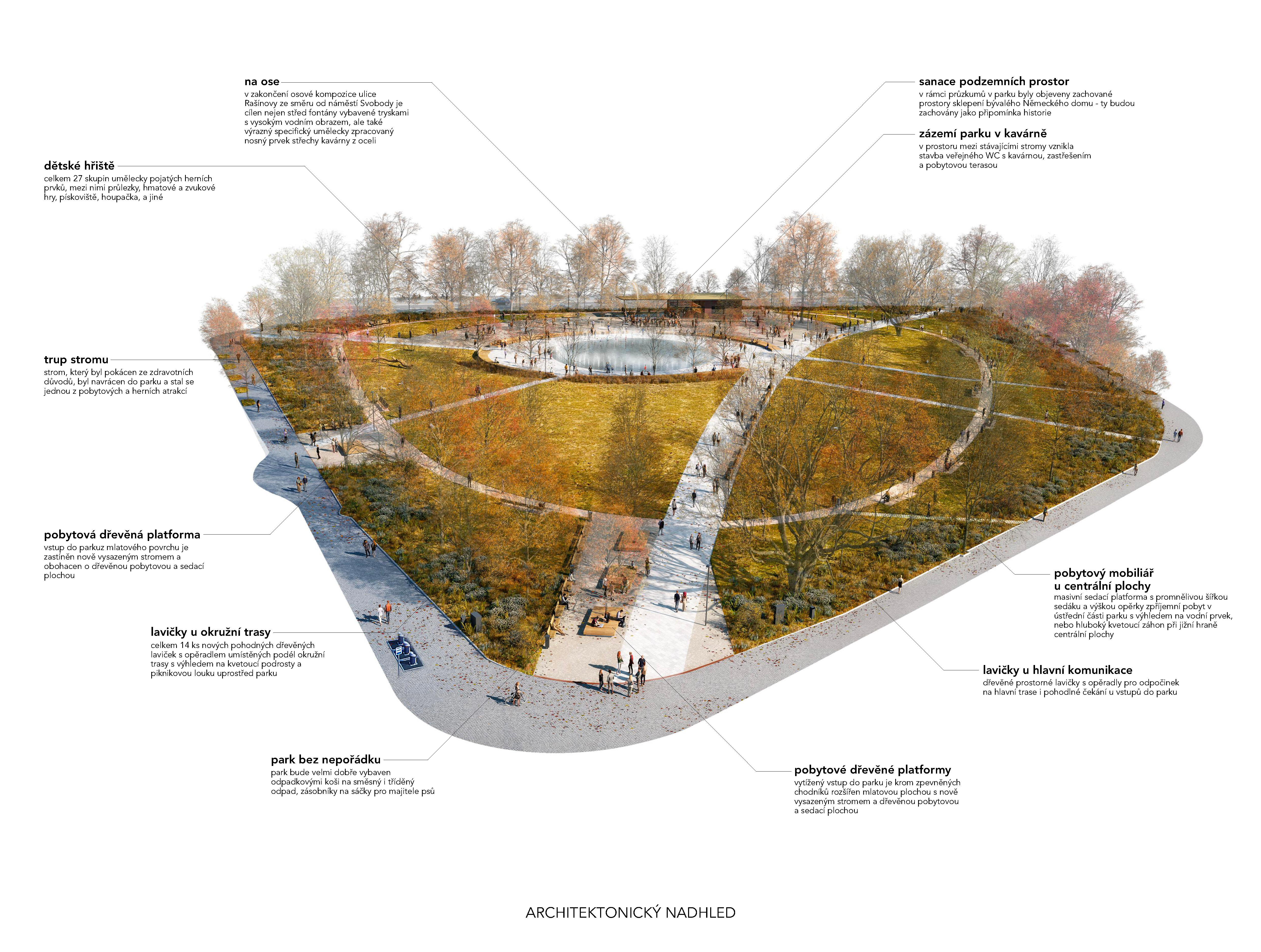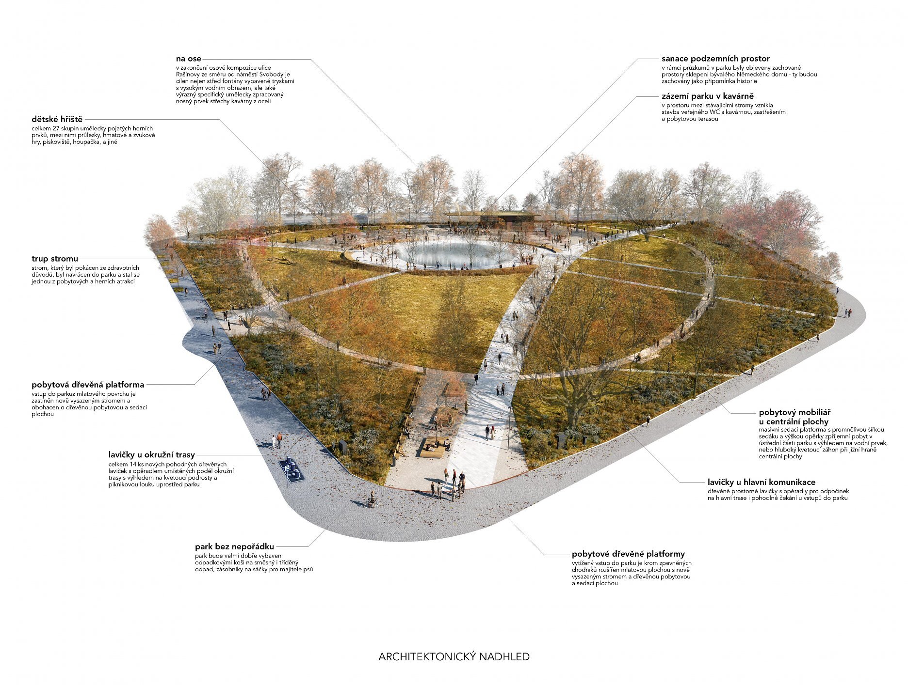 Podstatou zadania bolo navrhnúť park ako rekreačnú a oddychovú plochu pre obyvateľov mesta. Po dopracovaní štúdie bola v roku 2019 prizvaná do kolektívu krajinná architektka Klára Zahradníčková, ktorá so svojim tímom stojí za finálnou podobou vegetačných úprav. Projekt výrazne sprehľadnil pôvodnú členitú priestorovú štruktúru. Za krátky čas preukázal svoju životaschopnosť a stal sa celoročne obľúbeným miestom stretnutí a trávenia voľného času.