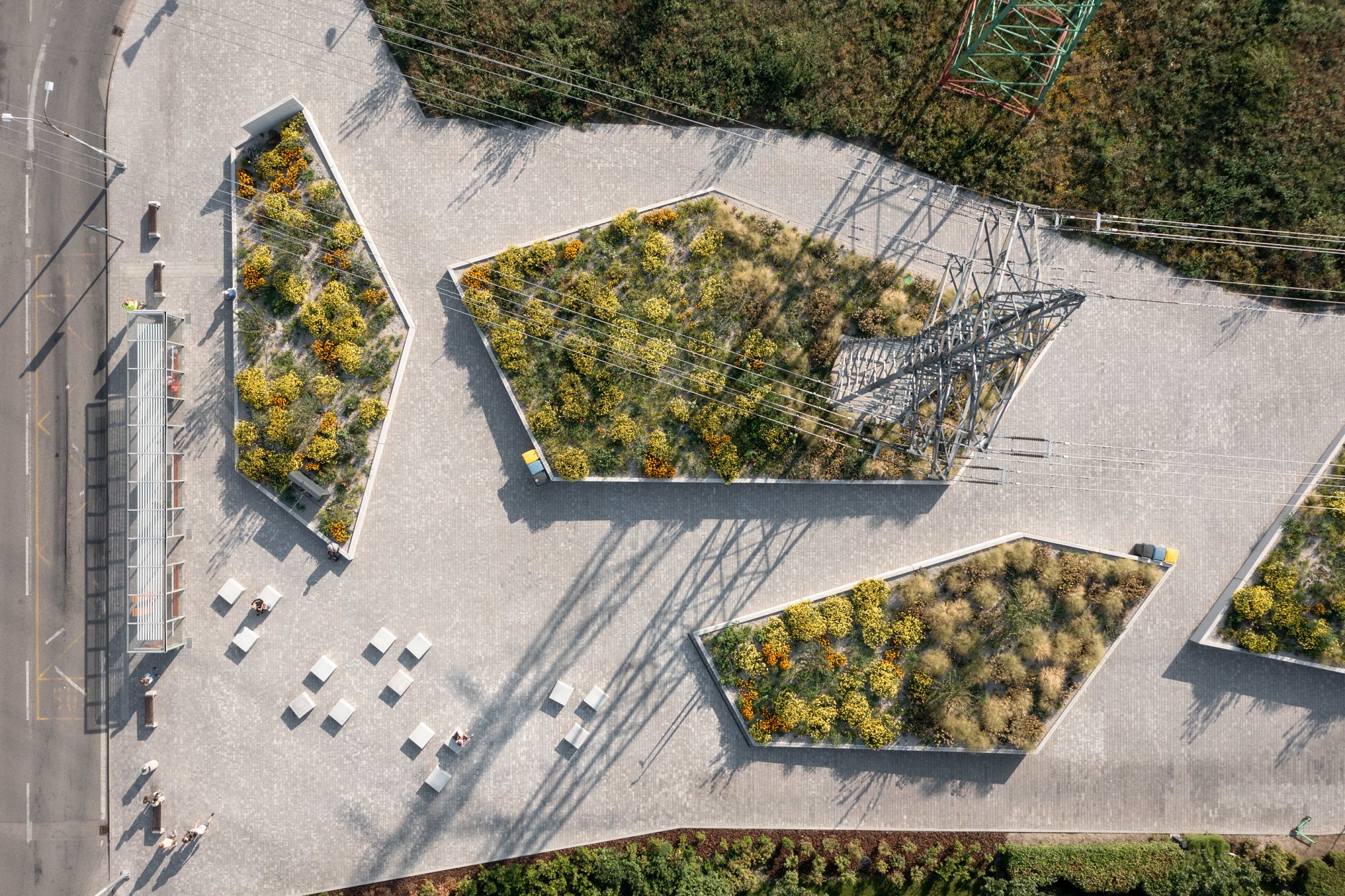 Delenie parku vzniklo analýzou pešieho pohybu. Aj vďaka vyšliapaným cestičkám a skratkám na pôvodnom nevyužívanom teréne s rozlohou 5 tisíc štvorcových metrov je aj dnešný park doménou chodcov a ich prirodzeného pohybu od prechodov a chodníkov alebo zastávok MHD. Pôvodný návrh počítal aj s novým dizajnom samotných zastávok alebo skôr veľkorysých pavilónov a prestrešení, ktoré mali slúžiť aj ako brány alebo lieviky pozývajúce objavovať rôzne zelené zákutia. Polygonálne ostrovy zelene vytvárajú rôzne typy komfortných, pozalamovaných prechodov, ktoré ústia do menších námestí slúžiacich na neformálne stretávanie sa, malé eventy či predaj kávy, aby sa v okolí najvyťaženejšej zastávky jedno z nich, mimo ochranného pásma elektrického vedenia s prísnymi reštrikciami, premenilo na oddychovú časť. Rozsypané betónové kvádre sú tak rozšírením zastávky, no rovnako aj potvrdením funkcie parku.