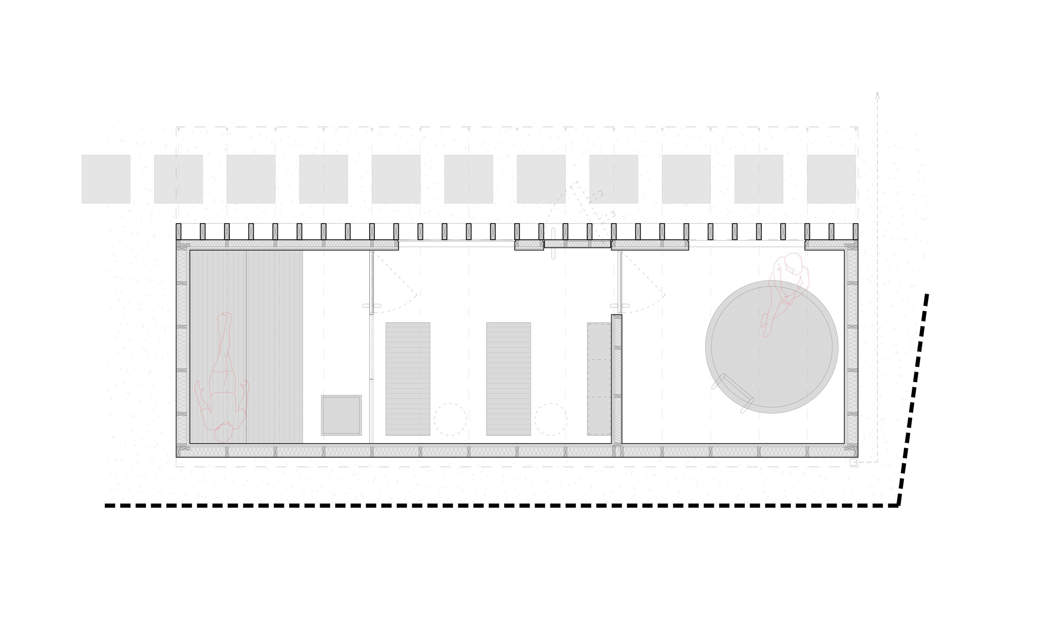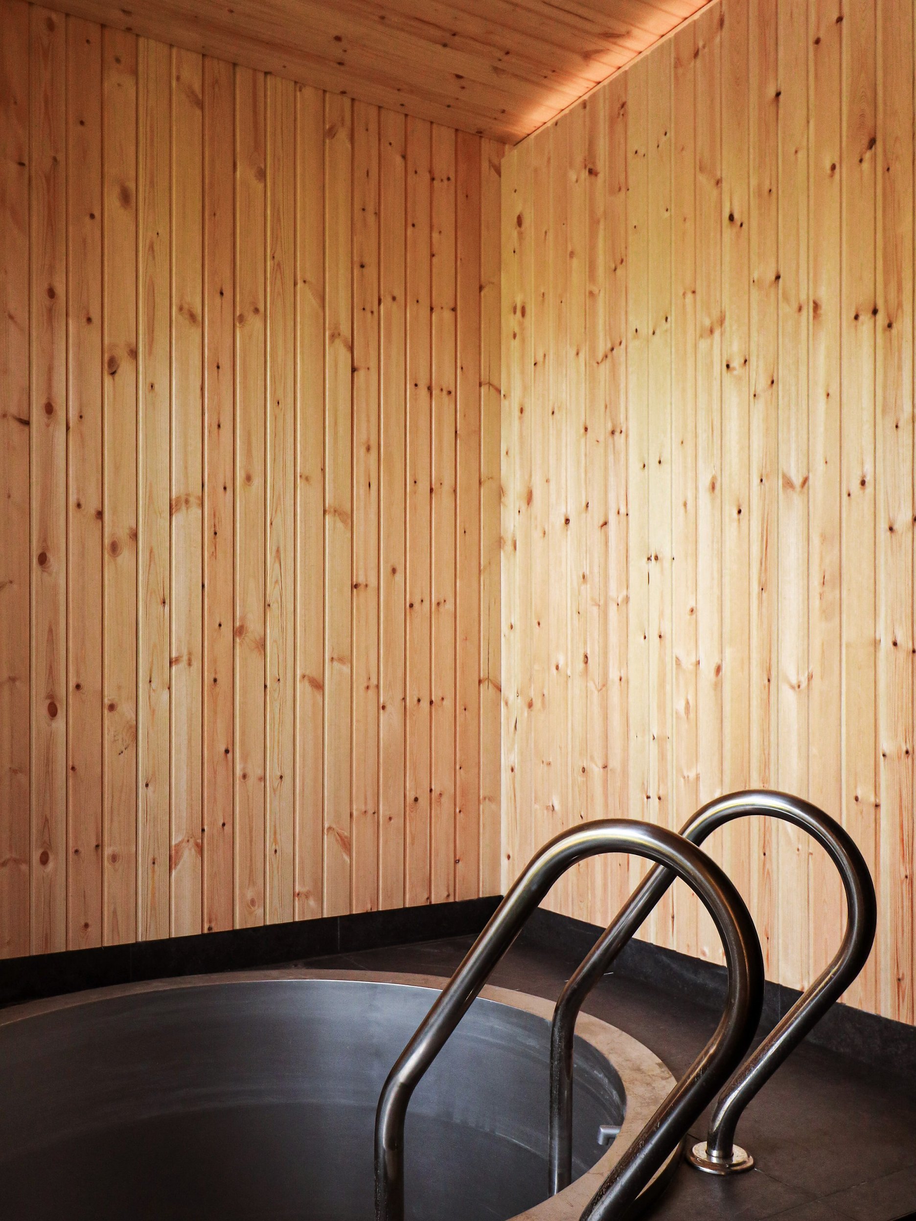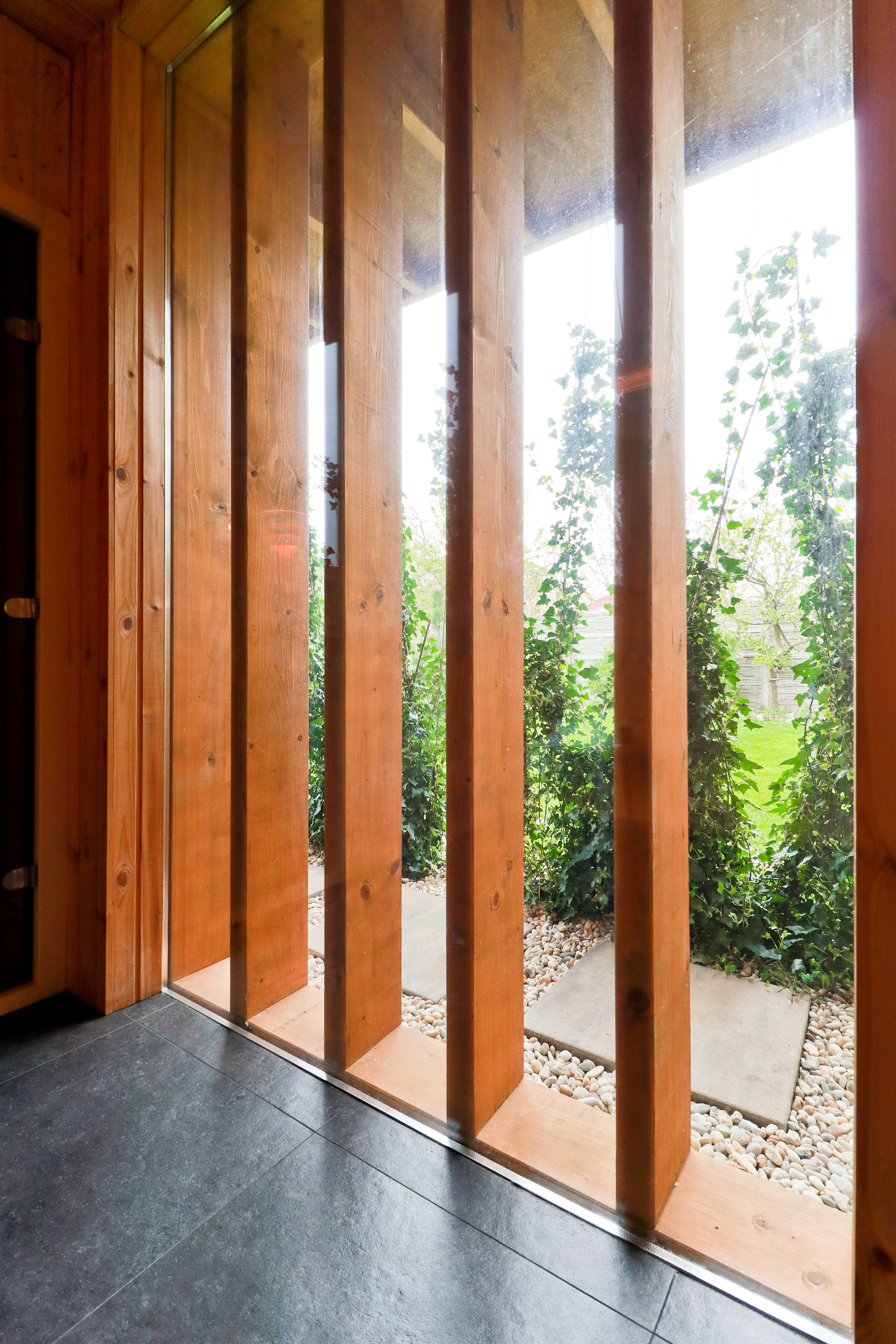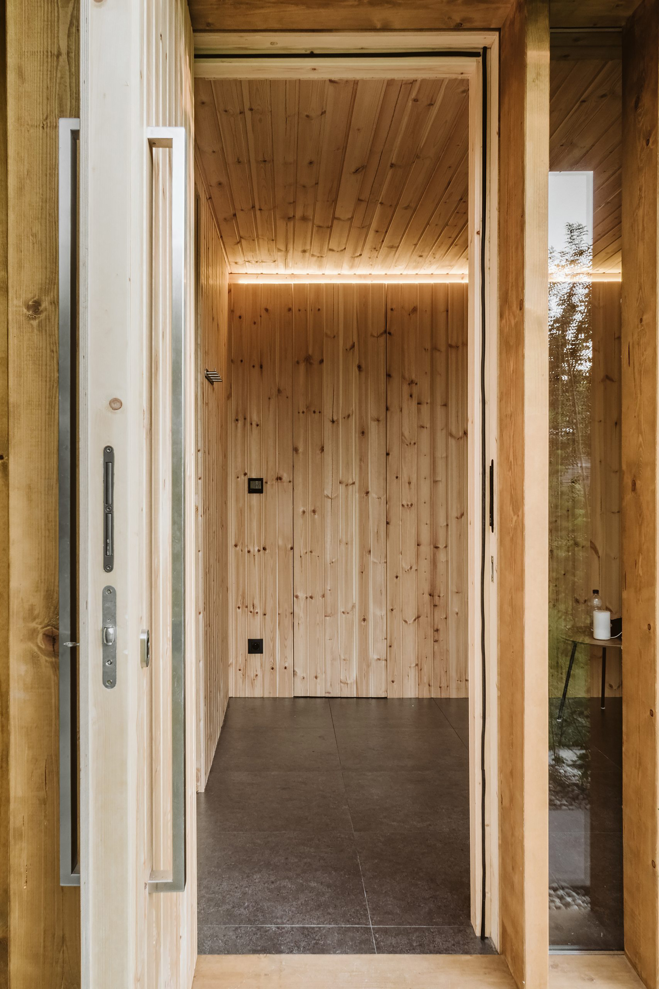 Vchod do sauny sa ukrýva v nosnom rastri drevených lamiel, ktoré oddeľujú interiér od exteriéru. Ich účelom je tiež regulovať viditeľnosť a upriamiť výhľady z vnútra na záhradu. Vstupná časť objektu slúži ako zázemie pre odloženie vecí a odpočiváreň. Z nej je prístup do samotnej fínskej sauny a ochladzovacieho bazénu.