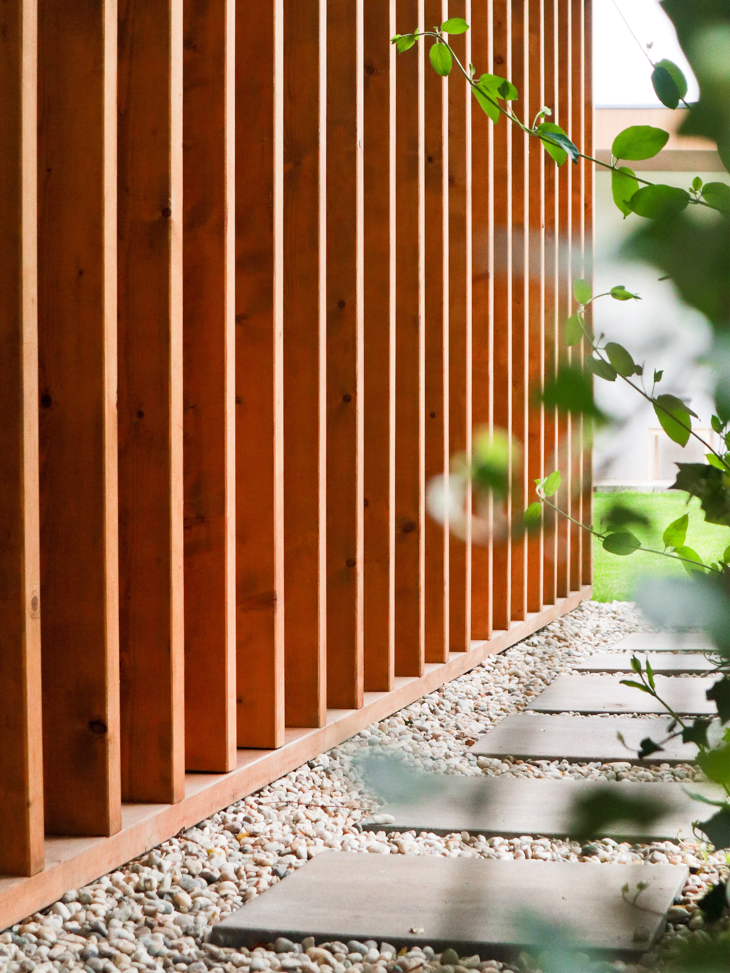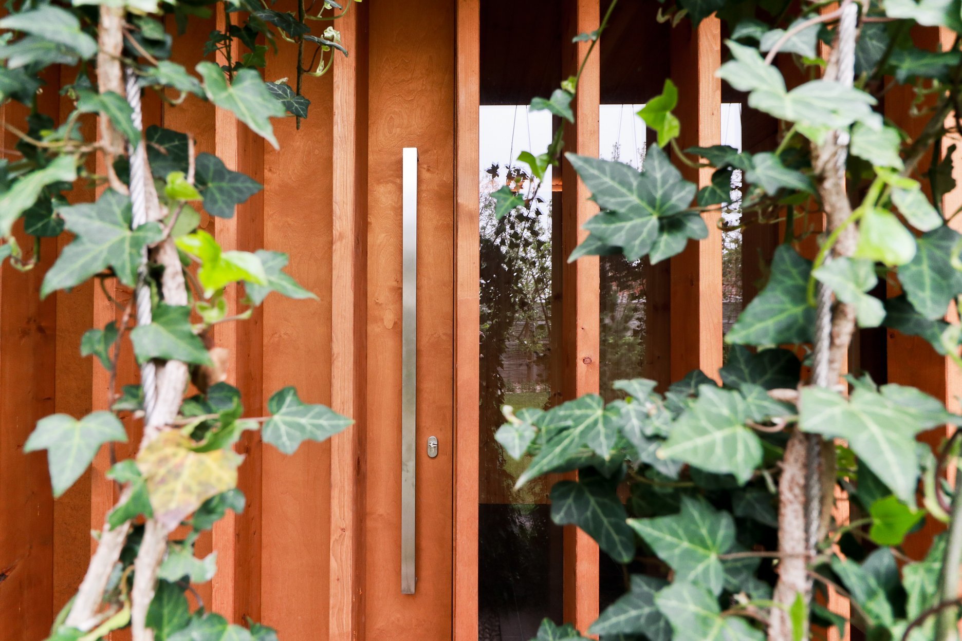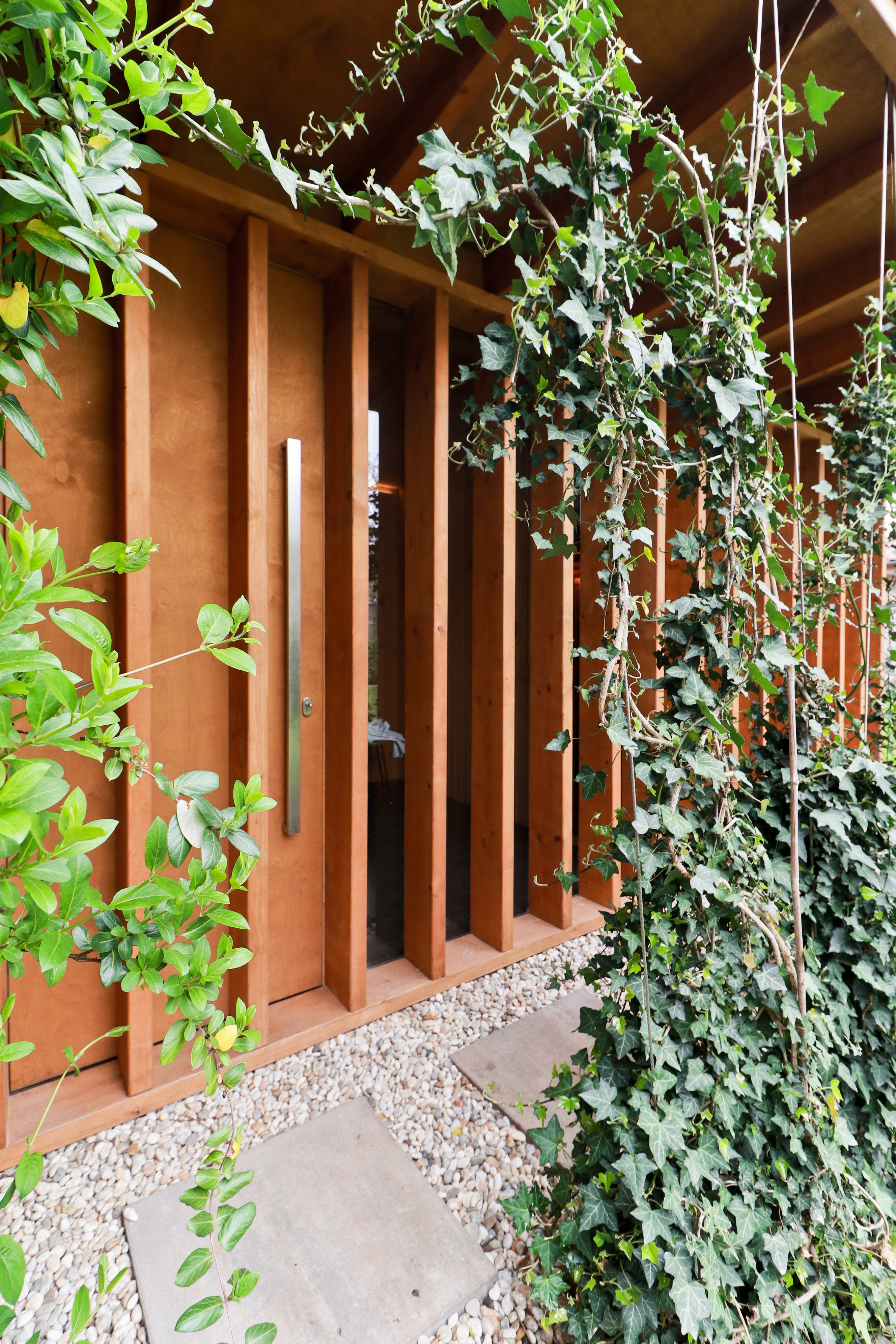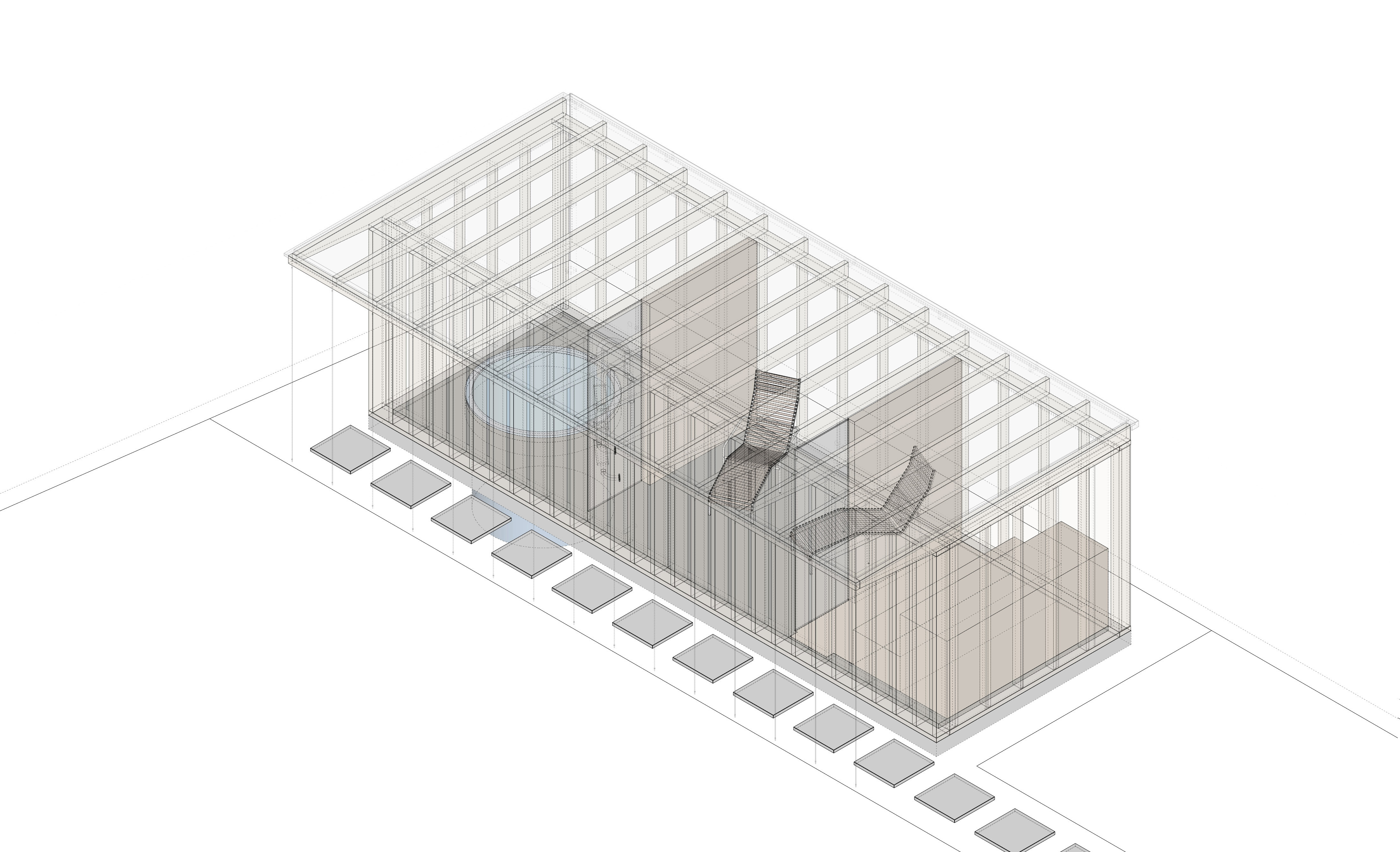 Vchod do sauny sa ukrýva v nosnom rastri drevených lamiel, ktoré oddeľujú interiér od exteriéru. Ich účelom je tiež regulovať viditeľnosť a upriamiť výhľady z vnútra na záhradu. Vstupná časť objektu slúži ako zázemie pre odloženie vecí a odpočiváreň. Z nej je prístup do samotnej fínskej sauny a ochladzovacieho bazénu.